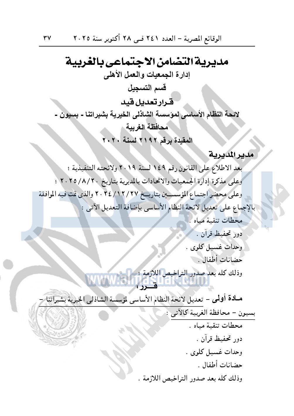 نشرت الوقائع المصرية في العدد 241، بتاريخ 28 أكتوبر 2025، قرار مديرية التضامن الاجتماعى بالغربية، قرار تعديل قيد رقم 2192 لسنة 2020، بشأن تعديل قيد مؤسسة الشاذلى الخيرية بشبراتنا - بسيون - محافظة الغربية.