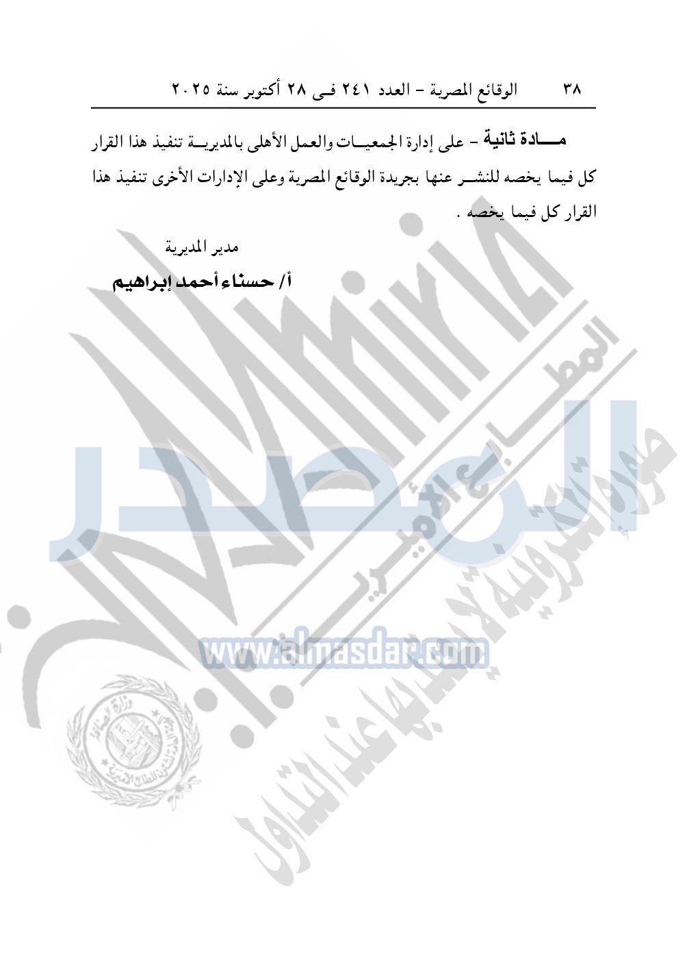 على إدارة الجمعيات والاتحادات بالمديرية تنفيذ هذا القرار كل فيما يخصه والنشر عنها بجريدة الوقائع المصرية وعلى الإدارات الأخرى تنفيذ هذا القرار كل فيما يخصه.