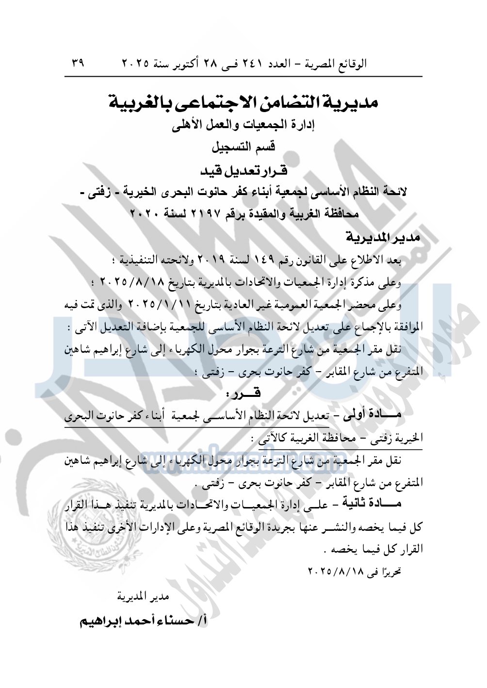 كما نشرت الوقائع المصرية في العدد 241، بتاريخ 28 أكتوبر 2025، قرار مديرية التضامن الاجتماعى بالغربية، قرار تعديل قيد رقم 2197 لسنة 2020، بشأن تعديل قيد جمعية أبناء كفر حانوت البحرى الخيرية - زفتى - محافظة الغربية.