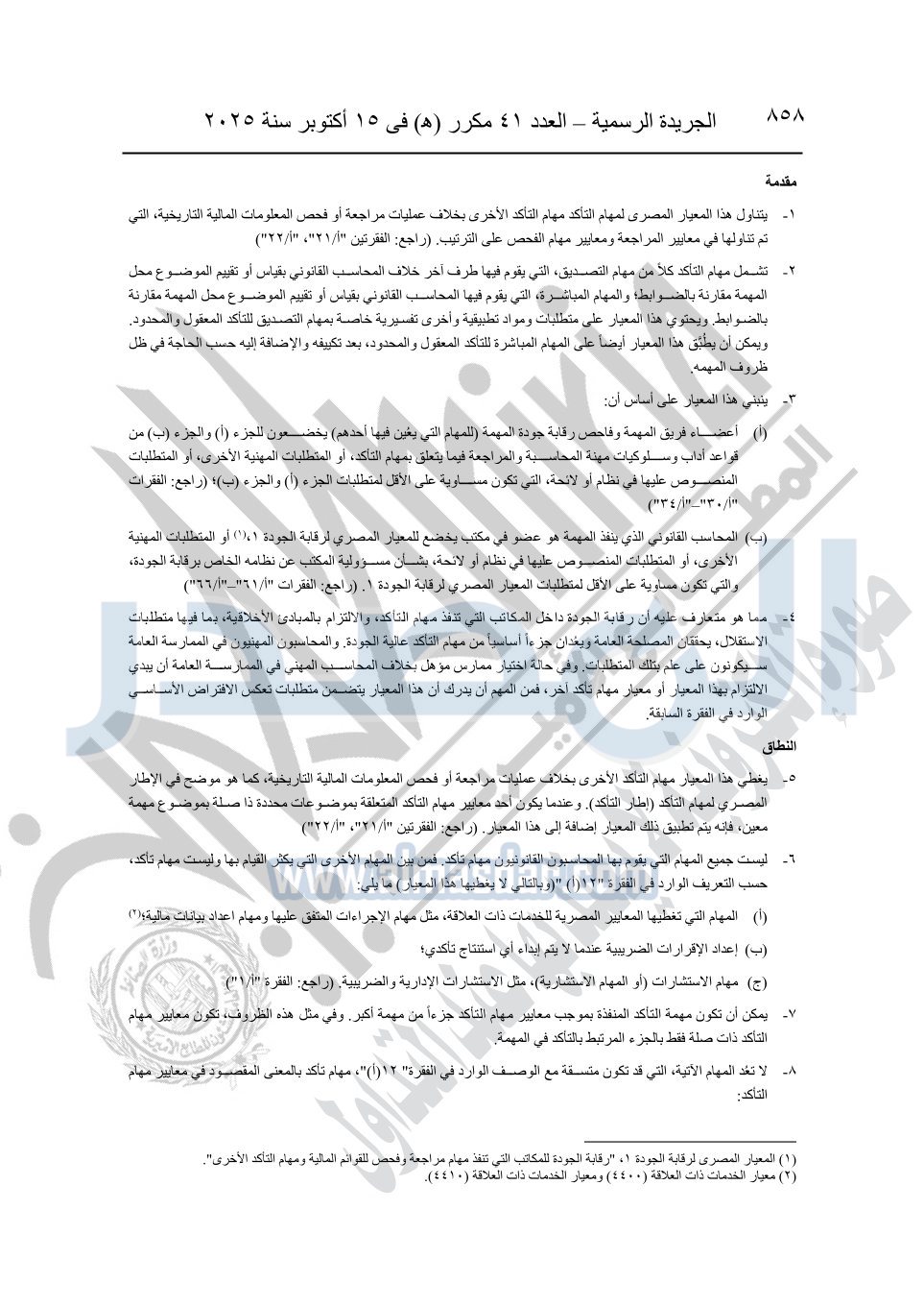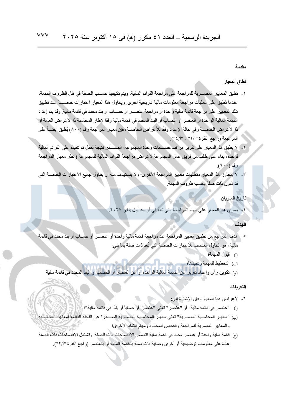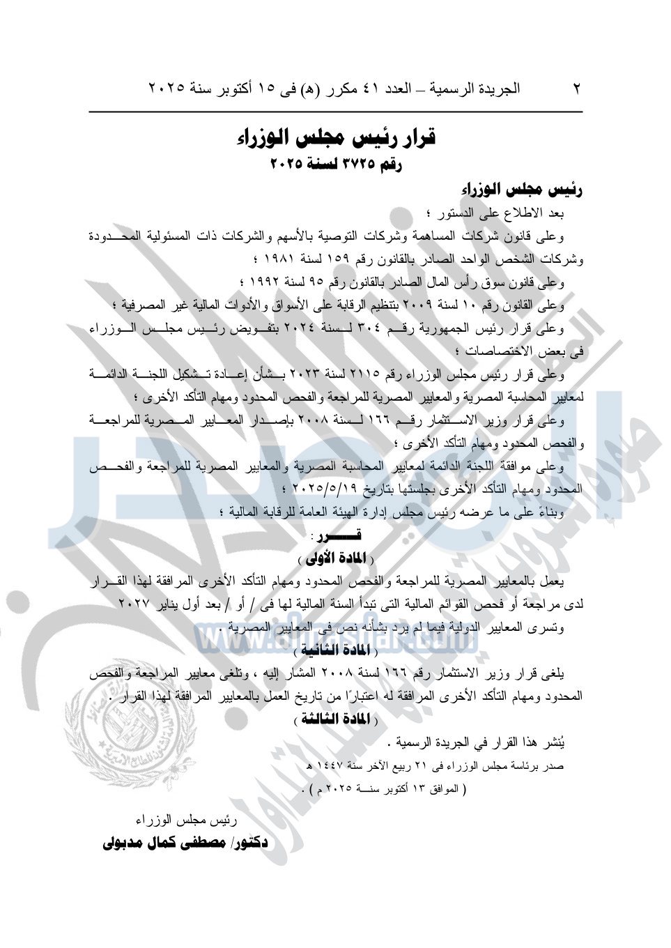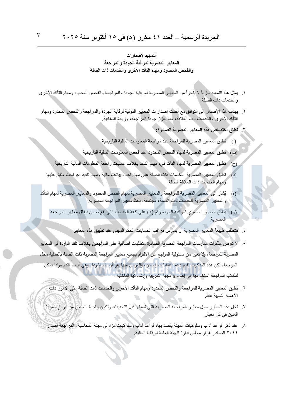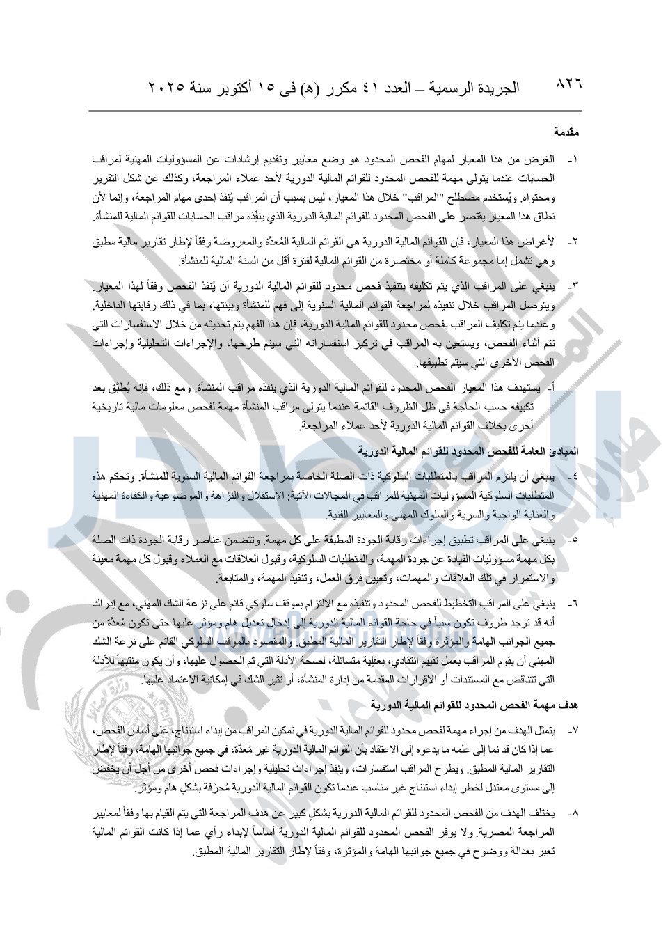 نشرت الجريدة الرسمية في العدد 41 مكرر "هـ" الصادر في 15 أكتوبر سنة 2025، قرار رئيس مجلس الوزراء رقم 3725 لسنة 2025، بشأن العمل بالمعايير المصرية للمراجعة والفحص المحدود ومهام التأكد الأخرى المرافقة لهذا القرار.
