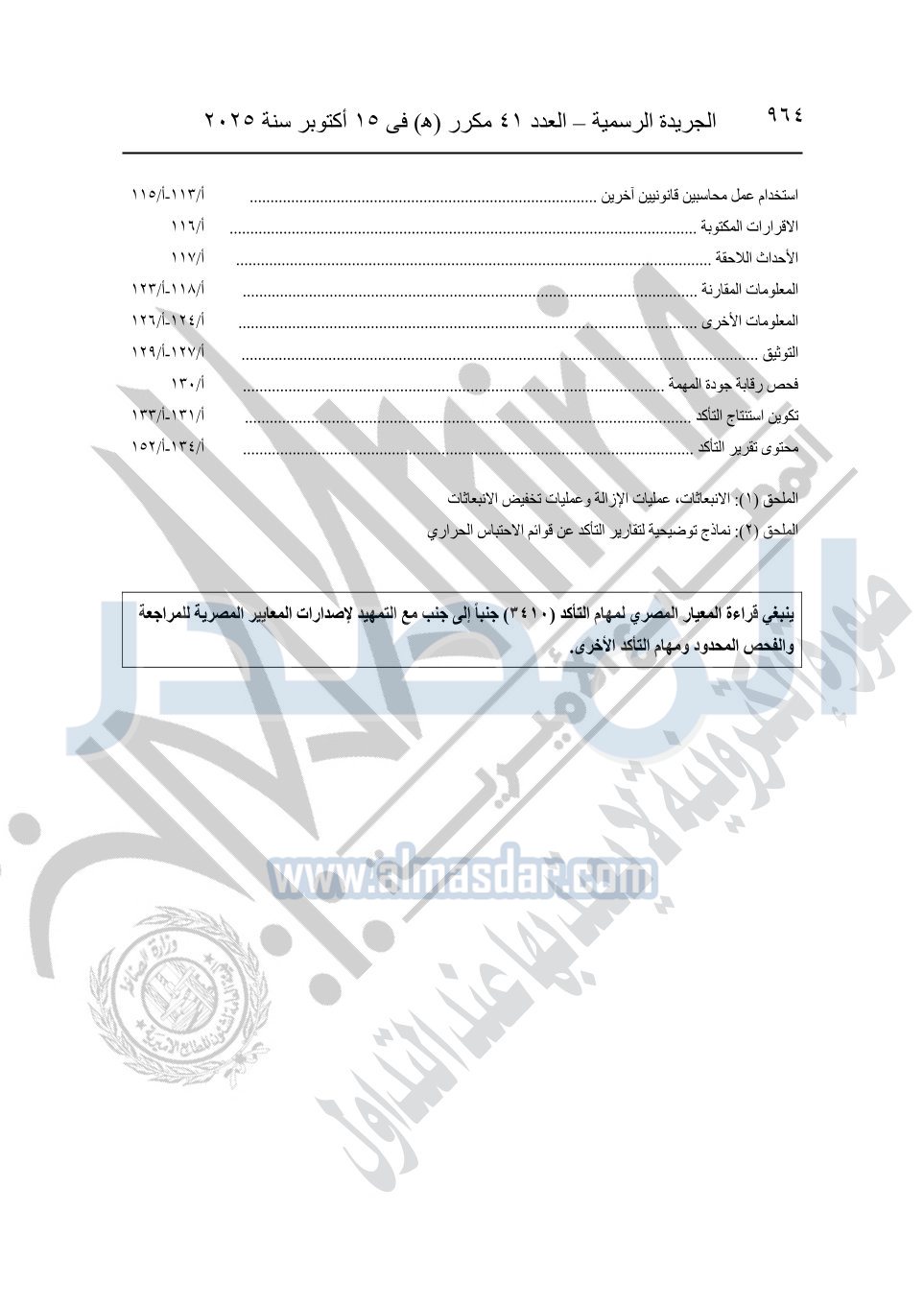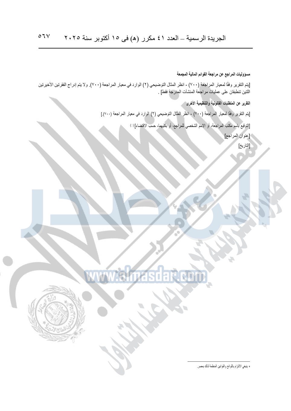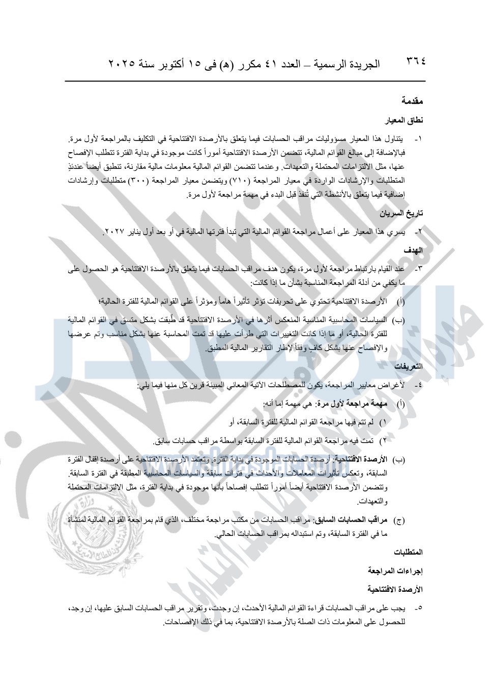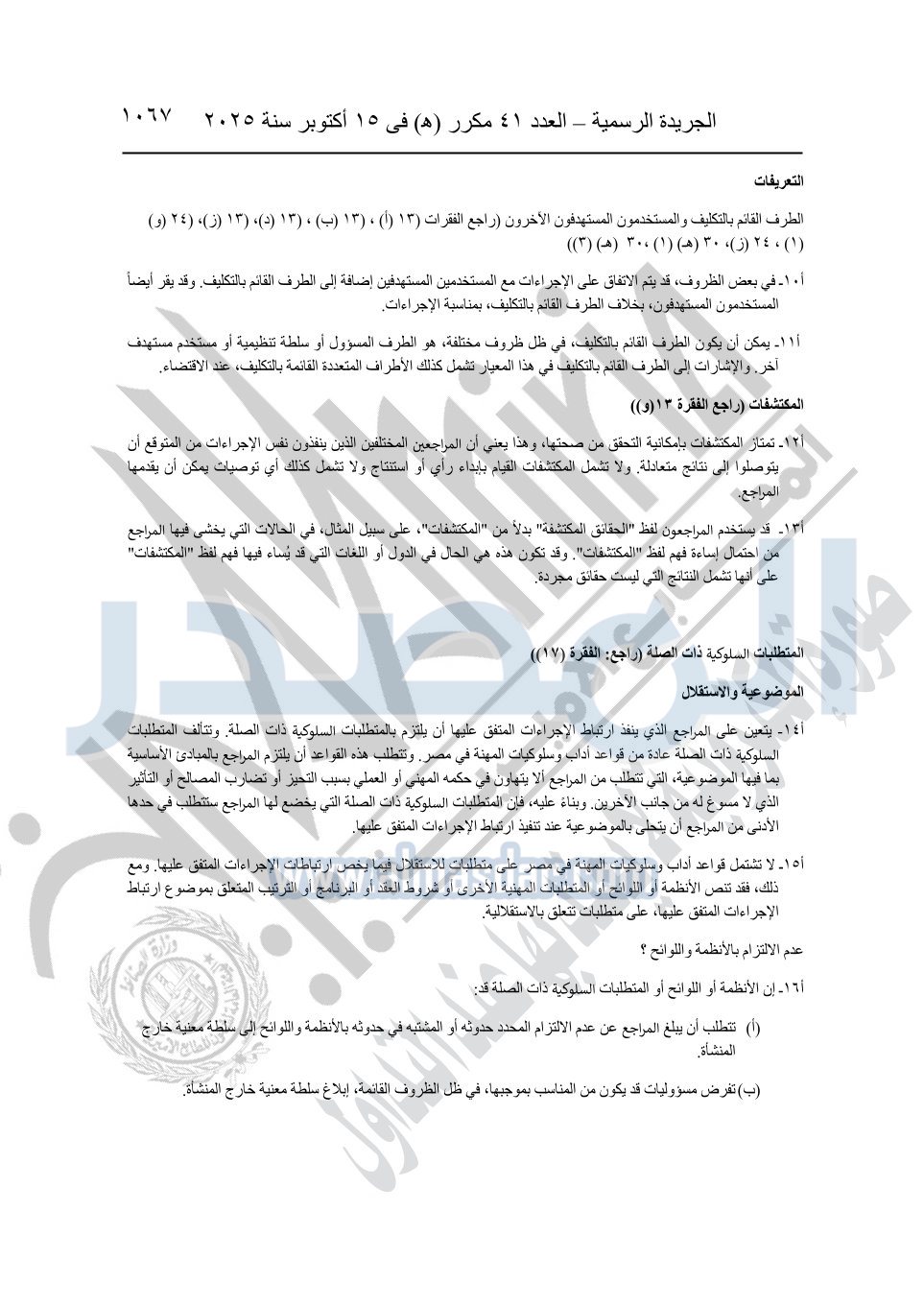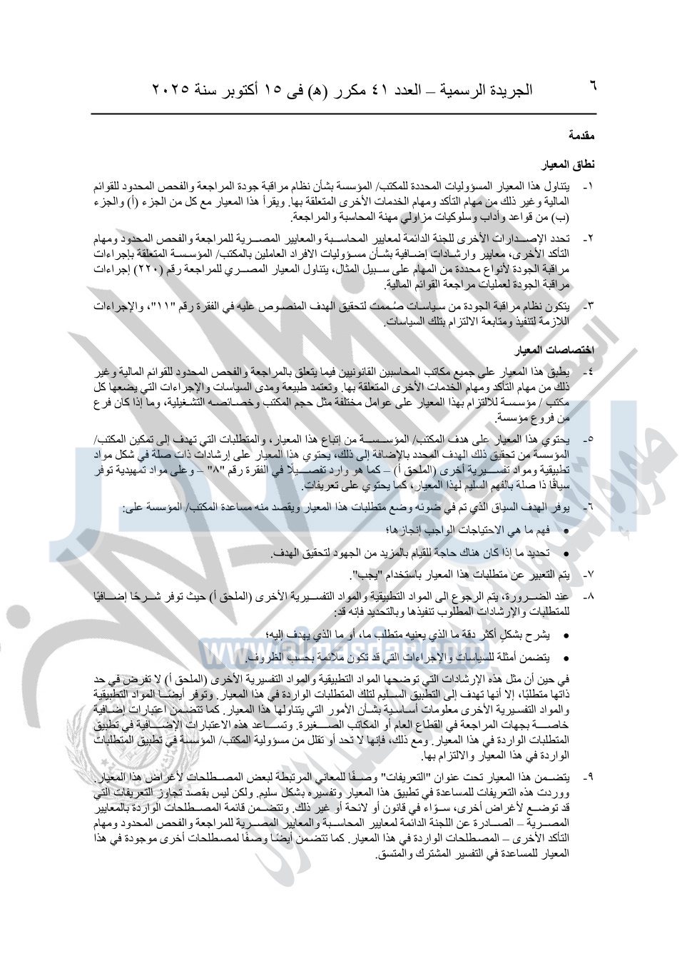 نشرت الجريدة الرسمية في العدد 41 مكرر "هـ" الصادر في 15 أكتوبر سنة 2025، قرار رئيس مجلس الوزراء رقم 3725 لسنة 2025، بشأن العمل بالمعايير المصرية للمراجعة والفحص المحدود ومهام التأكد الأخرى المرافقة لهذا القرار.