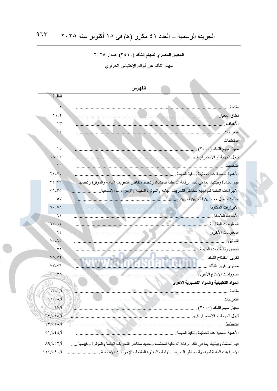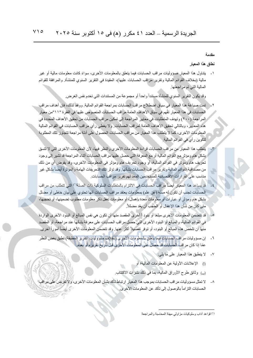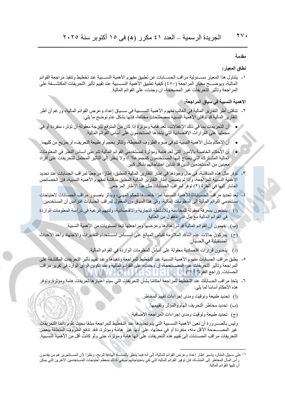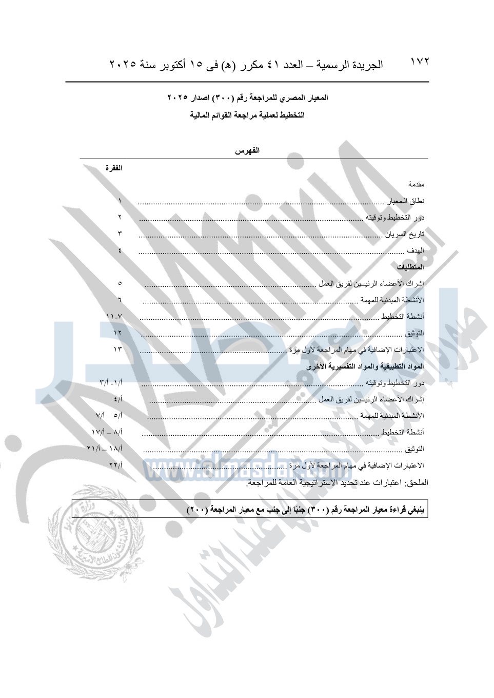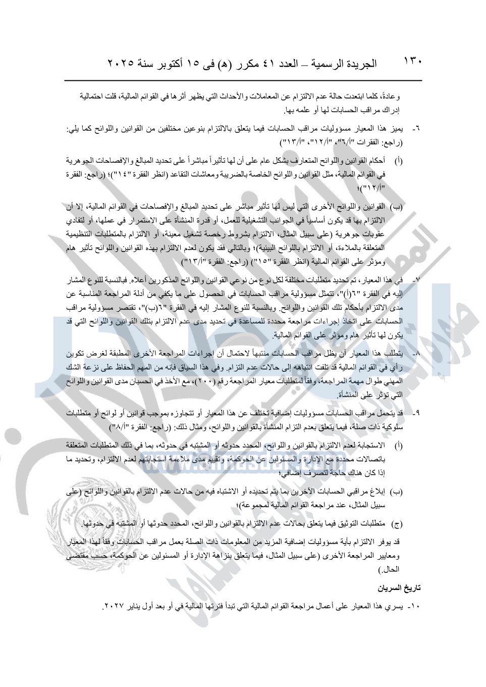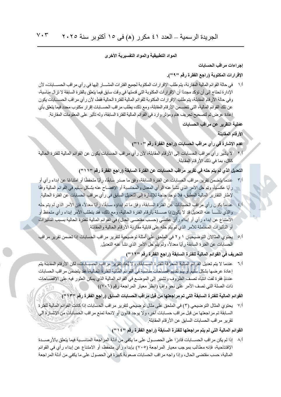 نشرت الجريدة الرسمية في العدد 41 مكرر "هـ" الصادر في 15 أكتوبر سنة 2025، قرار رئيس مجلس الوزراء رقم 3725 لسنة 2025، بشأن العمل بالمعايير المصرية للمراجعة والفحص المحدود ومهام التأكد الأخرى المرافقة لهذا القرار.