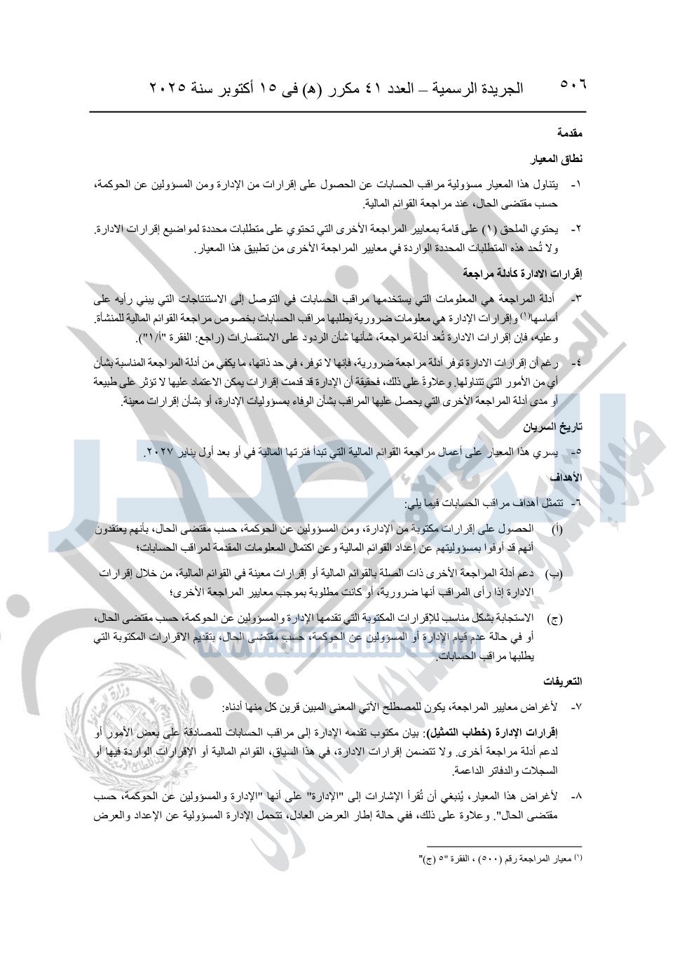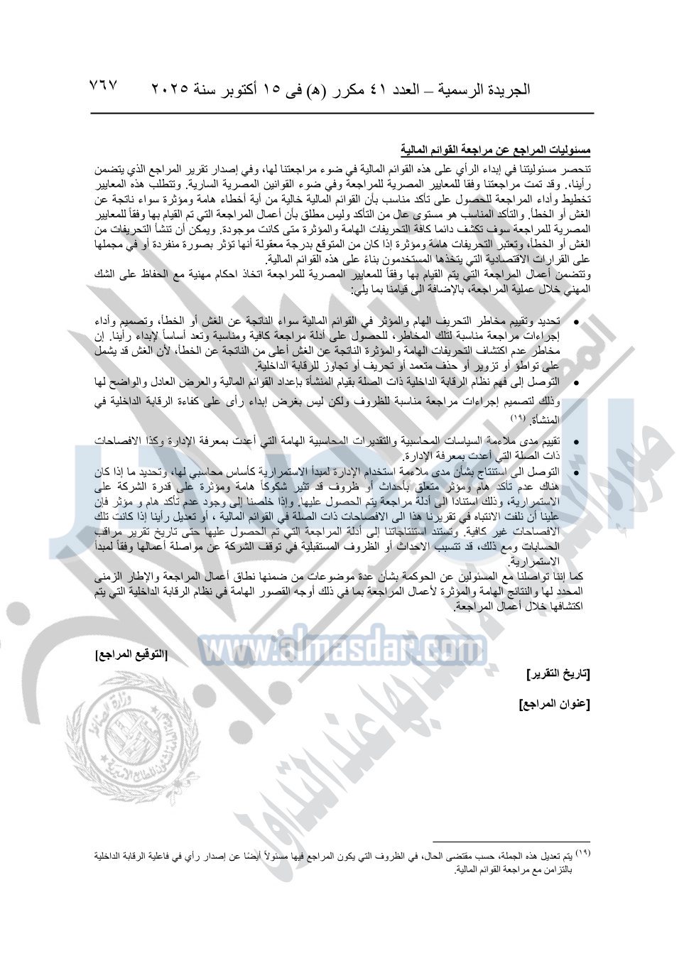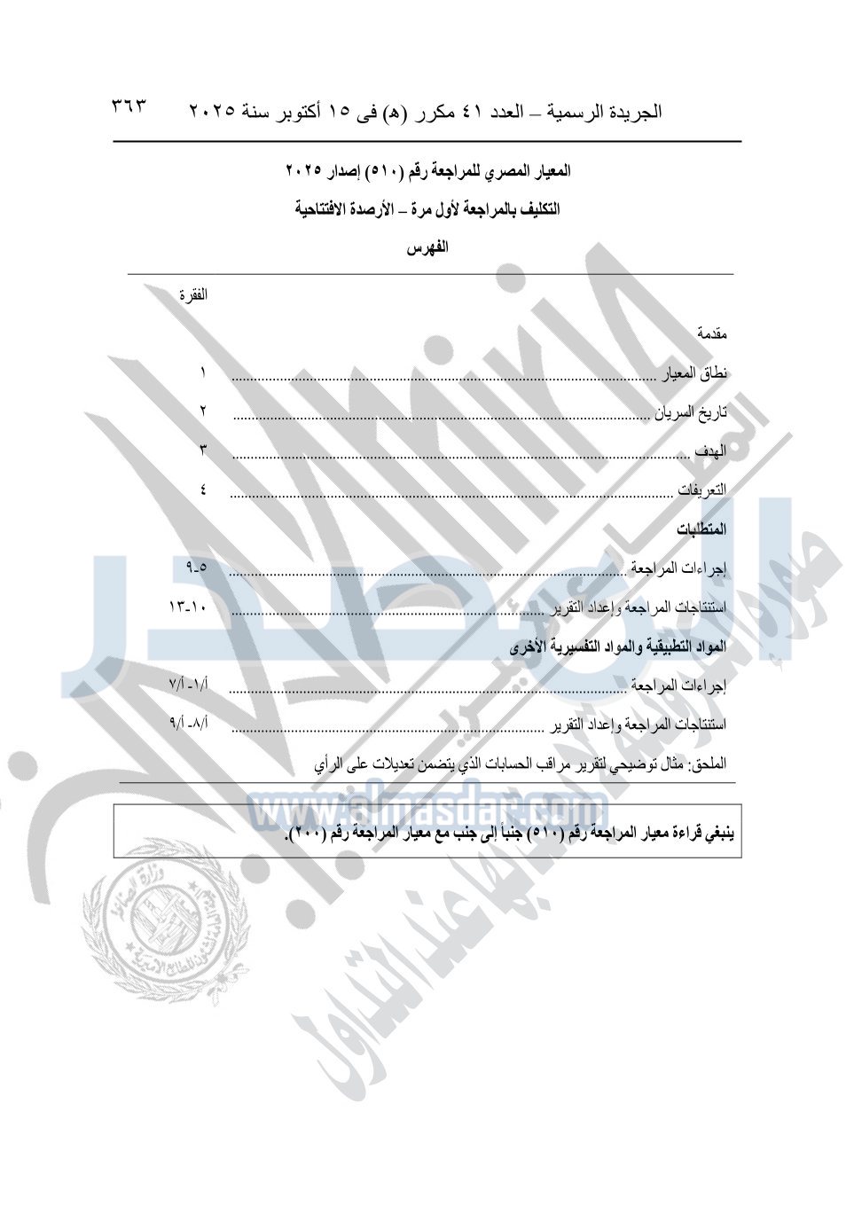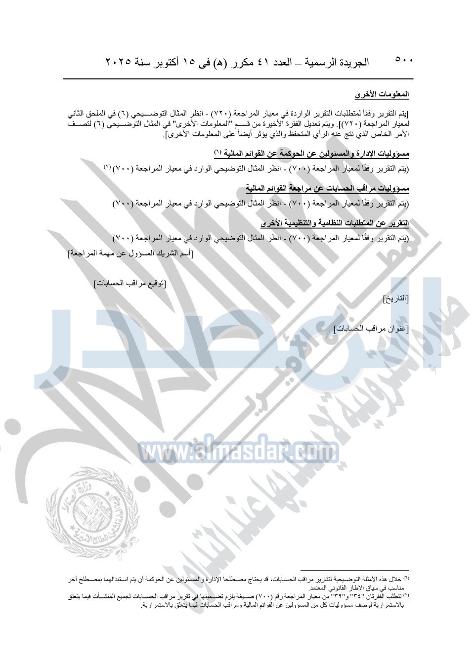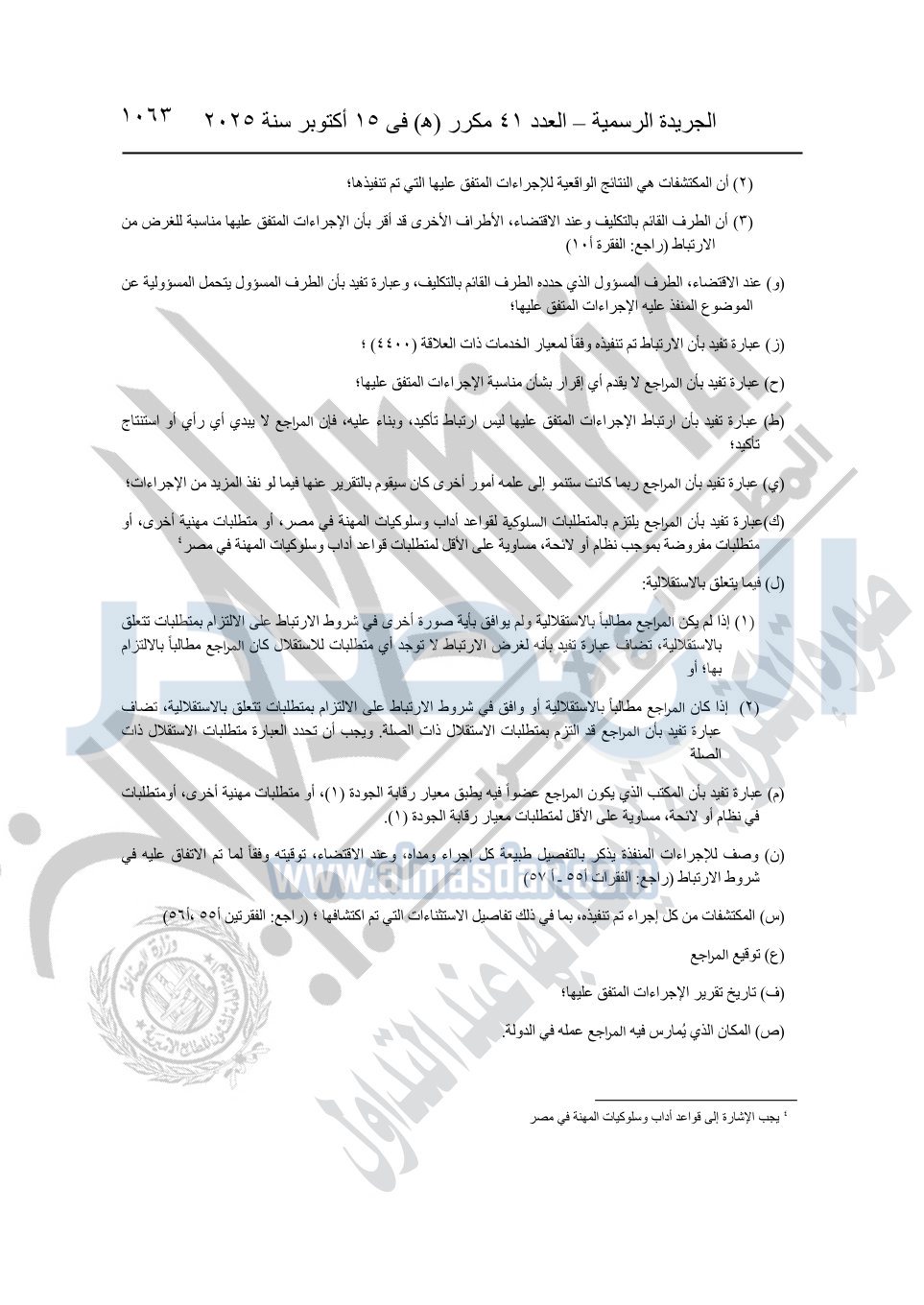 نشرت الجريدة الرسمية في العدد 41 مكرر "هـ" الصادر في 15 أكتوبر سنة 2025، قرار رئيس مجلس الوزراء رقم 3725 لسنة 2025، بشأن العمل بالمعايير المصرية للمراجعة والفحص المحدود ومهام التأكد الأخرى المرافقة لهذا القرار.