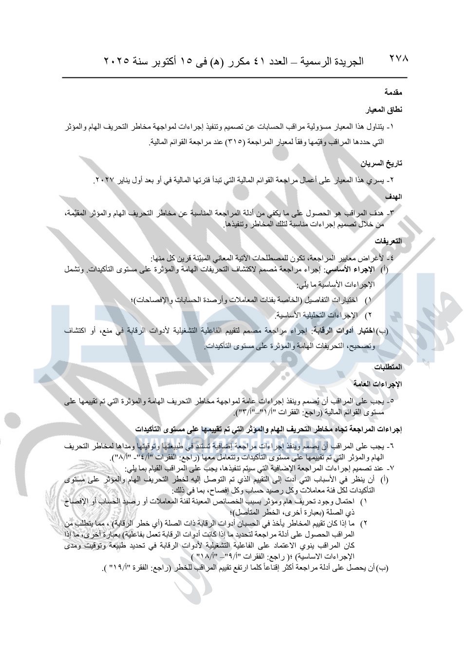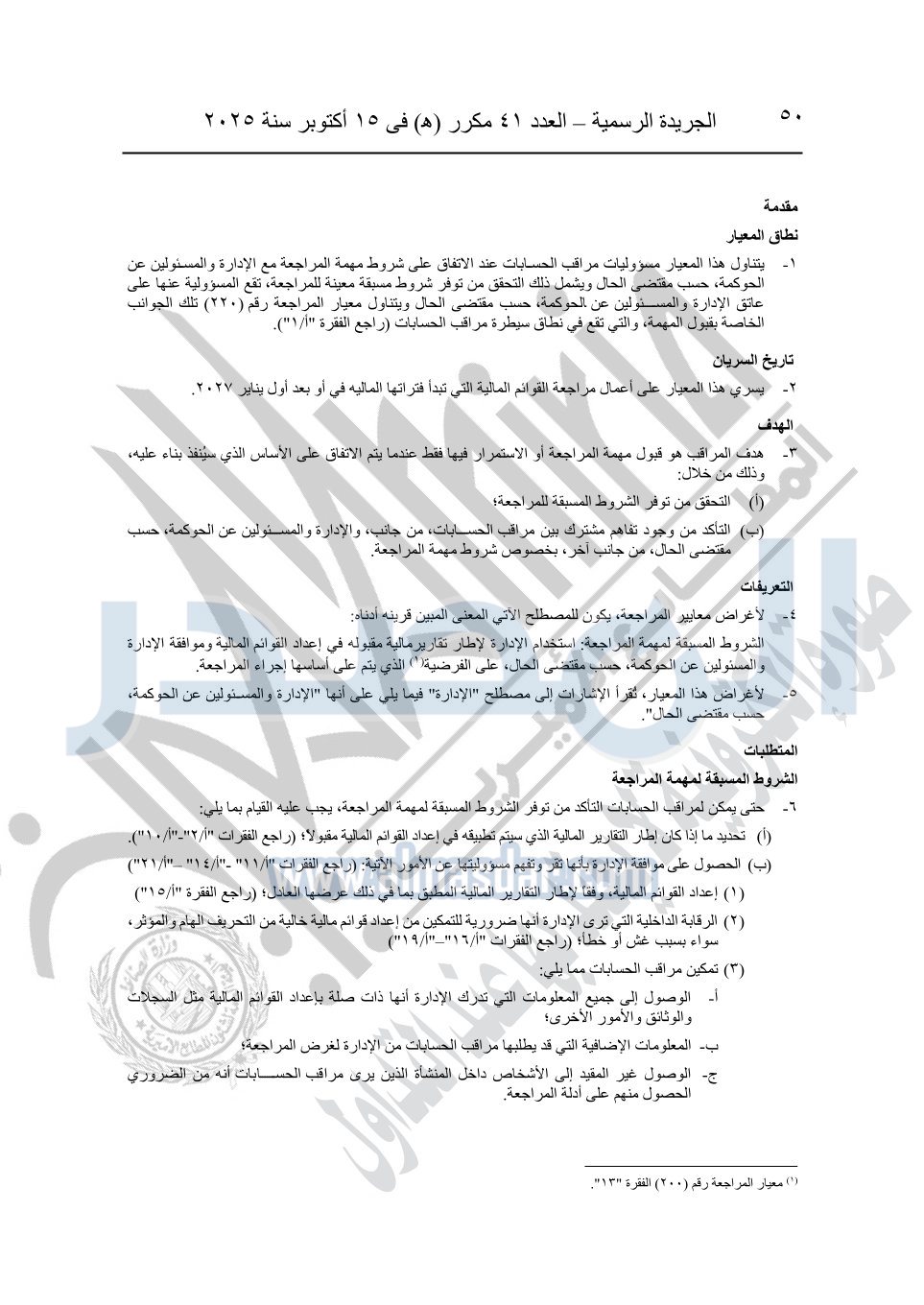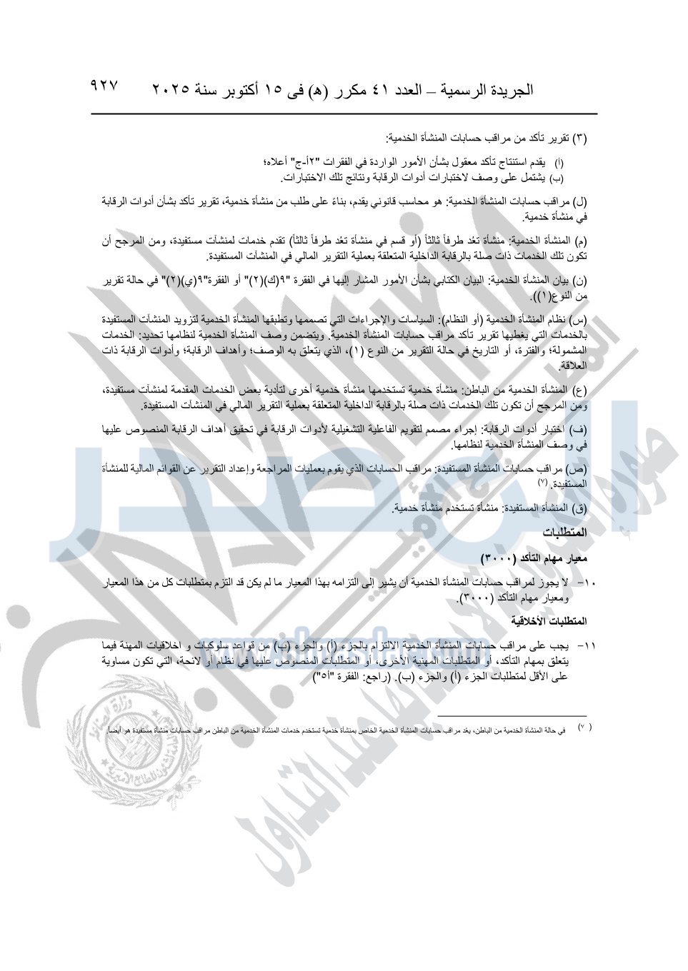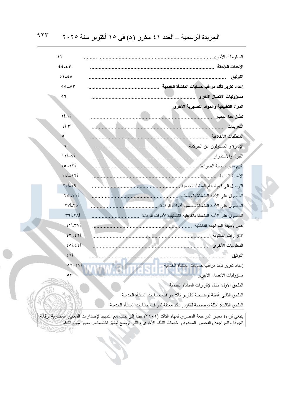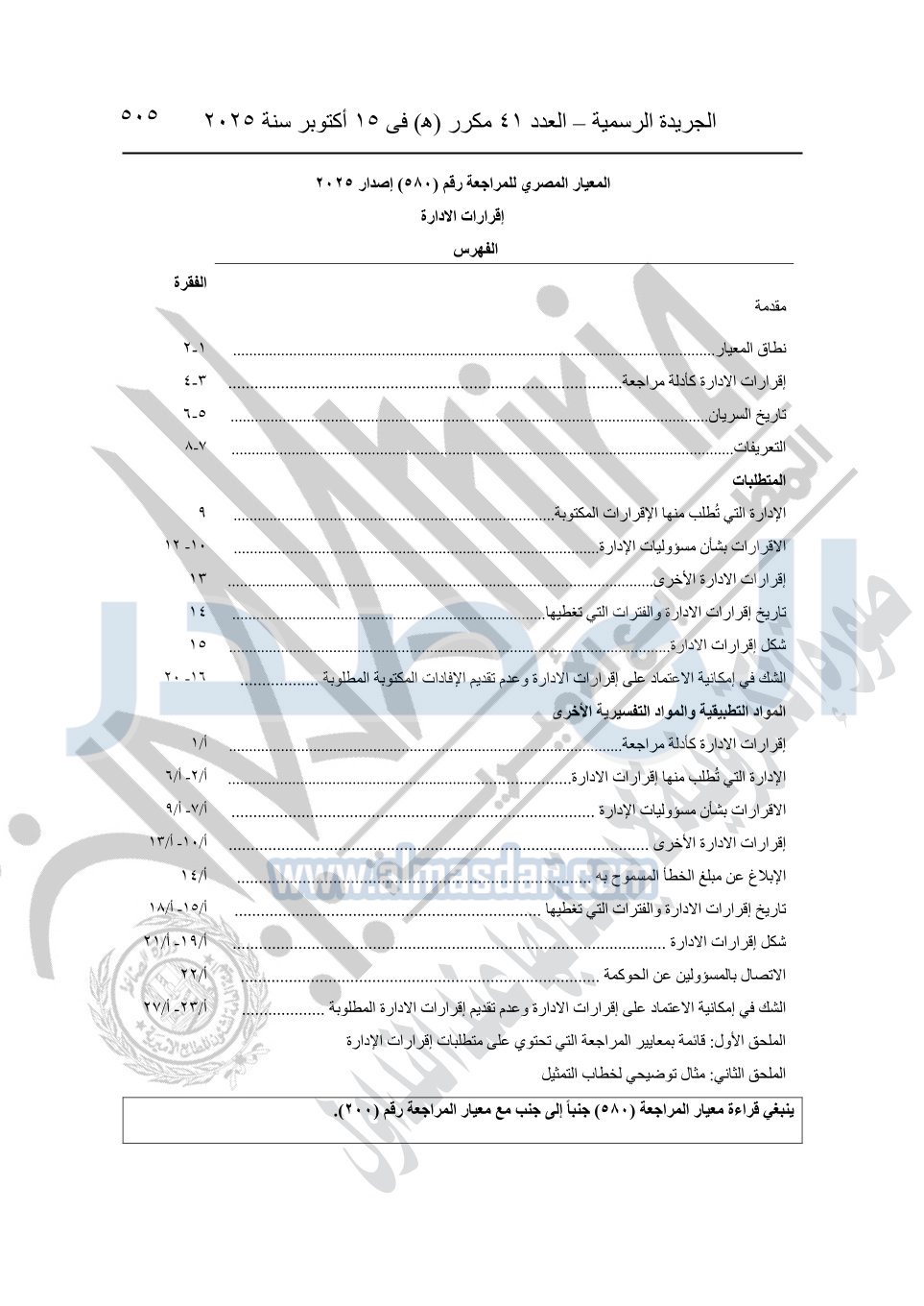 نشرت الجريدة الرسمية في العدد 41 مكرر "هـ" الصادر في 15 أكتوبر سنة 2025، قرار رئيس مجلس الوزراء رقم 3725 لسنة 2025، بشأن العمل بالمعايير المصرية للمراجعة والفحص المحدود ومهام التأكد الأخرى المرافقة لهذا القرار.