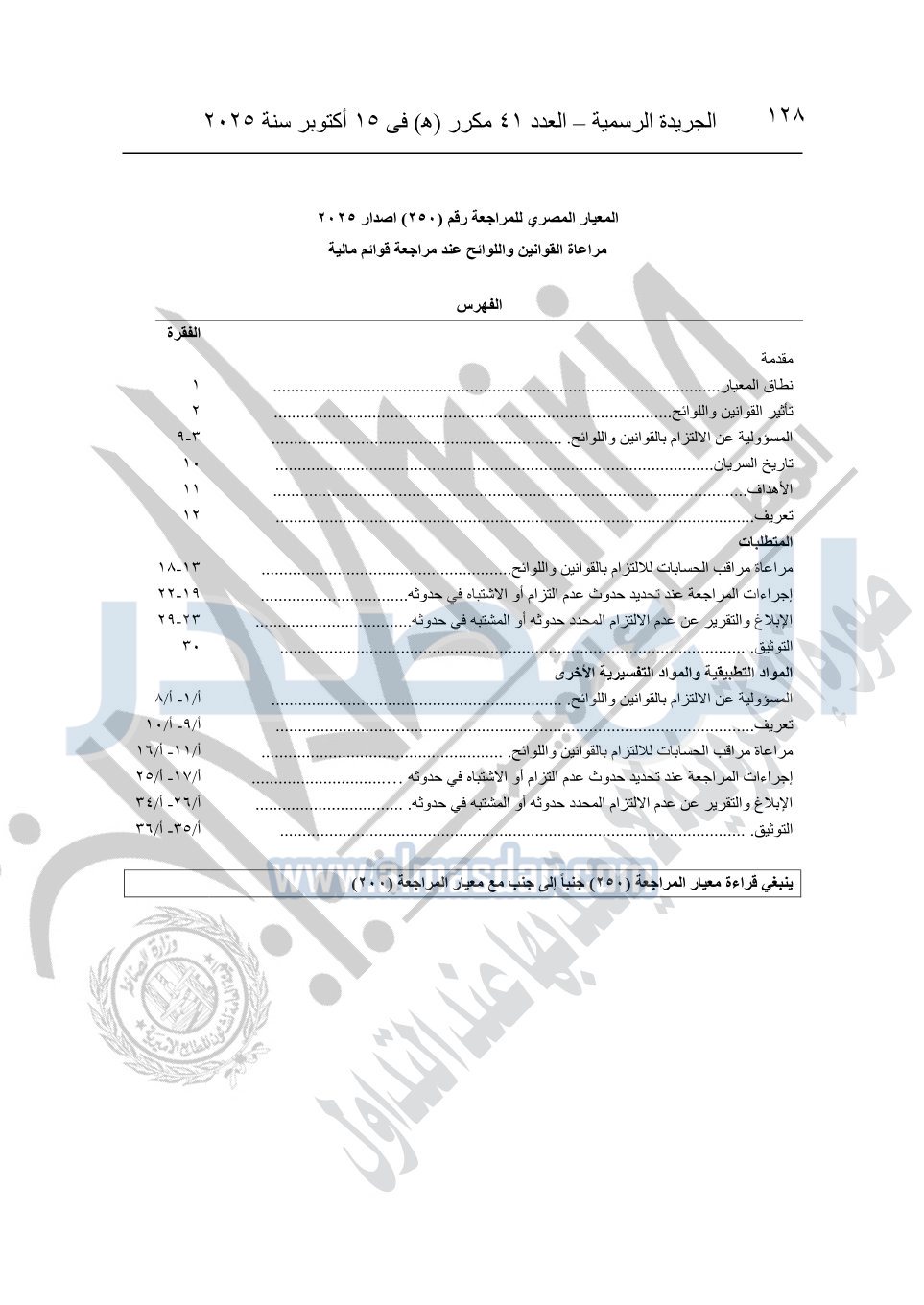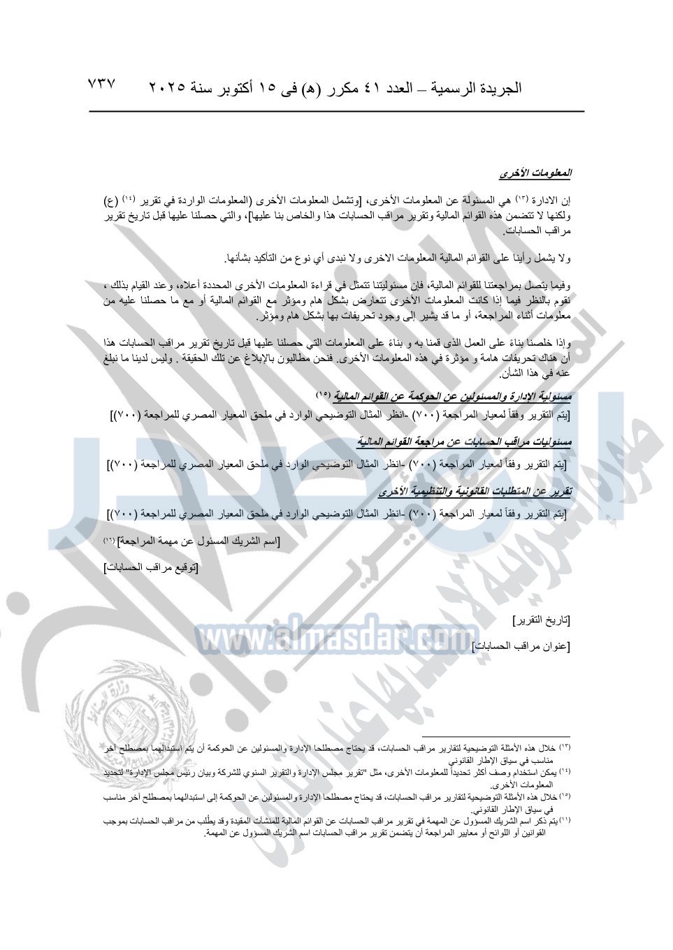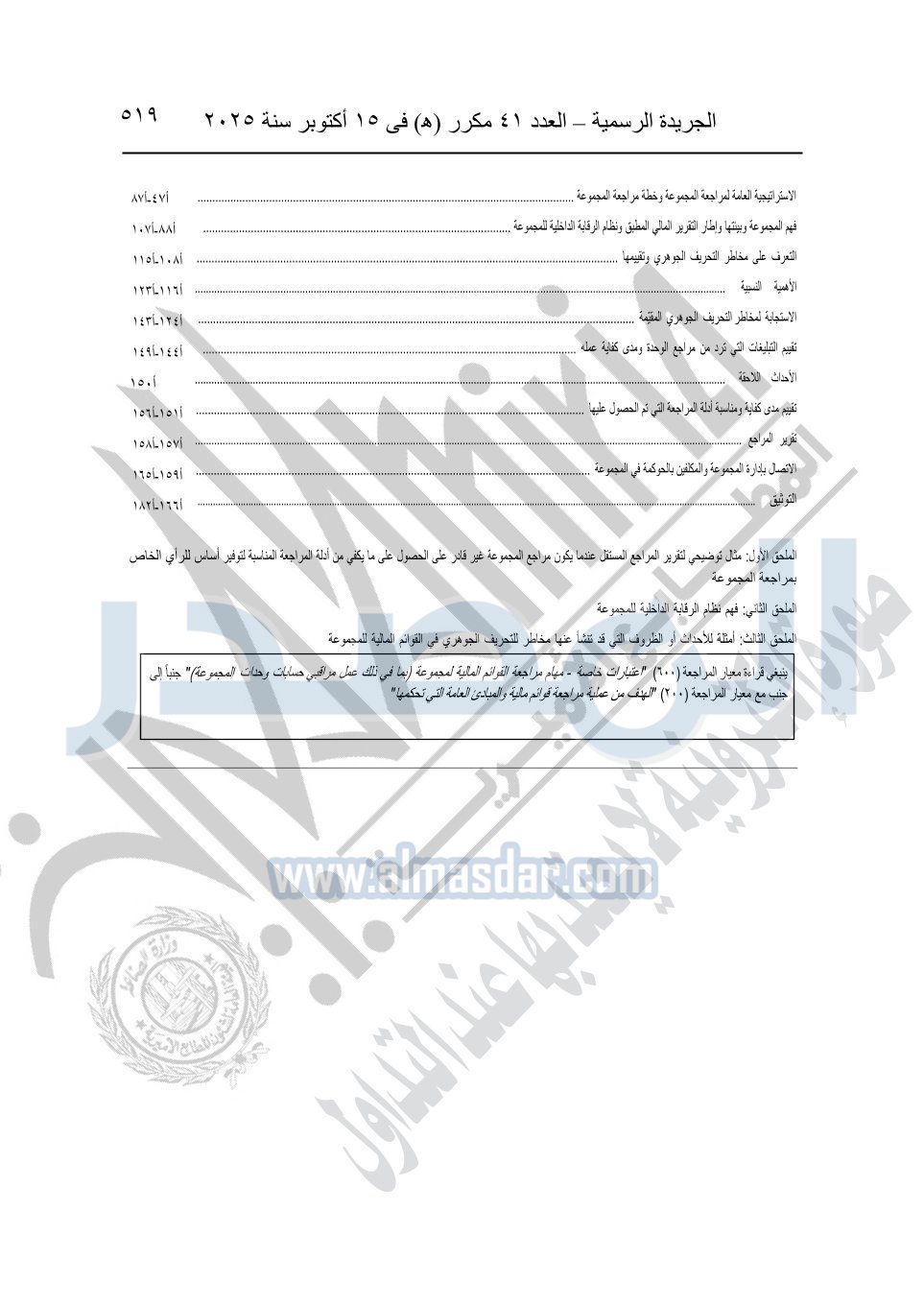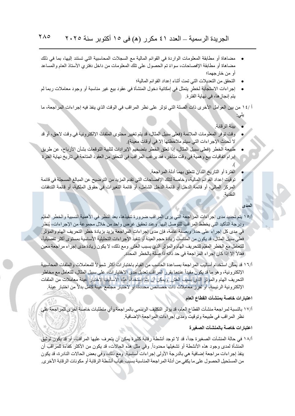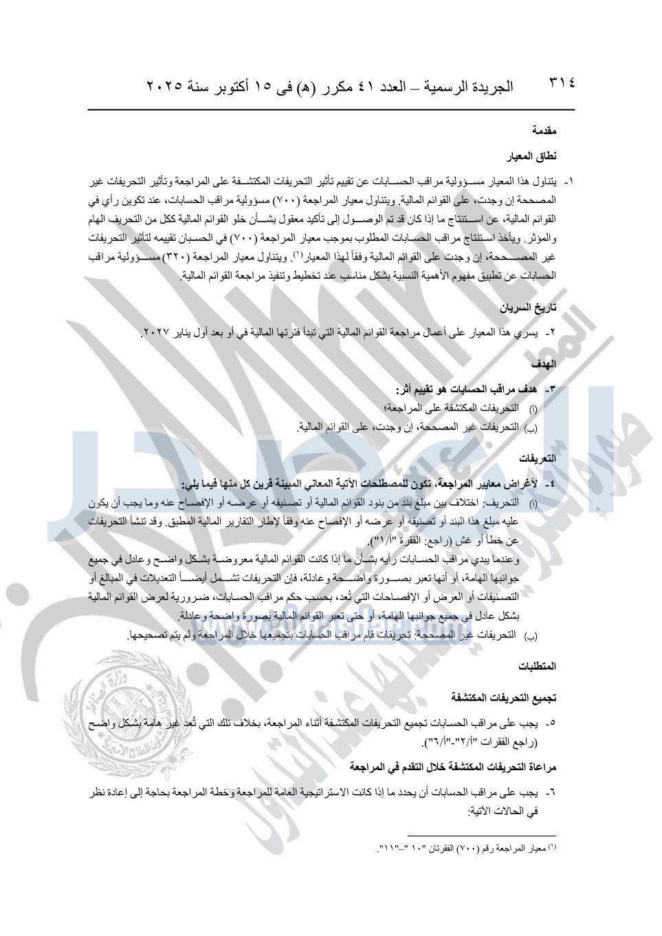 نشرت الجريدة الرسمية في العدد 41 مكرر "هـ" الصادر في 15 أكتوبر سنة 2025، قرار رئيس مجلس الوزراء رقم 3725 لسنة 2025، بشأن العمل بالمعايير المصرية للمراجعة والفحص المحدود ومهام التأكد الأخرى المرافقة لهذا القرار.