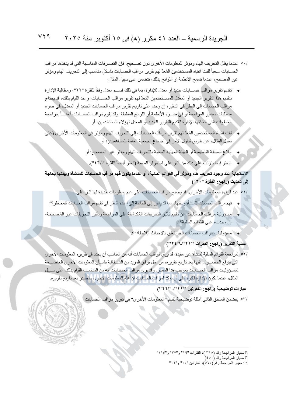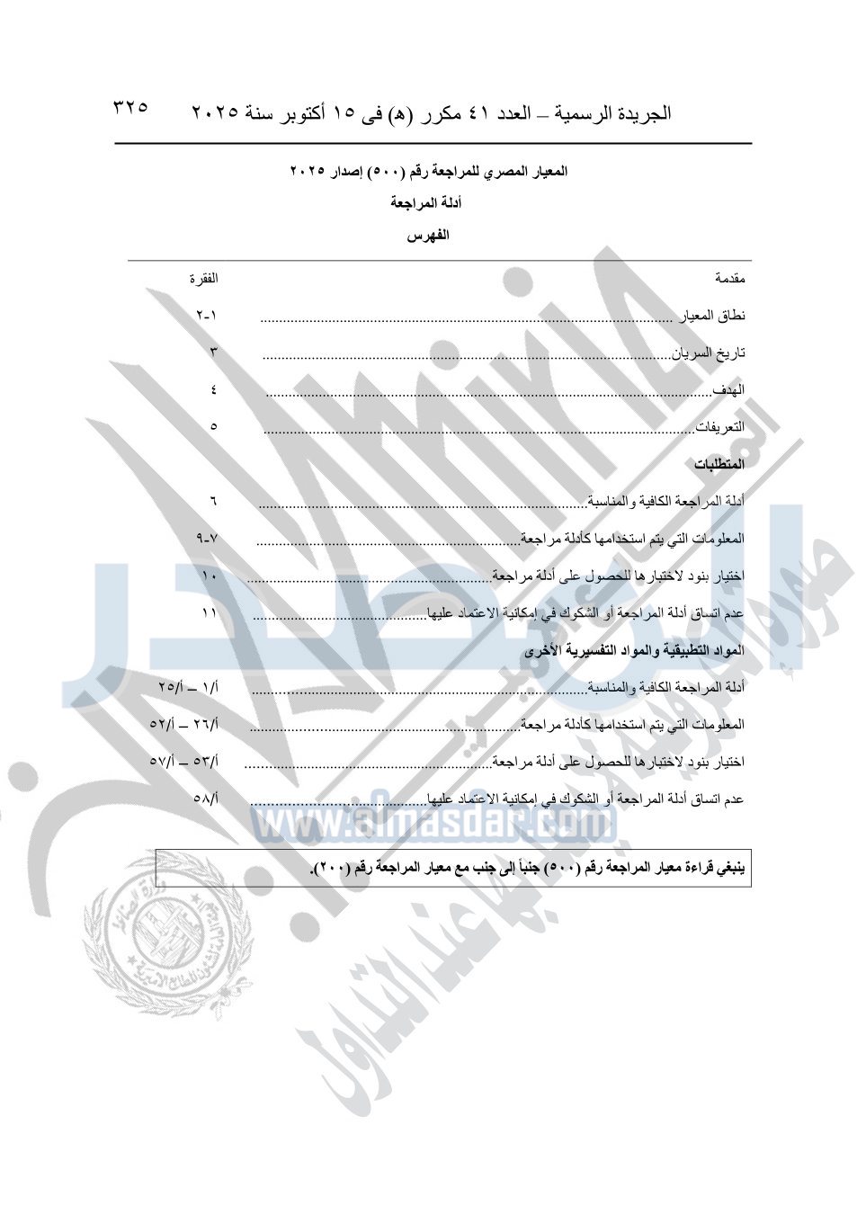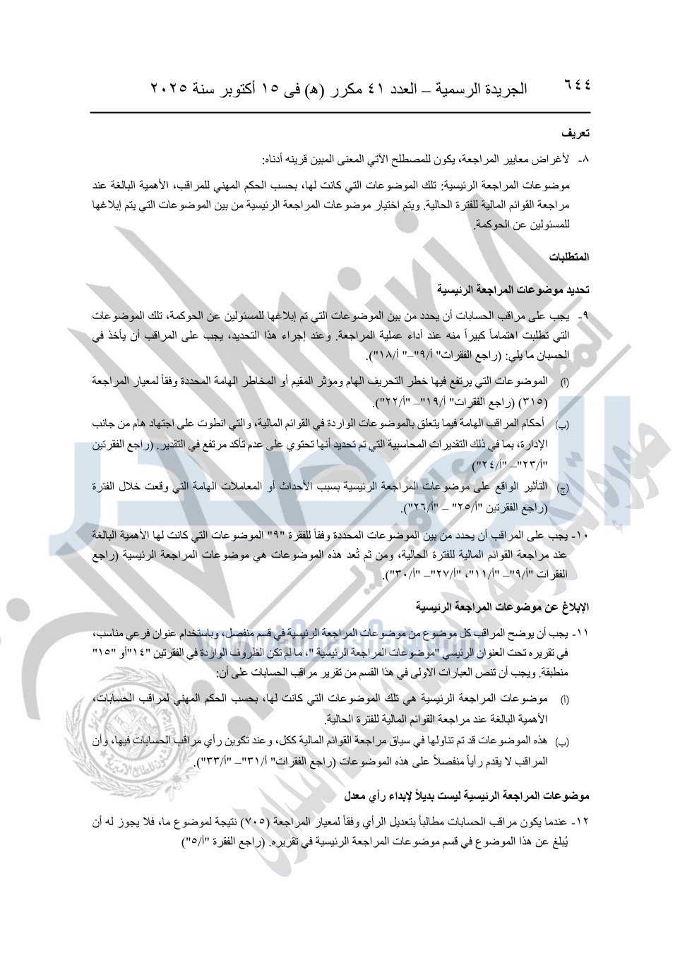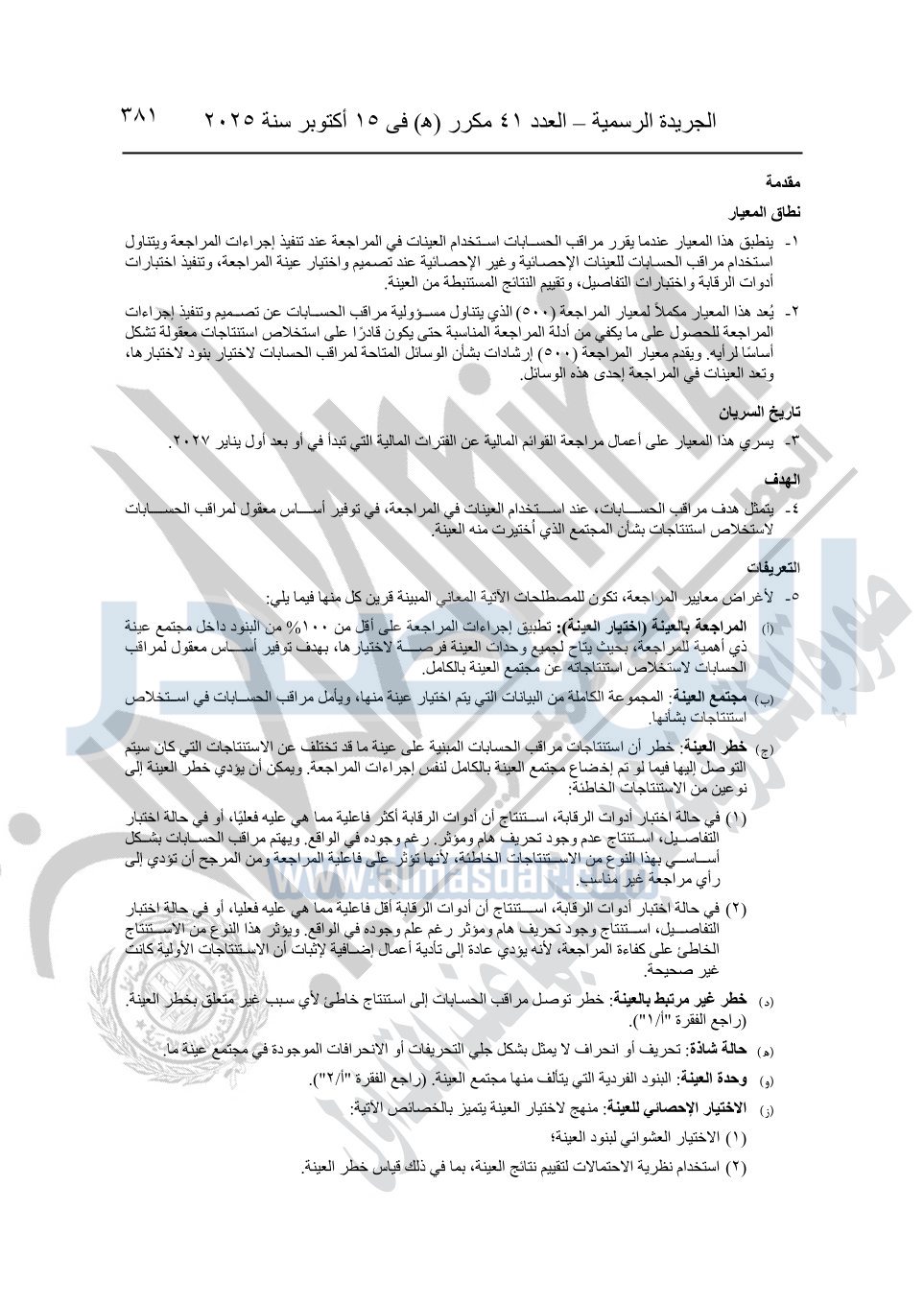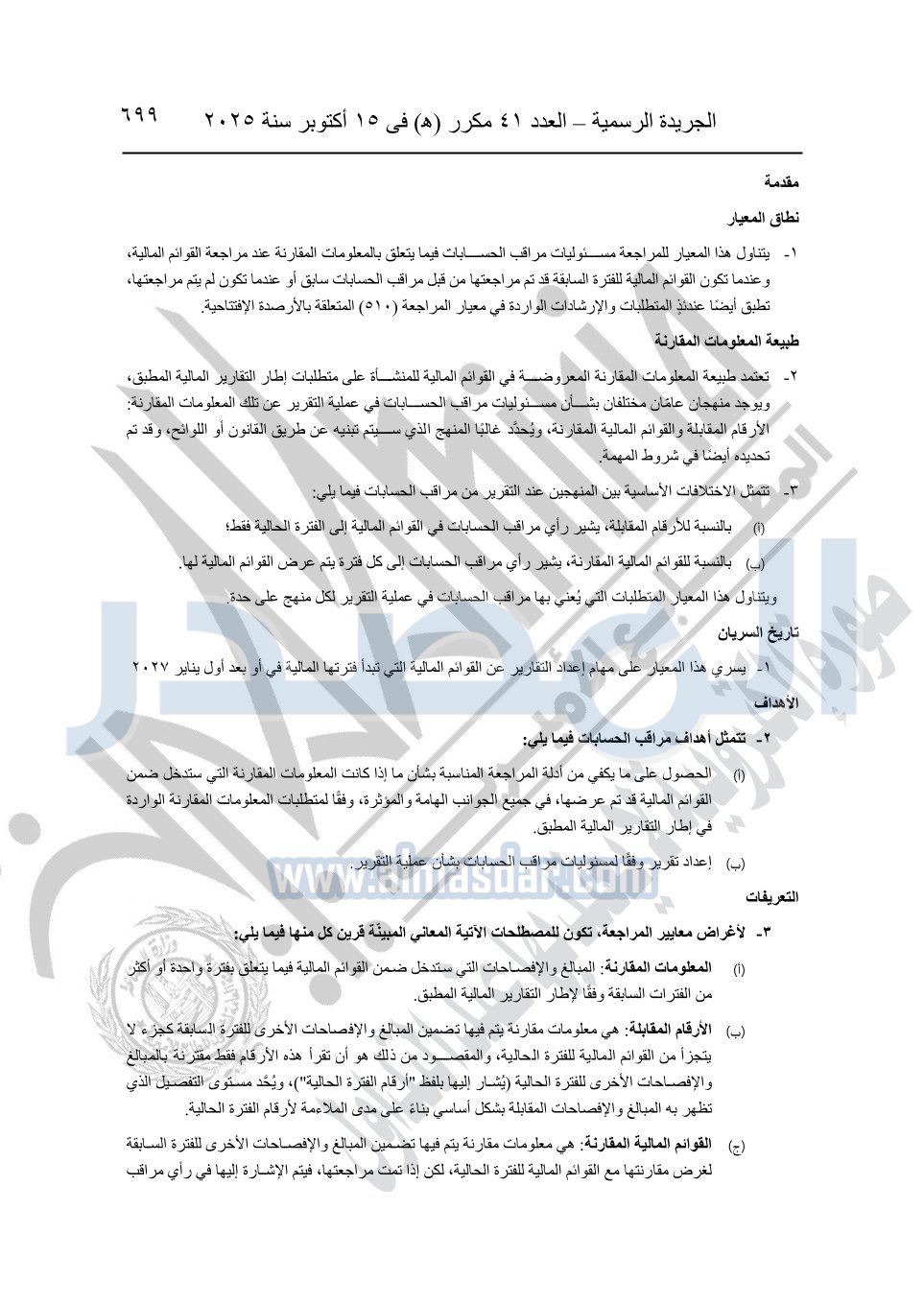 نشرت الجريدة الرسمية في العدد 41 مكرر "هـ" الصادر في 15 أكتوبر سنة 2025، قرار رئيس مجلس الوزراء رقم 3725 لسنة 2025، بشأن العمل بالمعايير المصرية للمراجعة والفحص المحدود ومهام التأكد الأخرى المرافقة لهذا القرار.