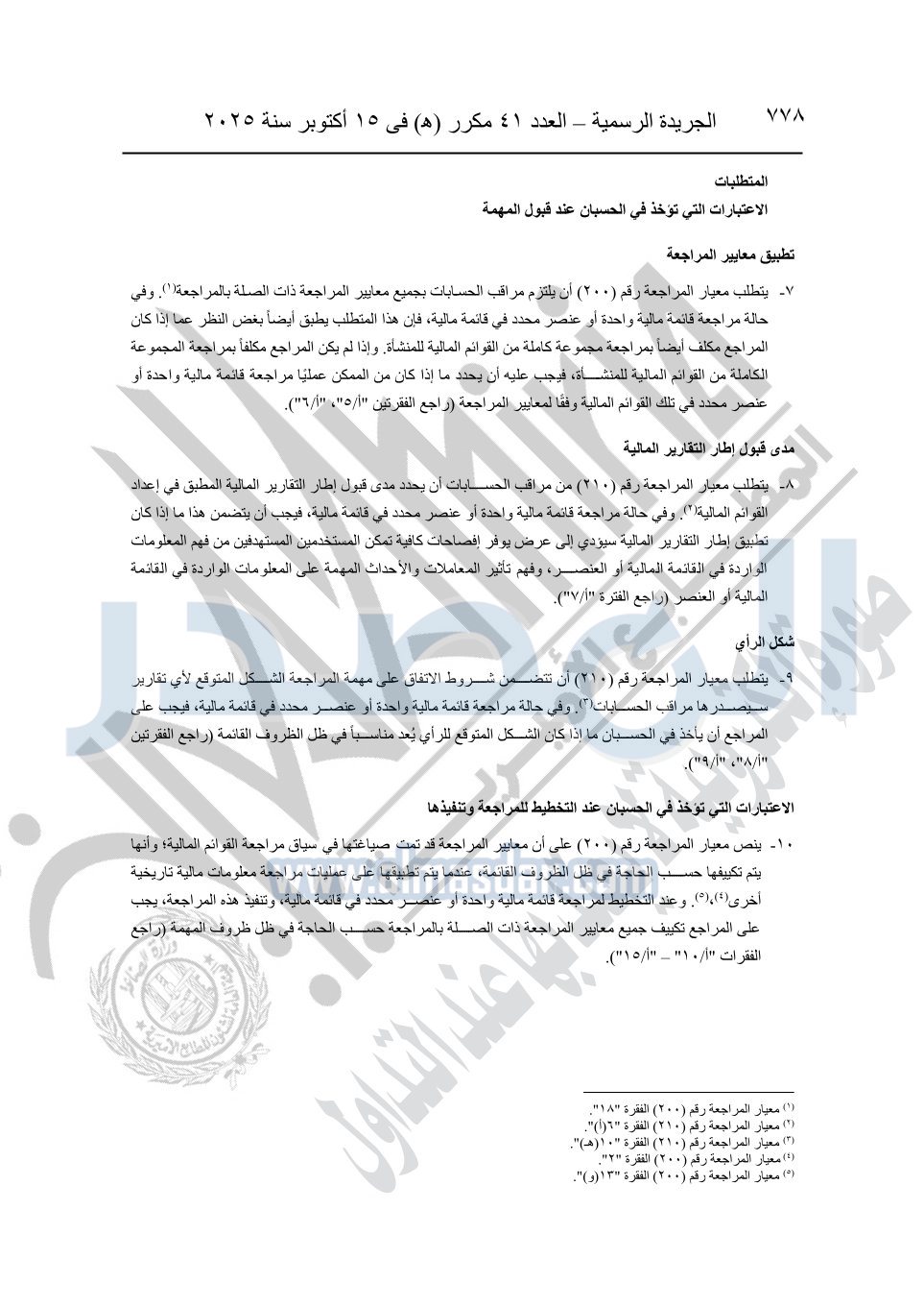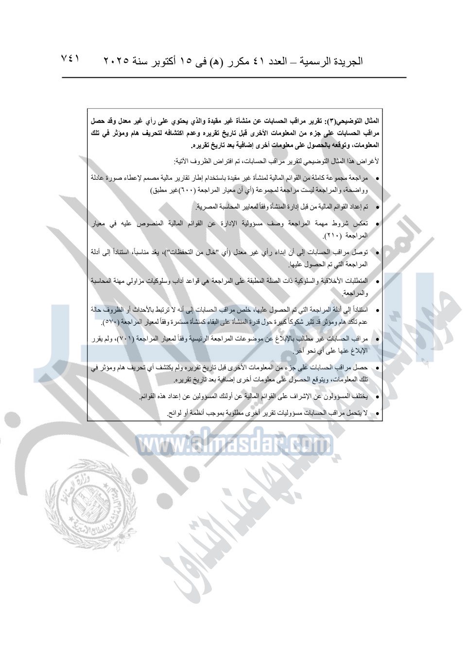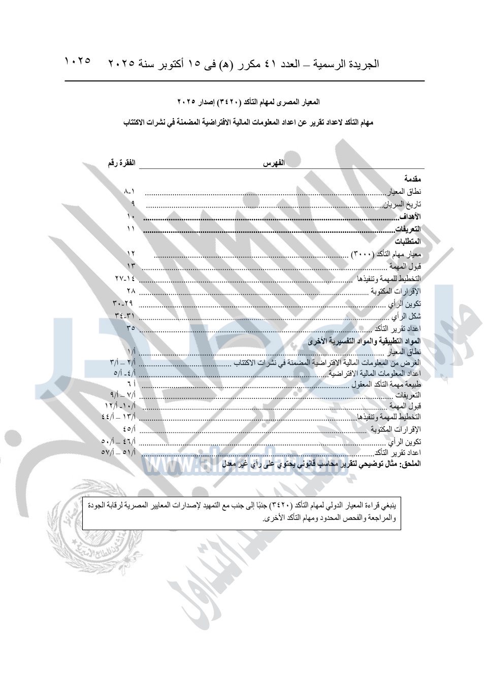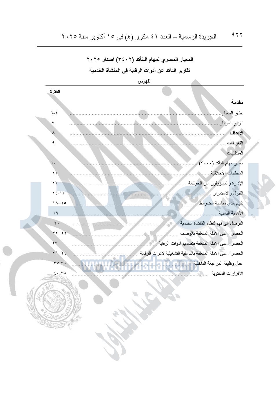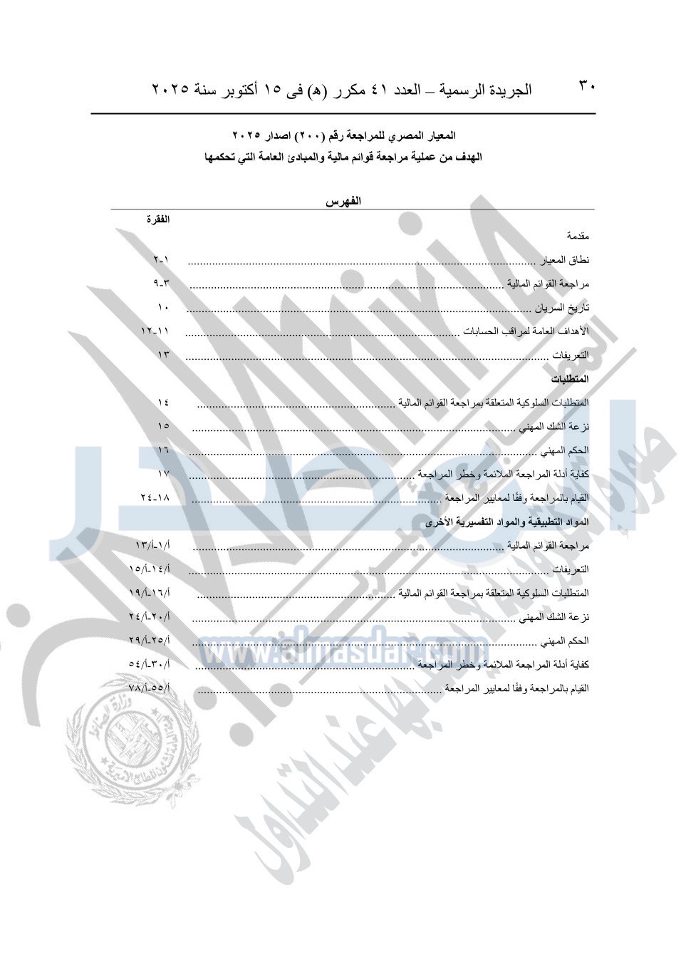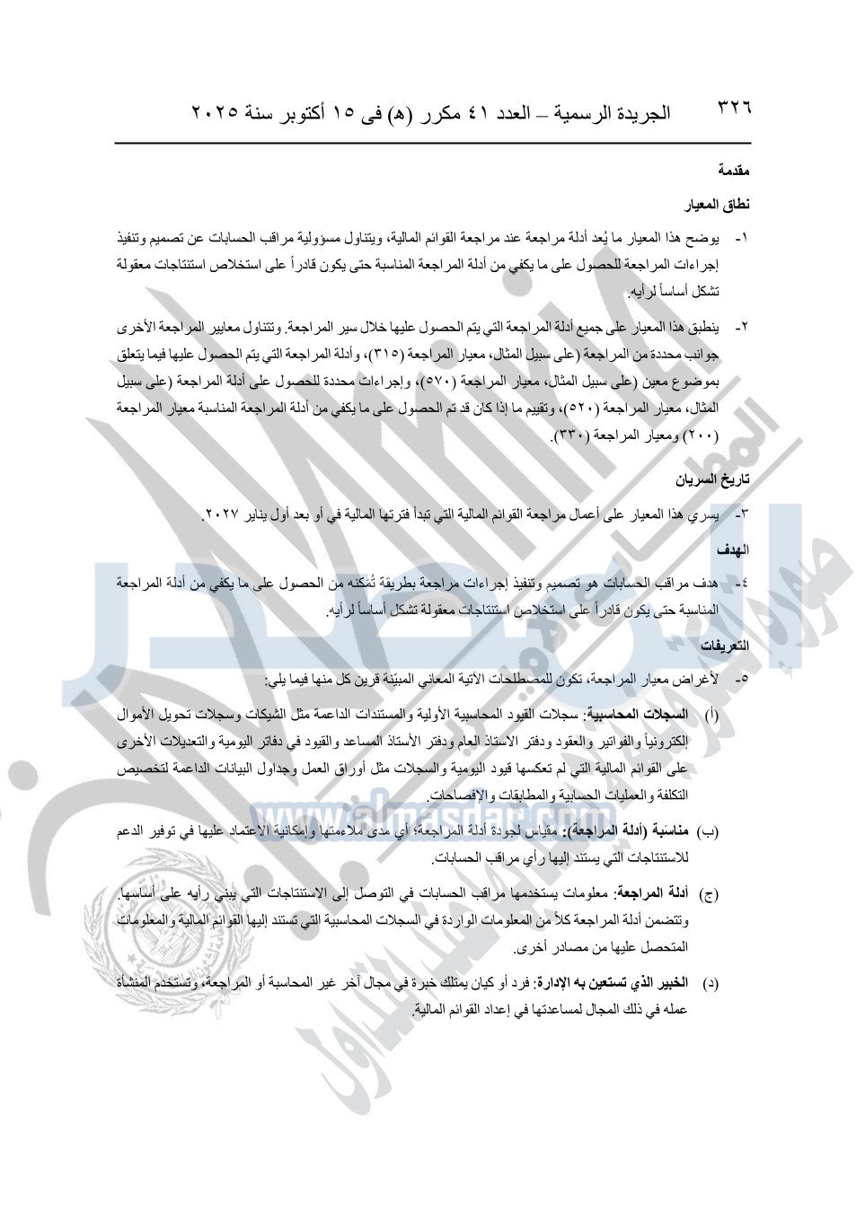 نشرت الجريدة الرسمية في العدد 41 مكرر "هـ" الصادر في 15 أكتوبر سنة 2025، قرار رئيس مجلس الوزراء رقم 3725 لسنة 2025، بشأن العمل بالمعايير المصرية للمراجعة والفحص المحدود ومهام التأكد الأخرى المرافقة لهذا القرار.