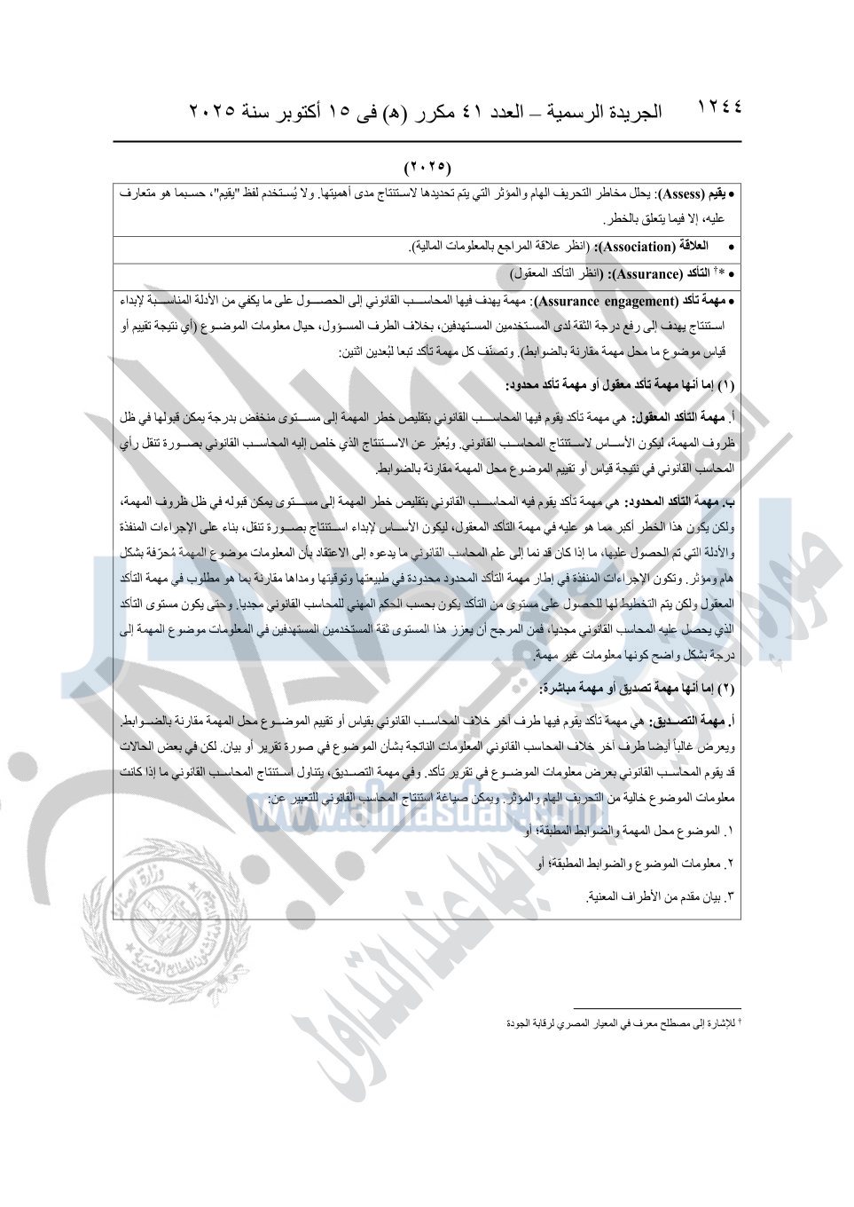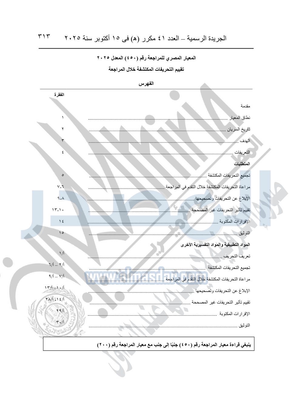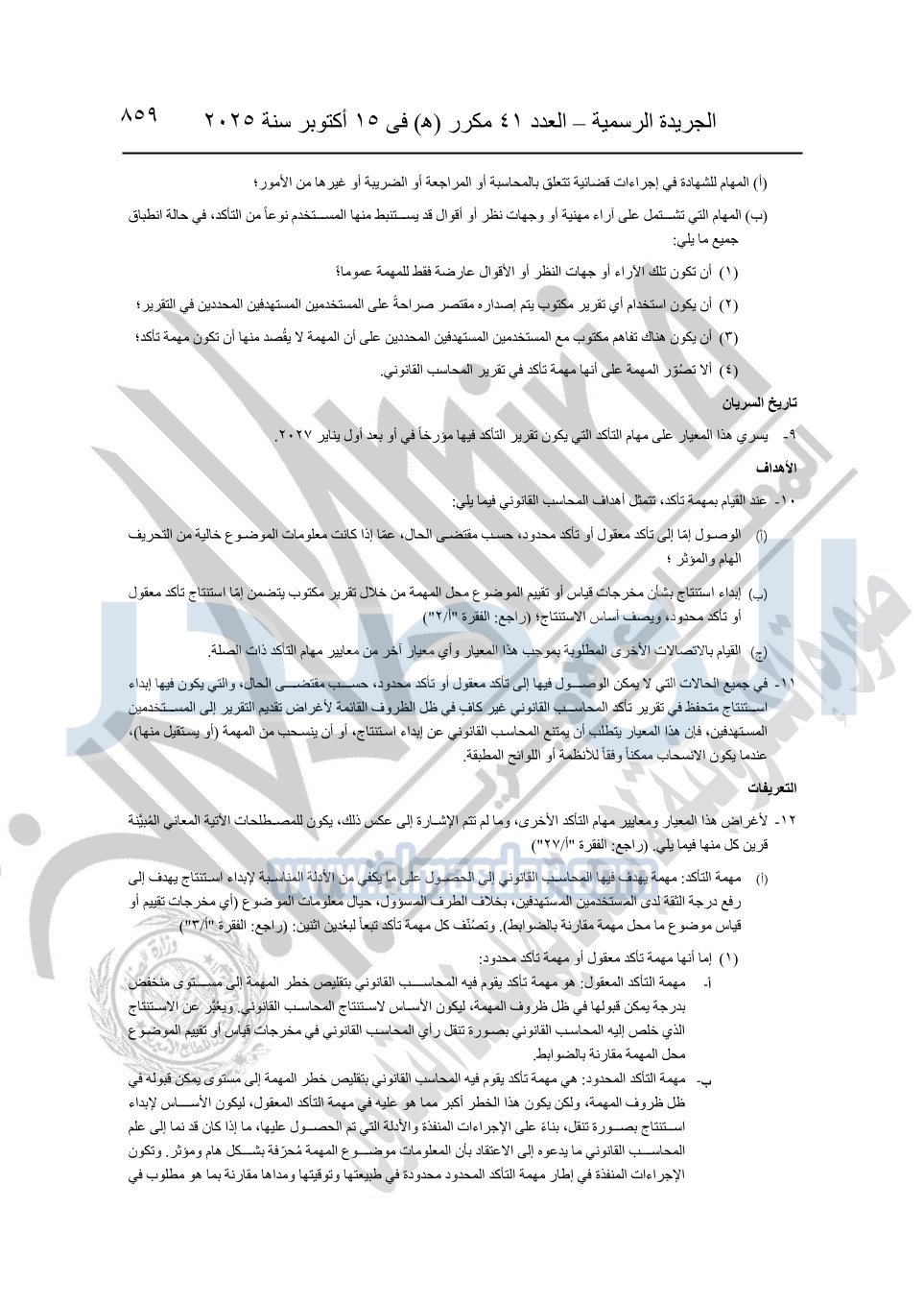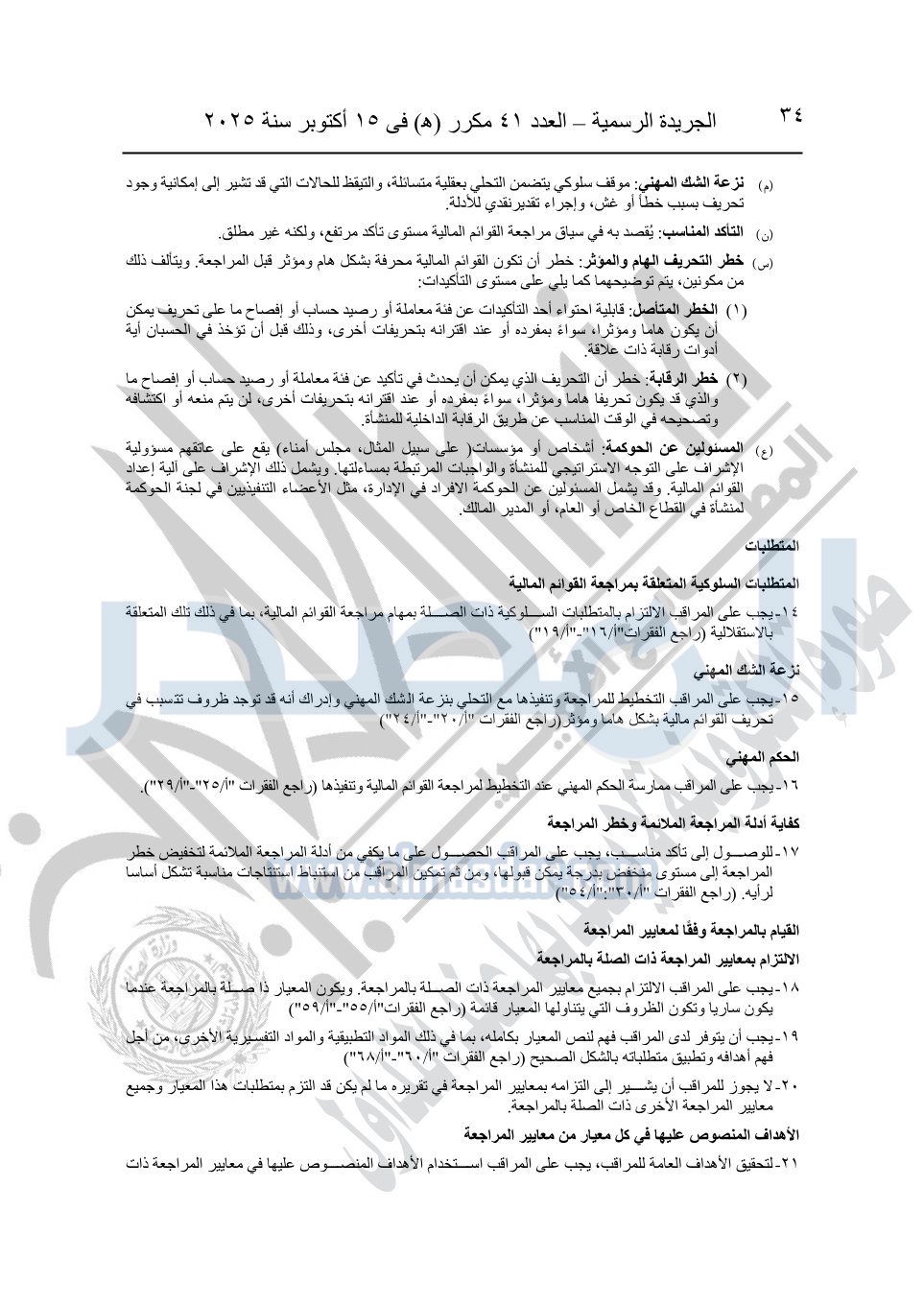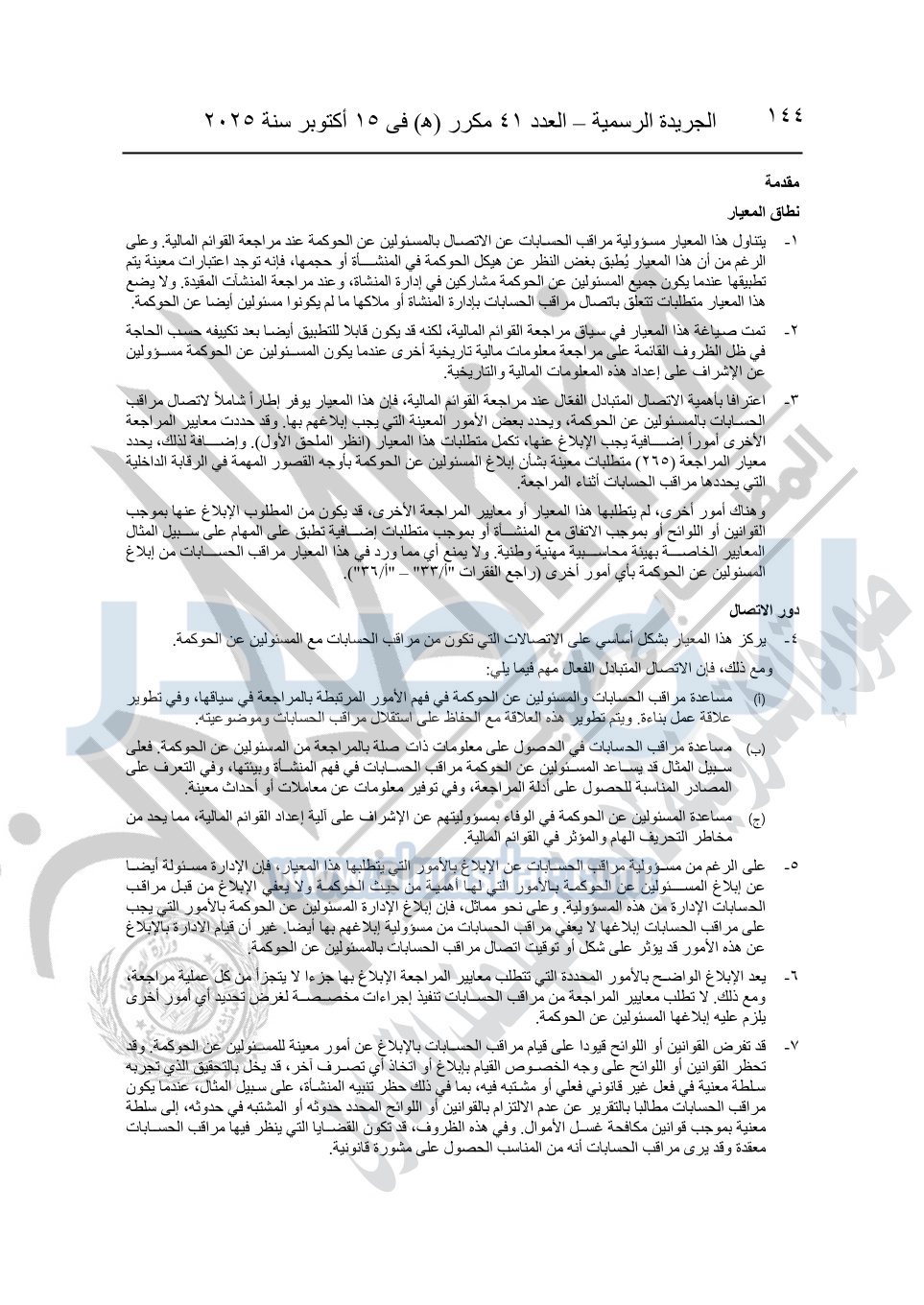 نشرت الجريدة الرسمية في العدد 41 مكرر "هـ" الصادر في 15 أكتوبر سنة 2025، قرار رئيس مجلس الوزراء رقم 3725 لسنة 2025، بشأن العمل بالمعايير المصرية للمراجعة والفحص المحدود ومهام التأكد الأخرى المرافقة لهذا القرار.