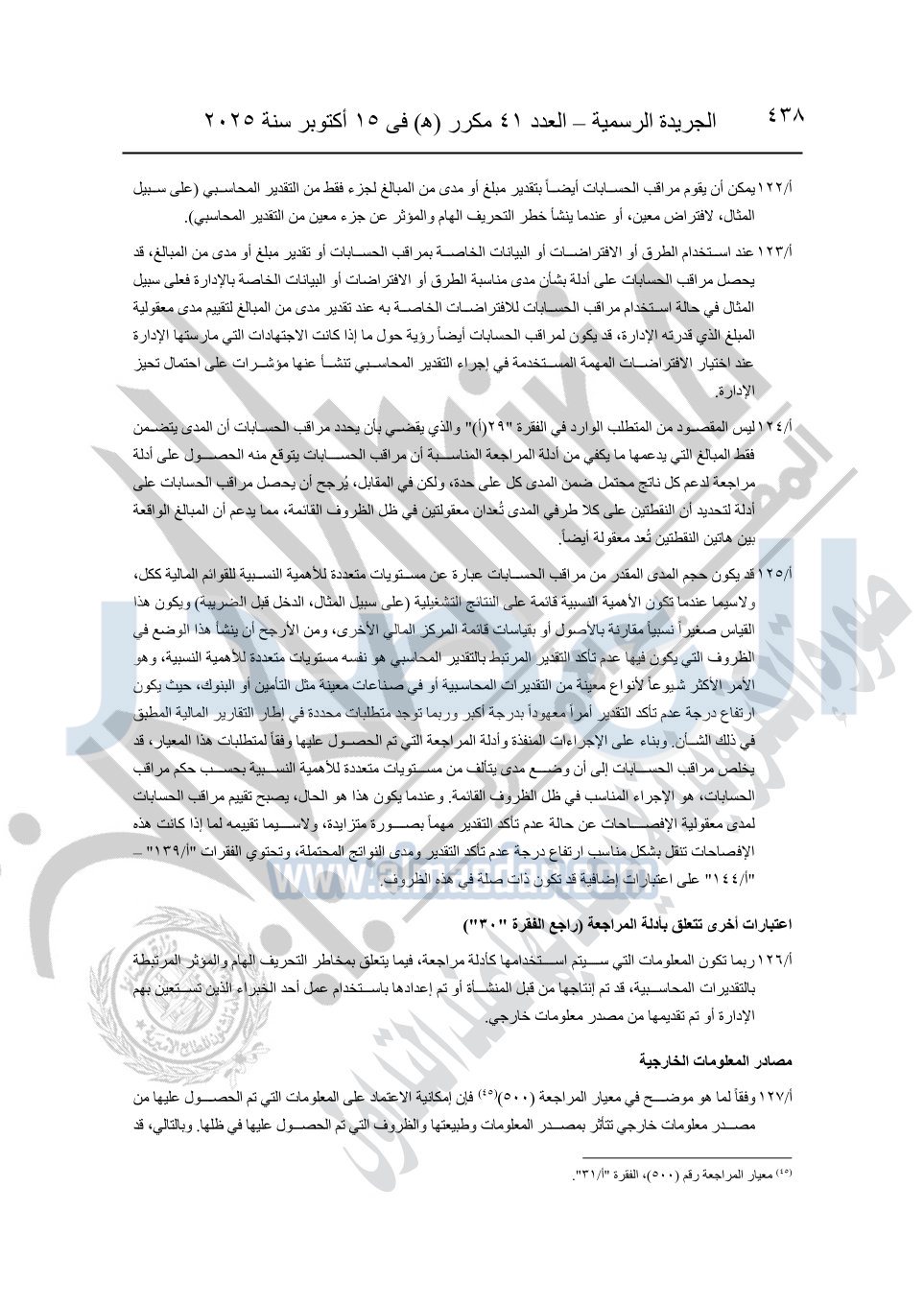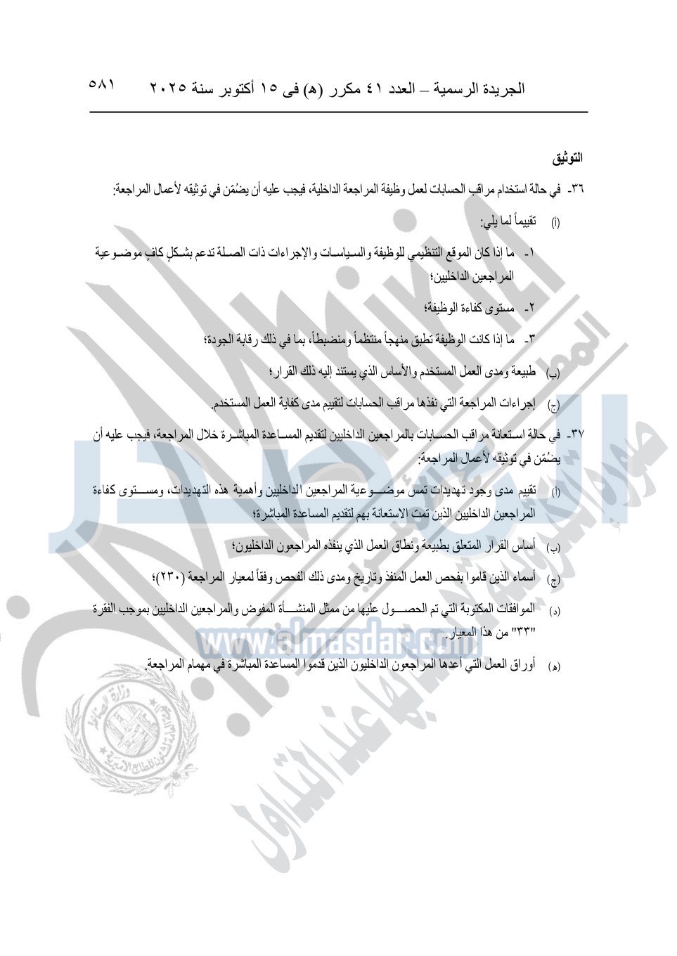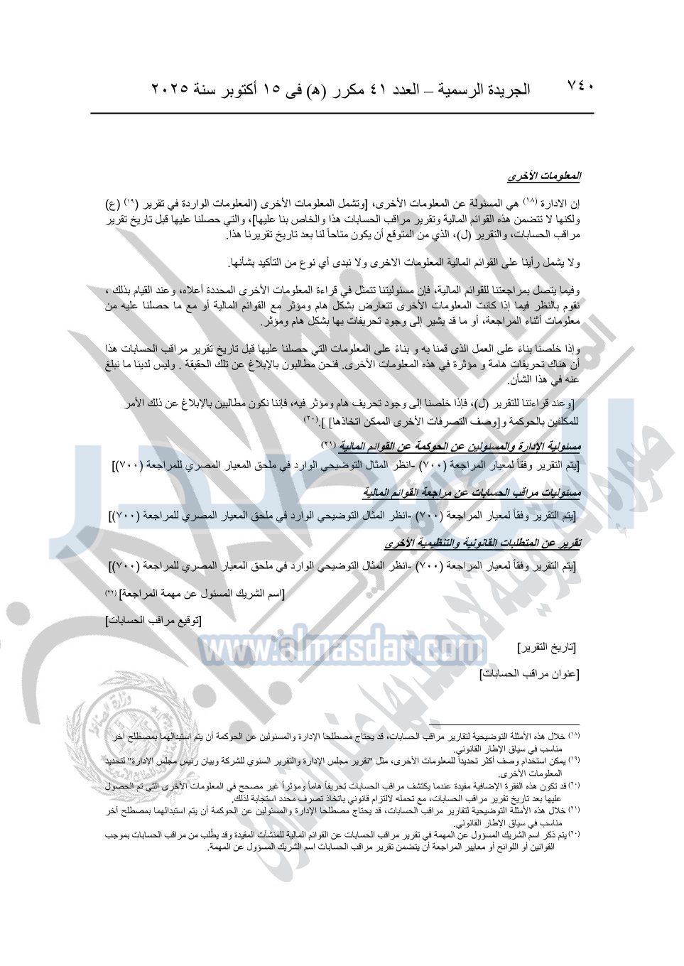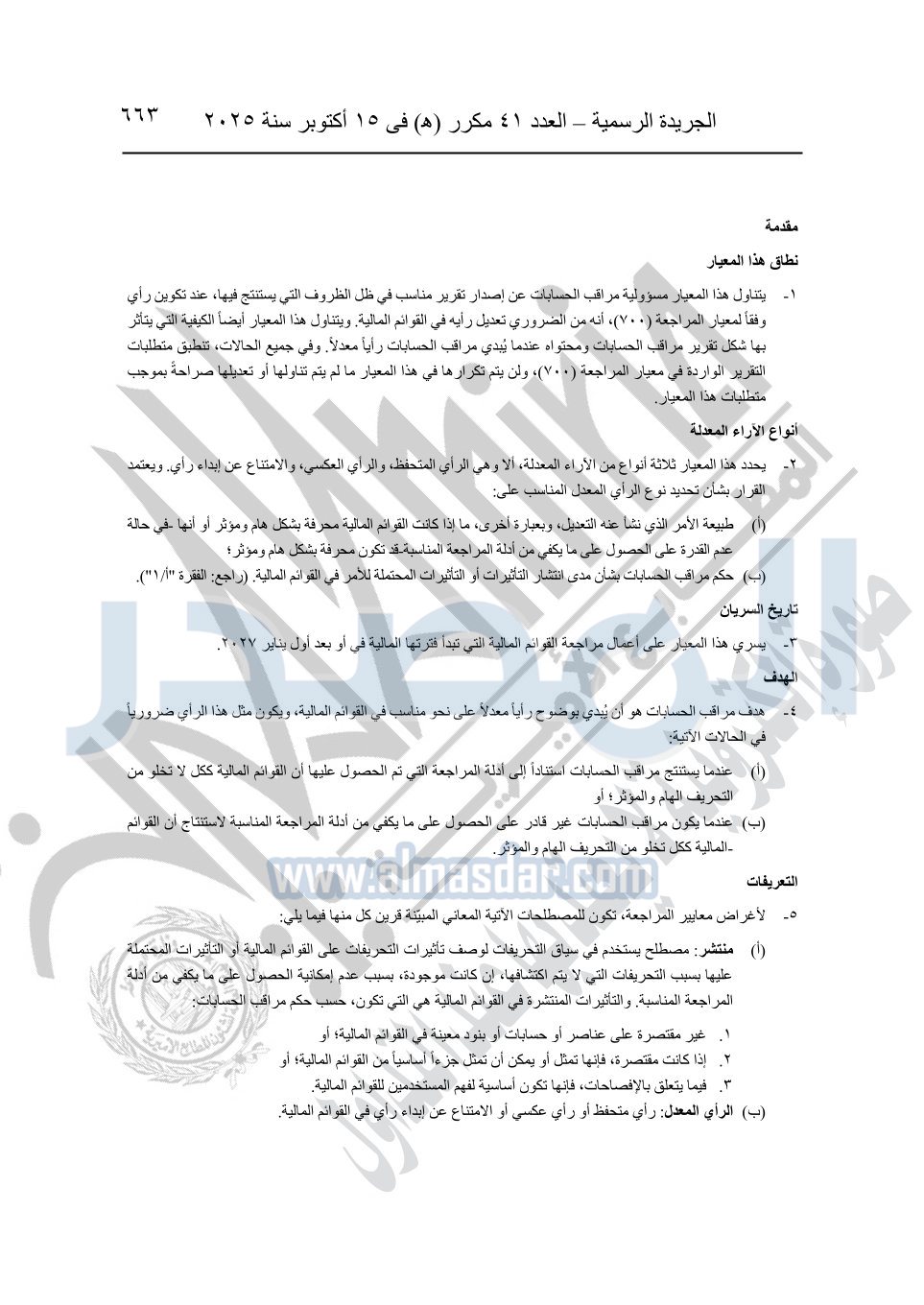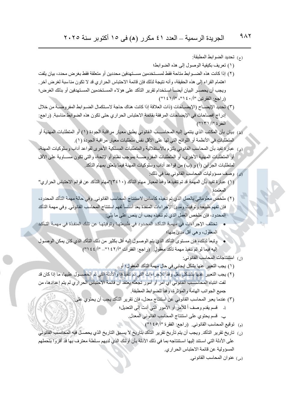 نشرت الجريدة الرسمية في العدد 41 مكرر "هـ" الصادر في 15 أكتوبر سنة 2025، قرار رئيس مجلس الوزراء رقم 3725 لسنة 2025، بشأن العمل بالمعايير المصرية للمراجعة والفحص المحدود ومهام التأكد الأخرى المرافقة لهذا القرار.