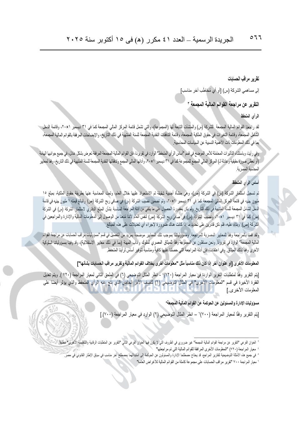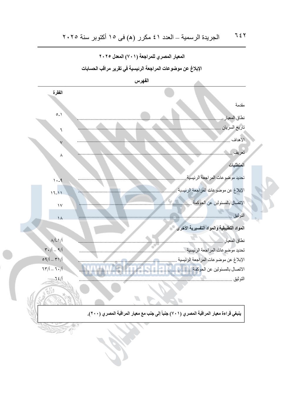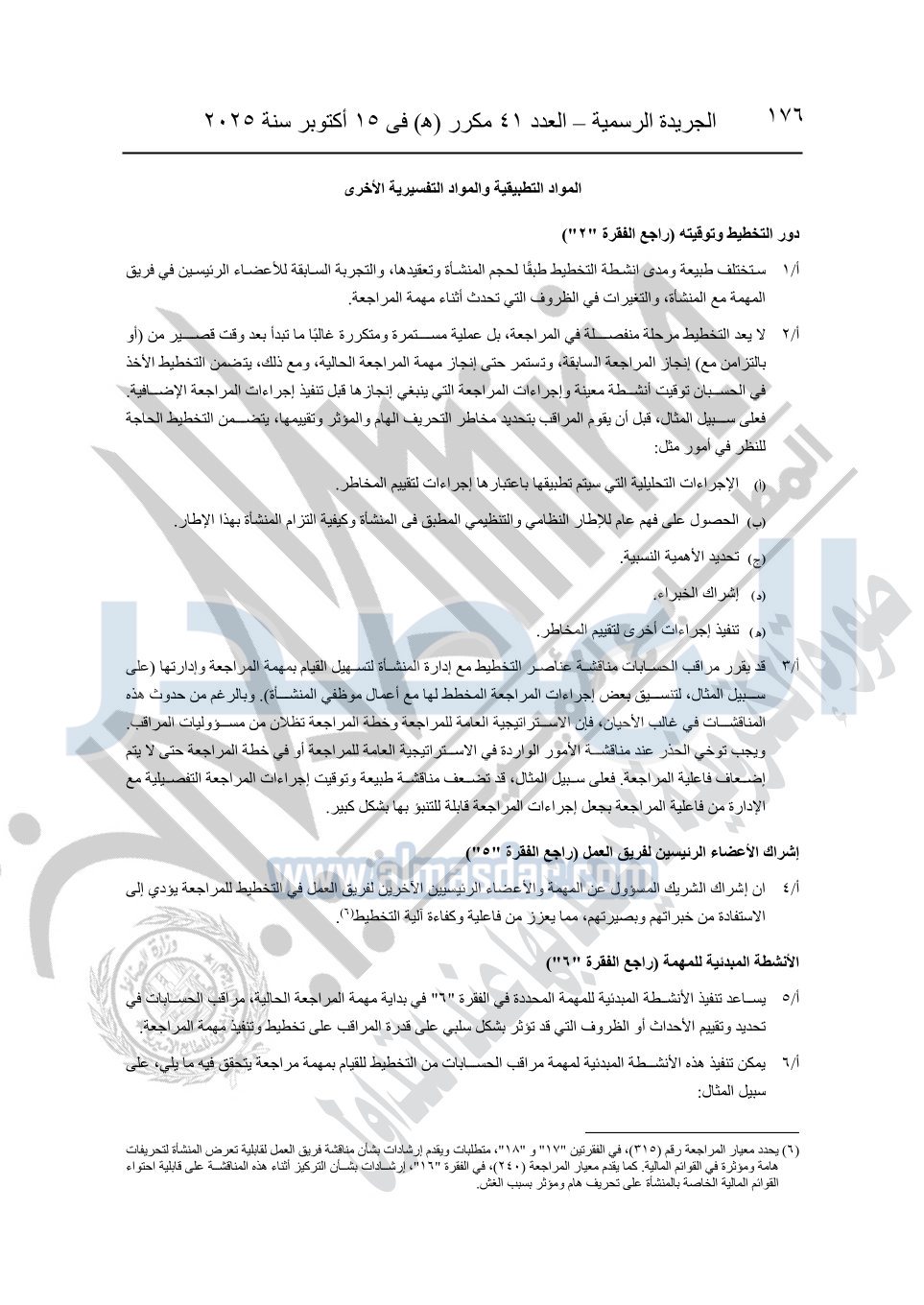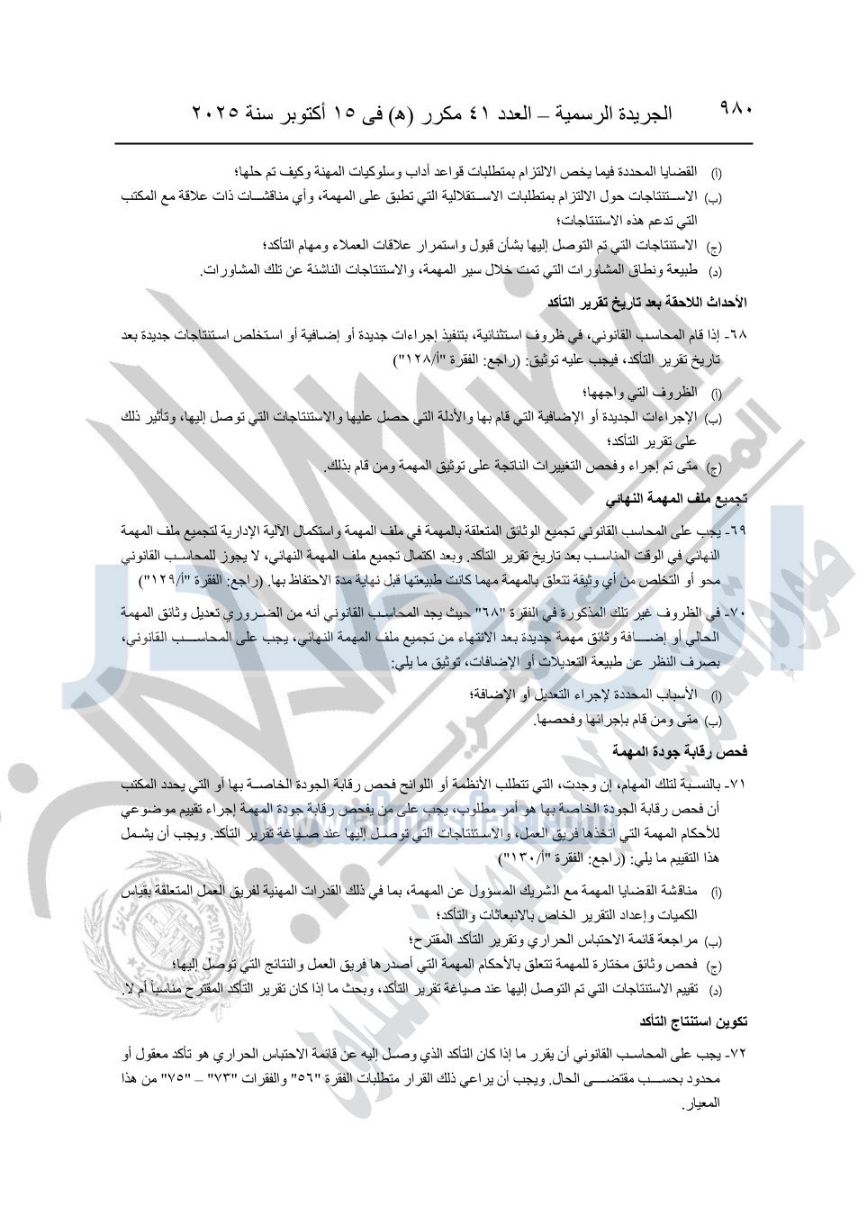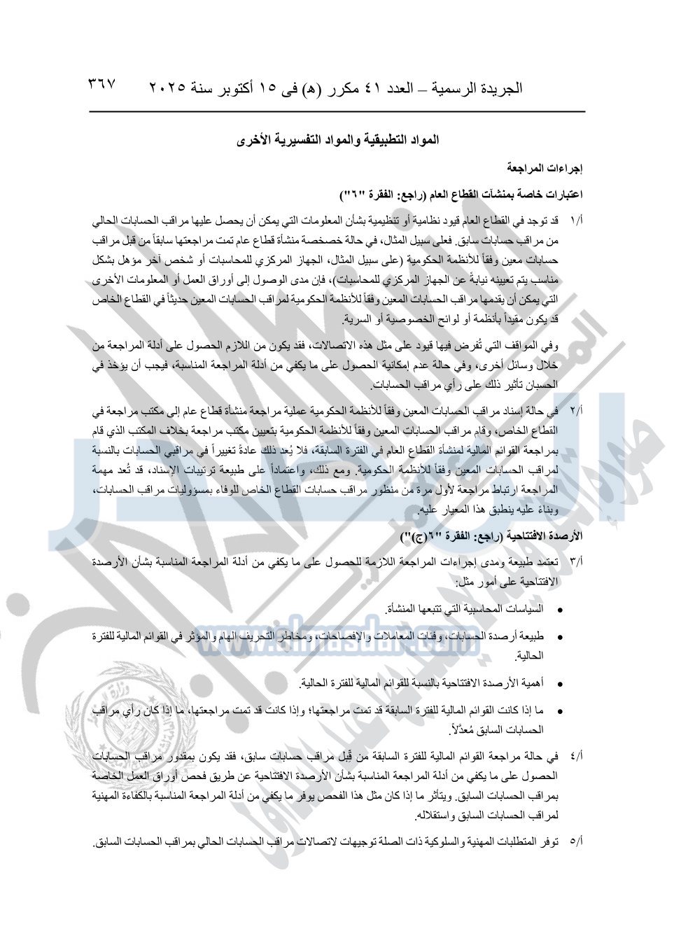 نشرت الجريدة الرسمية في العدد 41 مكرر "هـ" الصادر في 15 أكتوبر سنة 2025، قرار رئيس مجلس الوزراء رقم 3725 لسنة 2025، بشأن العمل بالمعايير المصرية للمراجعة والفحص المحدود ومهام التأكد الأخرى المرافقة لهذا القرار.