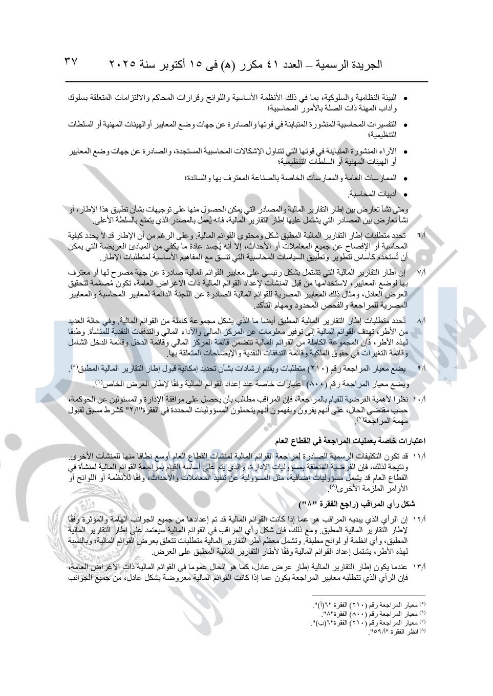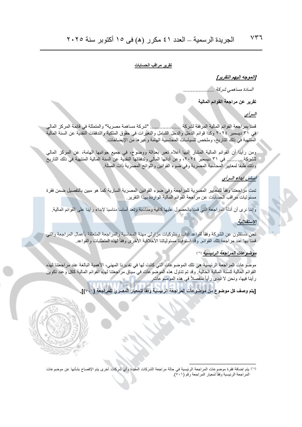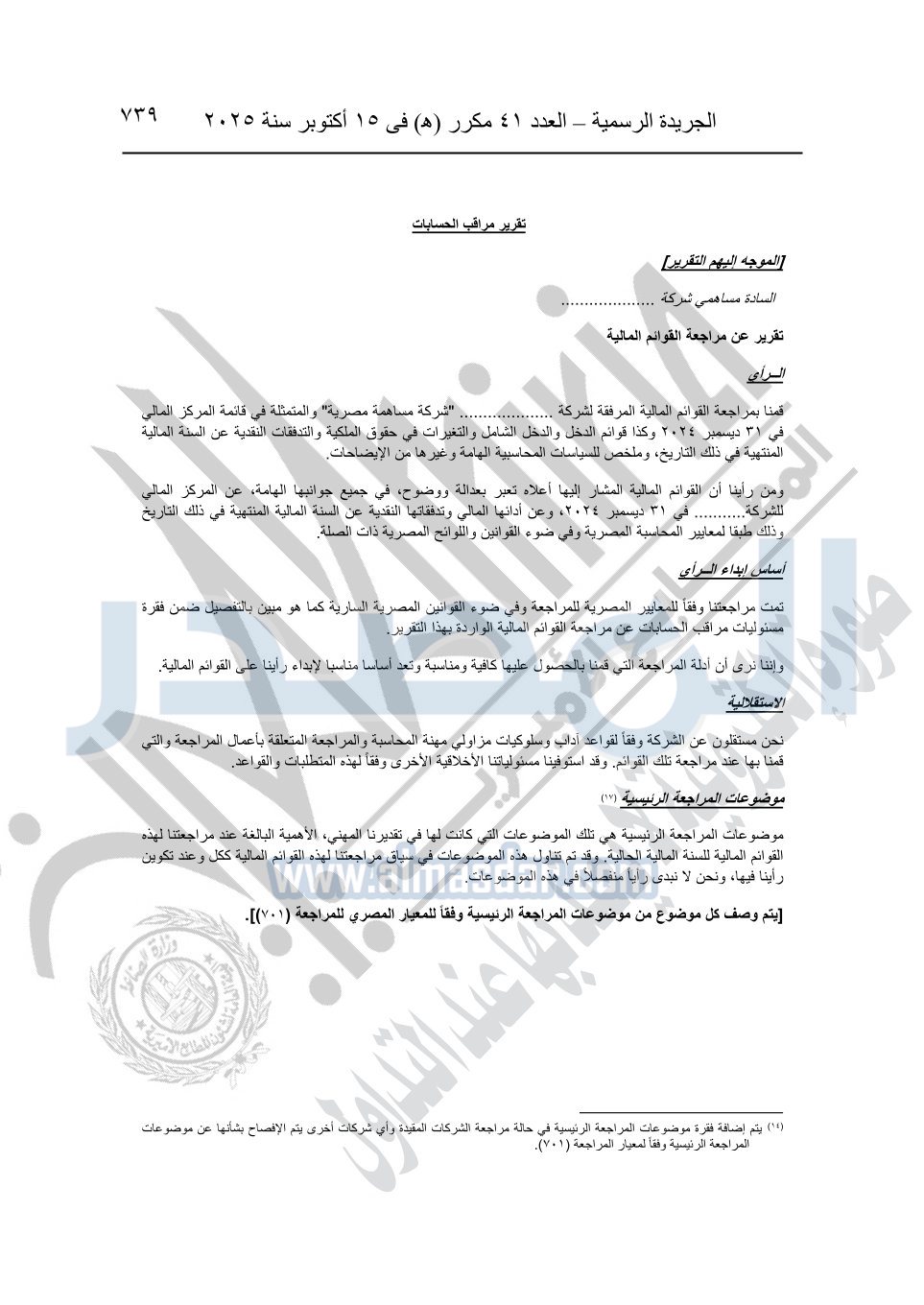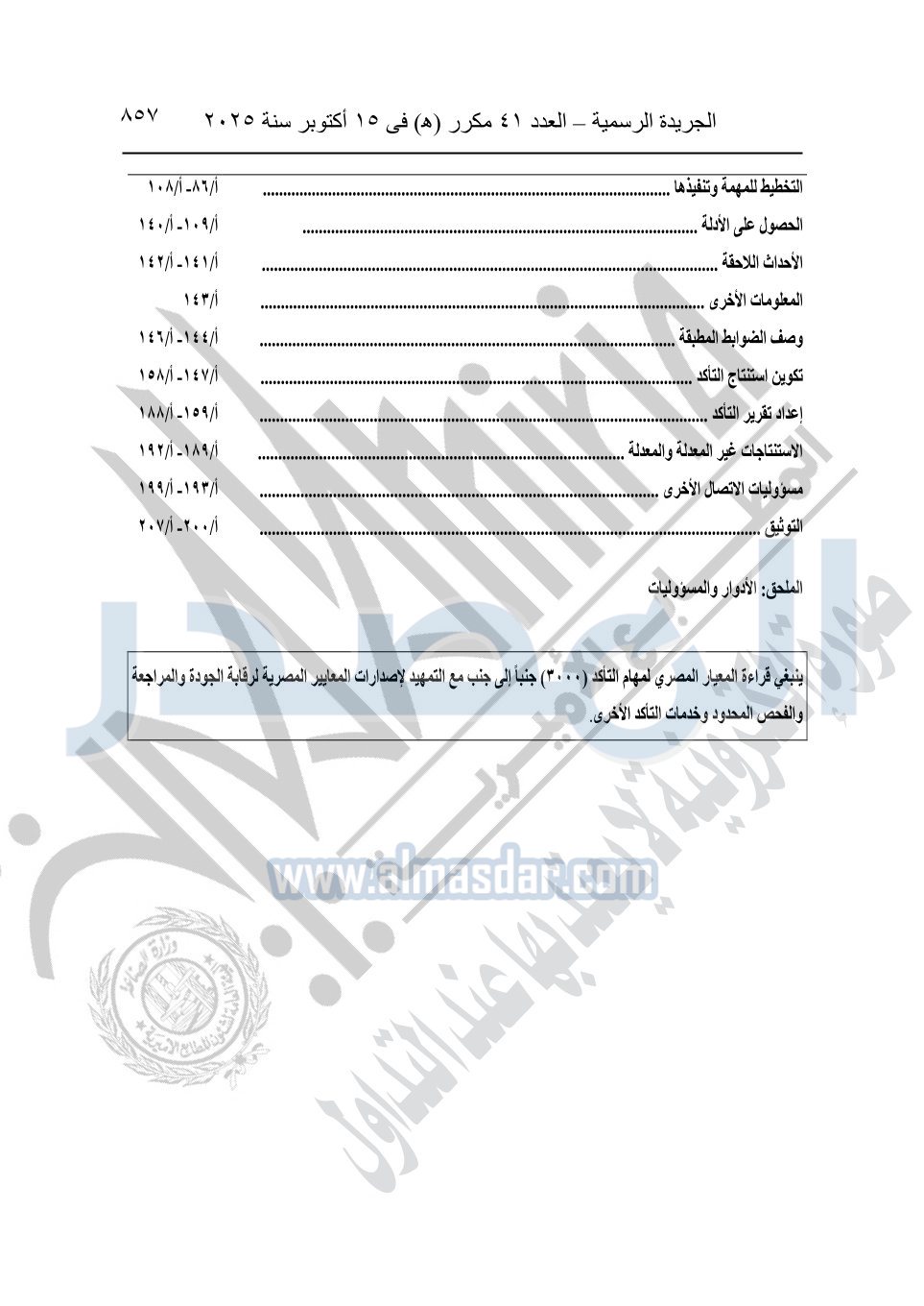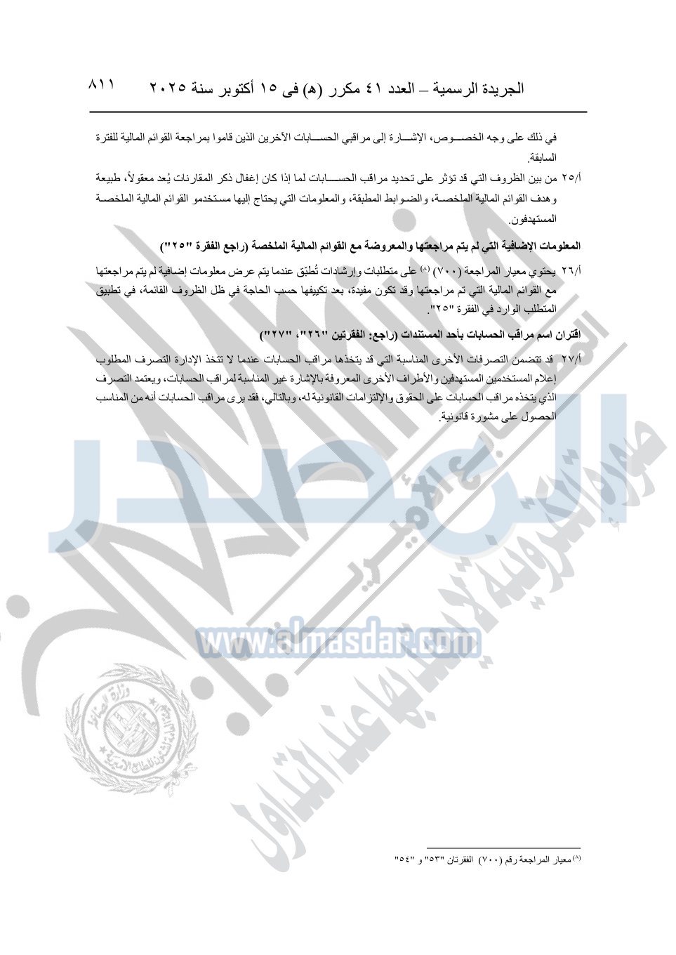 نشرت الجريدة الرسمية في العدد 41 مكرر "هـ" الصادر في 15 أكتوبر سنة 2025، قرار رئيس مجلس الوزراء رقم 3725 لسنة 2025، بشأن العمل بالمعايير المصرية للمراجعة والفحص المحدود ومهام التأكد الأخرى المرافقة لهذا القرار.