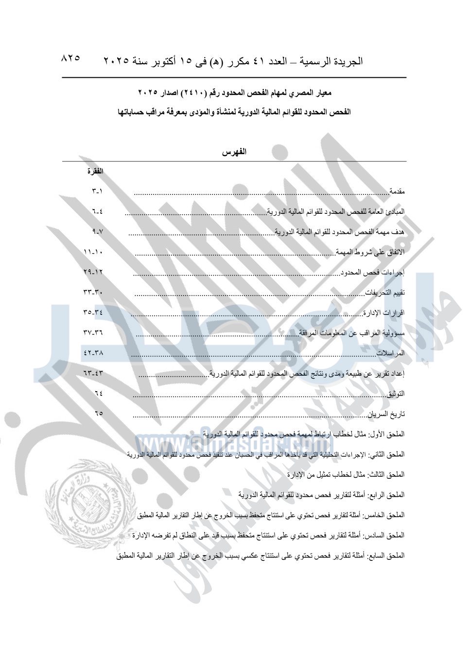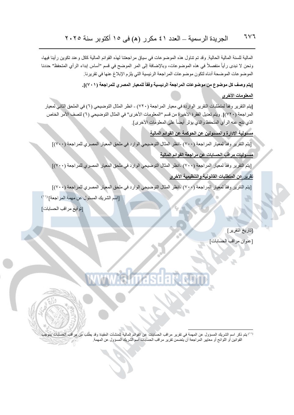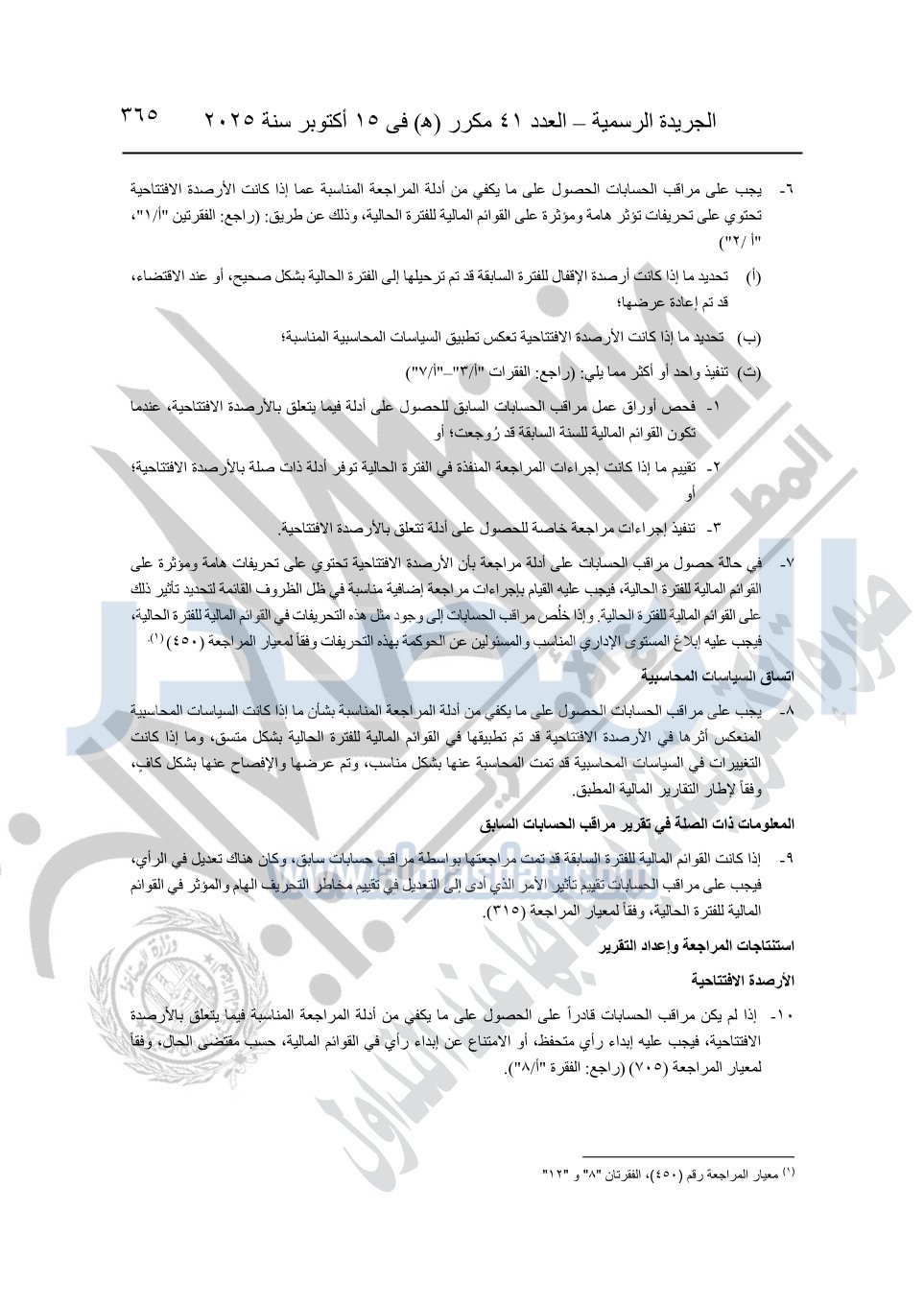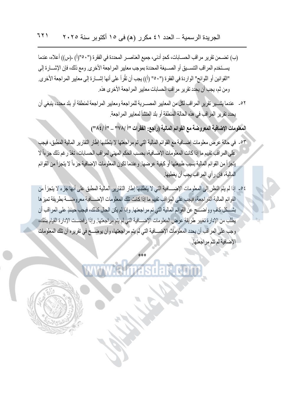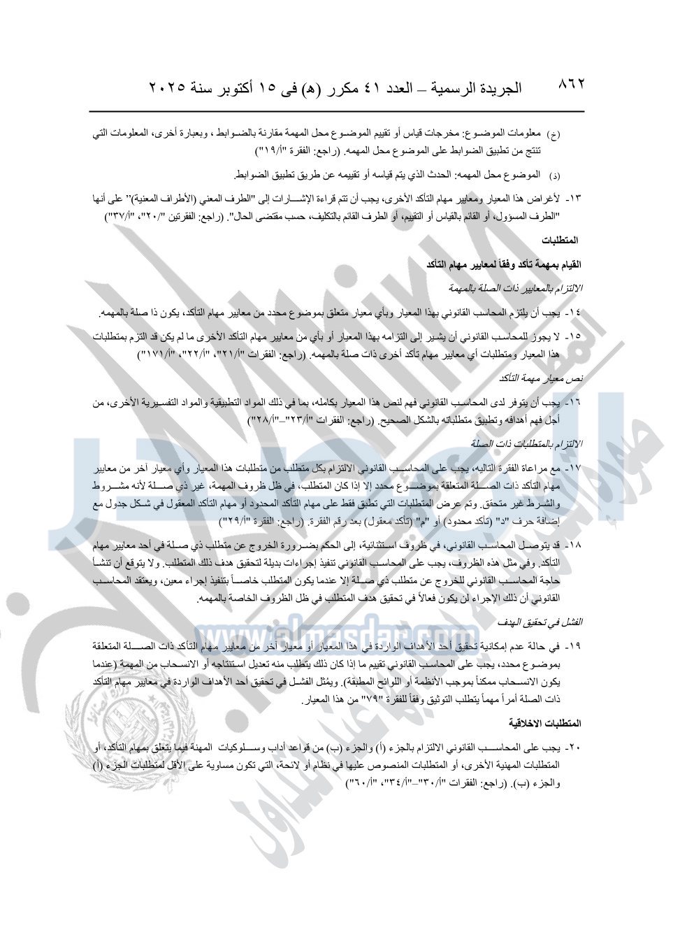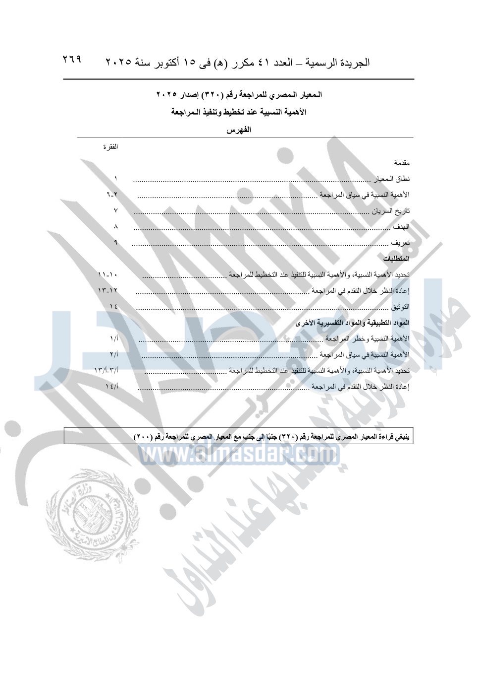 نشرت الجريدة الرسمية في العدد 41 مكرر "هـ" الصادر في 15 أكتوبر سنة 2025، قرار رئيس مجلس الوزراء رقم 3725 لسنة 2025، بشأن العمل بالمعايير المصرية للمراجعة والفحص المحدود ومهام التأكد الأخرى المرافقة لهذا القرار.