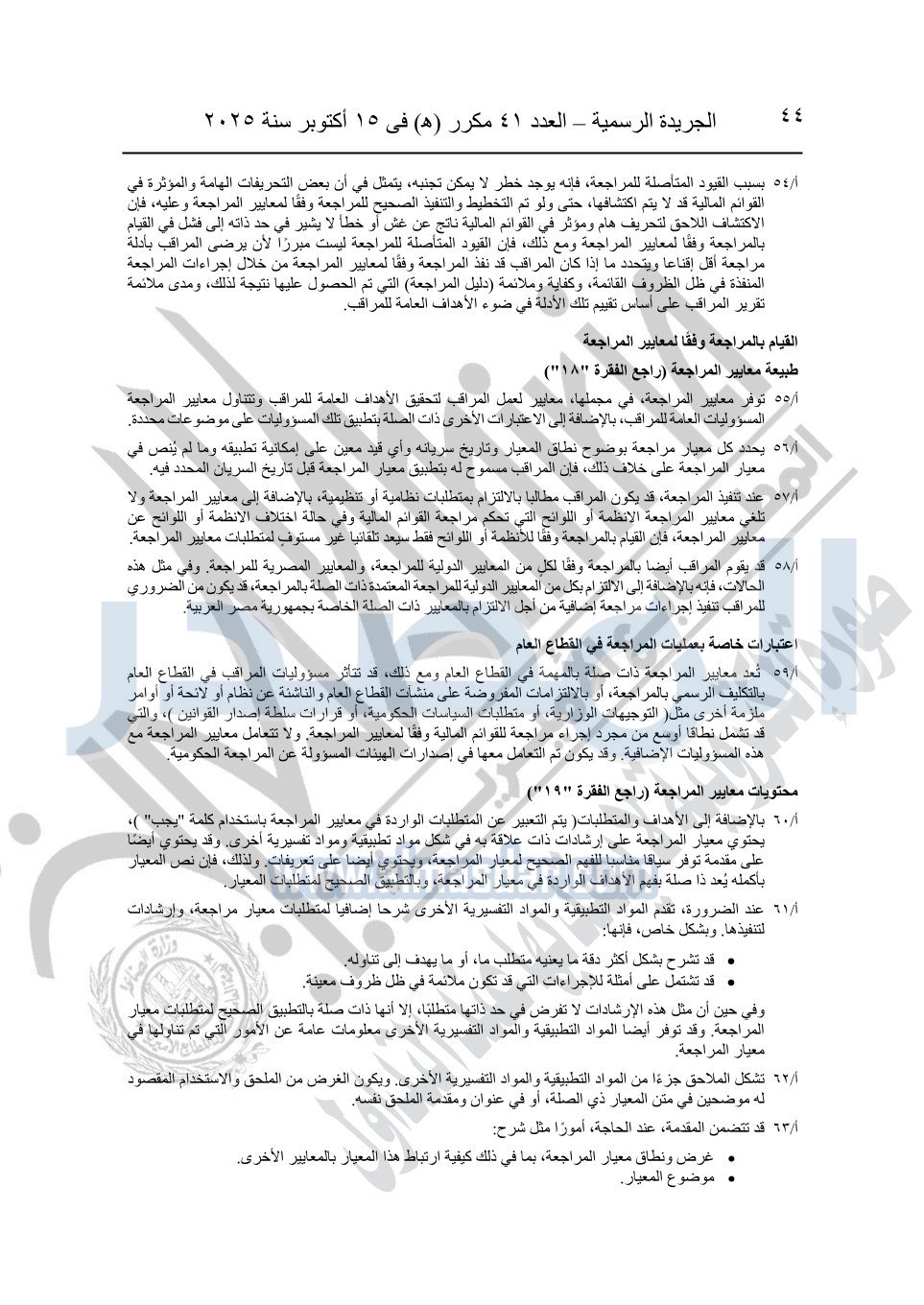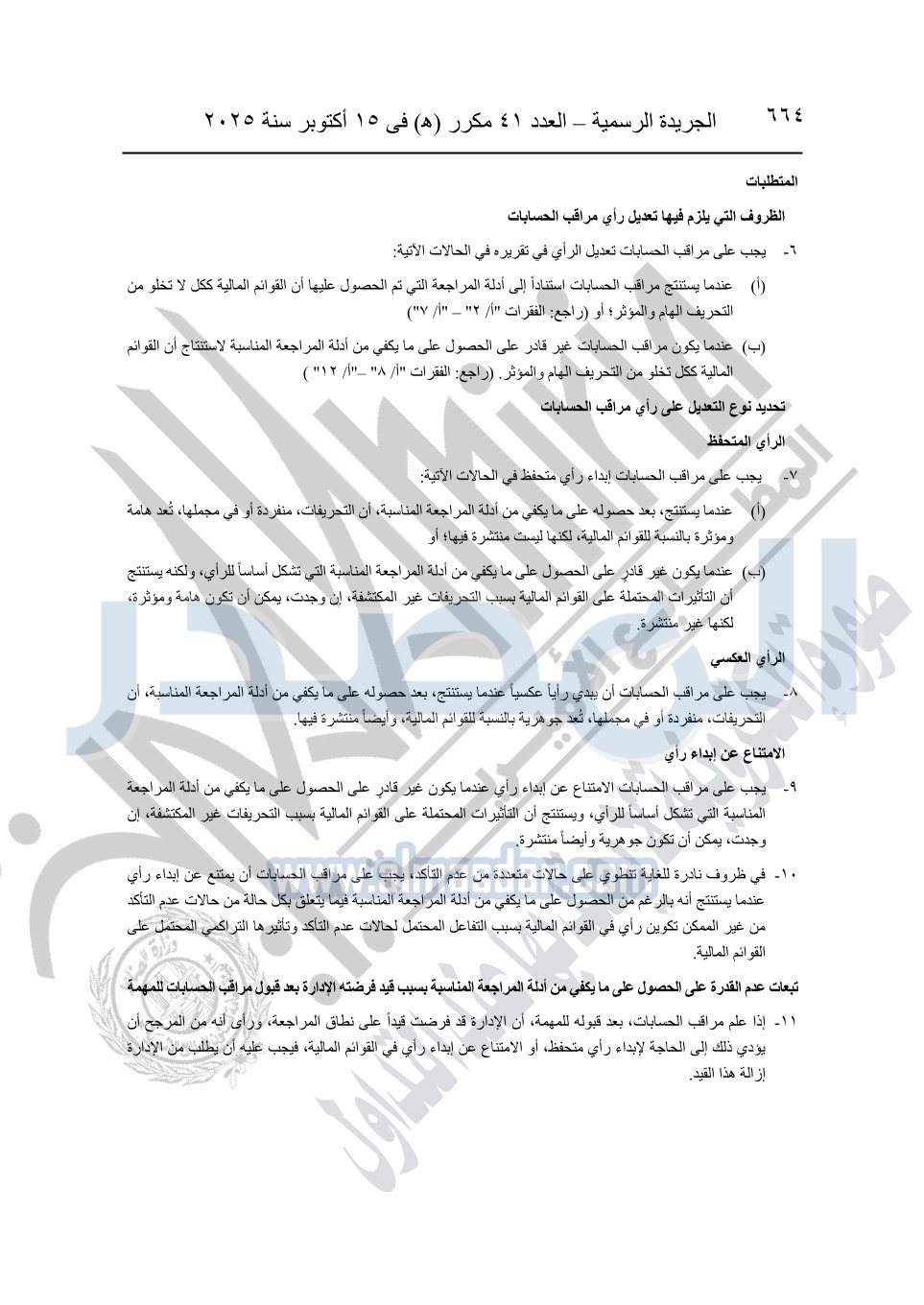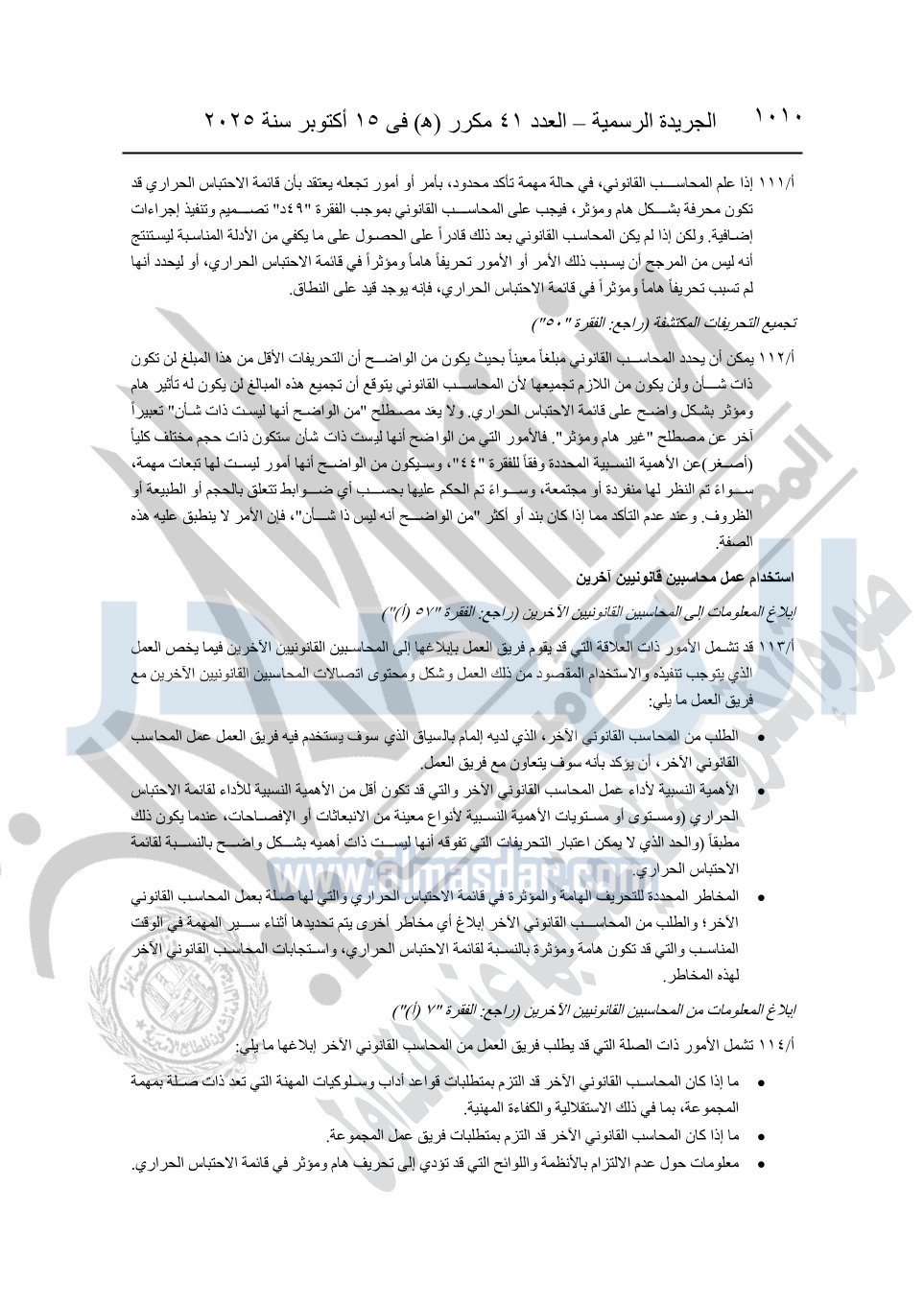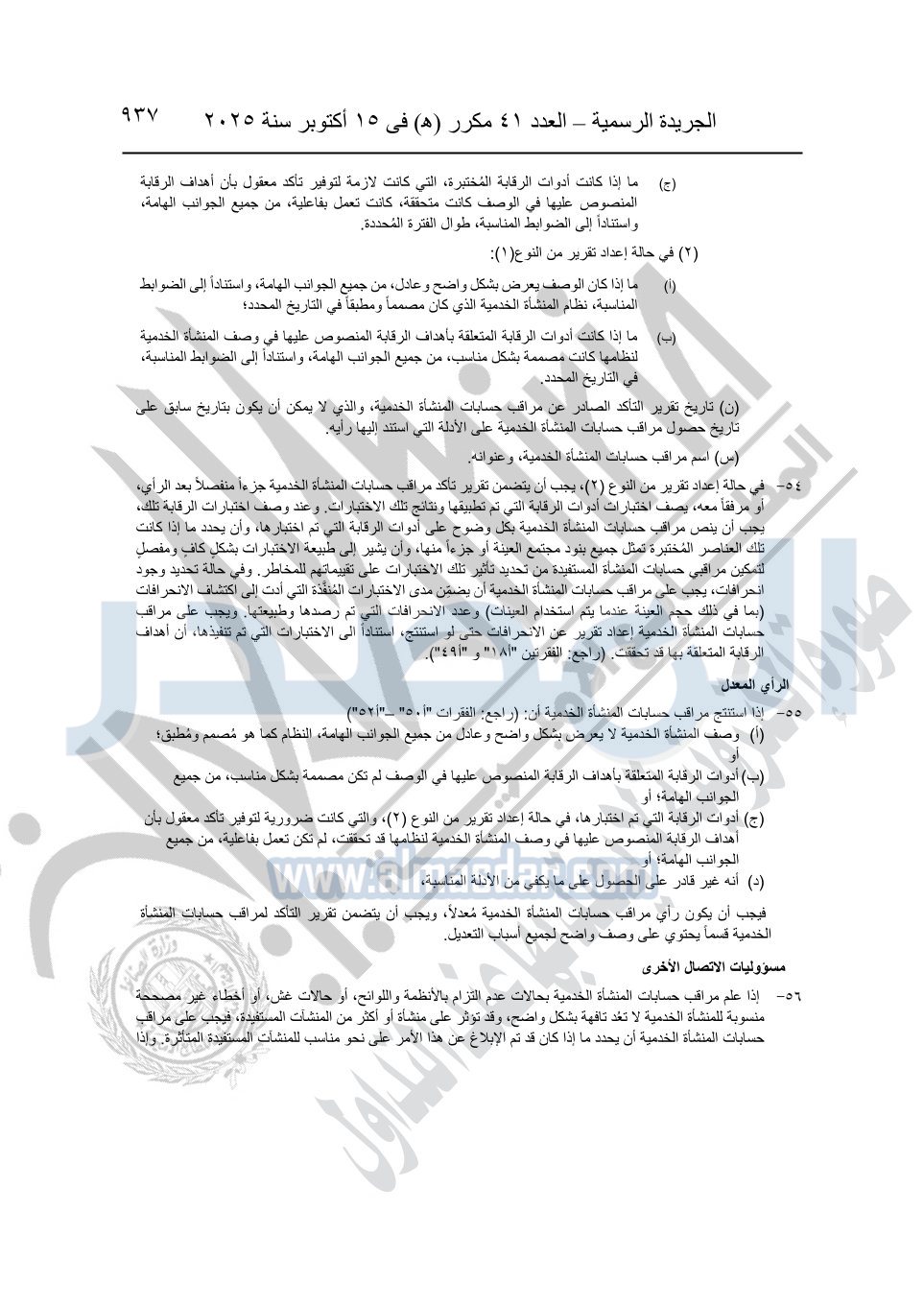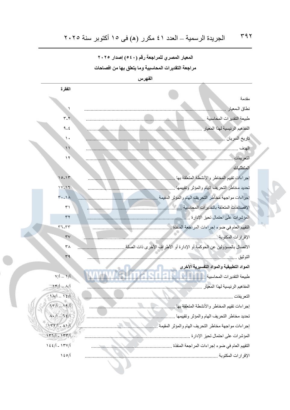 نشرت الجريدة الرسمية في العدد 41 مكرر "هـ" الصادر في 15 أكتوبر سنة 2025، قرار رئيس مجلس الوزراء رقم 3725 لسنة 2025، بشأن العمل بالمعايير المصرية للمراجعة والفحص المحدود ومهام التأكد الأخرى المرافقة لهذا القرار.