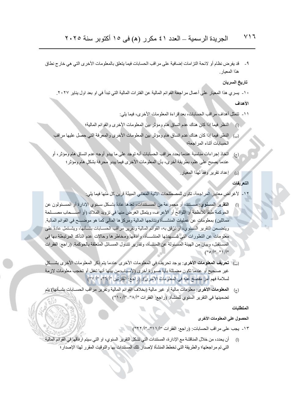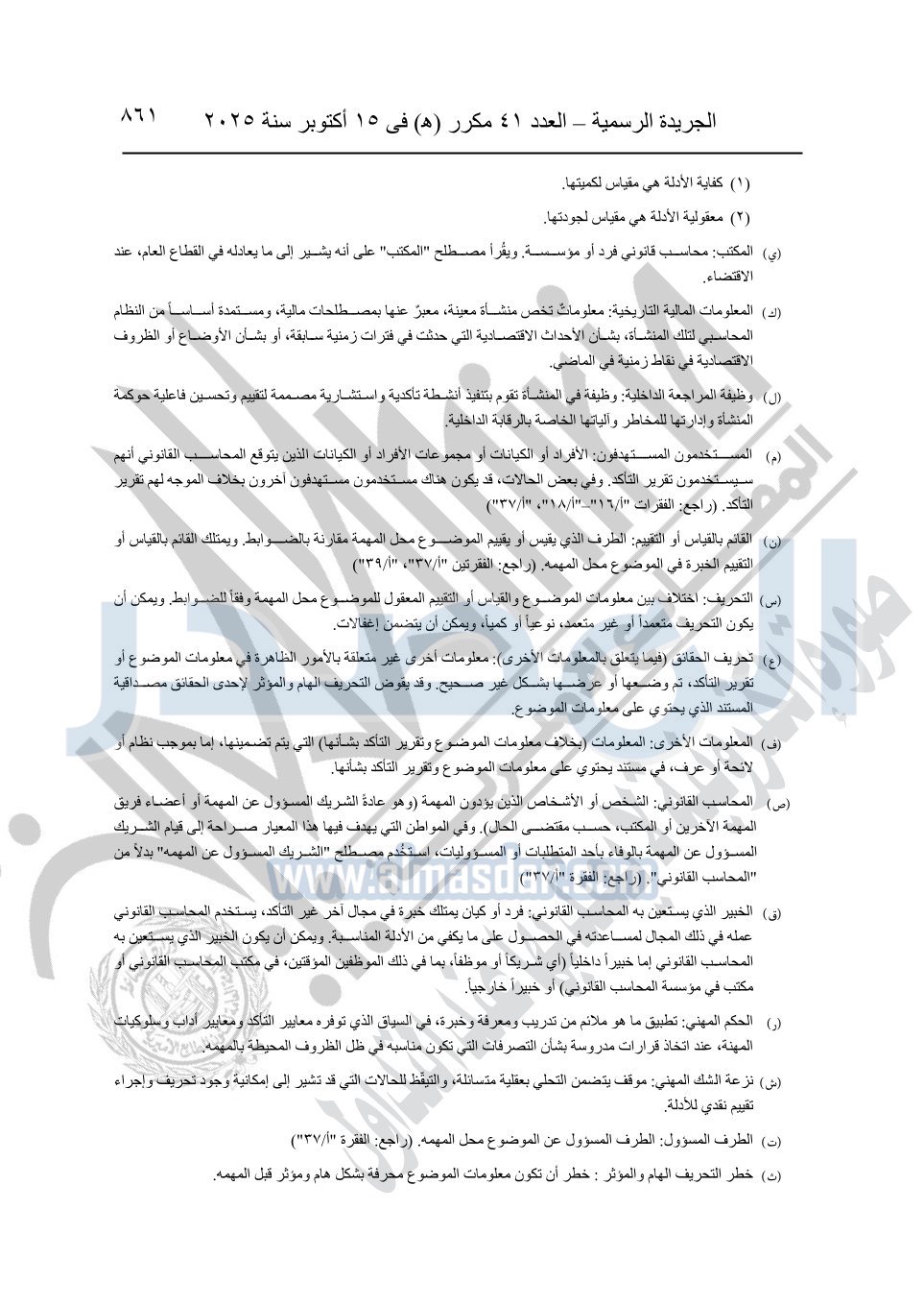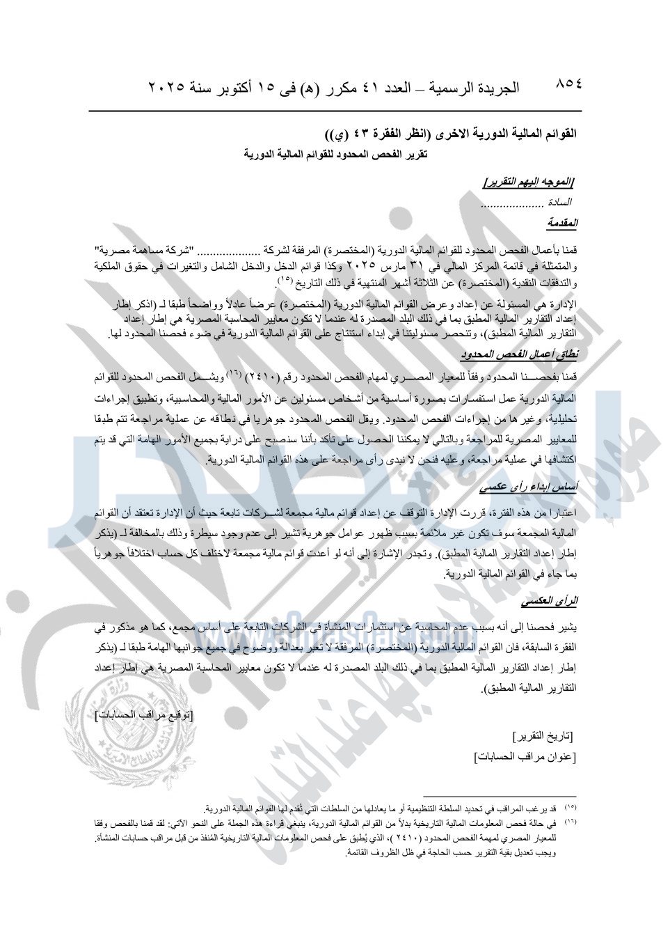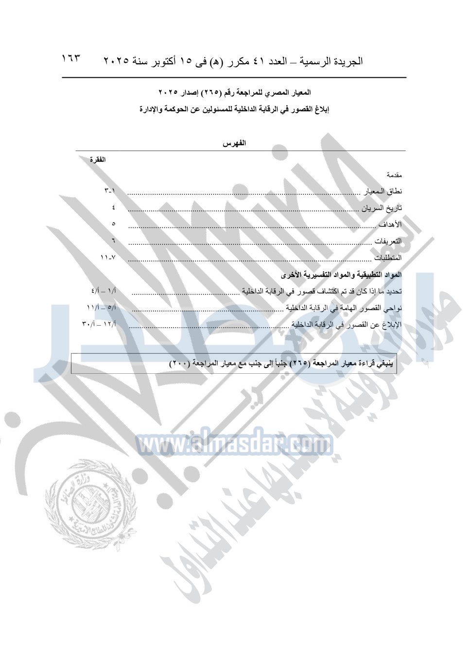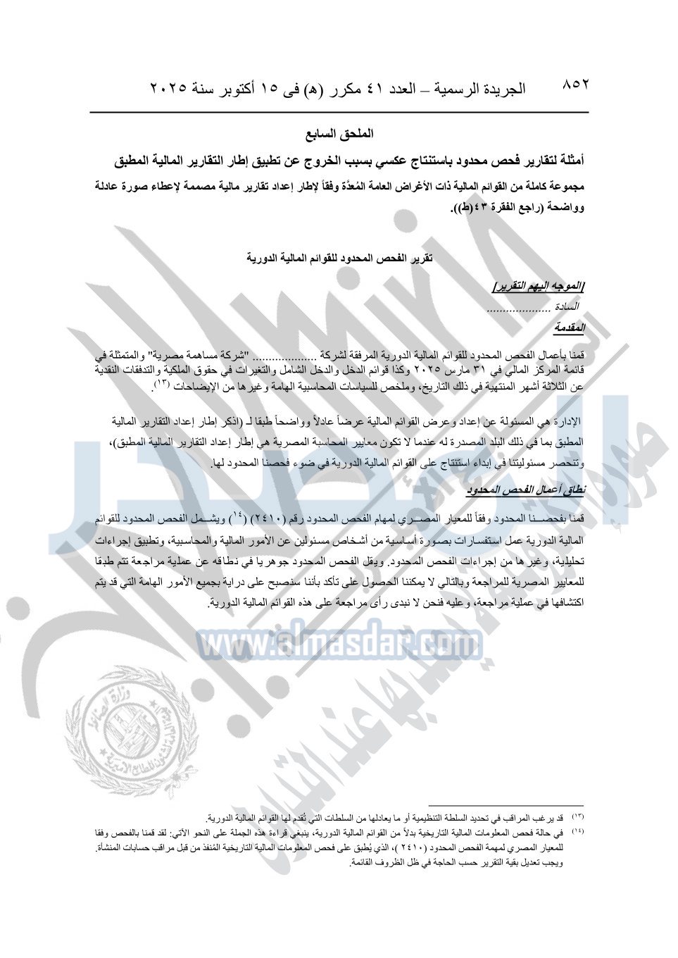 نشرت الجريدة الرسمية في العدد 41 مكرر "هـ" الصادر في 15 أكتوبر سنة 2025، قرار رئيس مجلس الوزراء رقم 3725 لسنة 2025، بشأن العمل بالمعايير المصرية للمراجعة والفحص المحدود ومهام التأكد الأخرى المرافقة لهذا القرار.