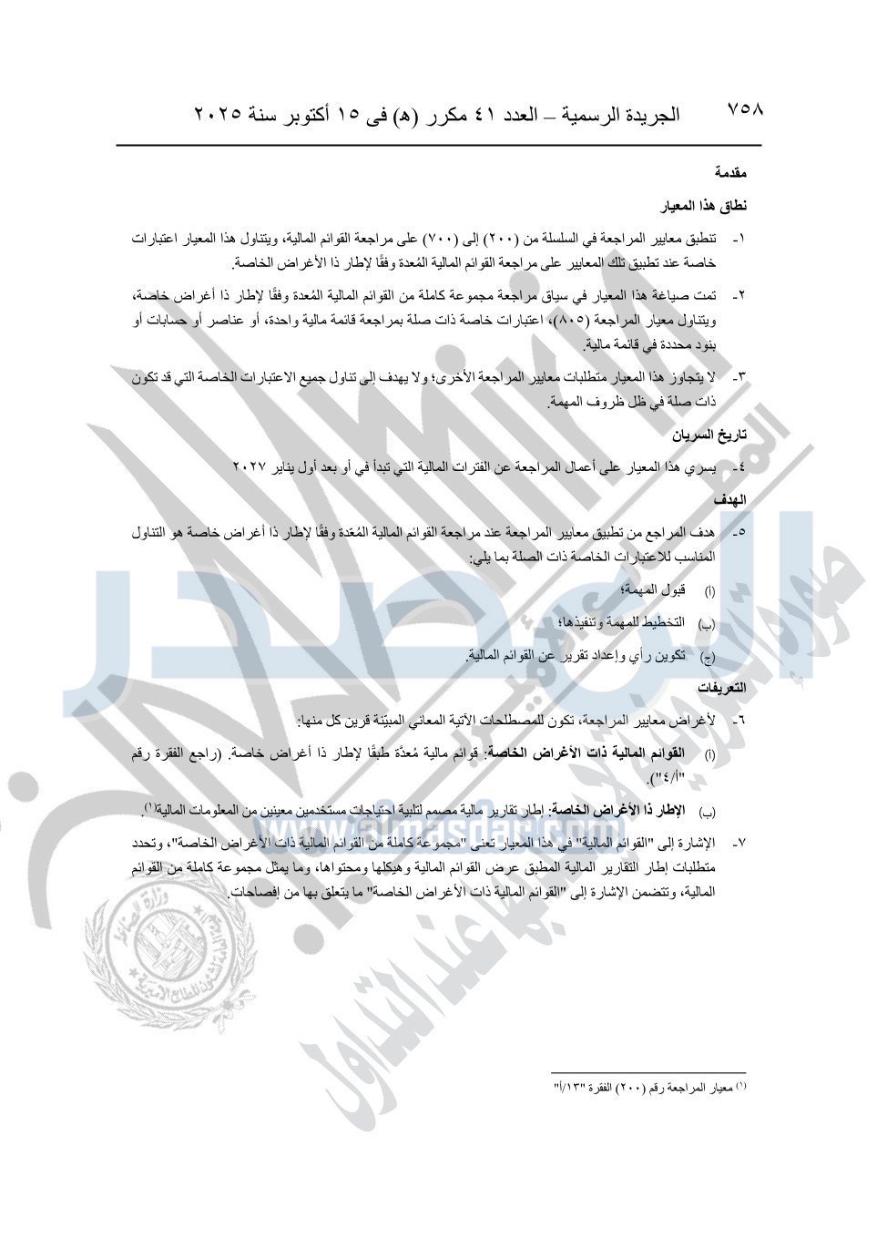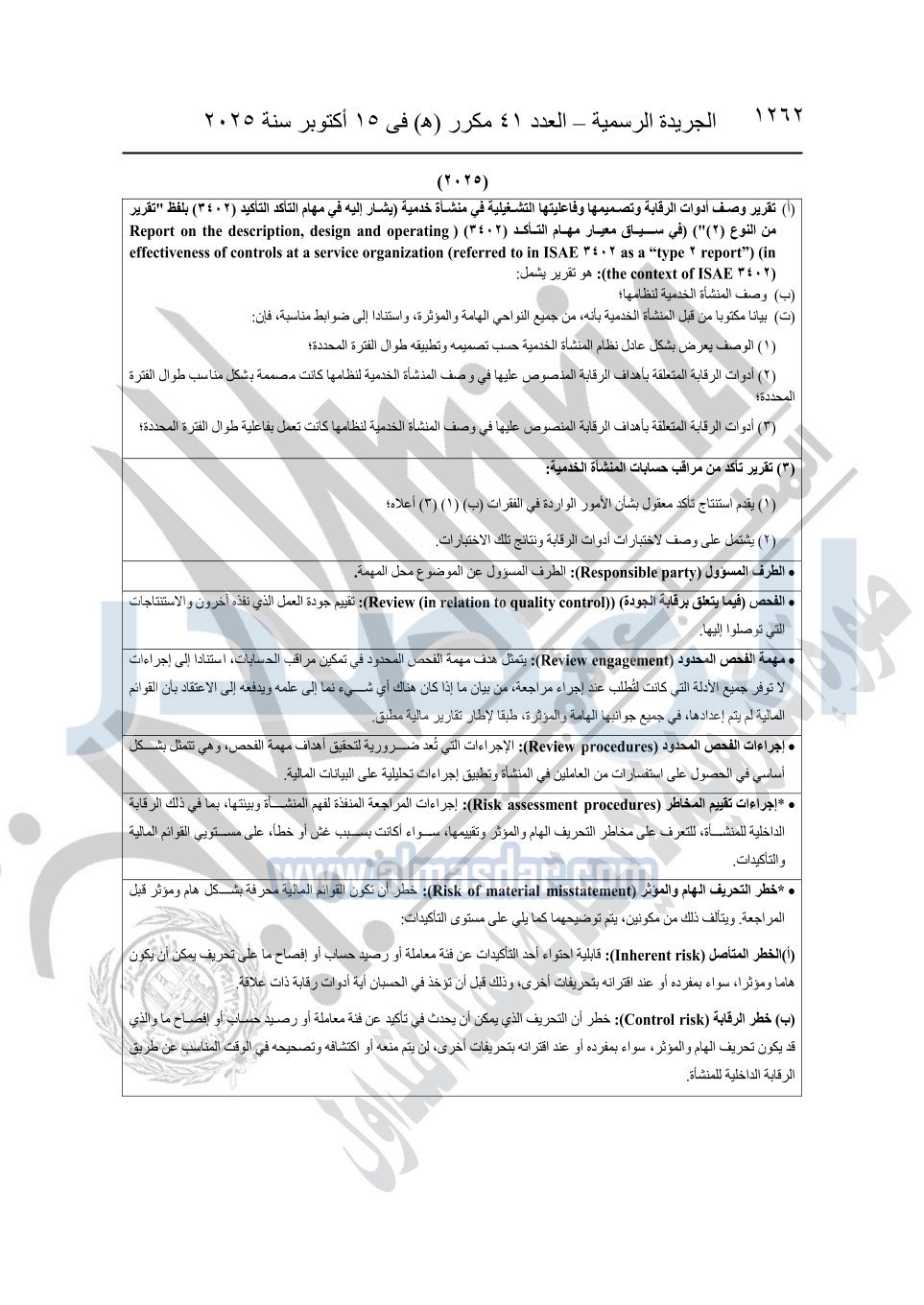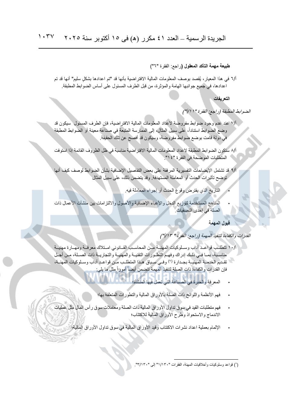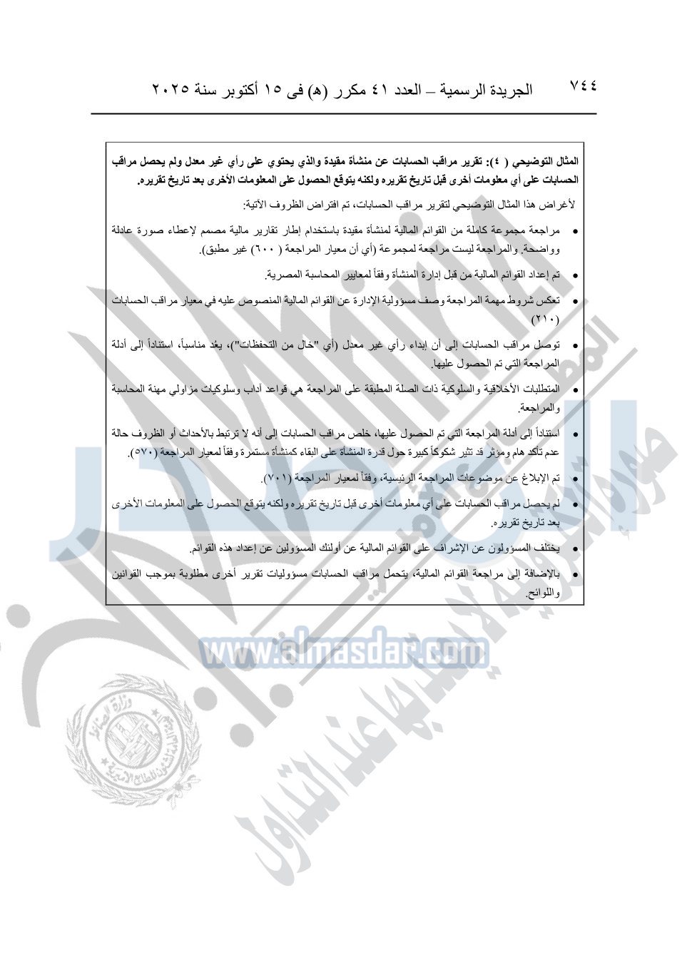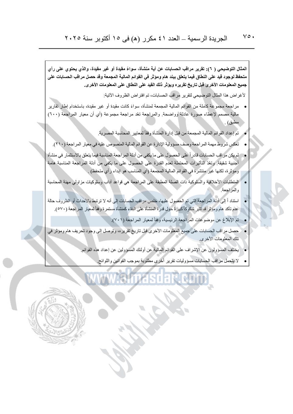 نشرت الجريدة الرسمية في العدد 41 مكرر "هـ" الصادر في 15 أكتوبر سنة 2025، قرار رئيس مجلس الوزراء رقم 3725 لسنة 2025، بشأن العمل بالمعايير المصرية للمراجعة والفحص المحدود ومهام التأكد الأخرى المرافقة لهذا القرار.