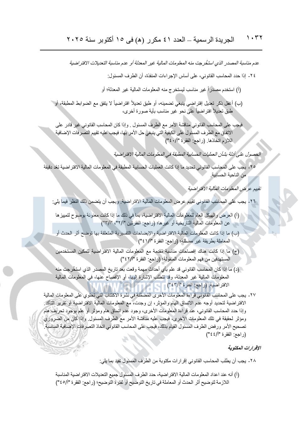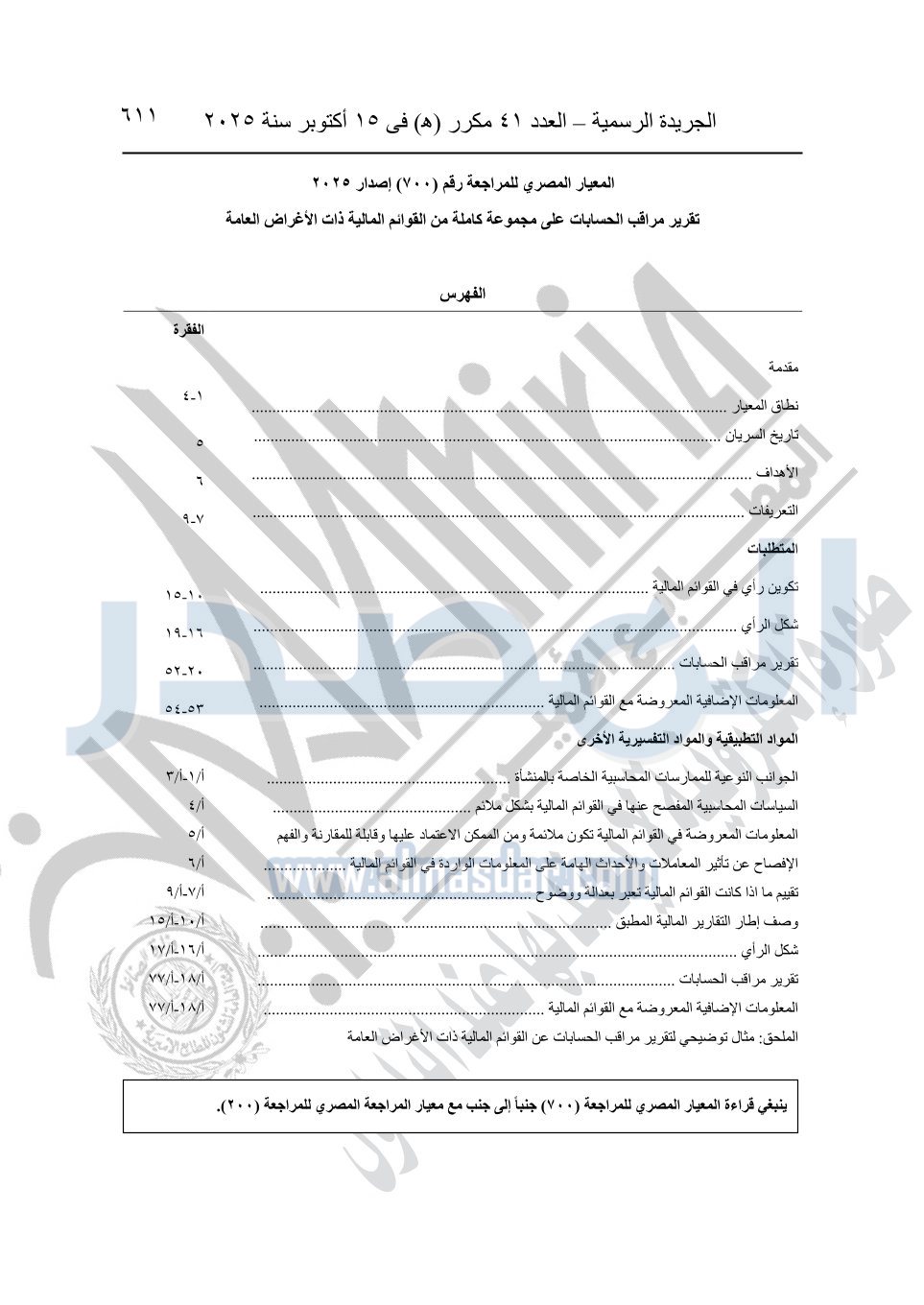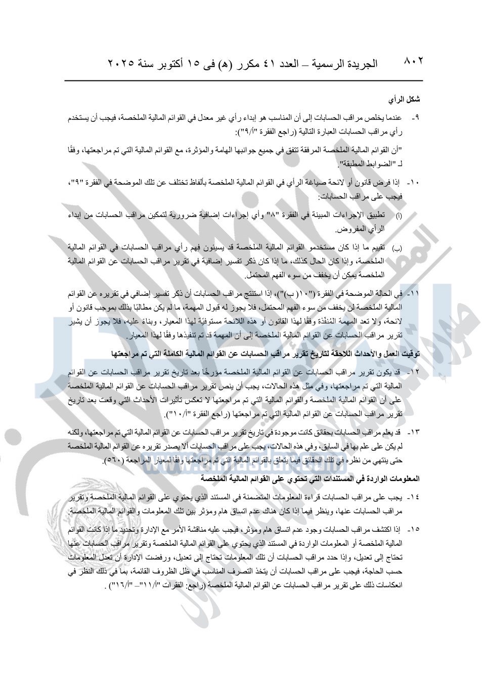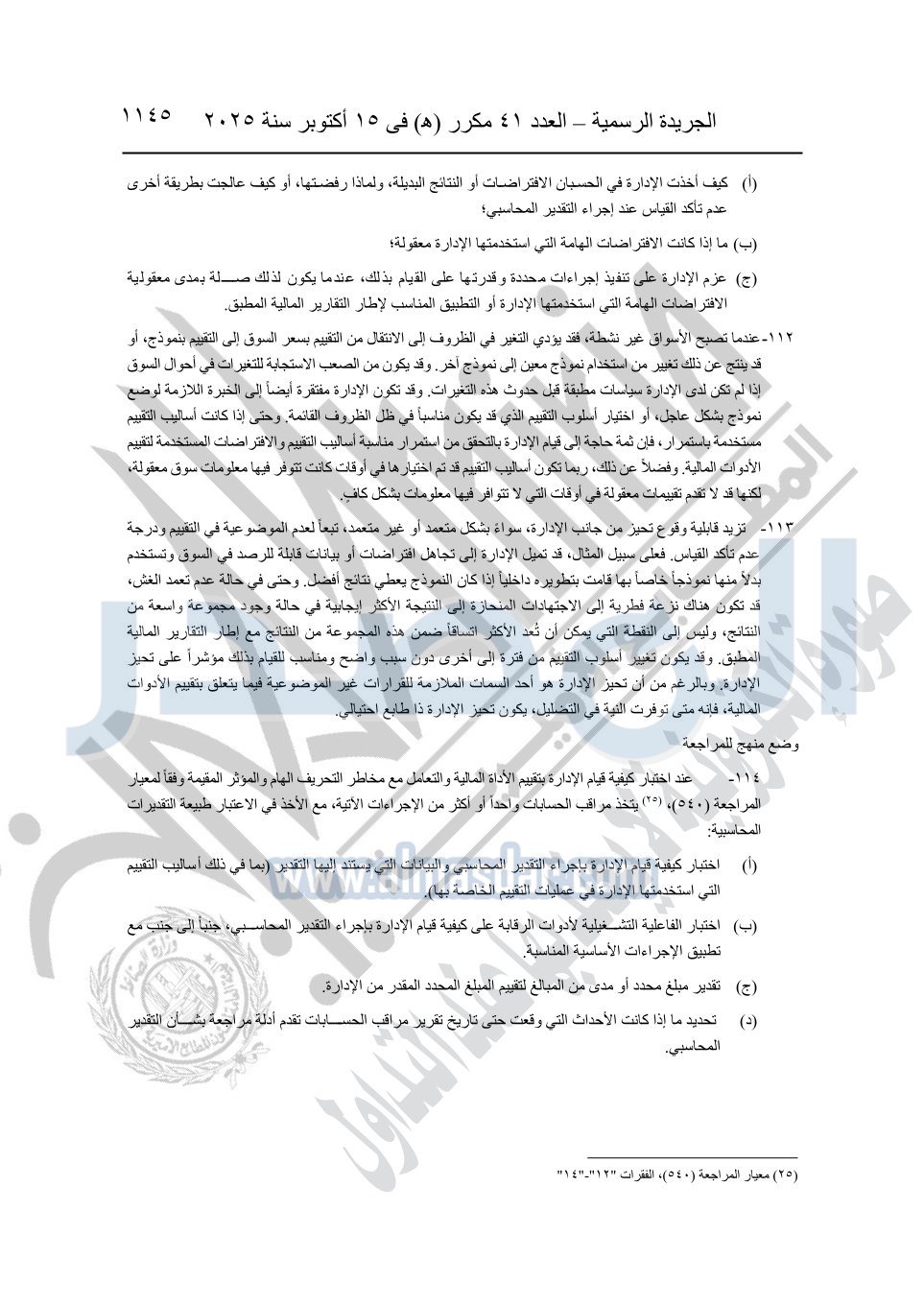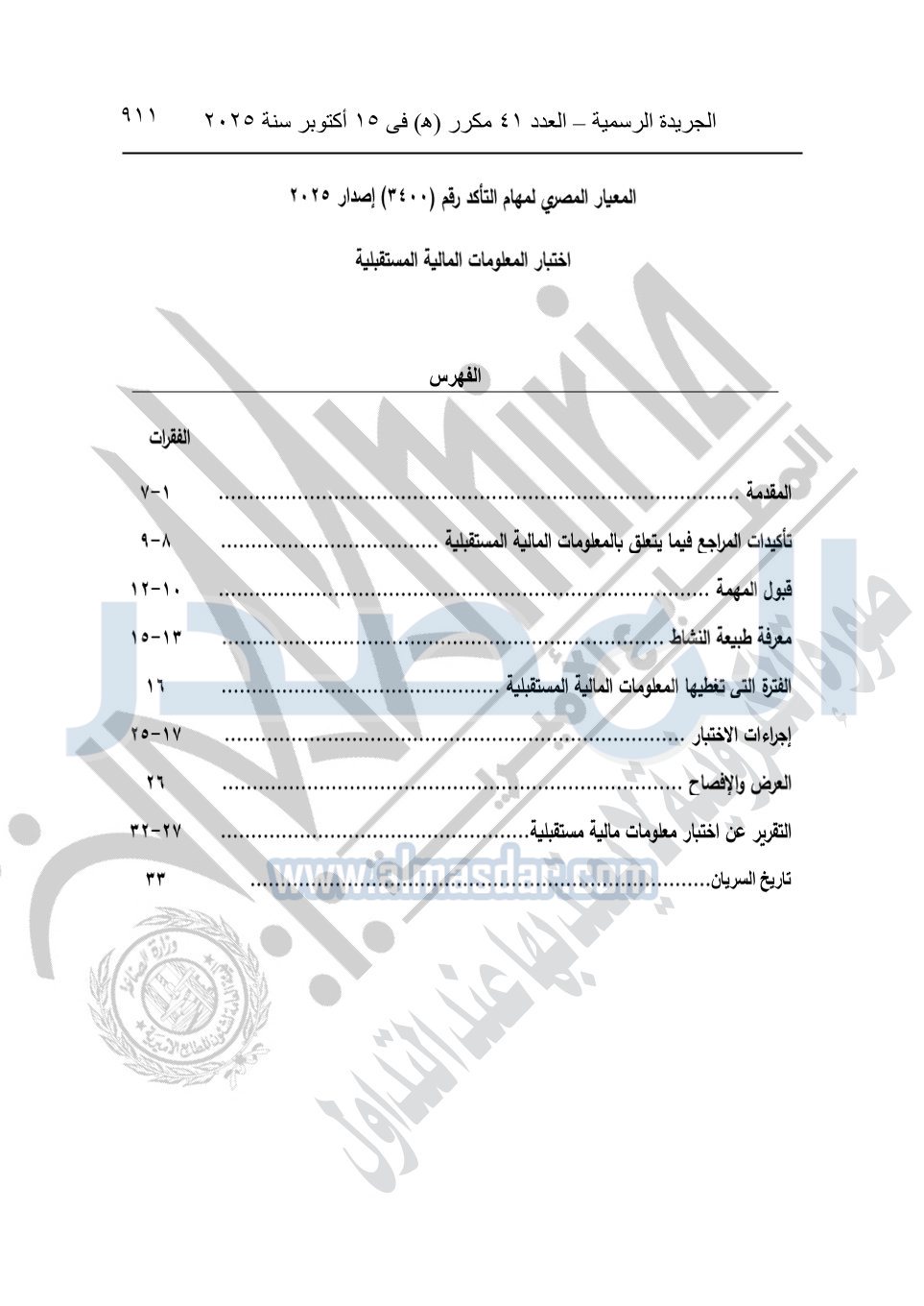 نشرت الجريدة الرسمية في العدد 41 مكرر "هـ" الصادر في 15 أكتوبر سنة 2025، قرار رئيس مجلس الوزراء رقم 3725 لسنة 2025، بشأن العمل بالمعايير المصرية للمراجعة والفحص المحدود ومهام التأكد الأخرى المرافقة لهذا القرار.