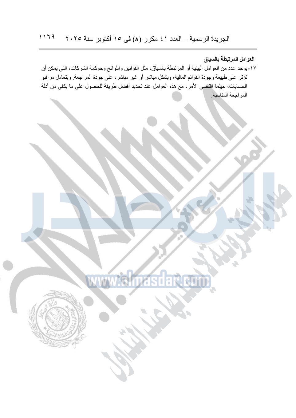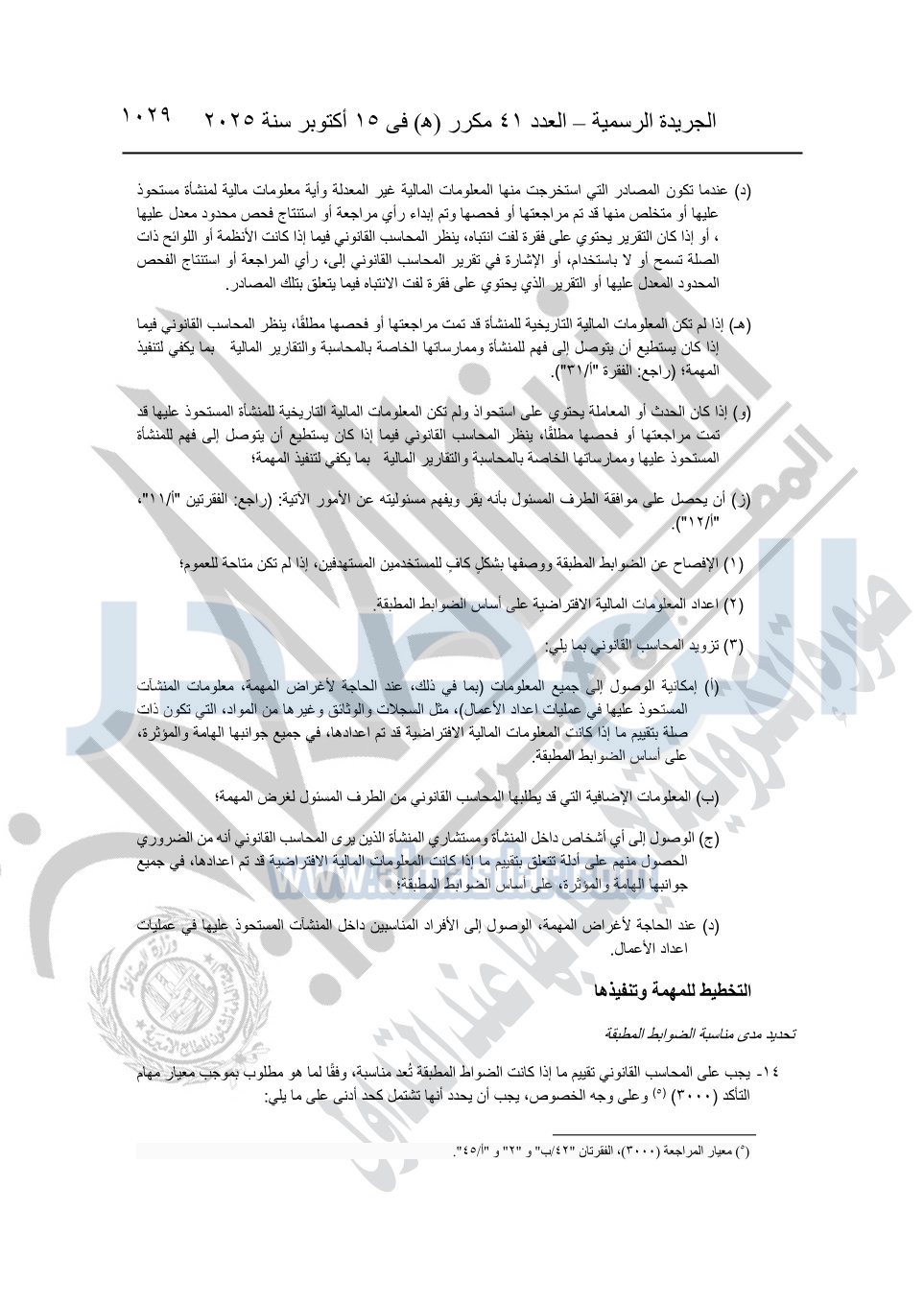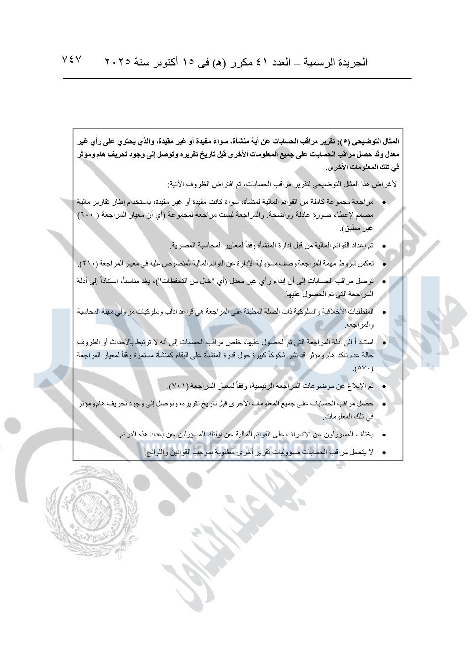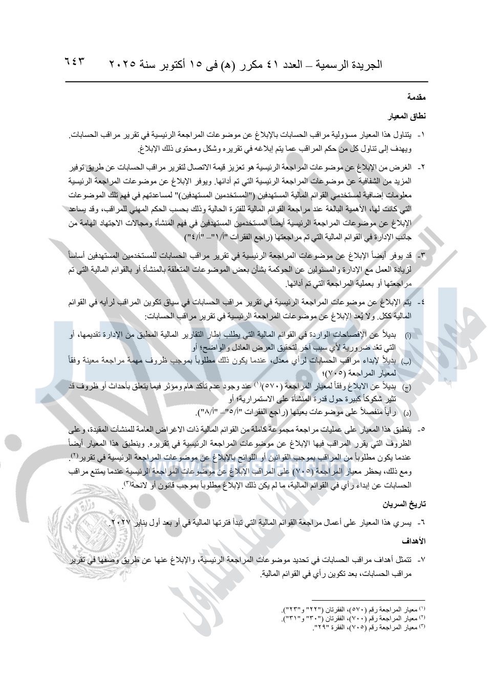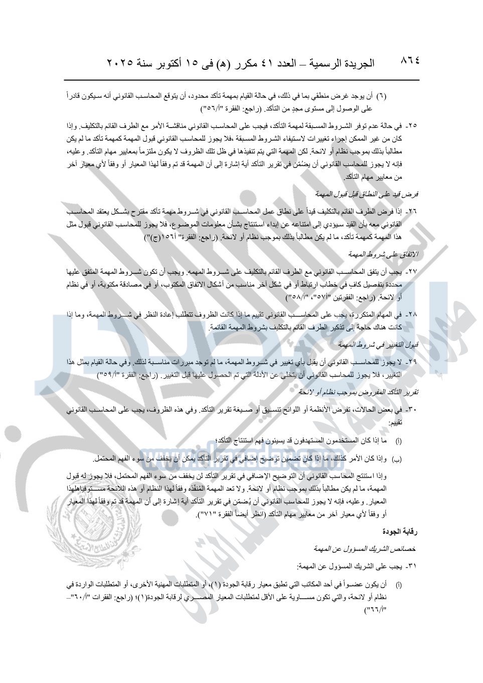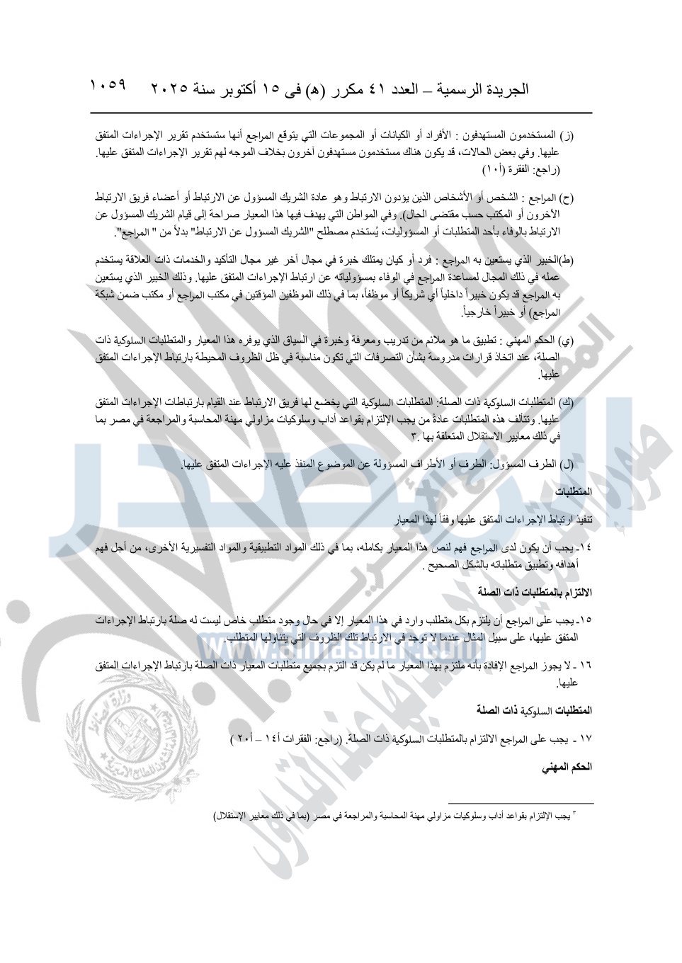نشرت الجريدة الرسمية في العدد 41 مكرر "هـ" الصادر في 15 أكتوبر سنة 2025، قرار رئيس مجلس الوزراء رقم 3725 لسنة 2025، بشأن العمل بالمعايير المصرية للمراجعة والفحص المحدود ومهام التأكد الأخرى المرافقة لهذا القرار.