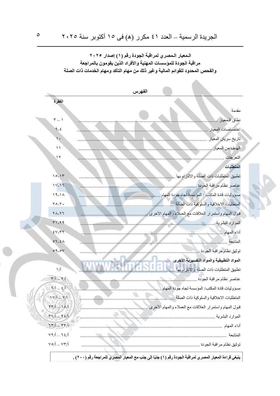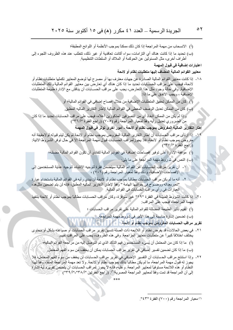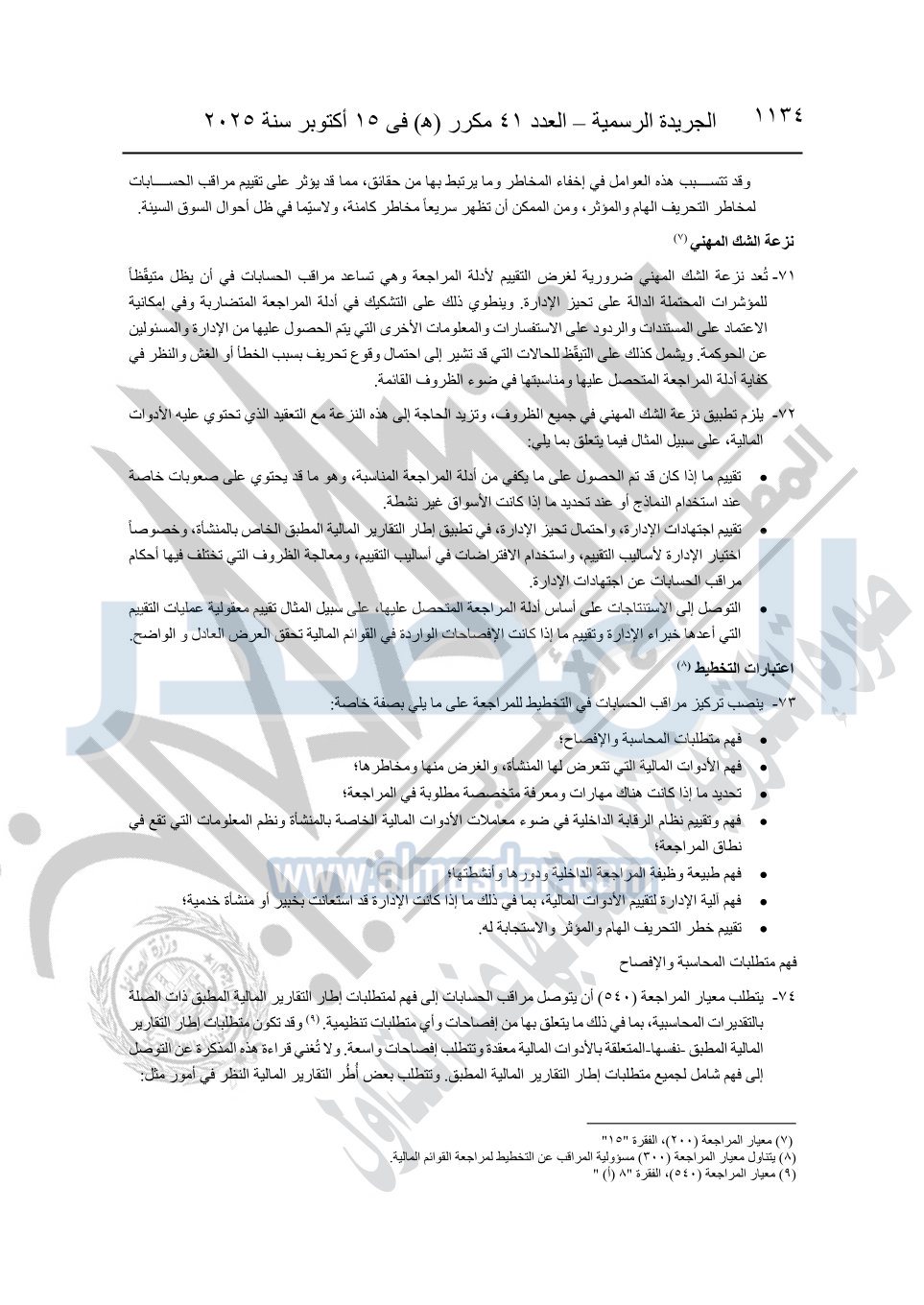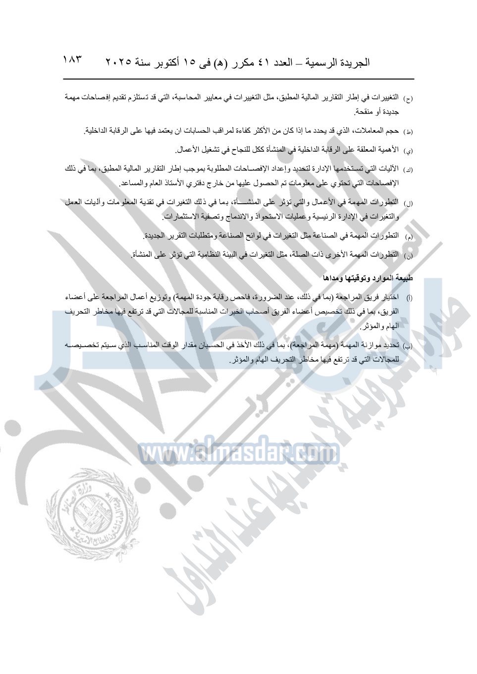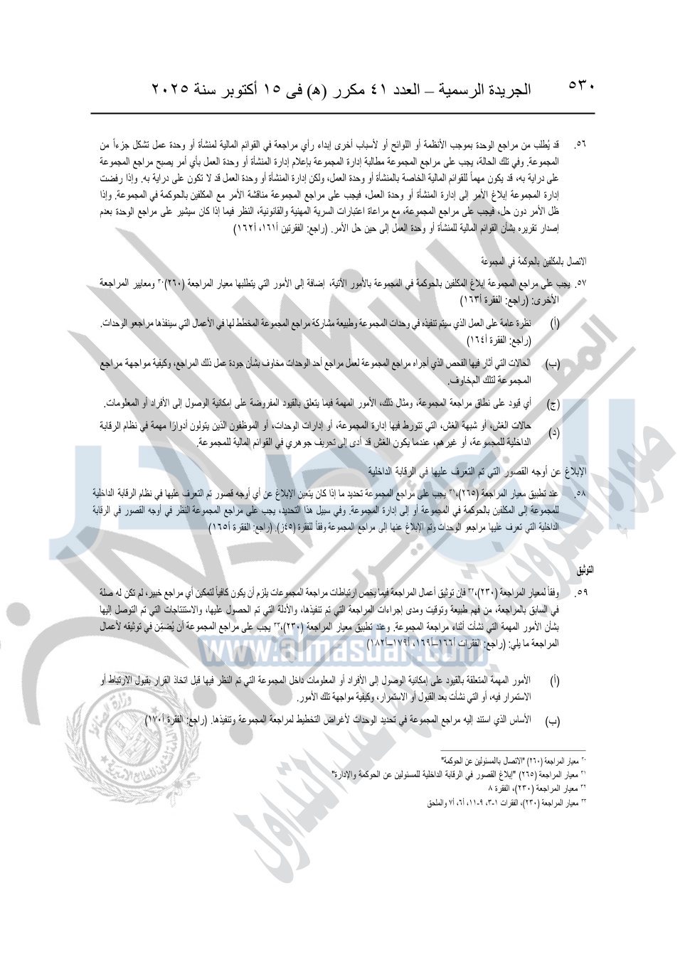 نشرت الجريدة الرسمية في العدد 41 مكرر "هـ" الصادر في 15 أكتوبر سنة 2025، قرار رئيس مجلس الوزراء رقم 3725 لسنة 2025، بشأن العمل بالمعايير المصرية للمراجعة والفحص المحدود ومهام التأكد الأخرى المرافقة لهذا القرار.