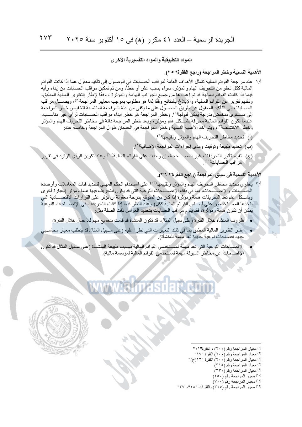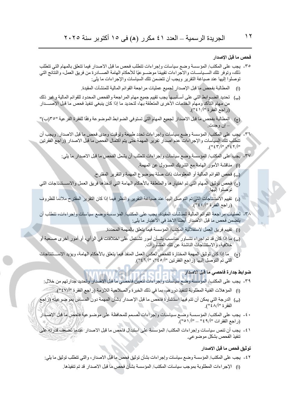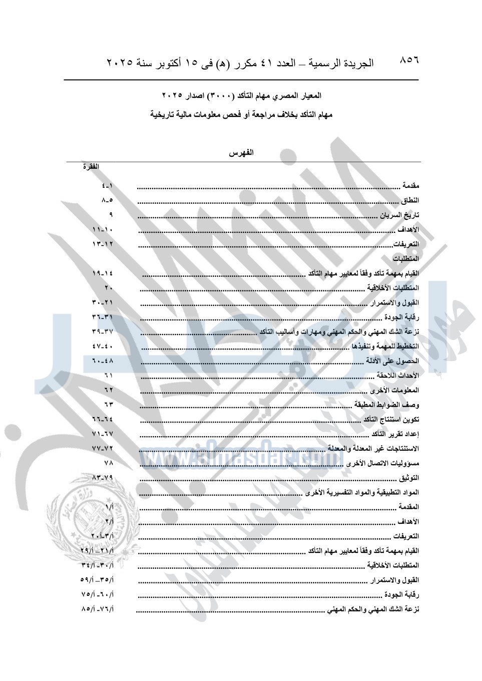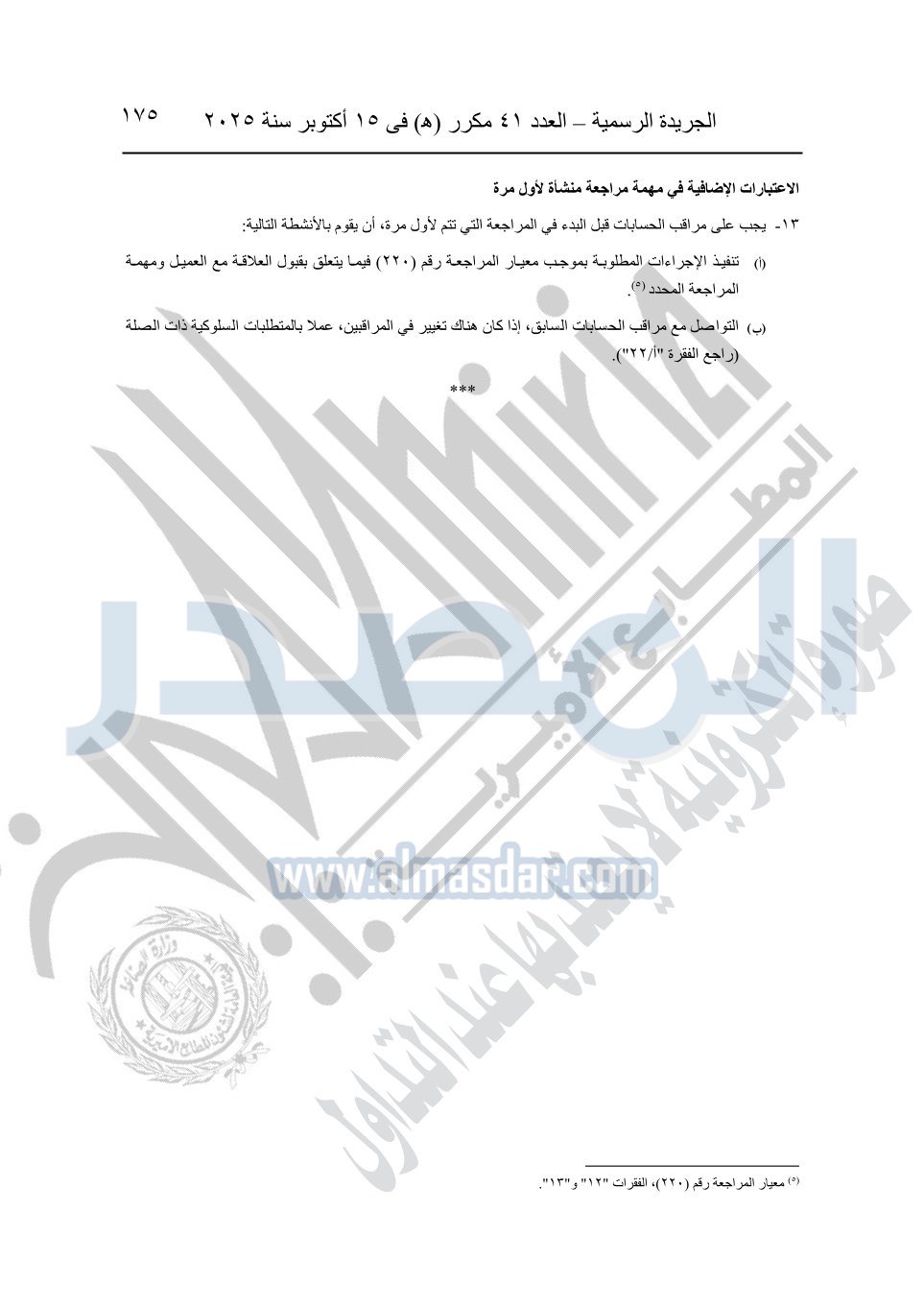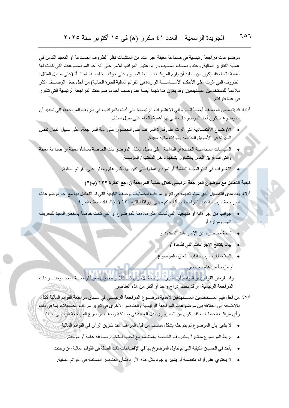 نشرت الجريدة الرسمية في العدد 41 مكرر "هـ" الصادر في 15 أكتوبر سنة 2025، قرار رئيس مجلس الوزراء رقم 3725 لسنة 2025، بشأن العمل بالمعايير المصرية للمراجعة والفحص المحدود ومهام التأكد الأخرى المرافقة لهذا القرار.