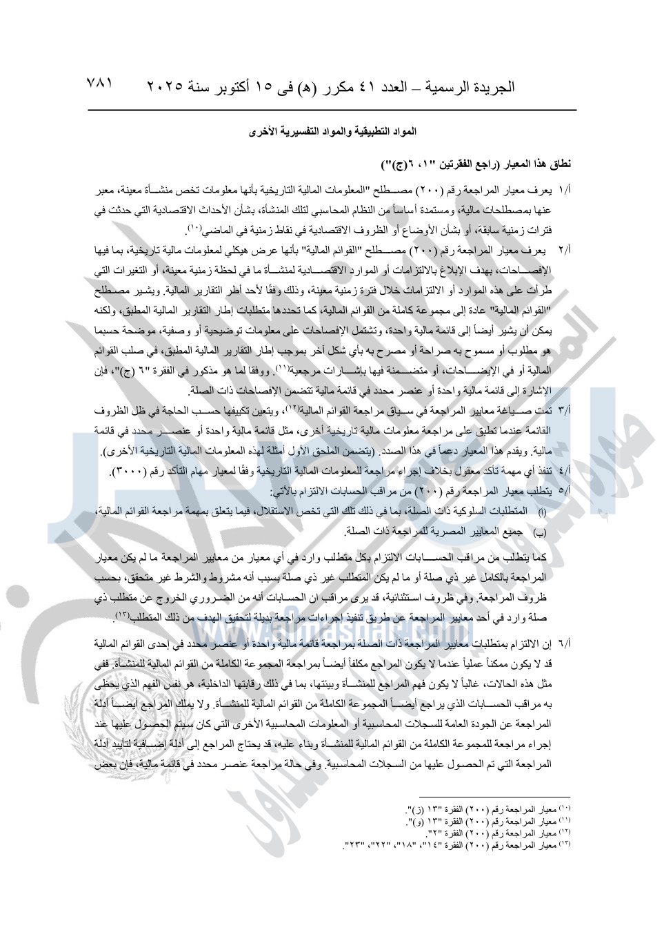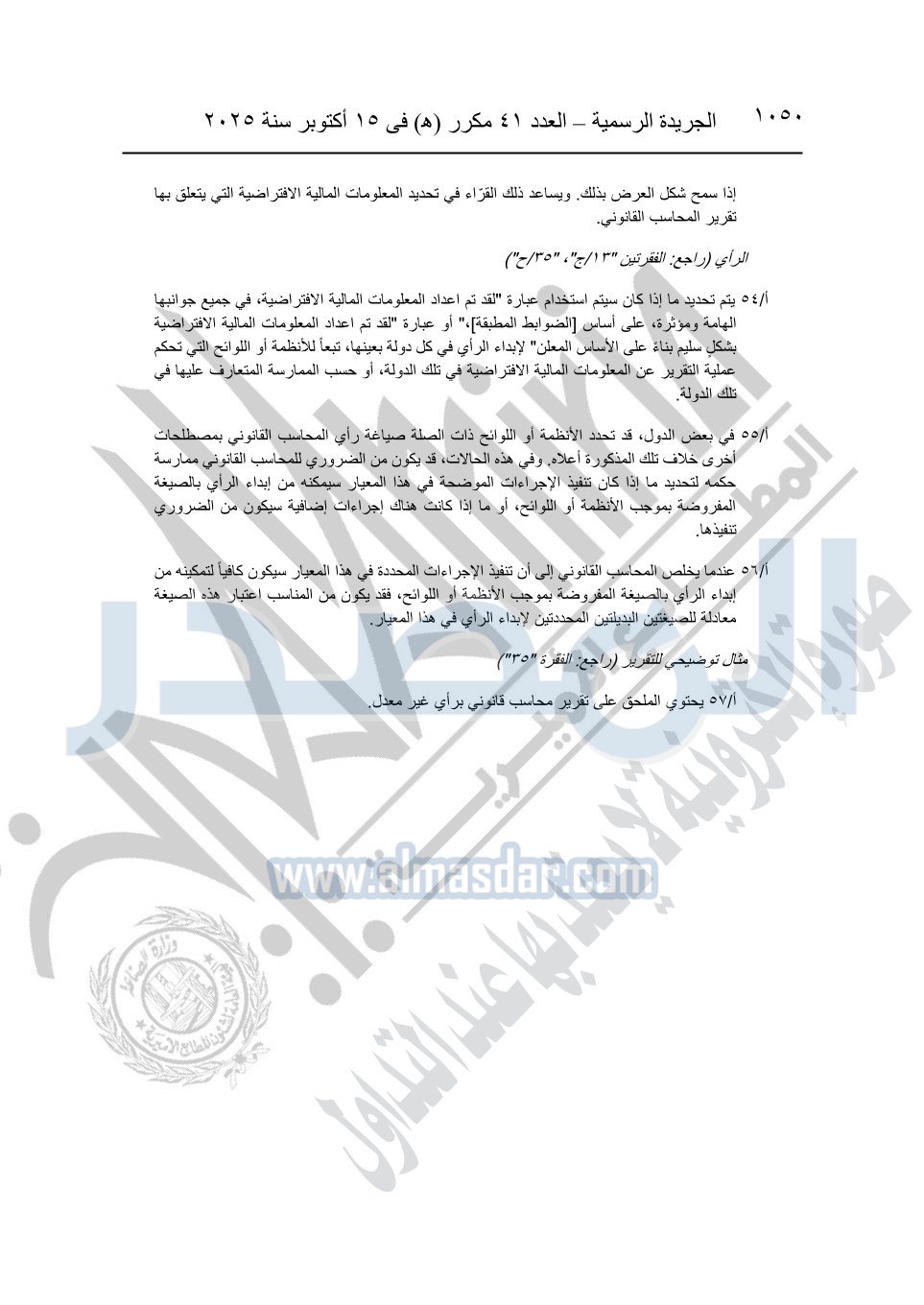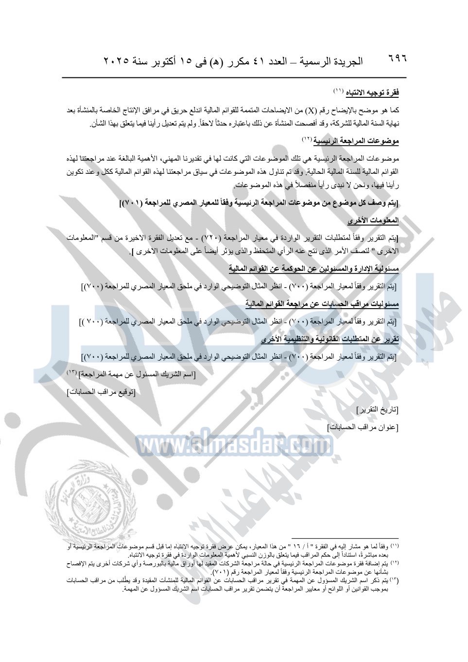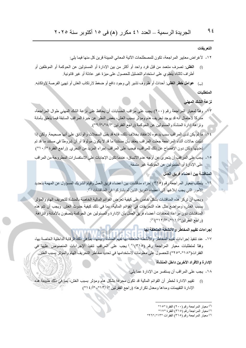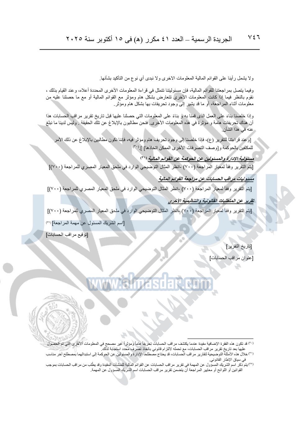 نشرت الجريدة الرسمية في العدد 41 مكرر "هـ" الصادر في 15 أكتوبر سنة 2025، قرار رئيس مجلس الوزراء رقم 3725 لسنة 2025، بشأن العمل بالمعايير المصرية للمراجعة والفحص المحدود ومهام التأكد الأخرى المرافقة لهذا القرار.