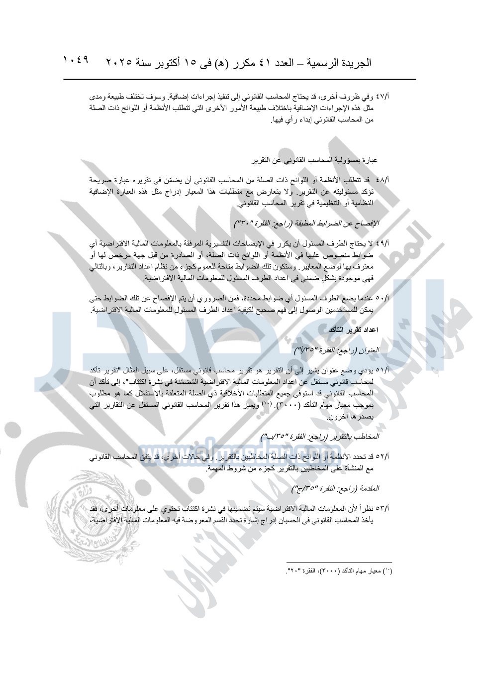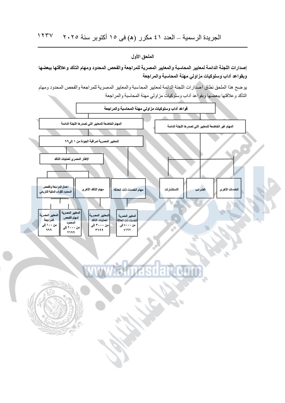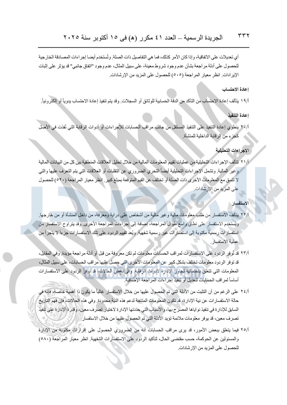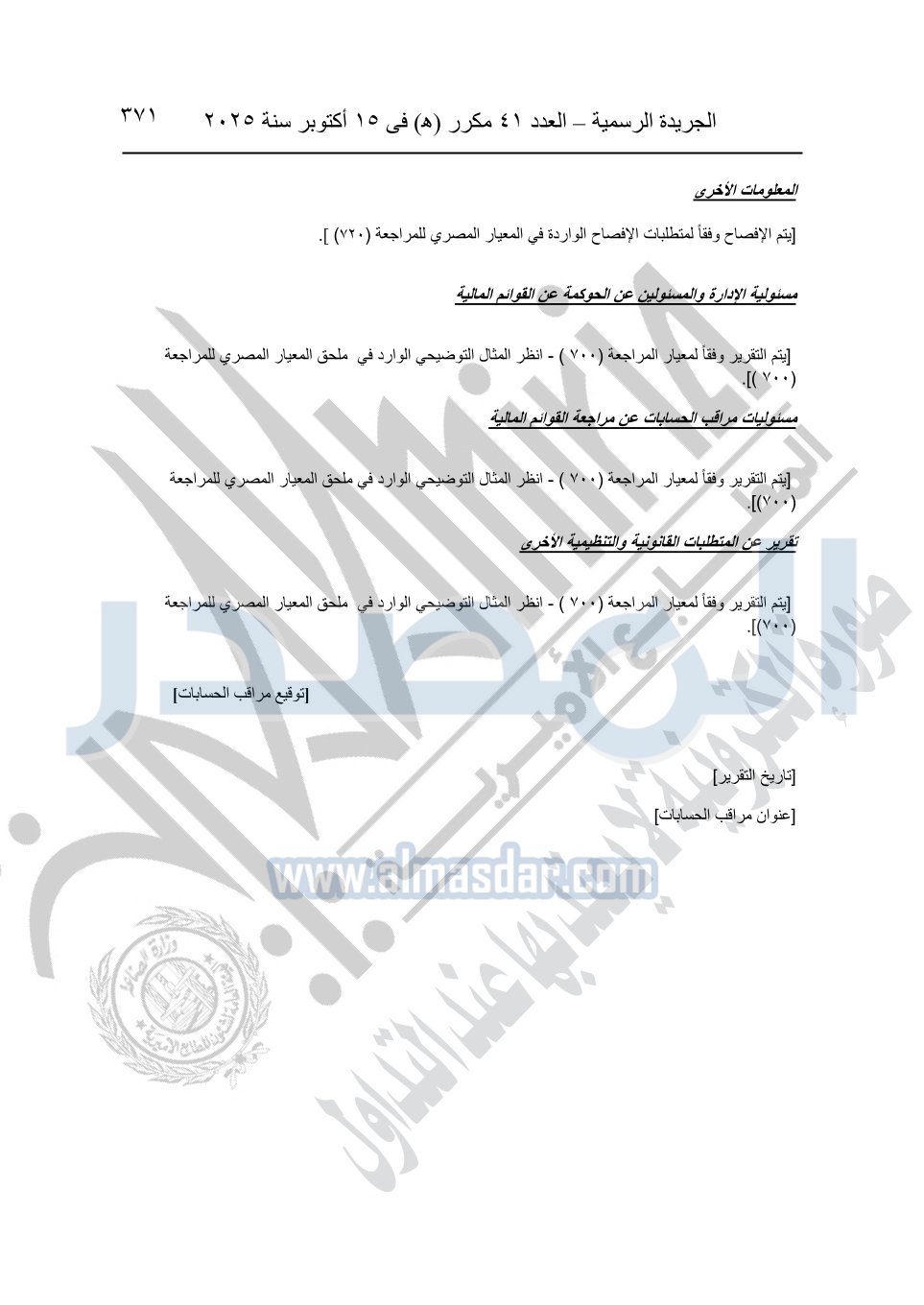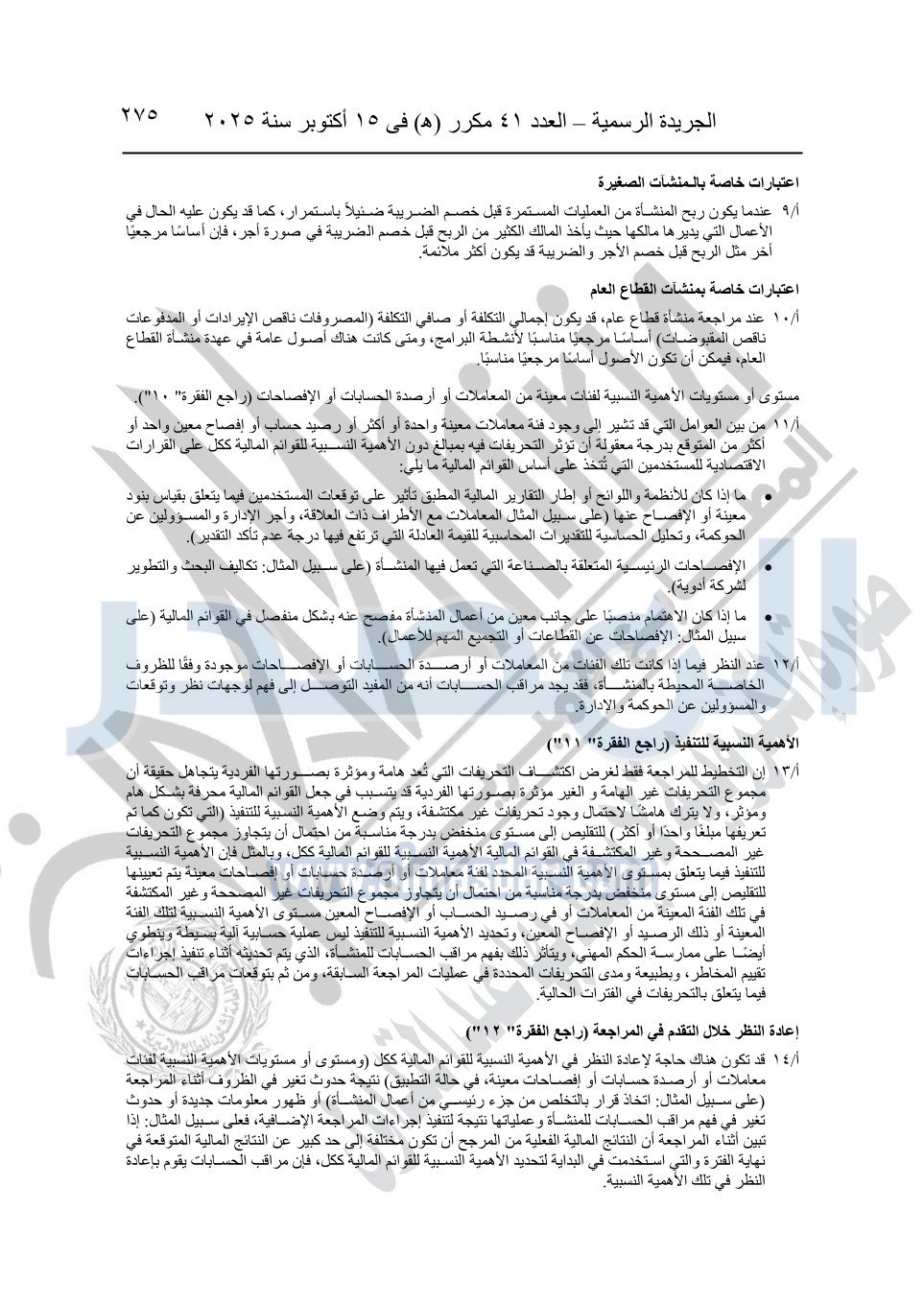 نشرت الجريدة الرسمية في العدد 41 مكرر "هـ" الصادر في 15 أكتوبر سنة 2025، قرار رئيس مجلس الوزراء رقم 3725 لسنة 2025، بشأن العمل بالمعايير المصرية للمراجعة والفحص المحدود ومهام التأكد الأخرى المرافقة لهذا القرار.