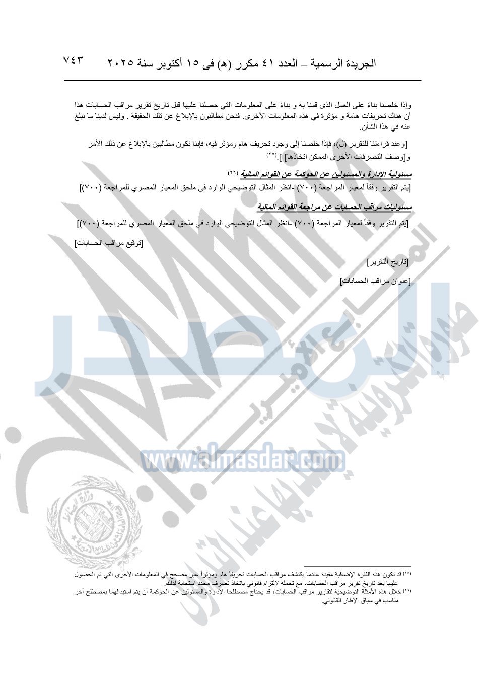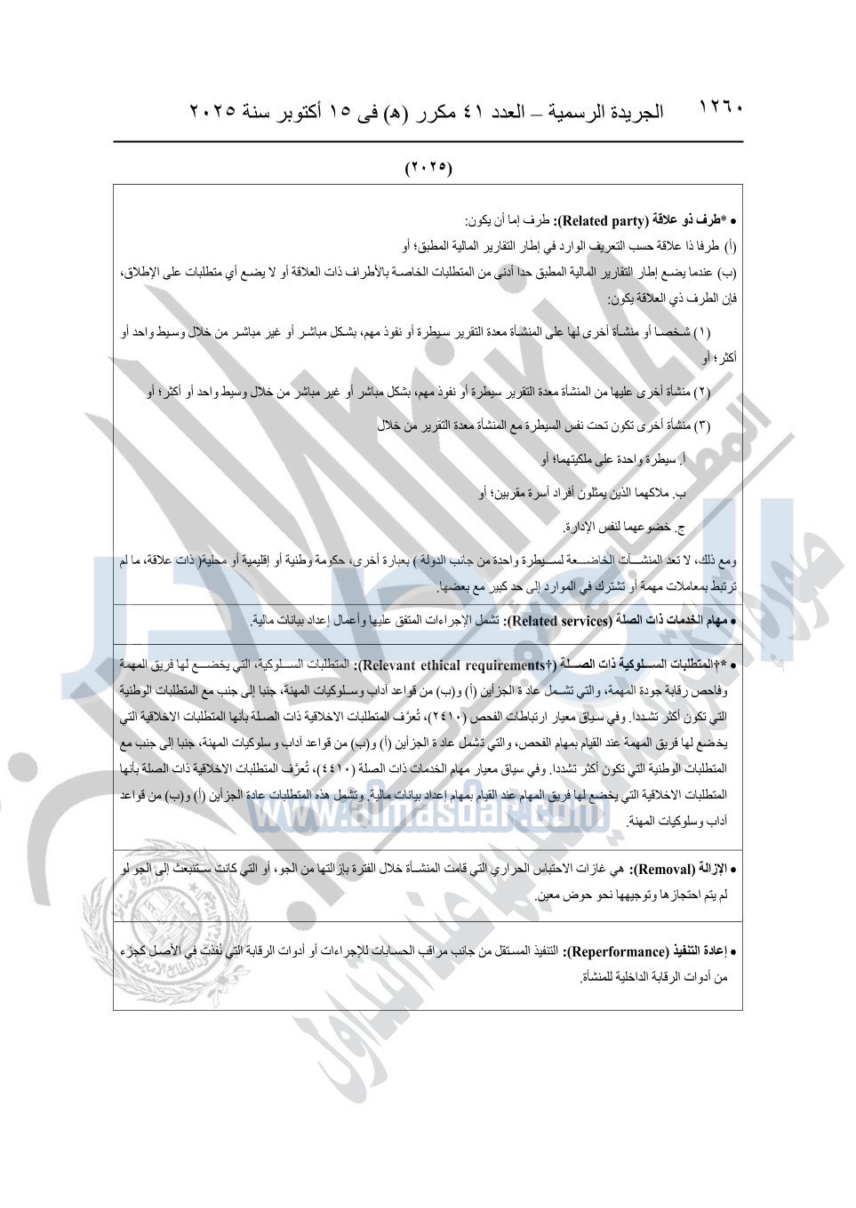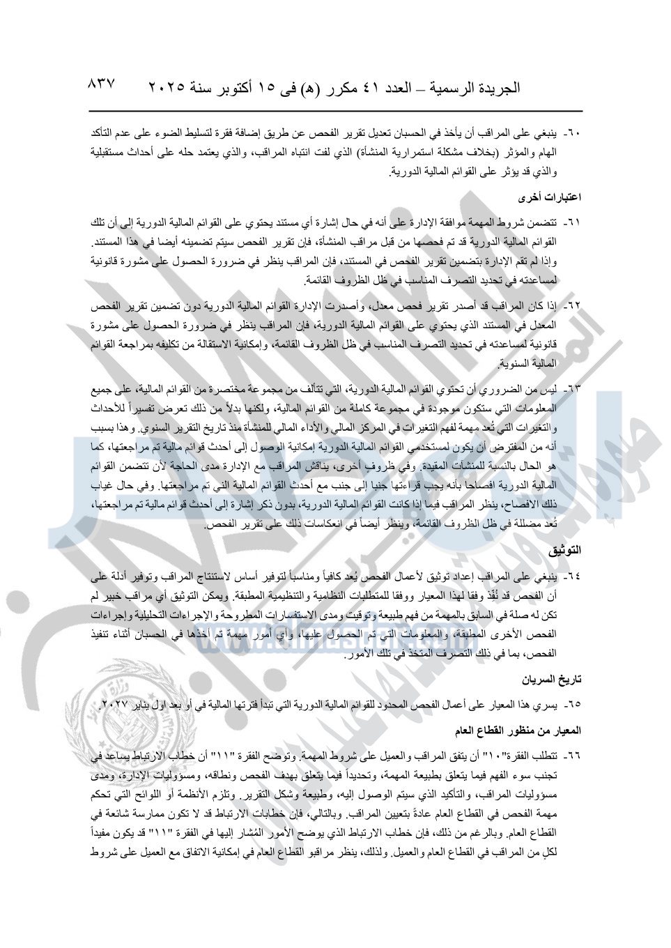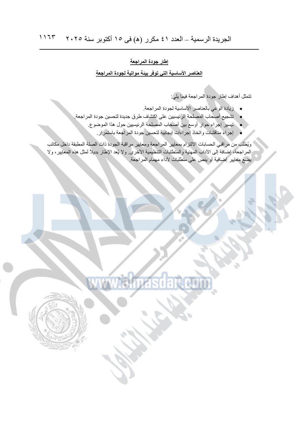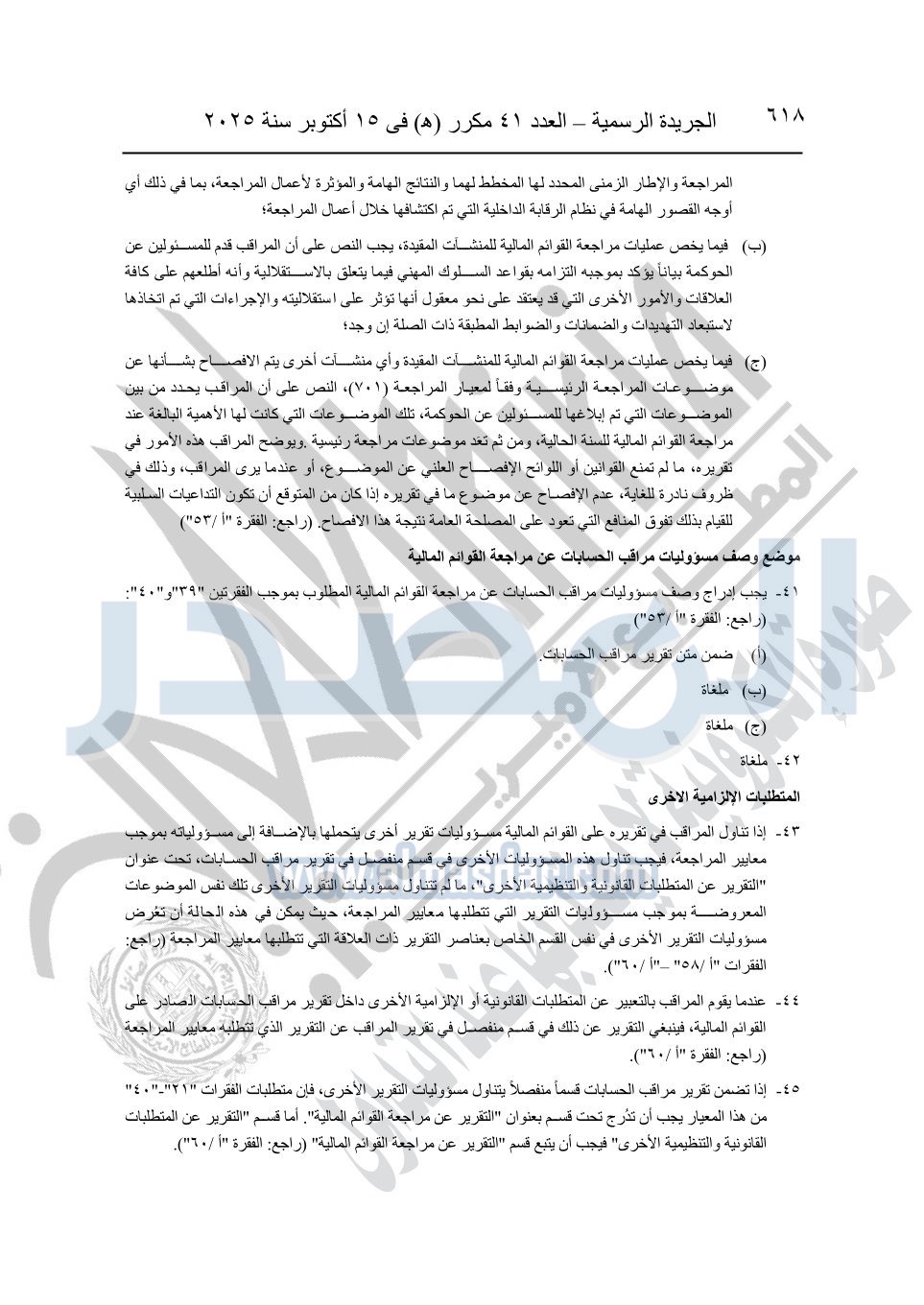 نشرت الجريدة الرسمية في العدد 41 مكرر "هـ" الصادر في 15 أكتوبر سنة 2025، قرار رئيس مجلس الوزراء رقم 3725 لسنة 2025، بشأن العمل بالمعايير المصرية للمراجعة والفحص المحدود ومهام التأكد الأخرى المرافقة لهذا القرار.