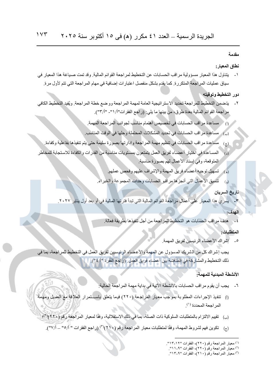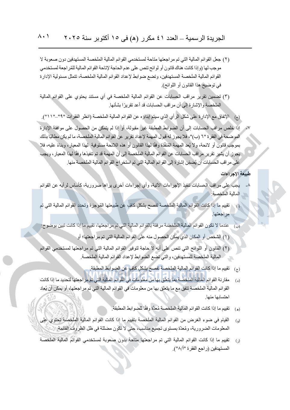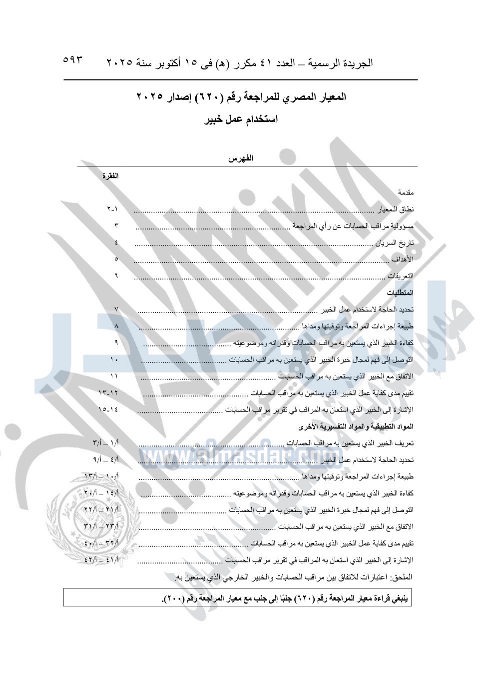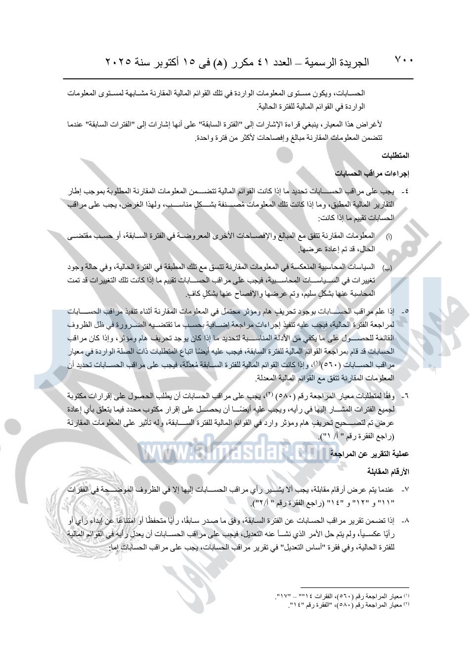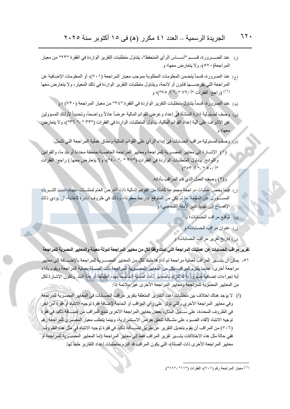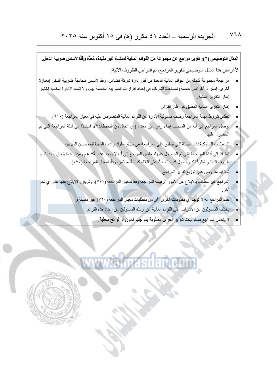 نشرت الجريدة الرسمية في العدد 41 مكرر "هـ" الصادر في 15 أكتوبر سنة 2025، قرار رئيس مجلس الوزراء رقم 3725 لسنة 2025، بشأن العمل بالمعايير المصرية للمراجعة والفحص المحدود ومهام التأكد الأخرى المرافقة لهذا القرار.