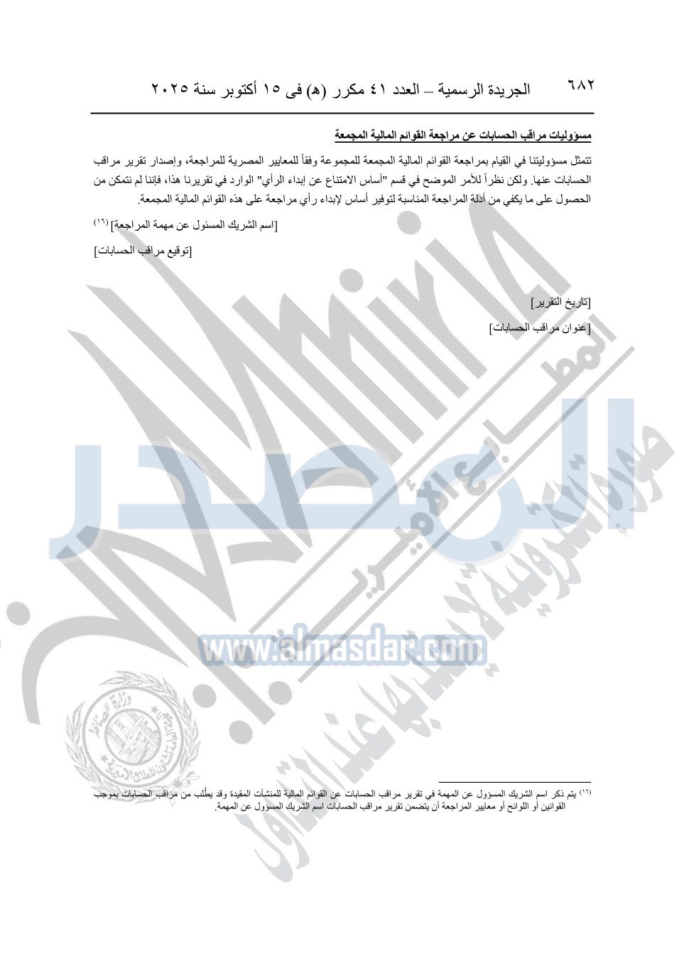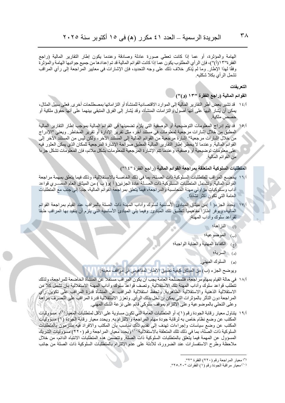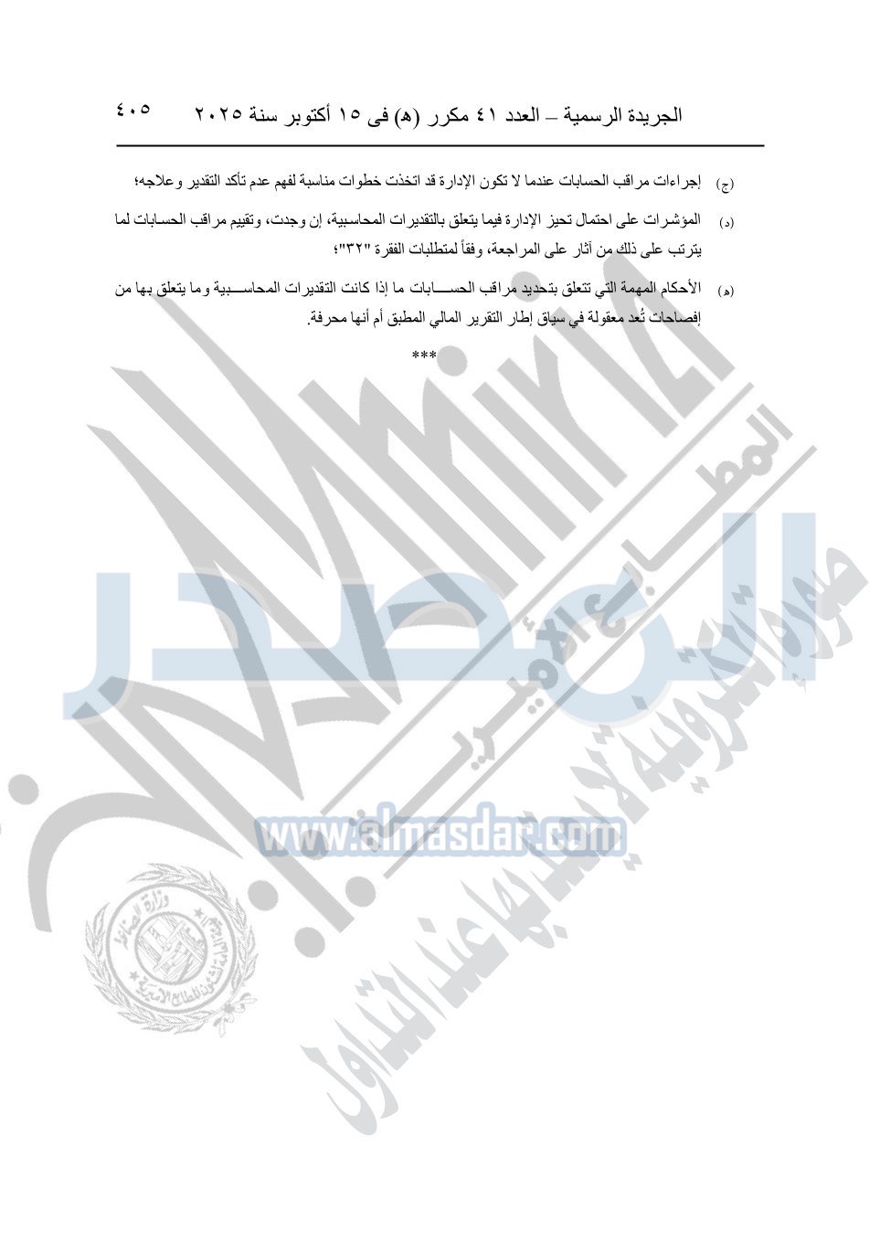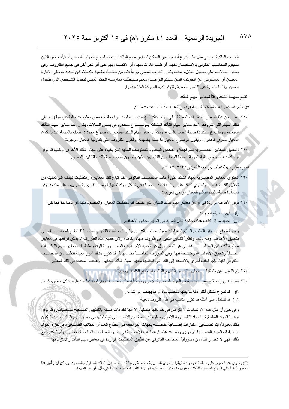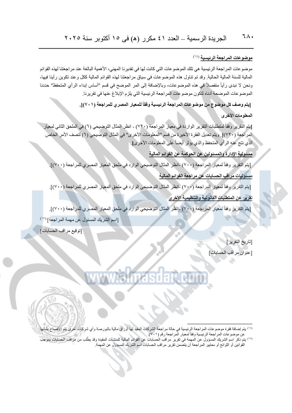 نشرت الجريدة الرسمية في العدد 41 مكرر "هـ" الصادر في 15 أكتوبر سنة 2025، قرار رئيس مجلس الوزراء رقم 3725 لسنة 2025، بشأن العمل بالمعايير المصرية للمراجعة والفحص المحدود ومهام التأكد الأخرى المرافقة لهذا القرار.