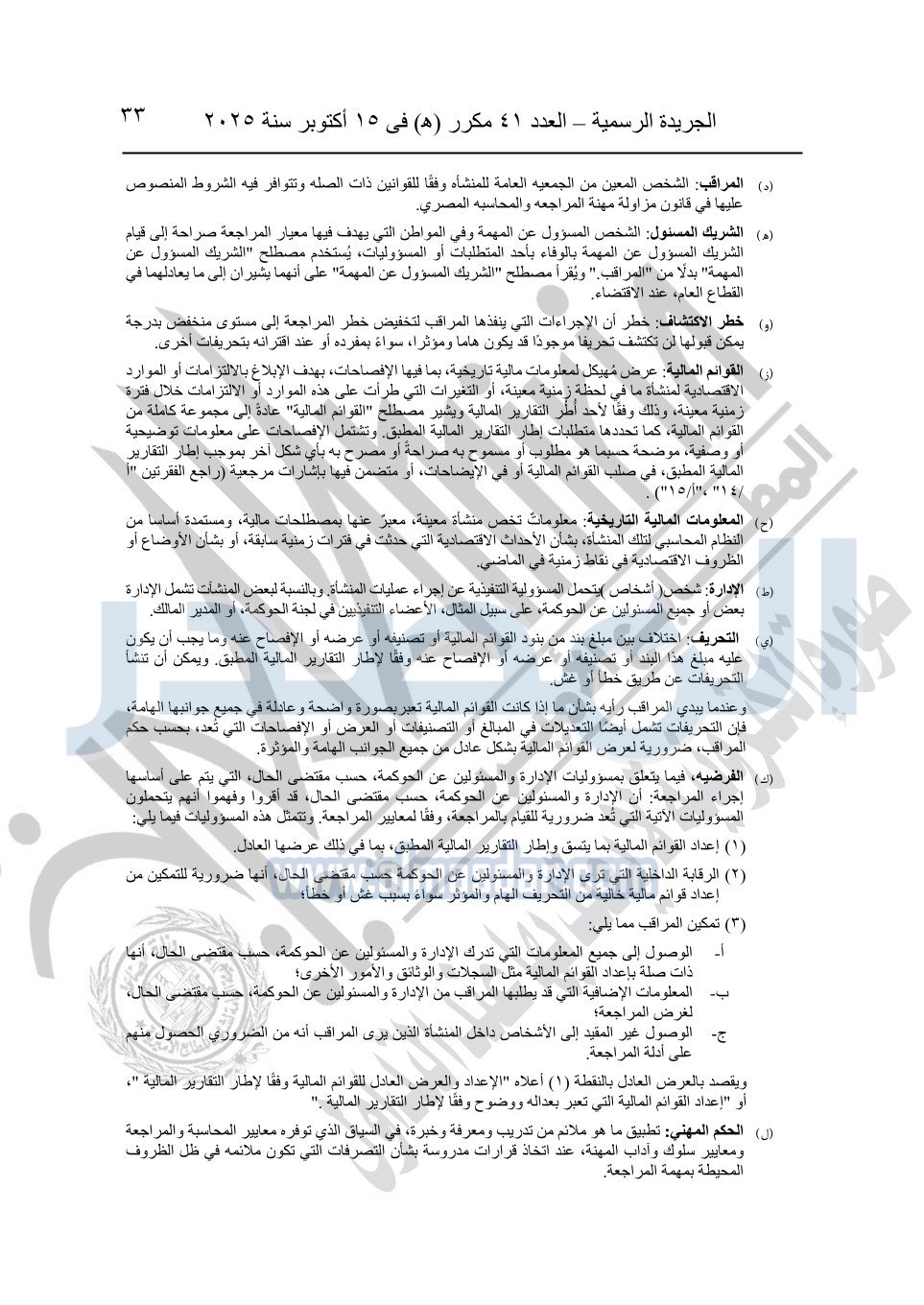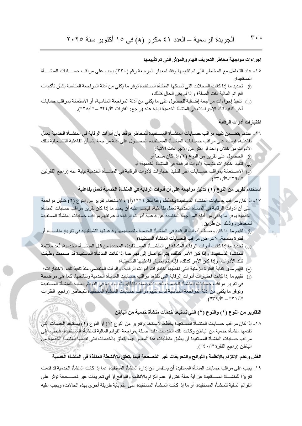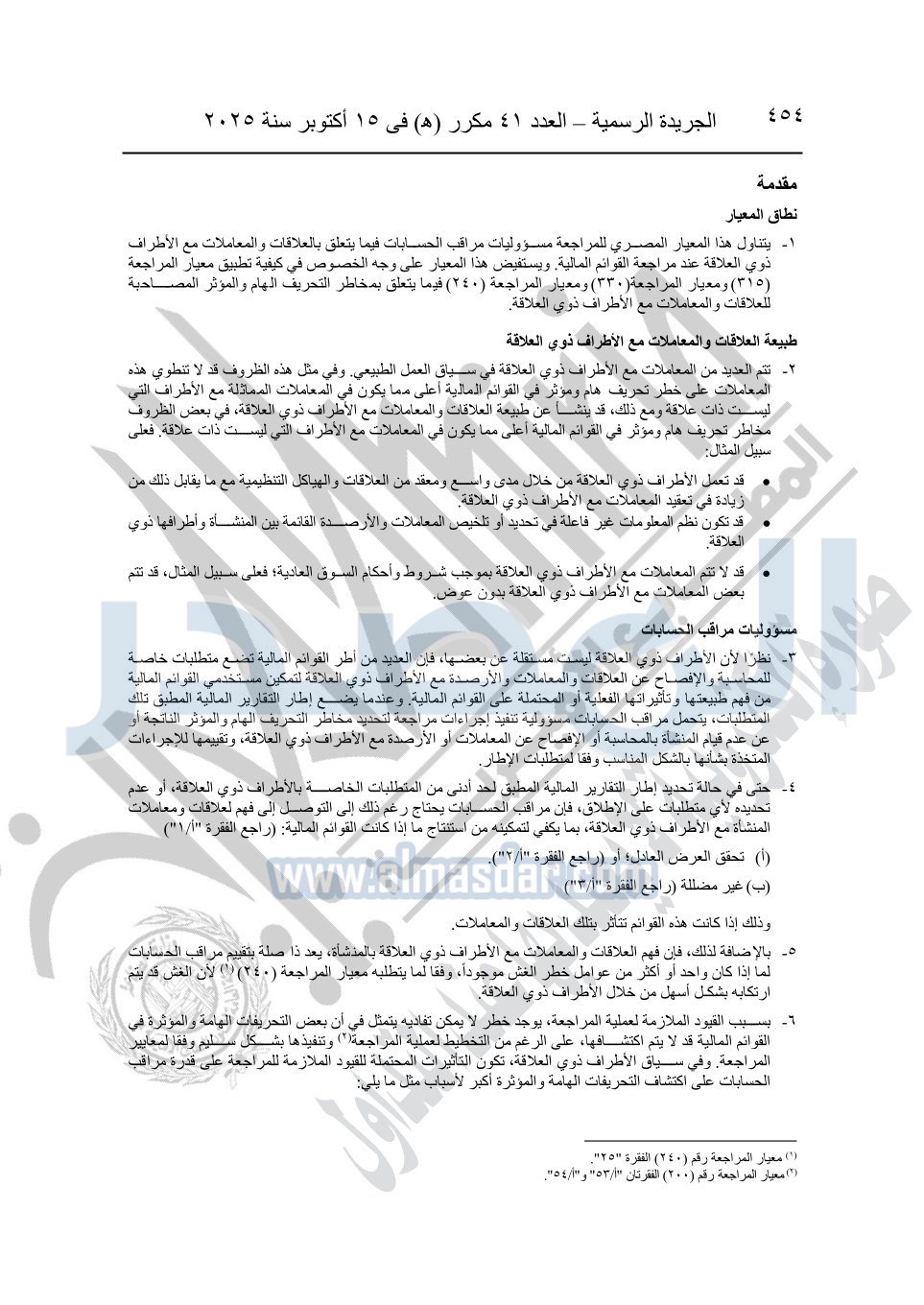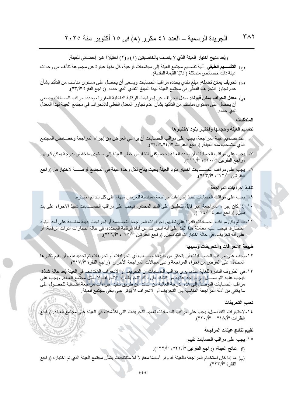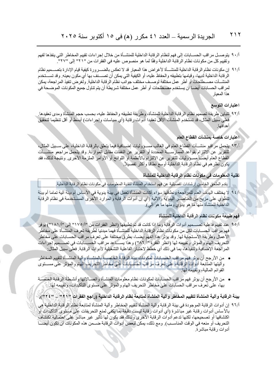 نشرت الجريدة الرسمية في العدد 41 مكرر "هـ" الصادر في 15 أكتوبر سنة 2025، قرار رئيس مجلس الوزراء رقم 3725 لسنة 2025، بشأن العمل بالمعايير المصرية للمراجعة والفحص المحدود ومهام التأكد الأخرى المرافقة لهذا القرار.
