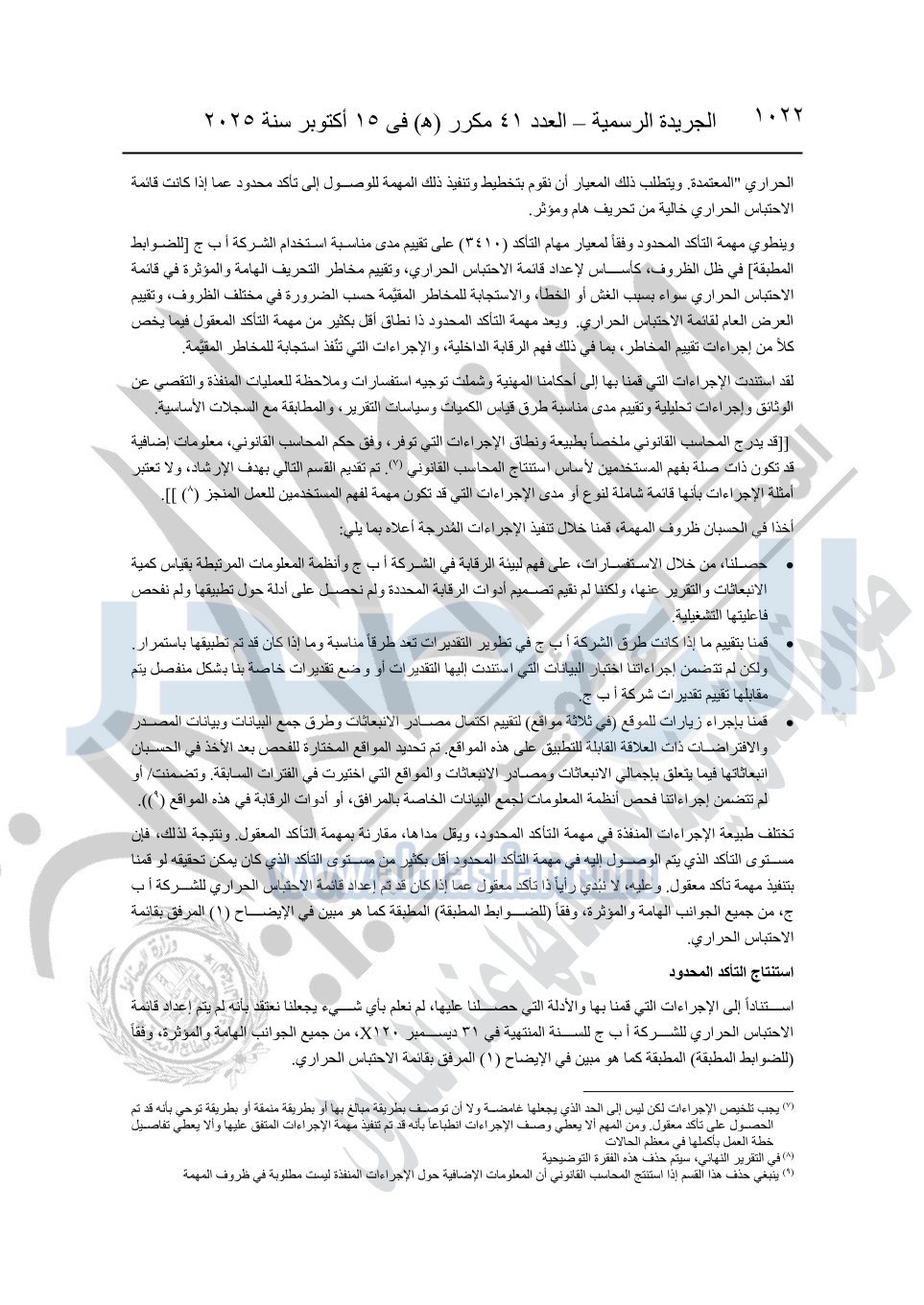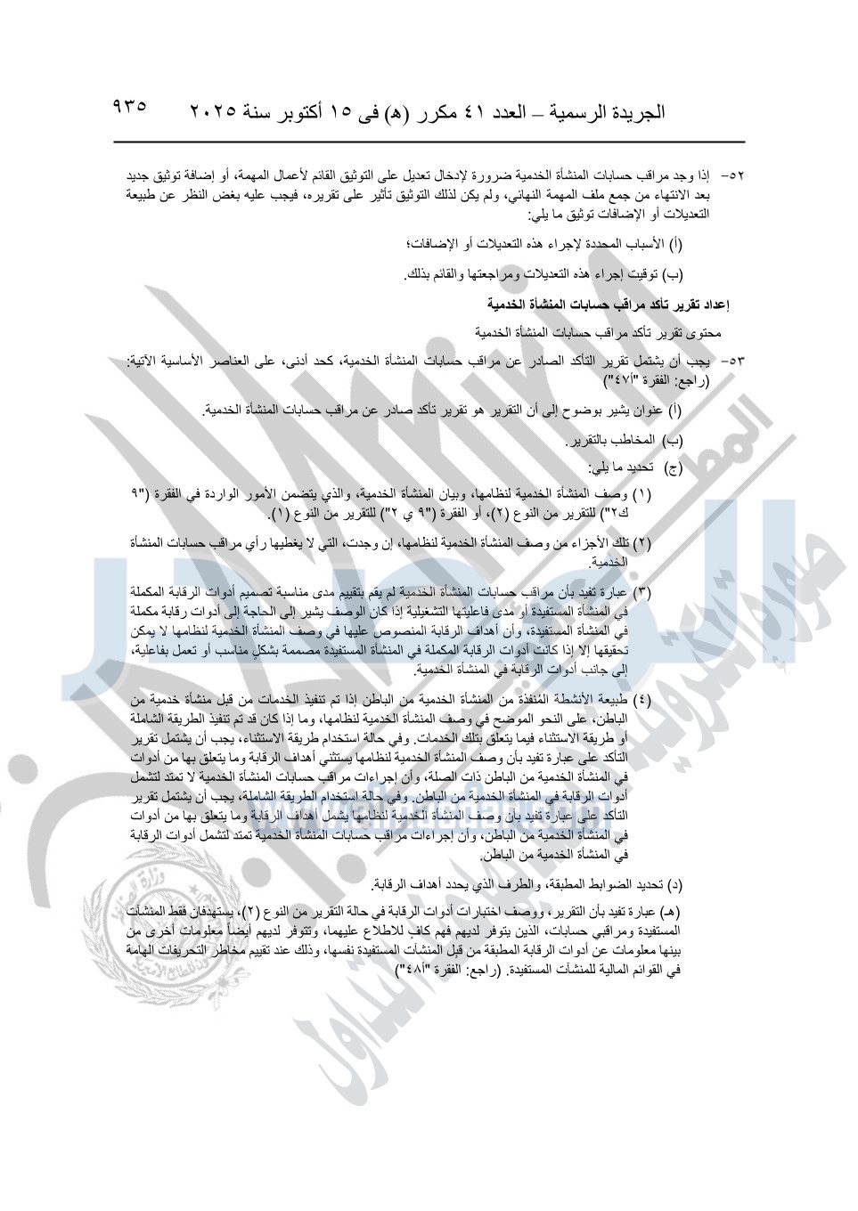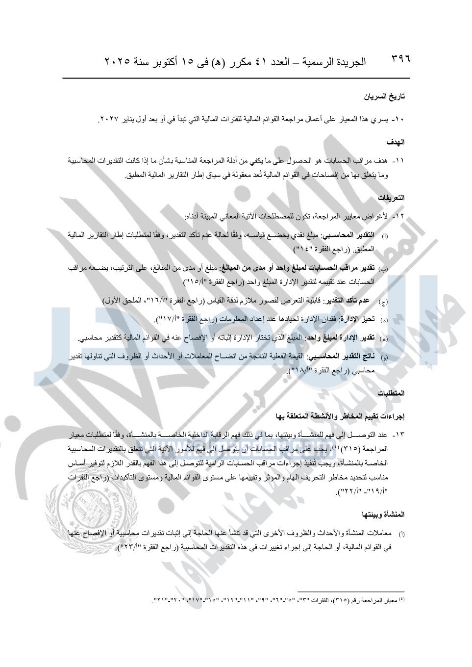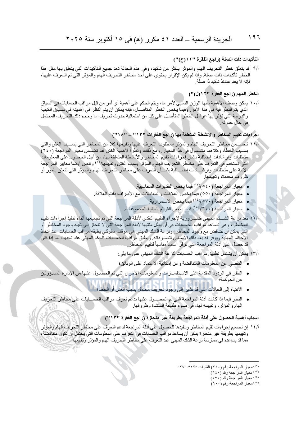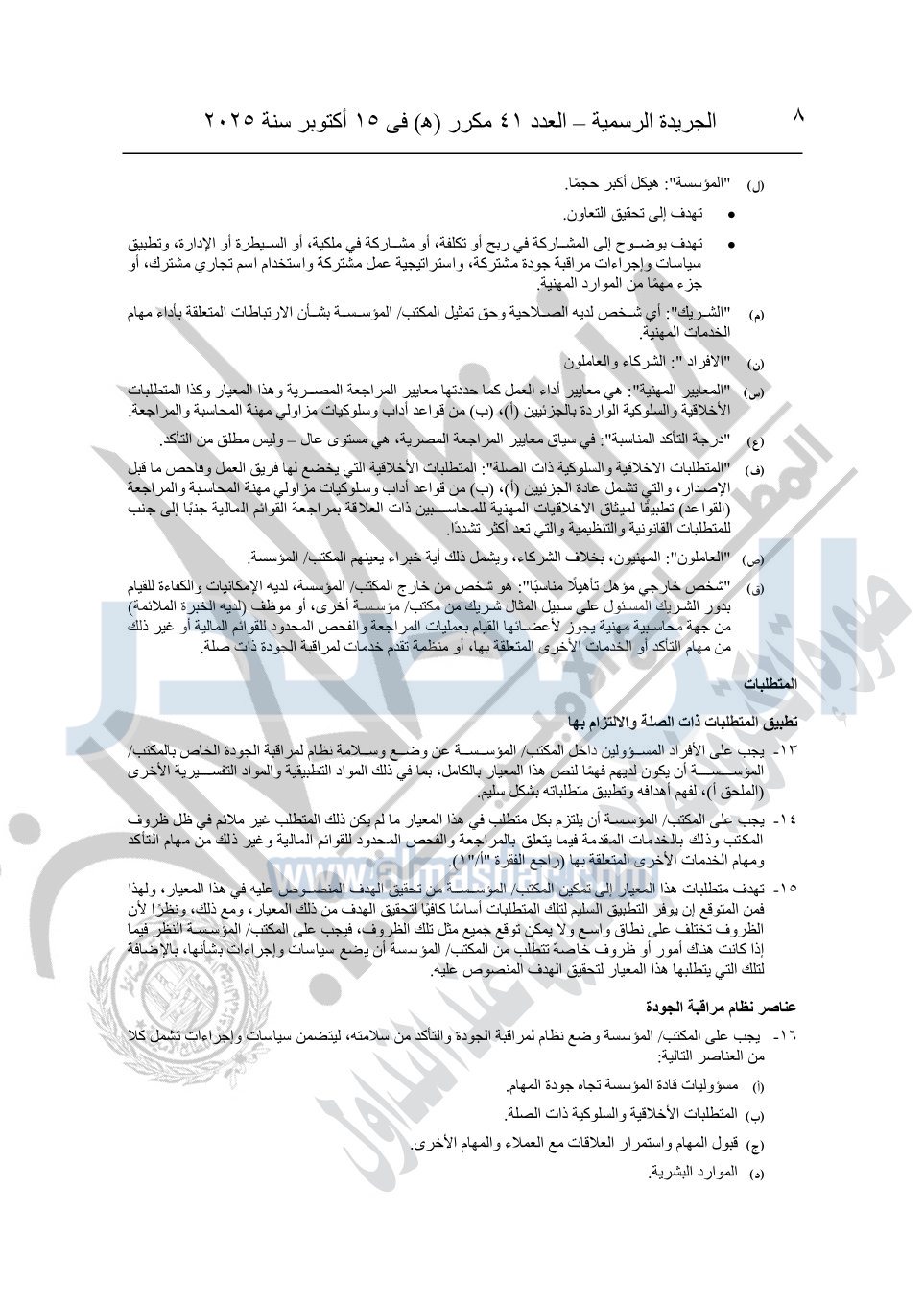 نشرت الجريدة الرسمية في العدد 41 مكرر "هـ" الصادر في 15 أكتوبر سنة 2025، قرار رئيس مجلس الوزراء رقم 3725 لسنة 2025، بشأن العمل بالمعايير المصرية للمراجعة والفحص المحدود ومهام التأكد الأخرى المرافقة لهذا القرار.