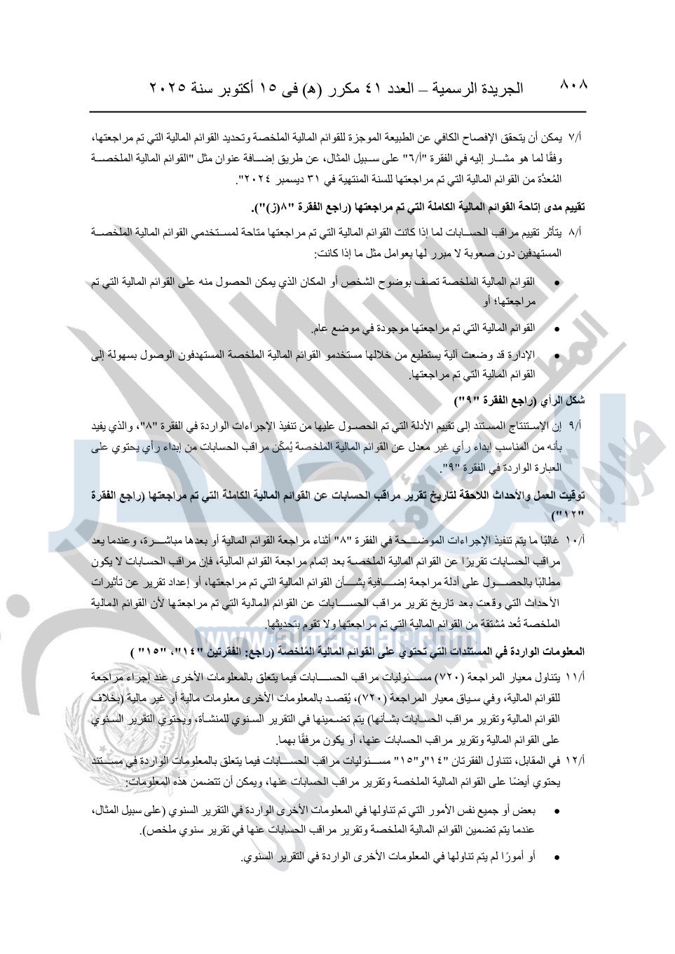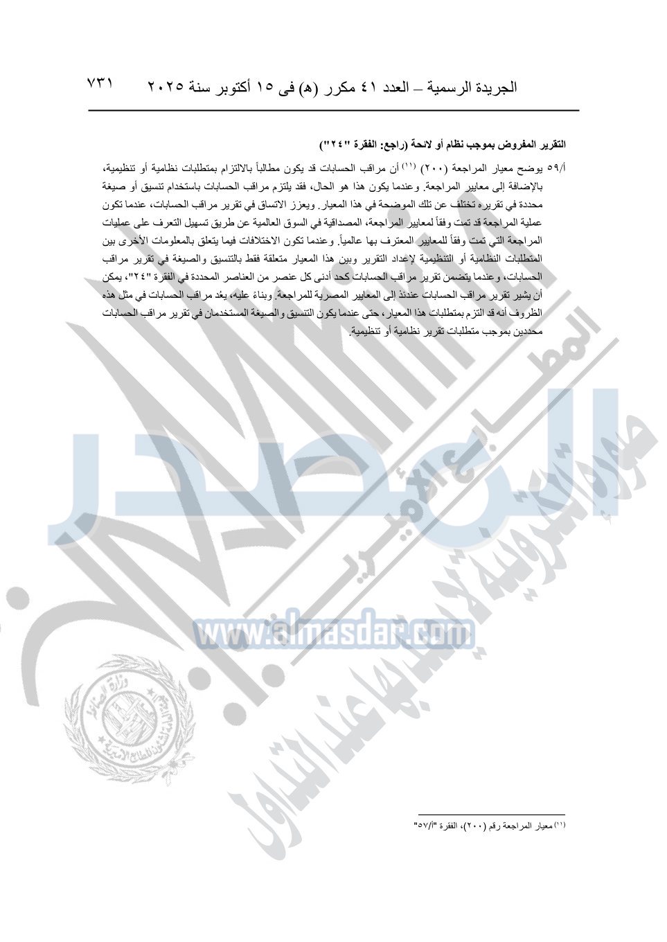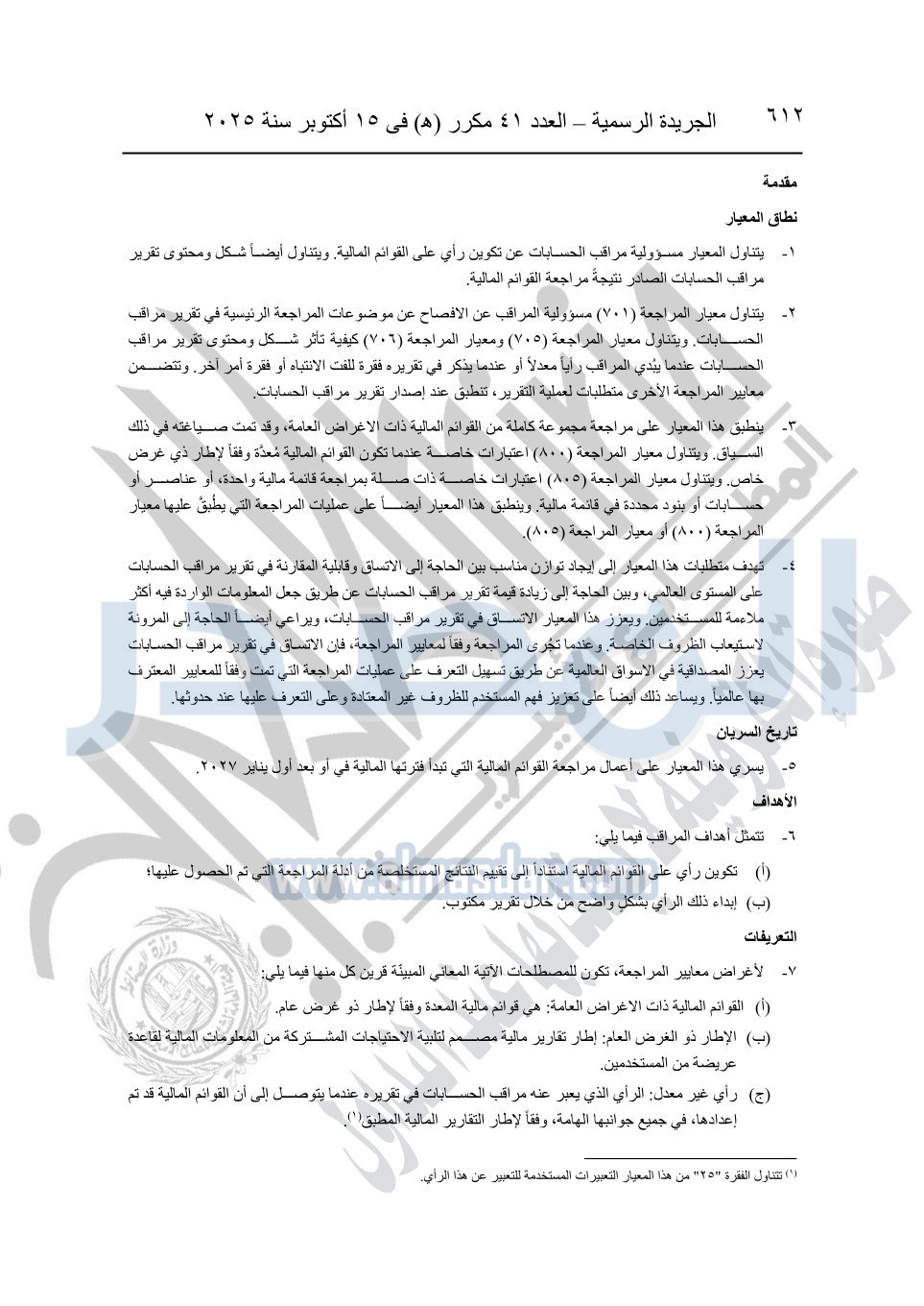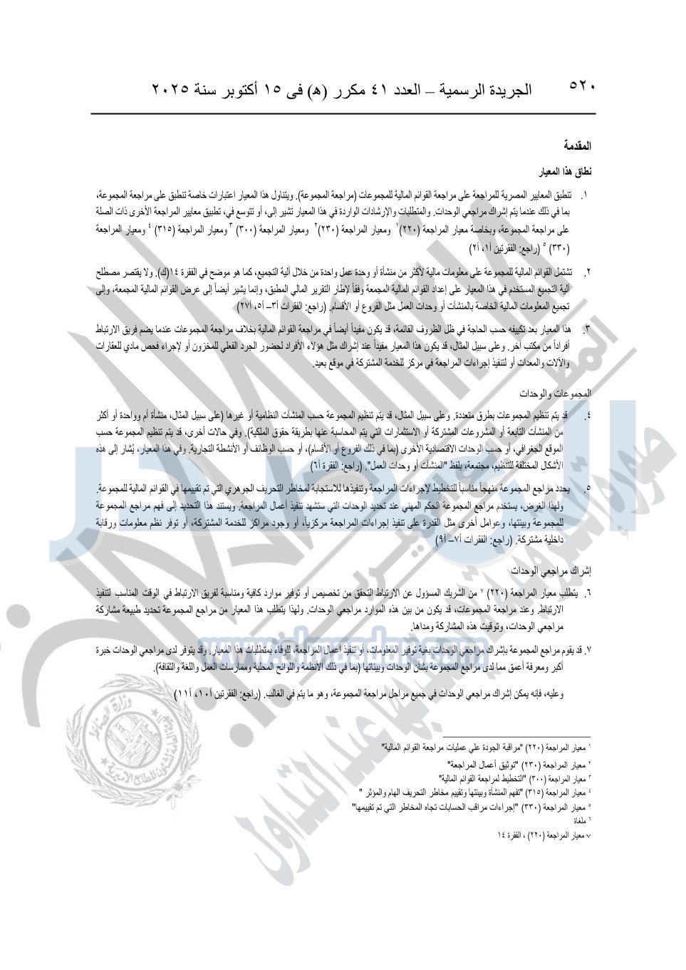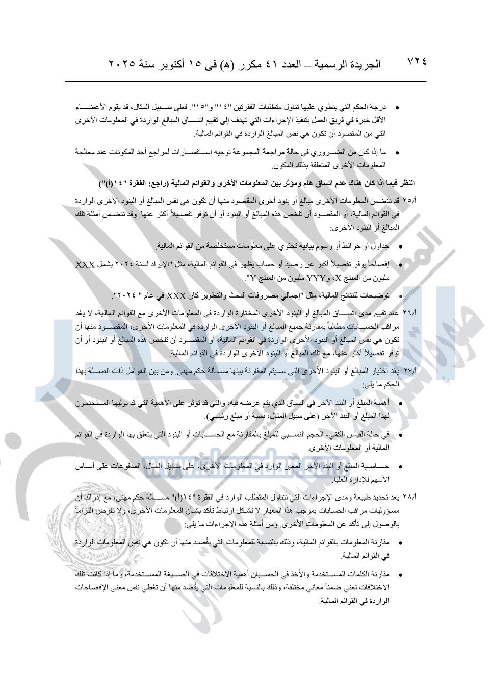 نشرت الجريدة الرسمية في العدد 41 مكرر "هـ" الصادر في 15 أكتوبر سنة 2025، قرار رئيس مجلس الوزراء رقم 3725 لسنة 2025، بشأن العمل بالمعايير المصرية للمراجعة والفحص المحدود ومهام التأكد الأخرى المرافقة لهذا القرار.
