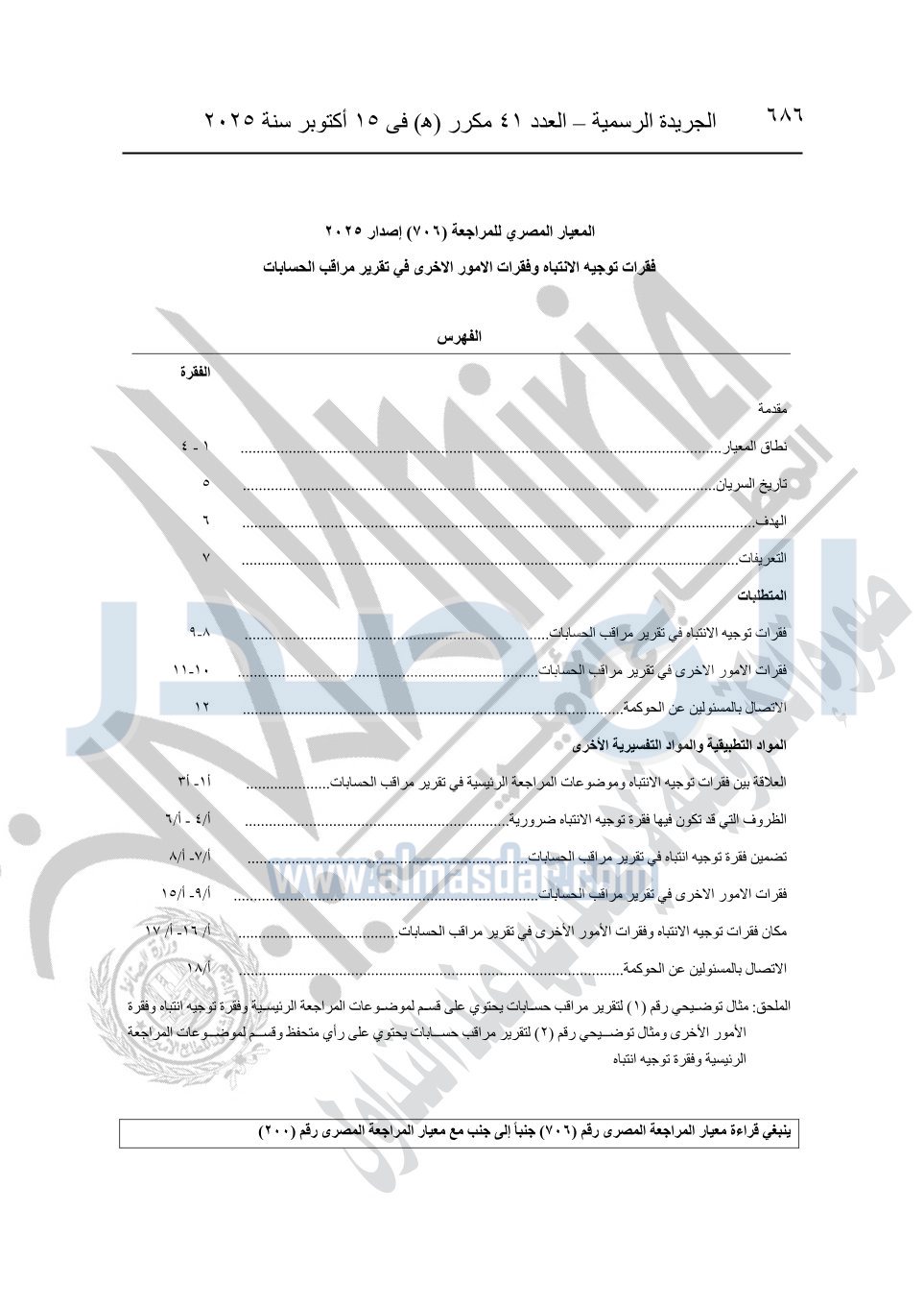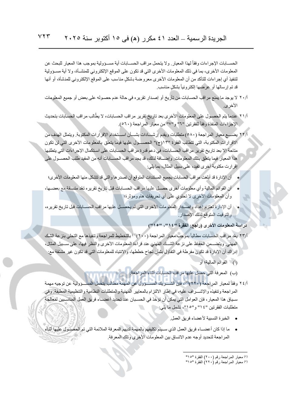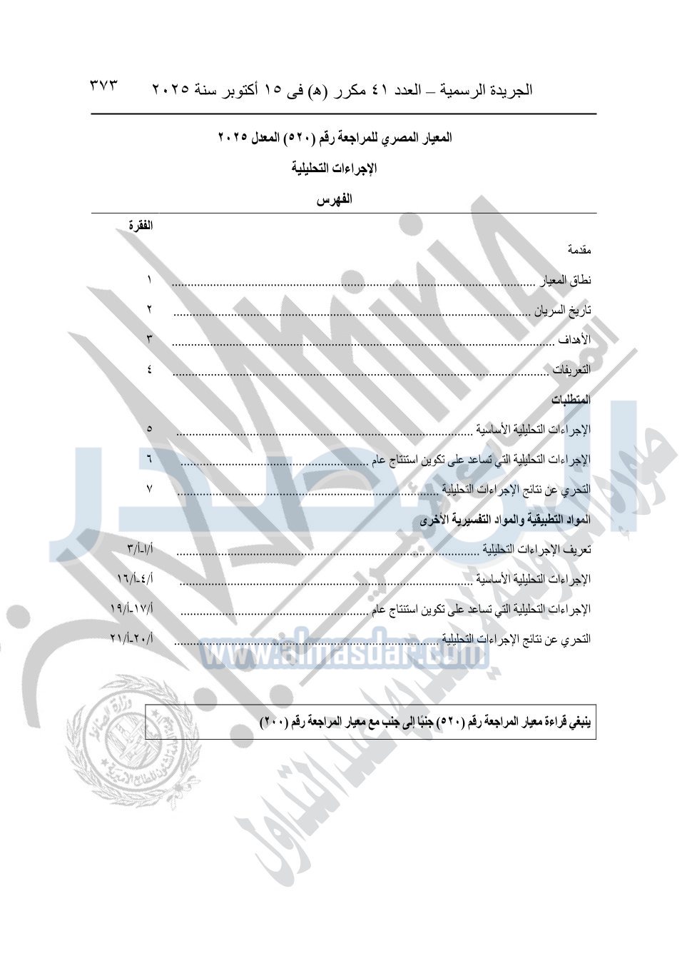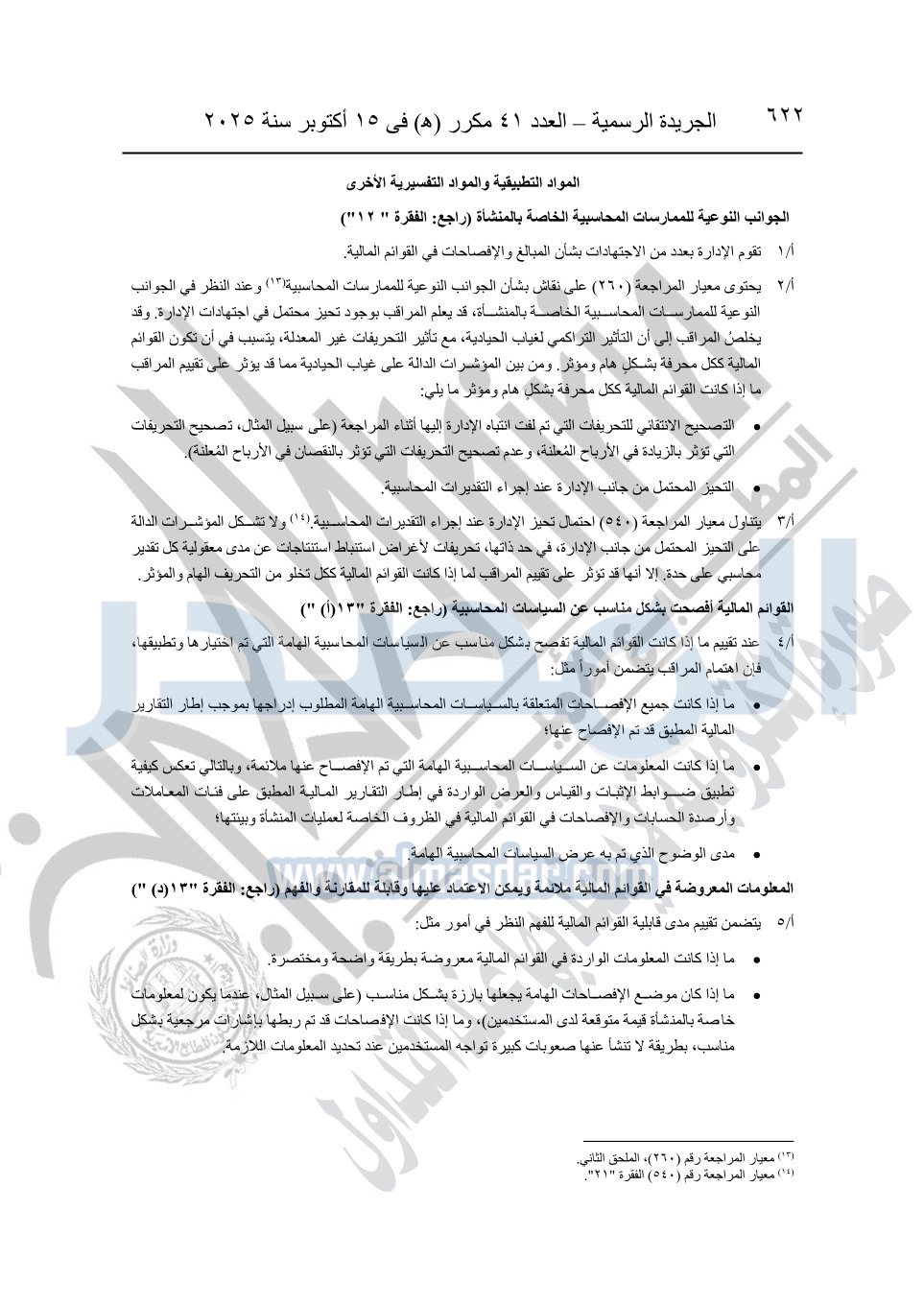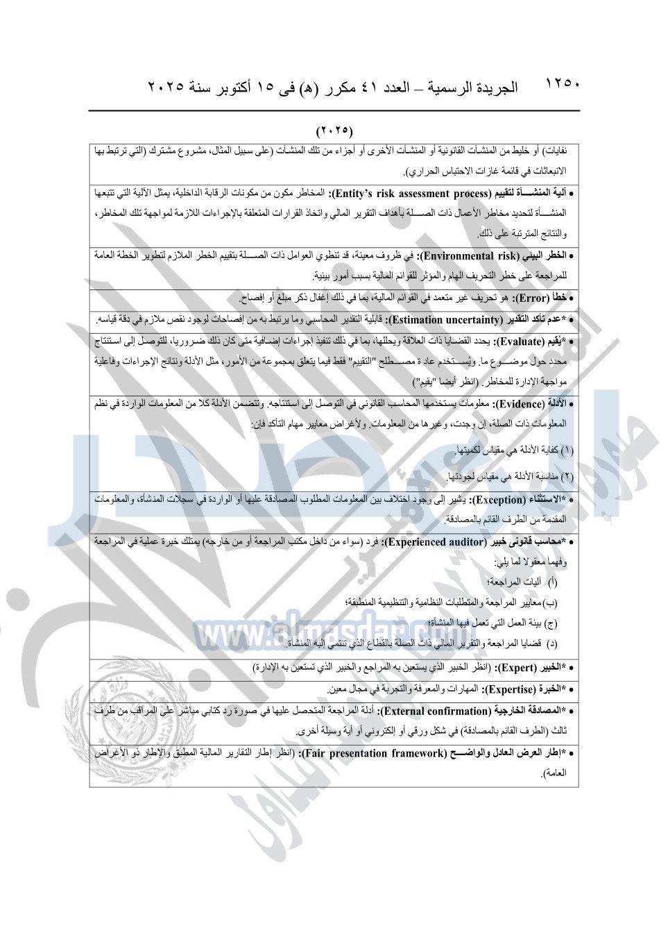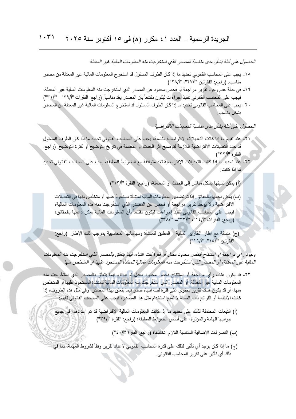 نشرت الجريدة الرسمية في العدد 41 مكرر "هـ" الصادر في 15 أكتوبر سنة 2025، قرار رئيس مجلس الوزراء رقم 3725 لسنة 2025، بشأن العمل بالمعايير المصرية للمراجعة والفحص المحدود ومهام التأكد الأخرى المرافقة لهذا القرار.
