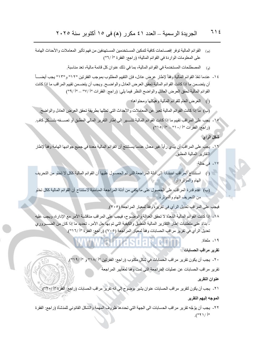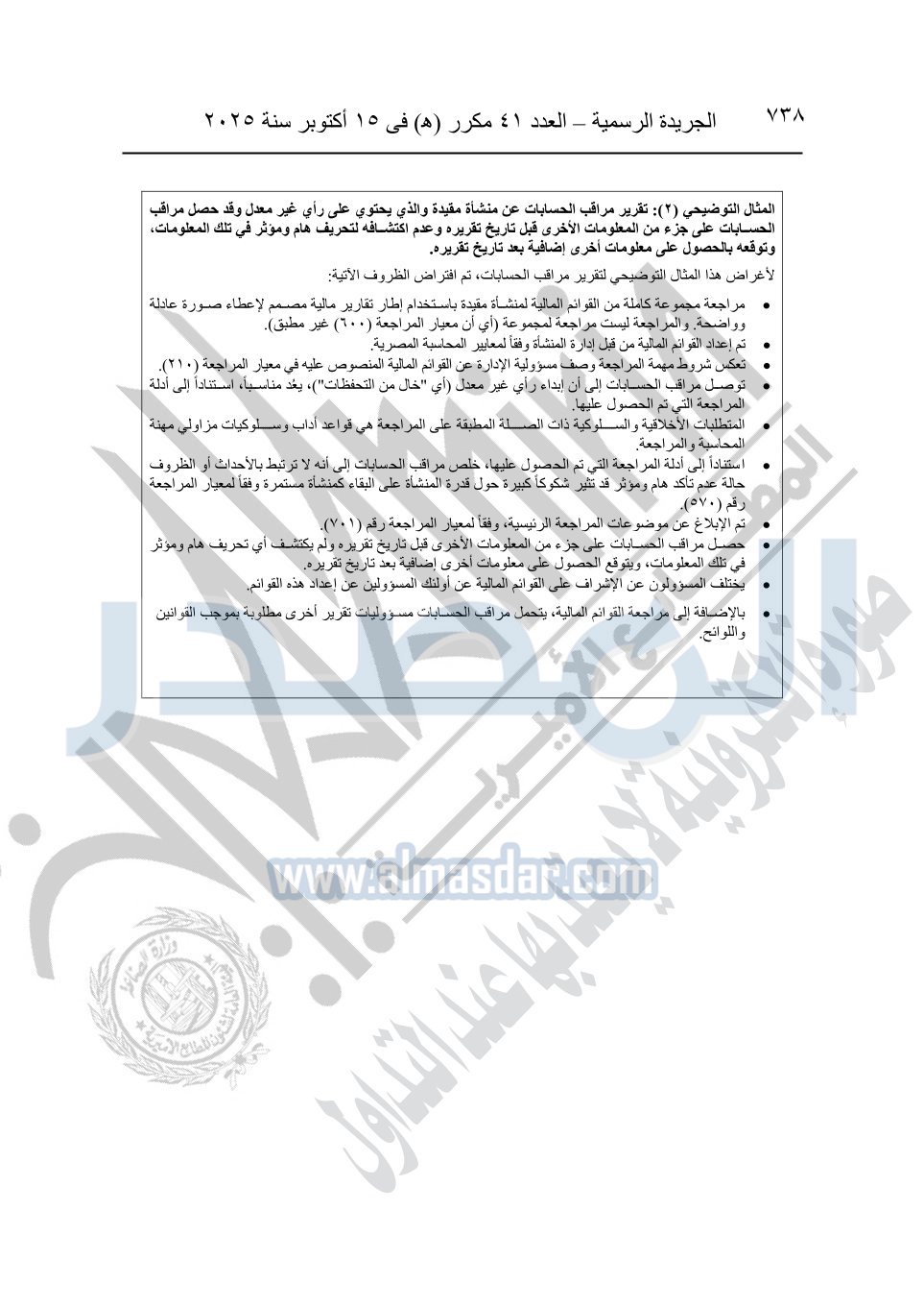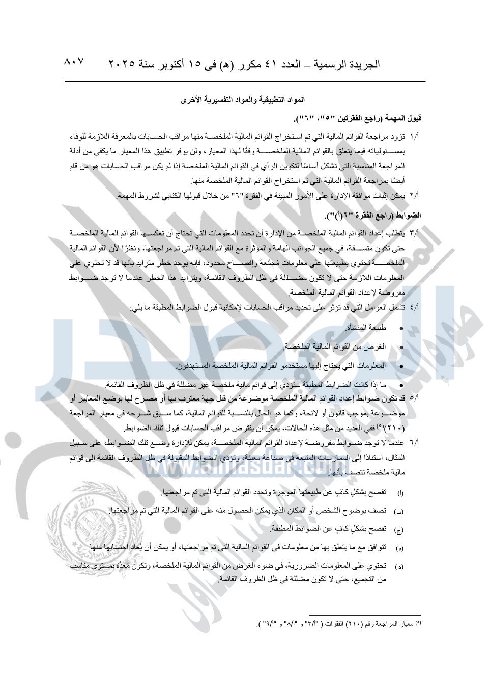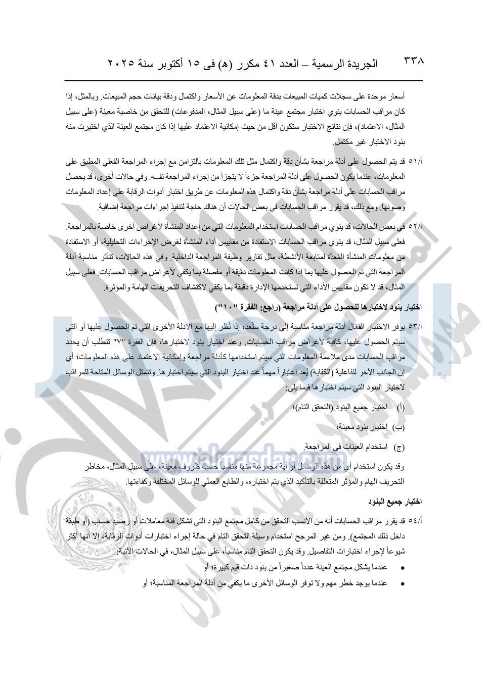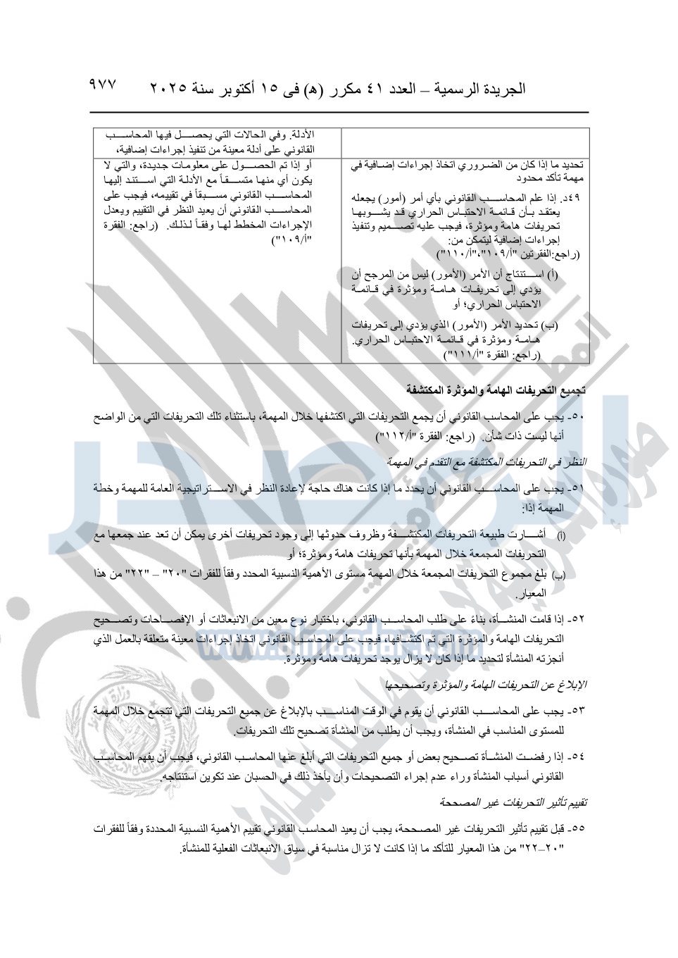 نشرت الجريدة الرسمية في العدد 41 مكرر "هـ" الصادر في 15 أكتوبر سنة 2025، قرار رئيس مجلس الوزراء رقم 3725 لسنة 2025، بشأن العمل بالمعايير المصرية للمراجعة والفحص المحدود ومهام التأكد الأخرى المرافقة لهذا القرار.