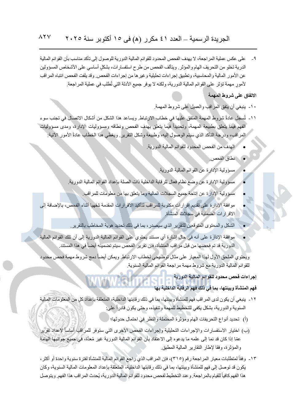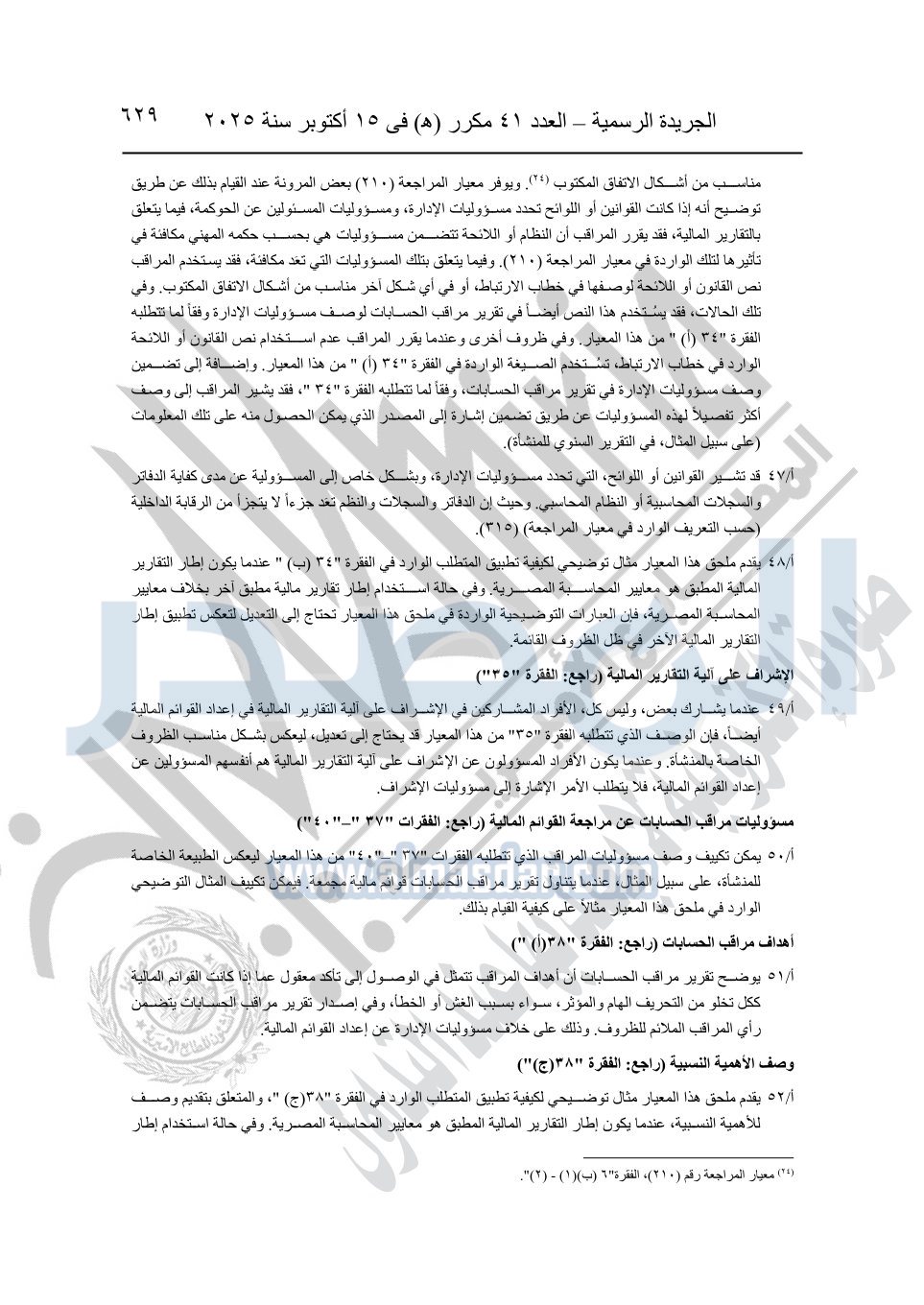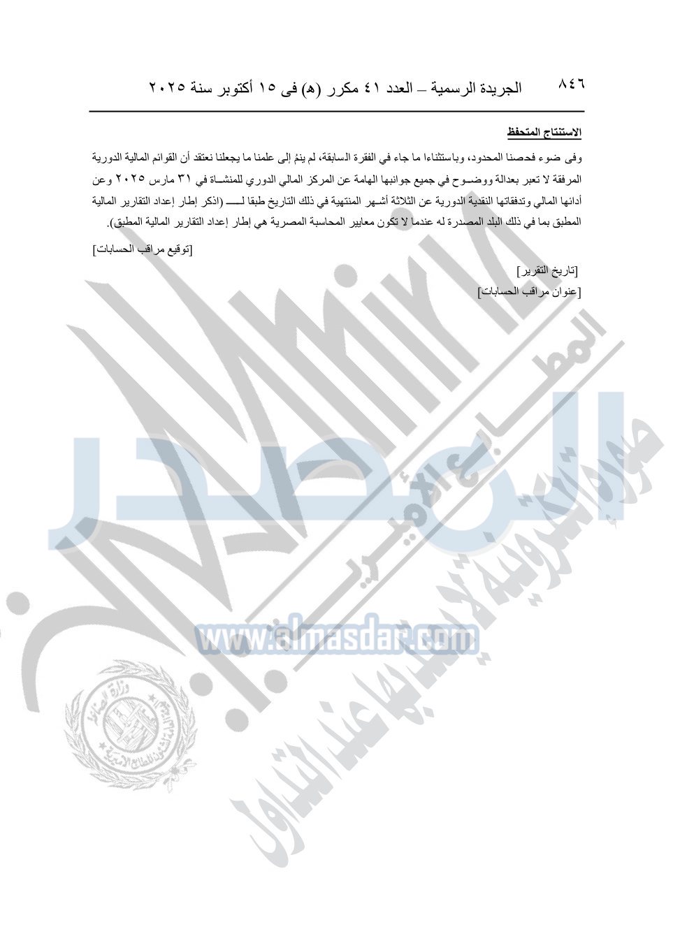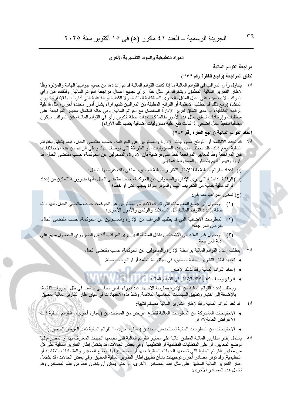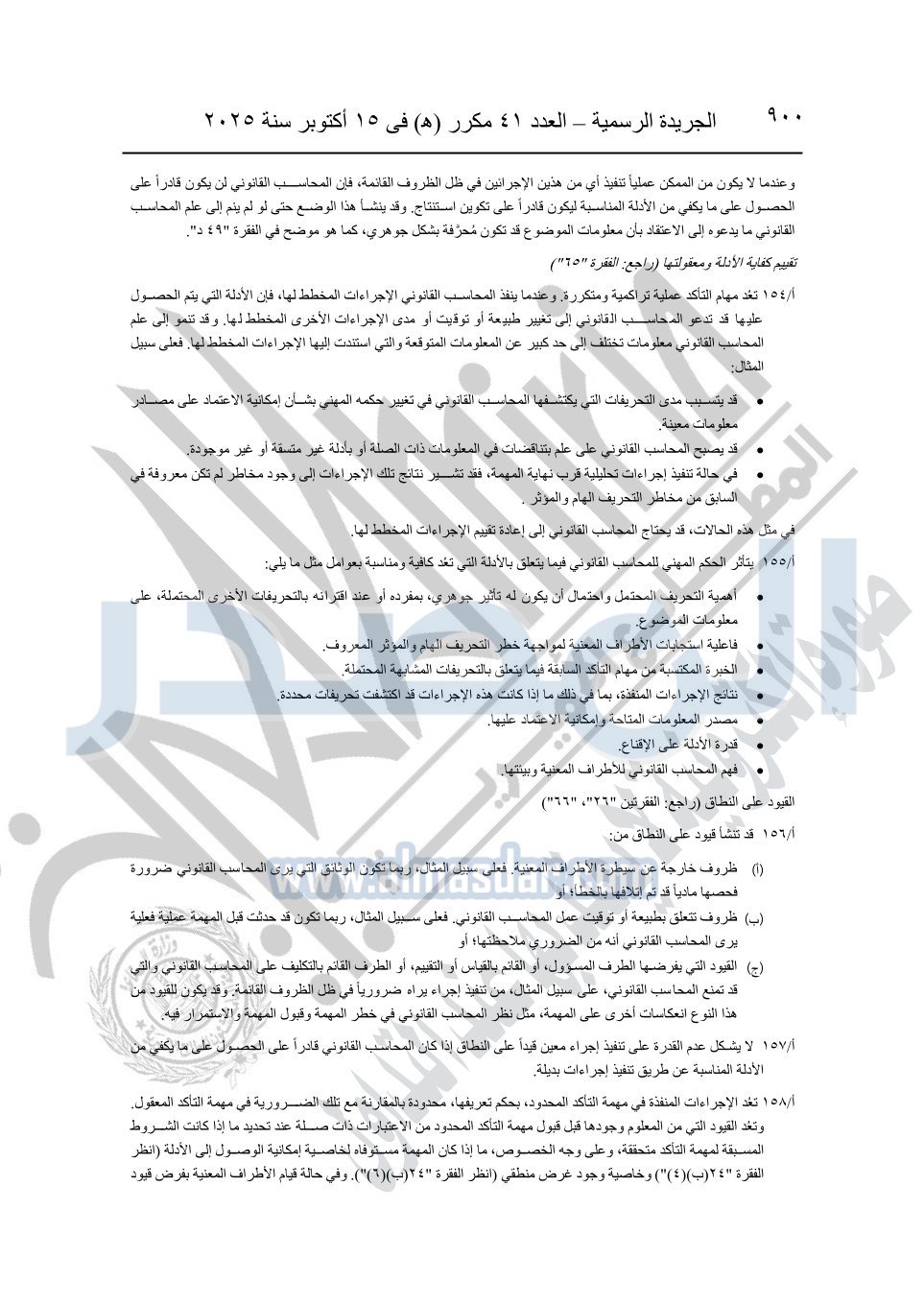 نشرت الجريدة الرسمية في العدد 41 مكرر "هـ" الصادر في 15 أكتوبر سنة 2025، قرار رئيس مجلس الوزراء رقم 3725 لسنة 2025، بشأن العمل بالمعايير المصرية للمراجعة والفحص المحدود ومهام التأكد الأخرى المرافقة لهذا القرار.