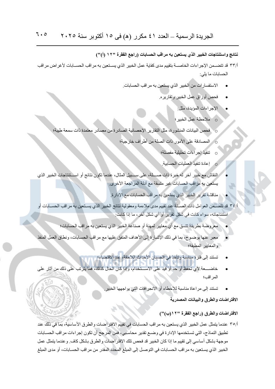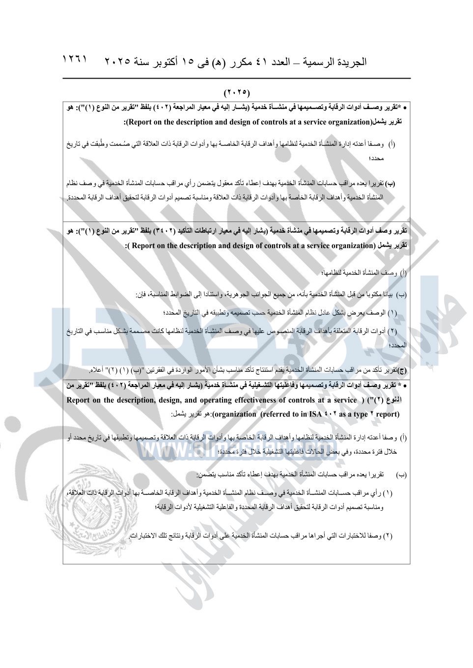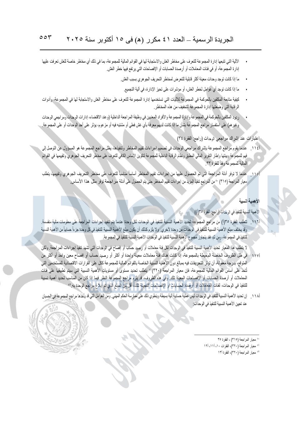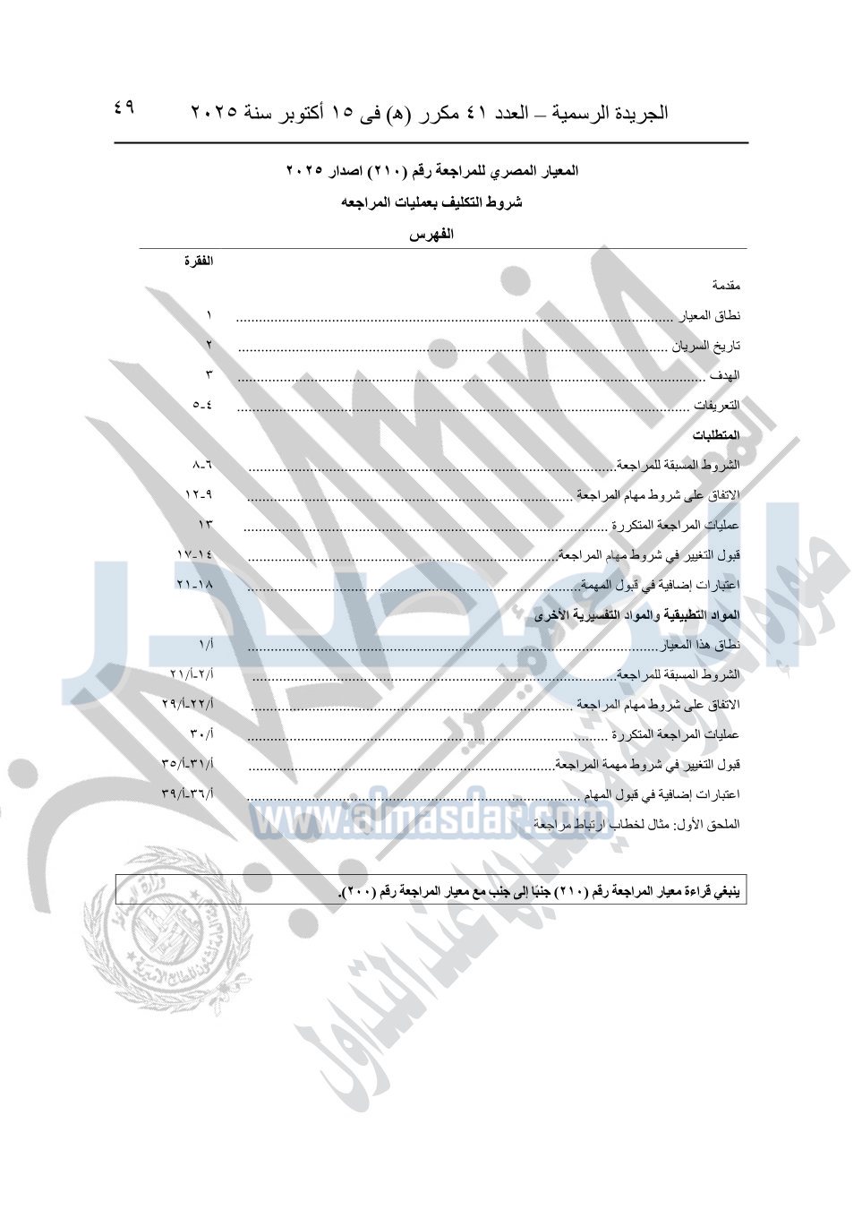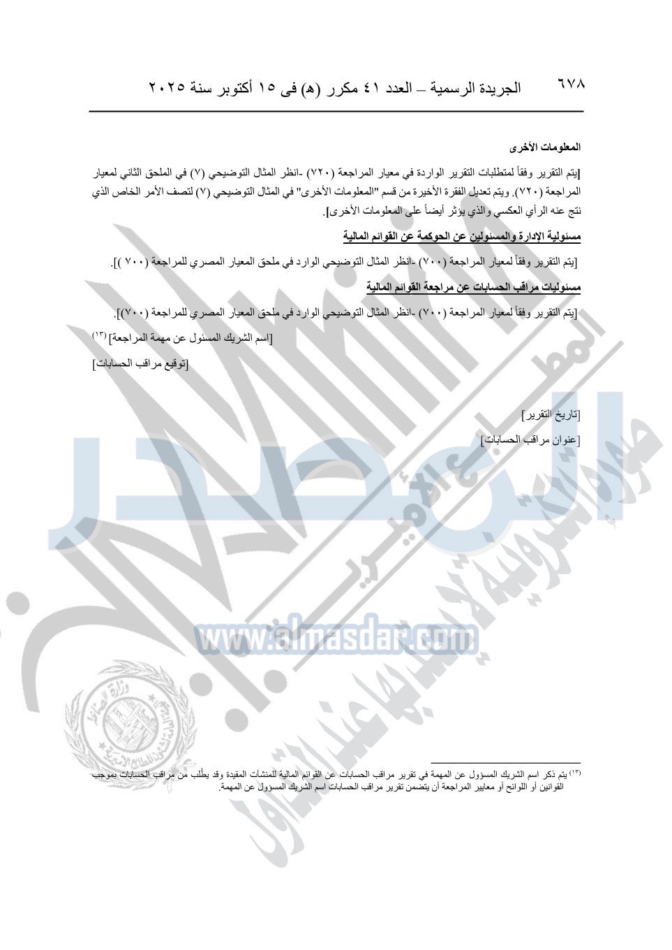 نشرت الجريدة الرسمية في العدد 41 مكرر "هـ" الصادر في 15 أكتوبر سنة 2025، قرار رئيس مجلس الوزراء رقم 3725 لسنة 2025، بشأن العمل بالمعايير المصرية للمراجعة والفحص المحدود ومهام التأكد الأخرى المرافقة لهذا القرار.