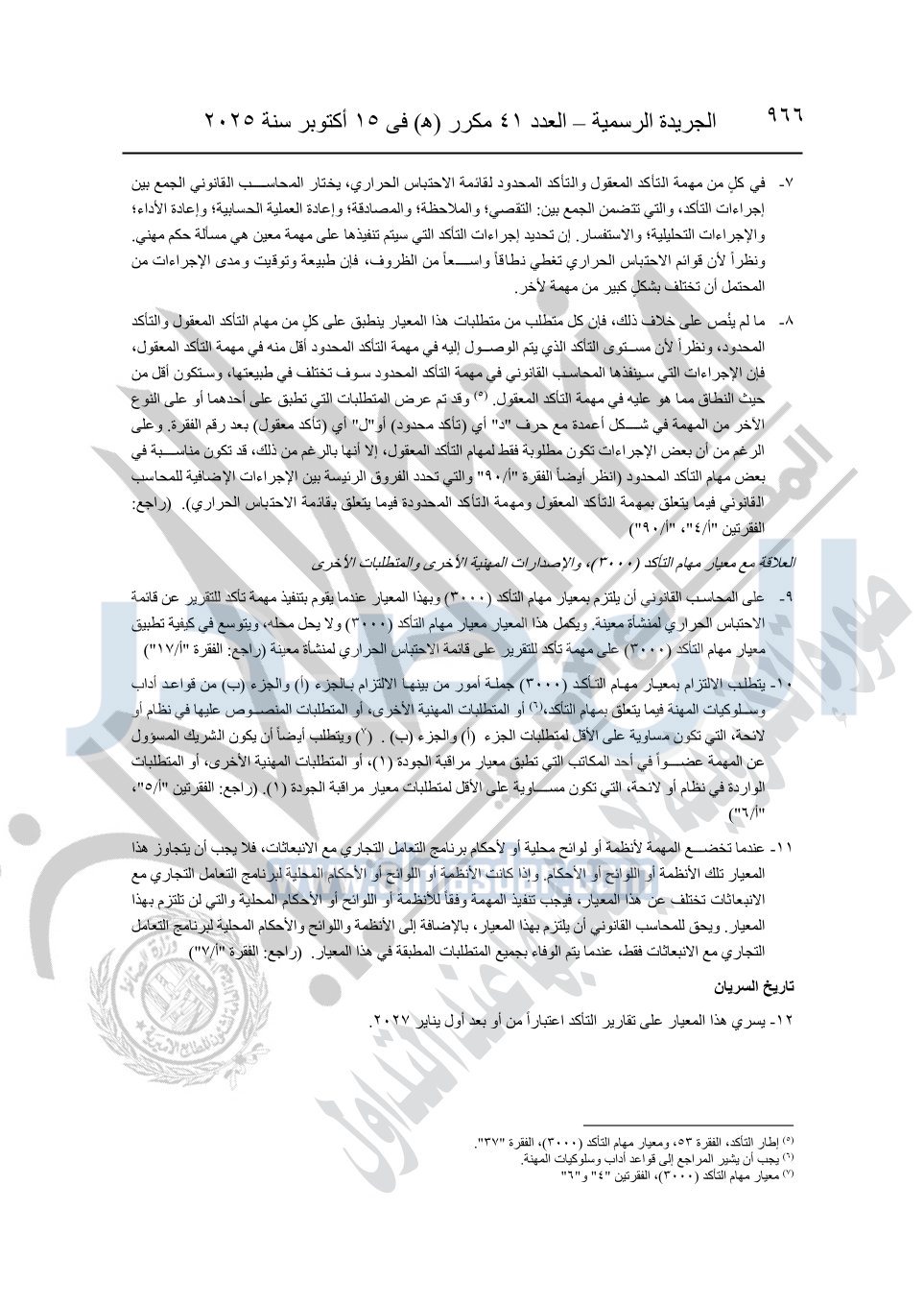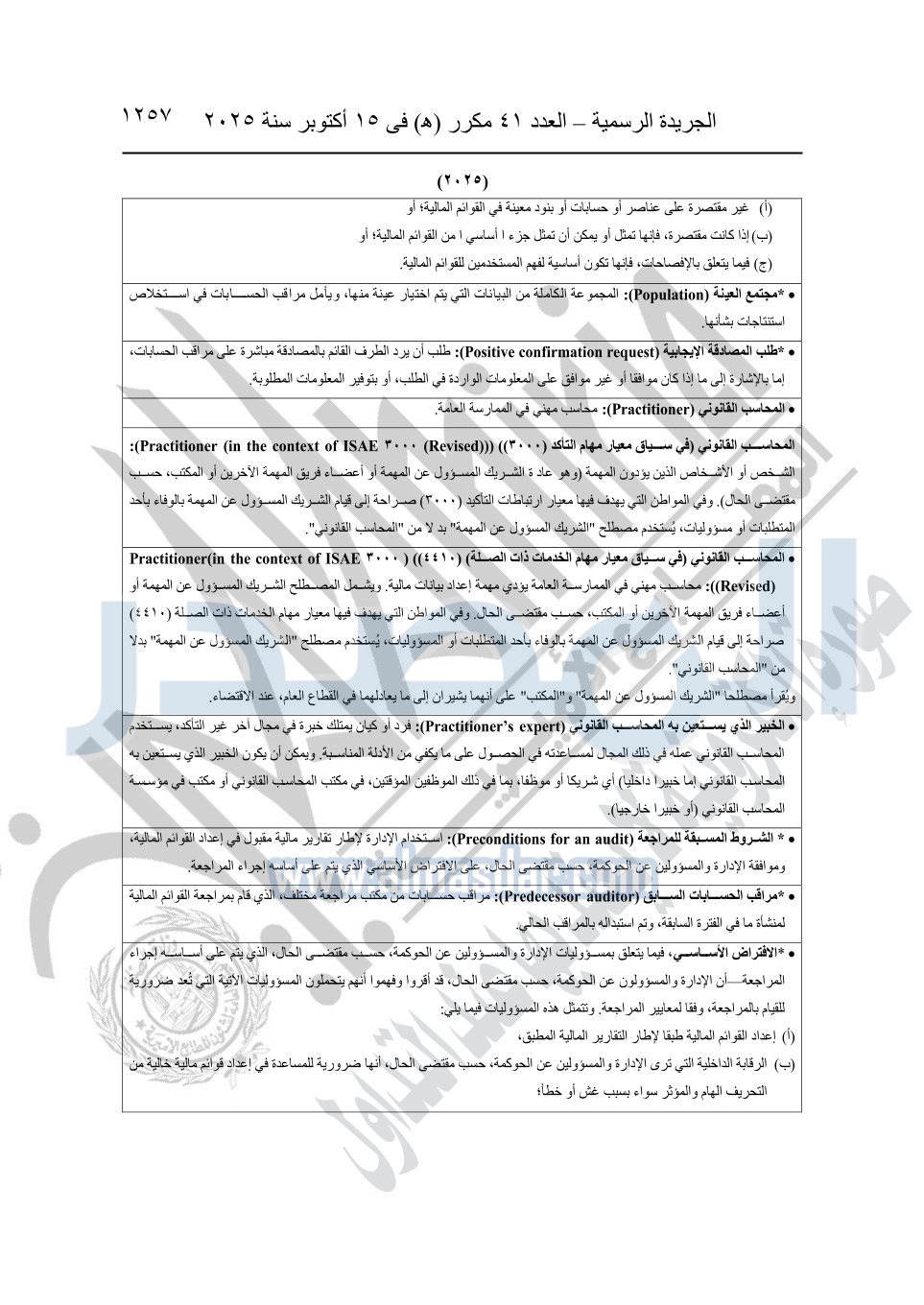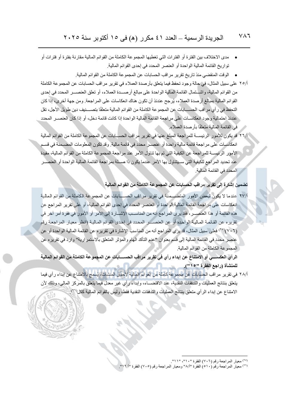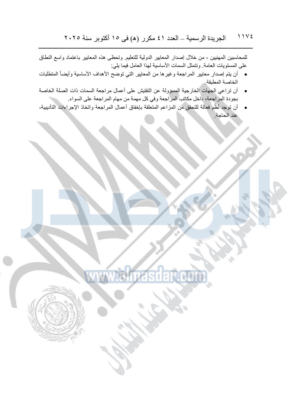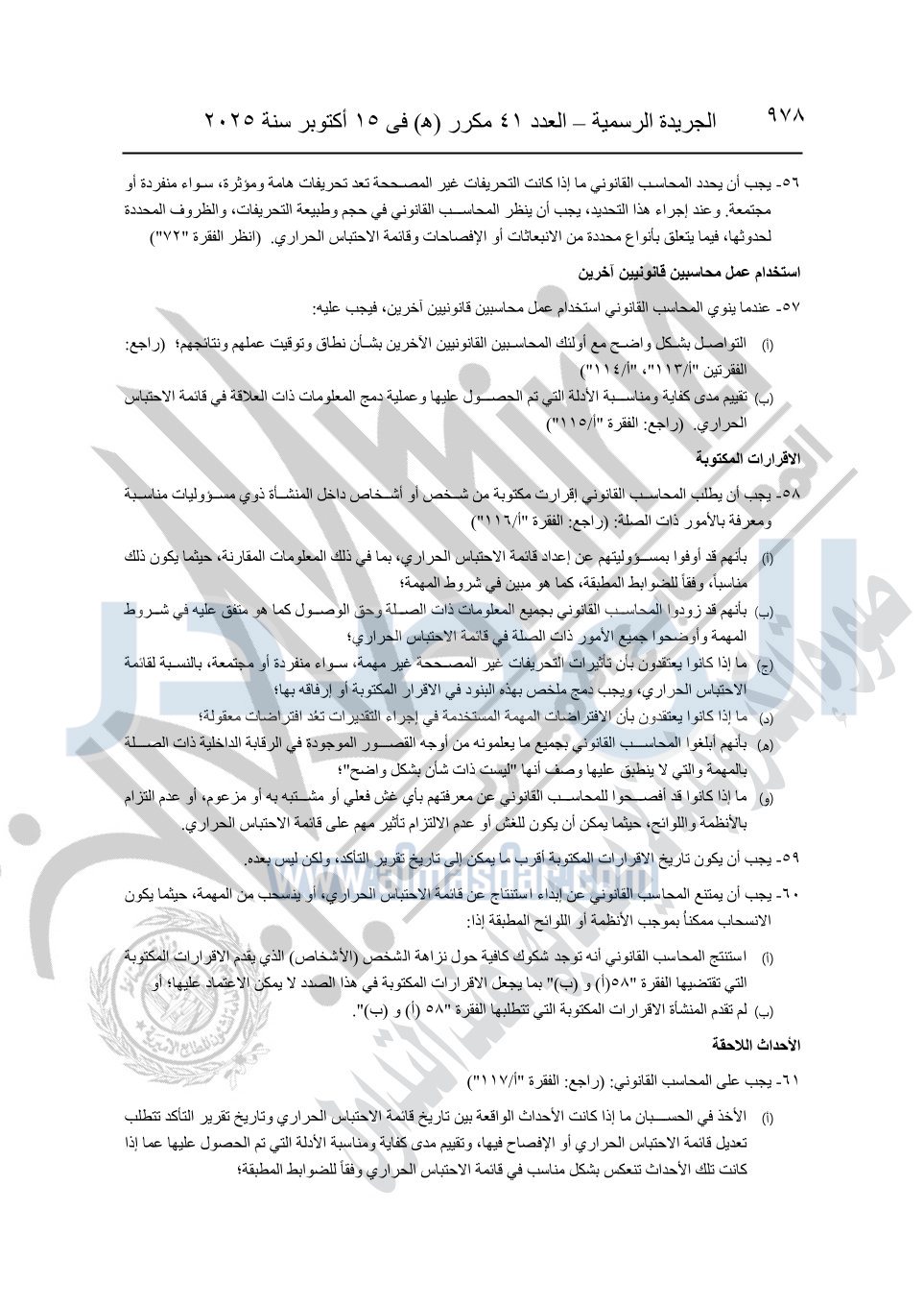نشرت الجريدة الرسمية في العدد 41 مكرر "هـ" الصادر في 15 أكتوبر سنة 2025، قرار رئيس مجلس الوزراء رقم 3725 لسنة 2025، بشأن العمل بالمعايير المصرية للمراجعة والفحص المحدود ومهام التأكد الأخرى المرافقة لهذا القرار.