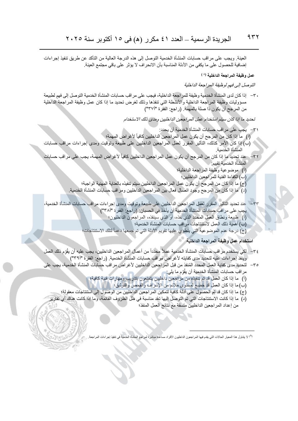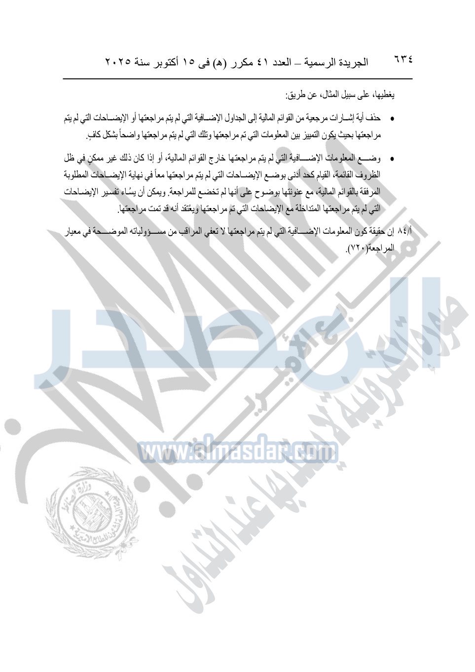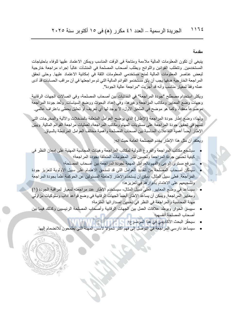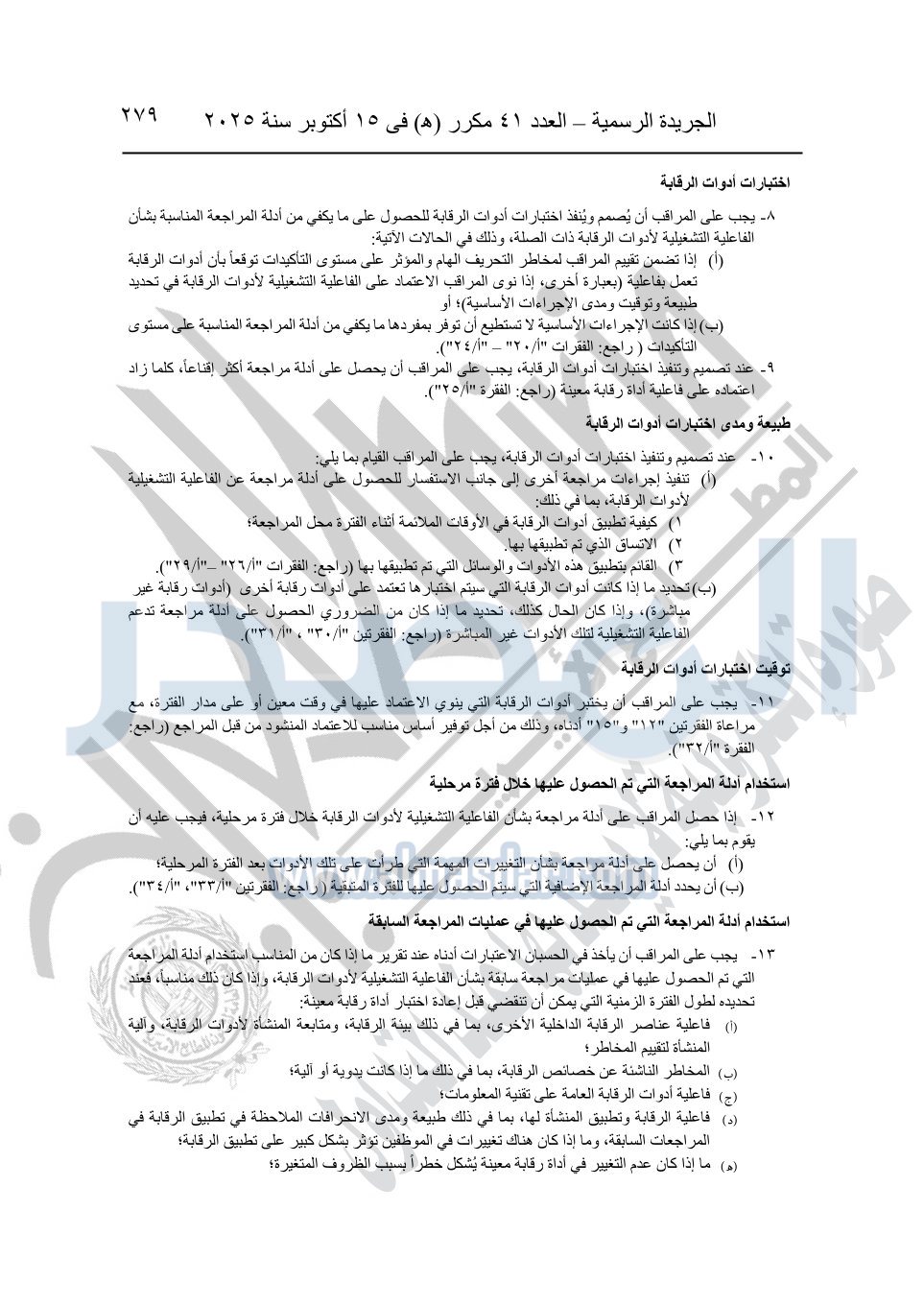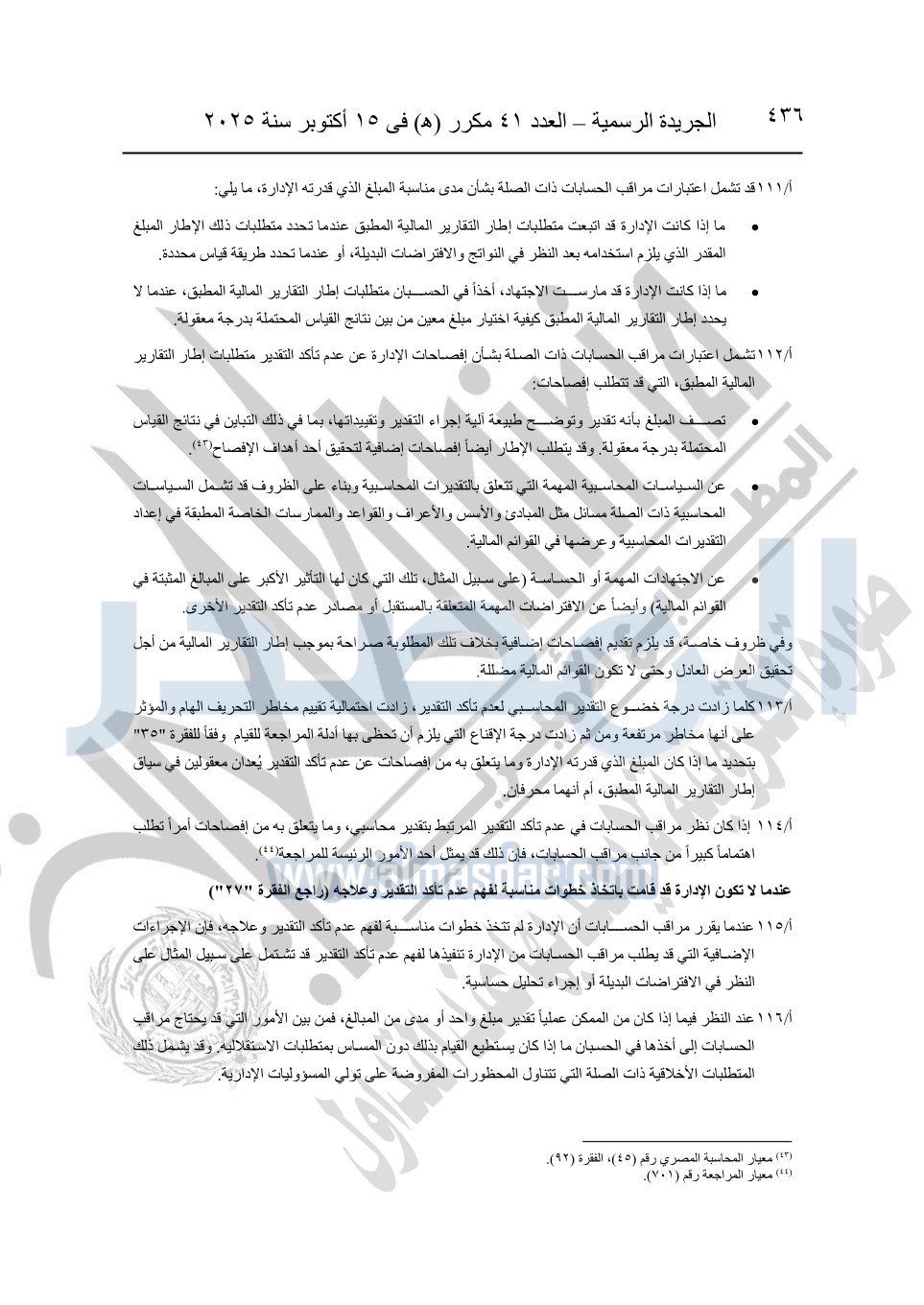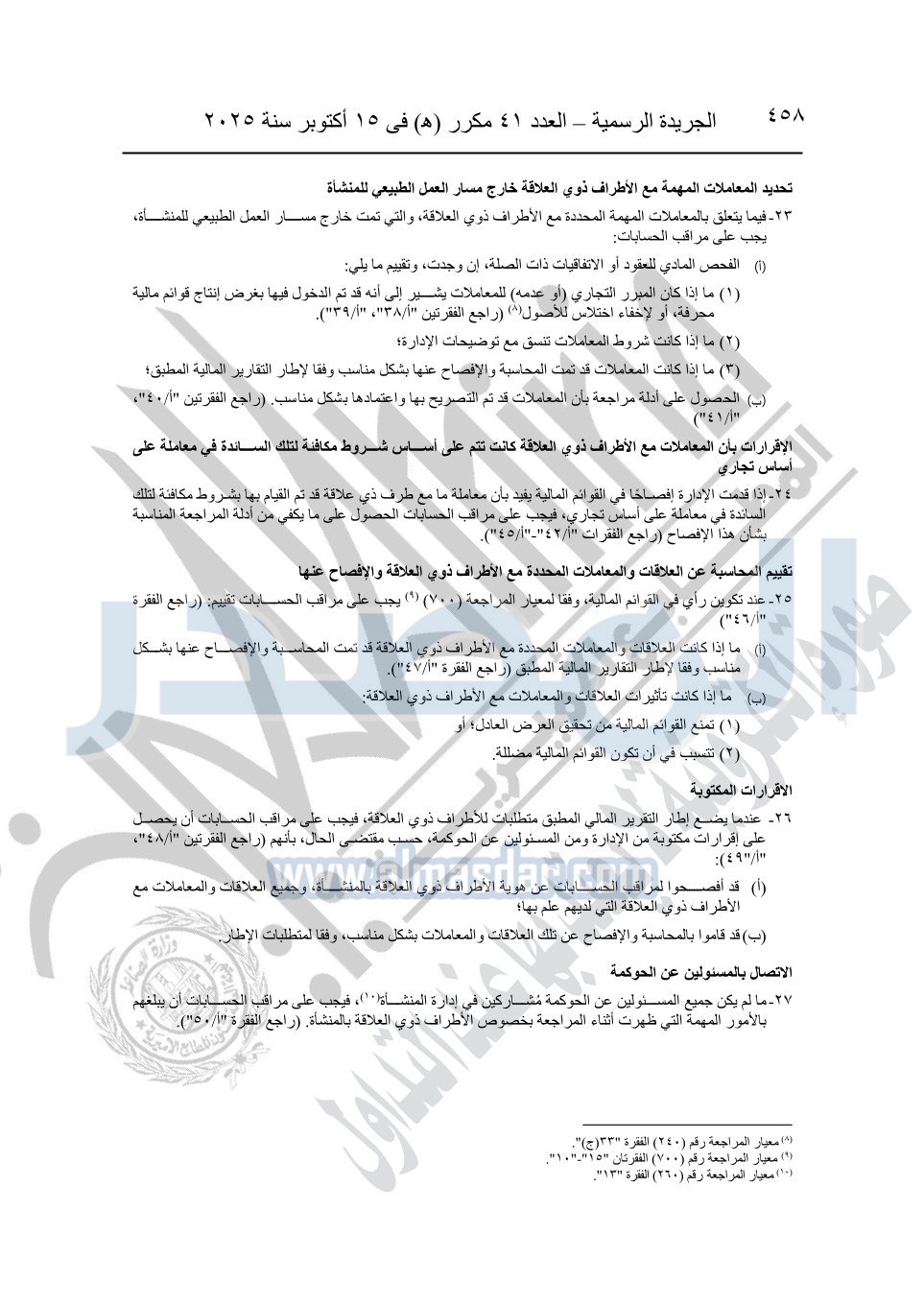نشرت الجريدة الرسمية في العدد 41 مكرر "هـ" الصادر في 15 أكتوبر سنة 2025، قرار رئيس مجلس الوزراء رقم 3725 لسنة 2025، بشأن العمل بالمعايير المصرية للمراجعة والفحص المحدود ومهام التأكد الأخرى المرافقة لهذا القرار.