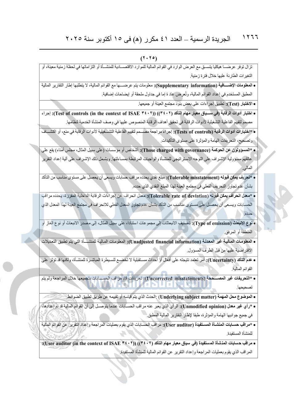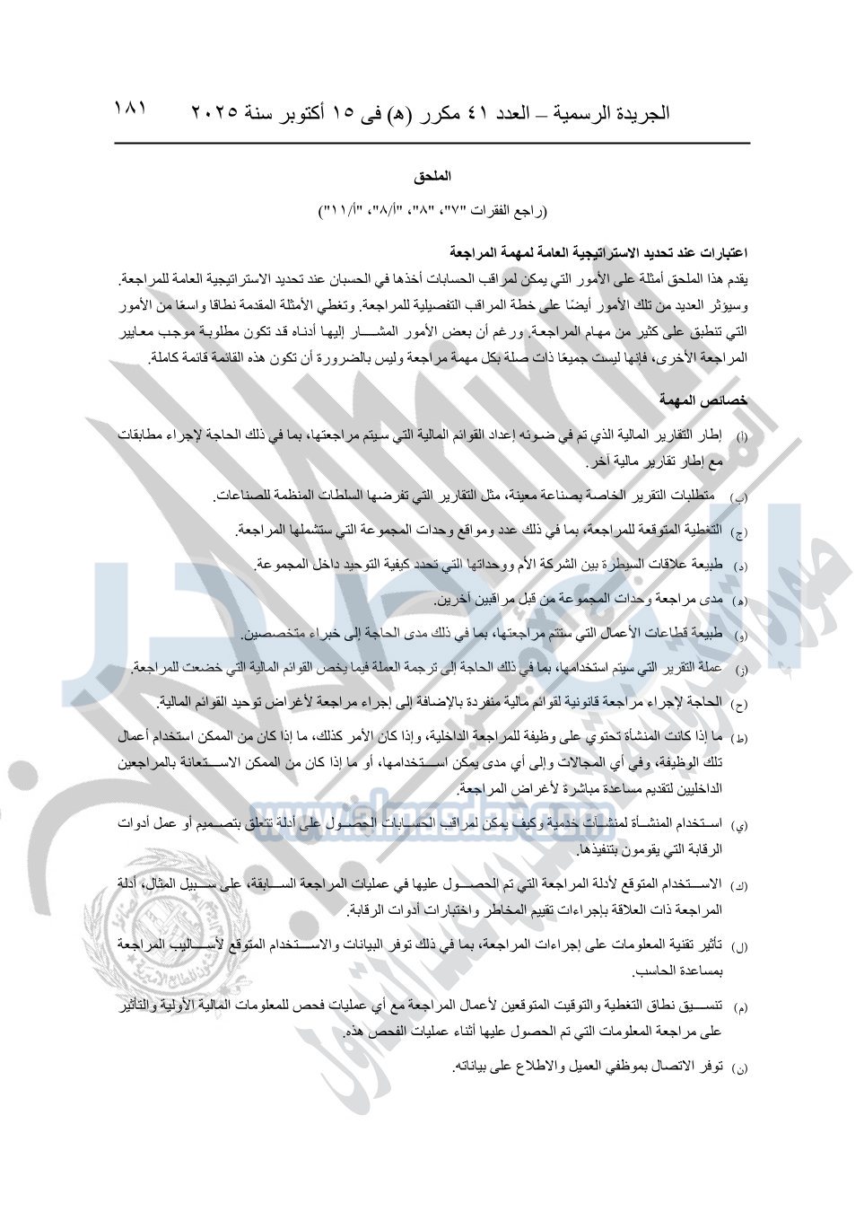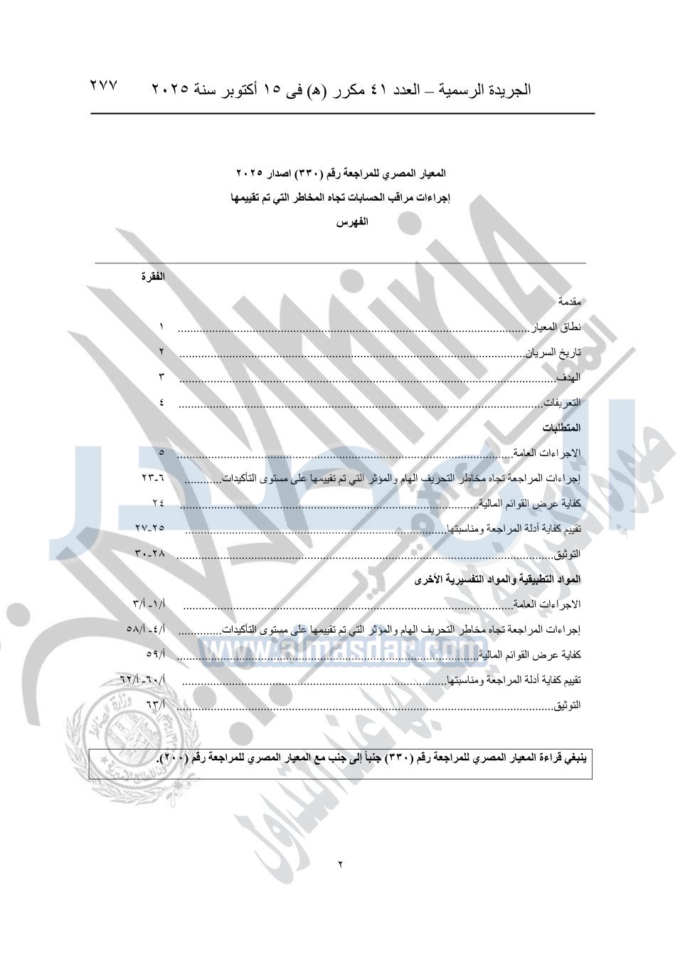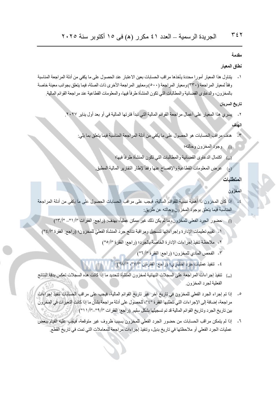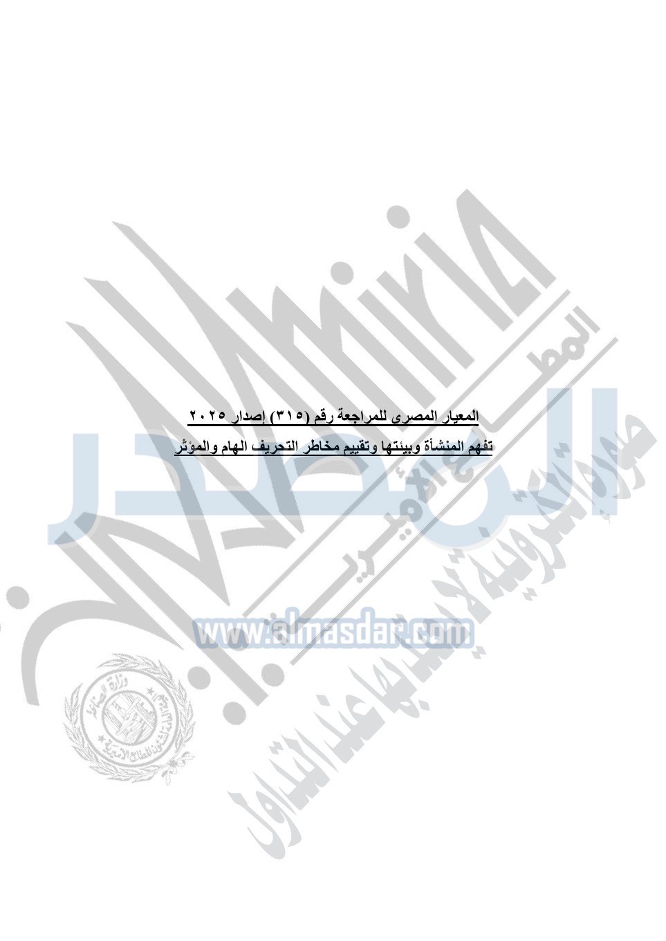نشرت الجريدة الرسمية في العدد 41 مكرر "هـ" الصادر في 15 أكتوبر سنة 2025، قرار رئيس مجلس الوزراء رقم 3725 لسنة 2025، بشأن العمل بالمعايير المصرية للمراجعة والفحص المحدود ومهام التأكد الأخرى المرافقة لهذا القرار.