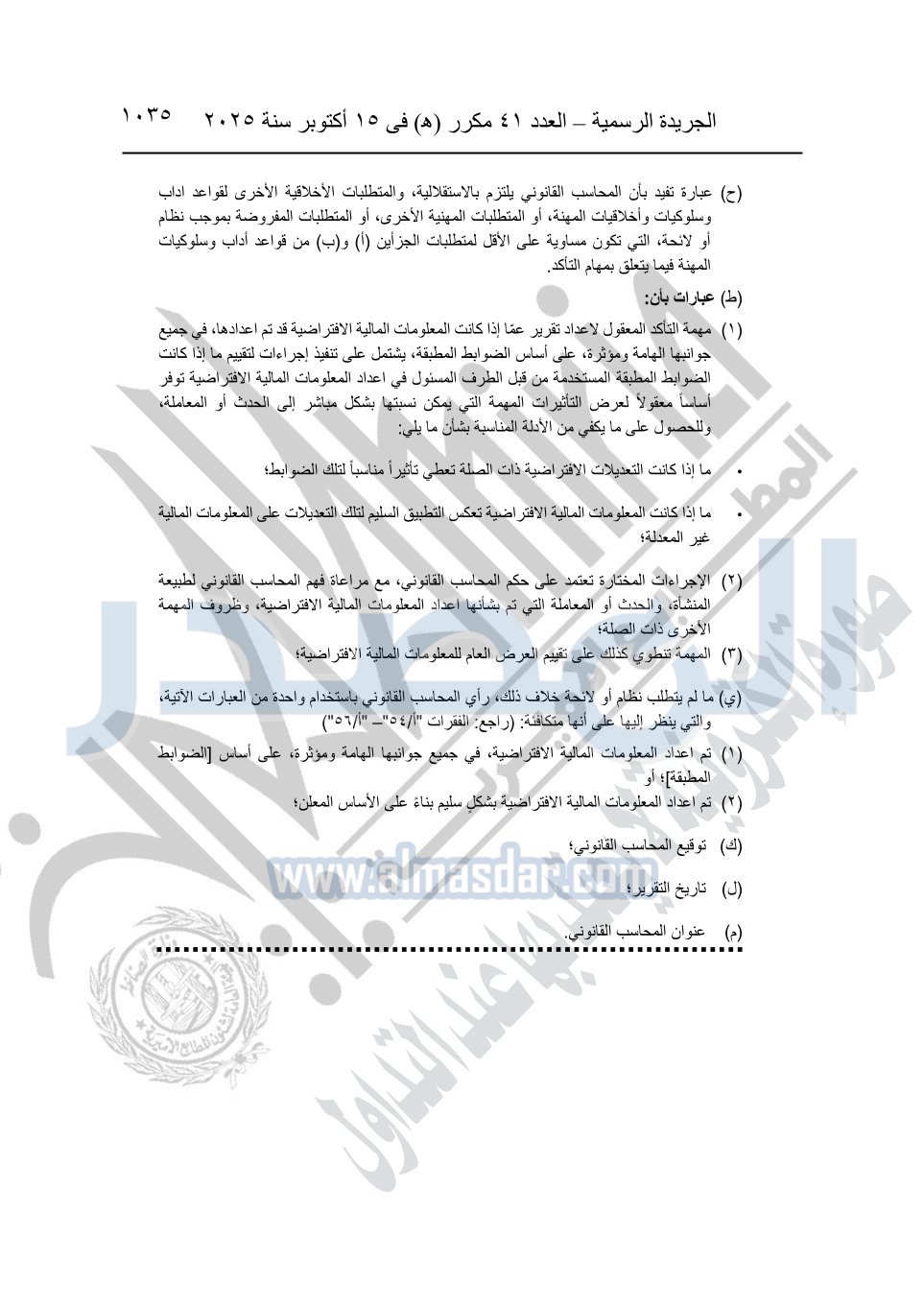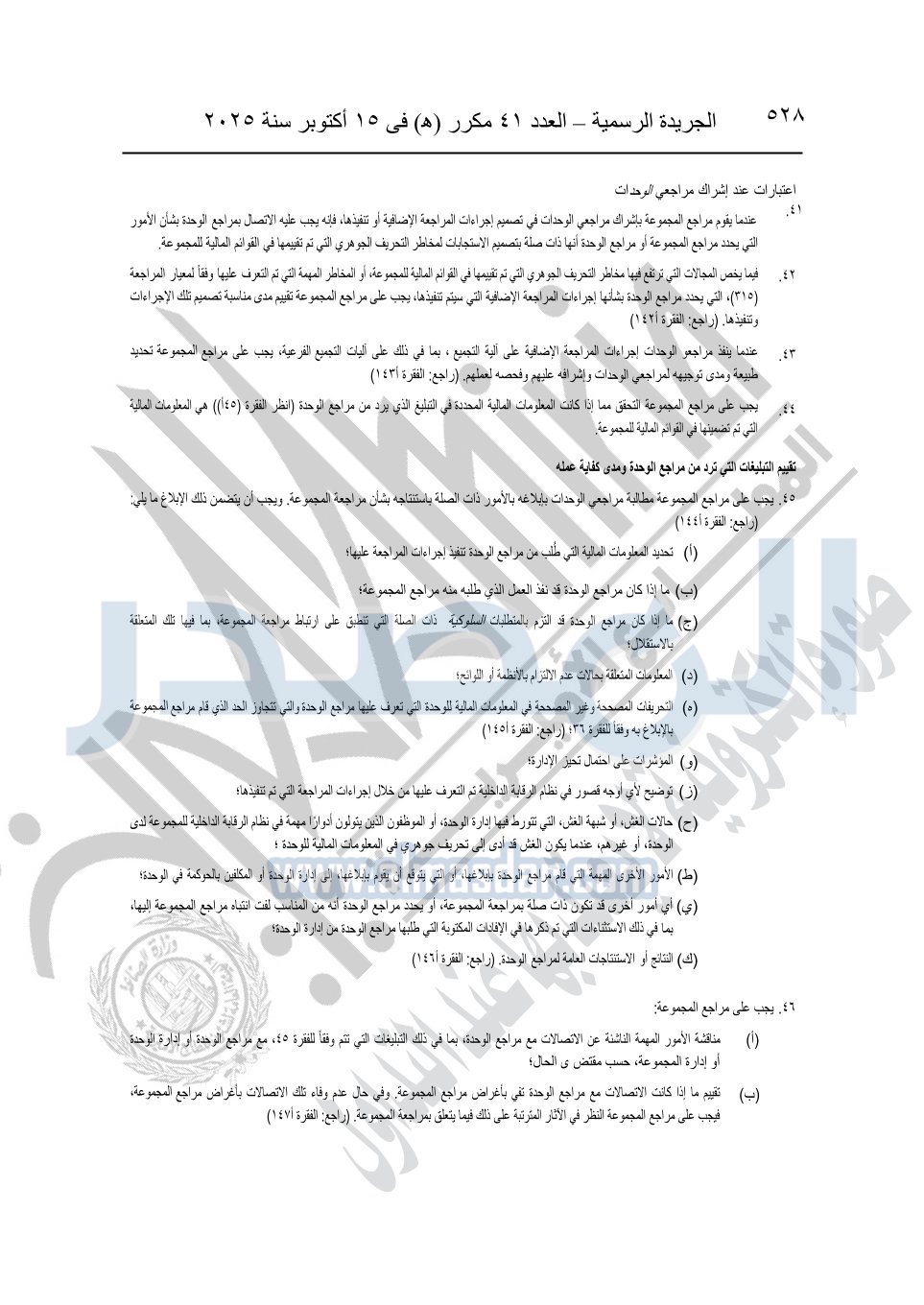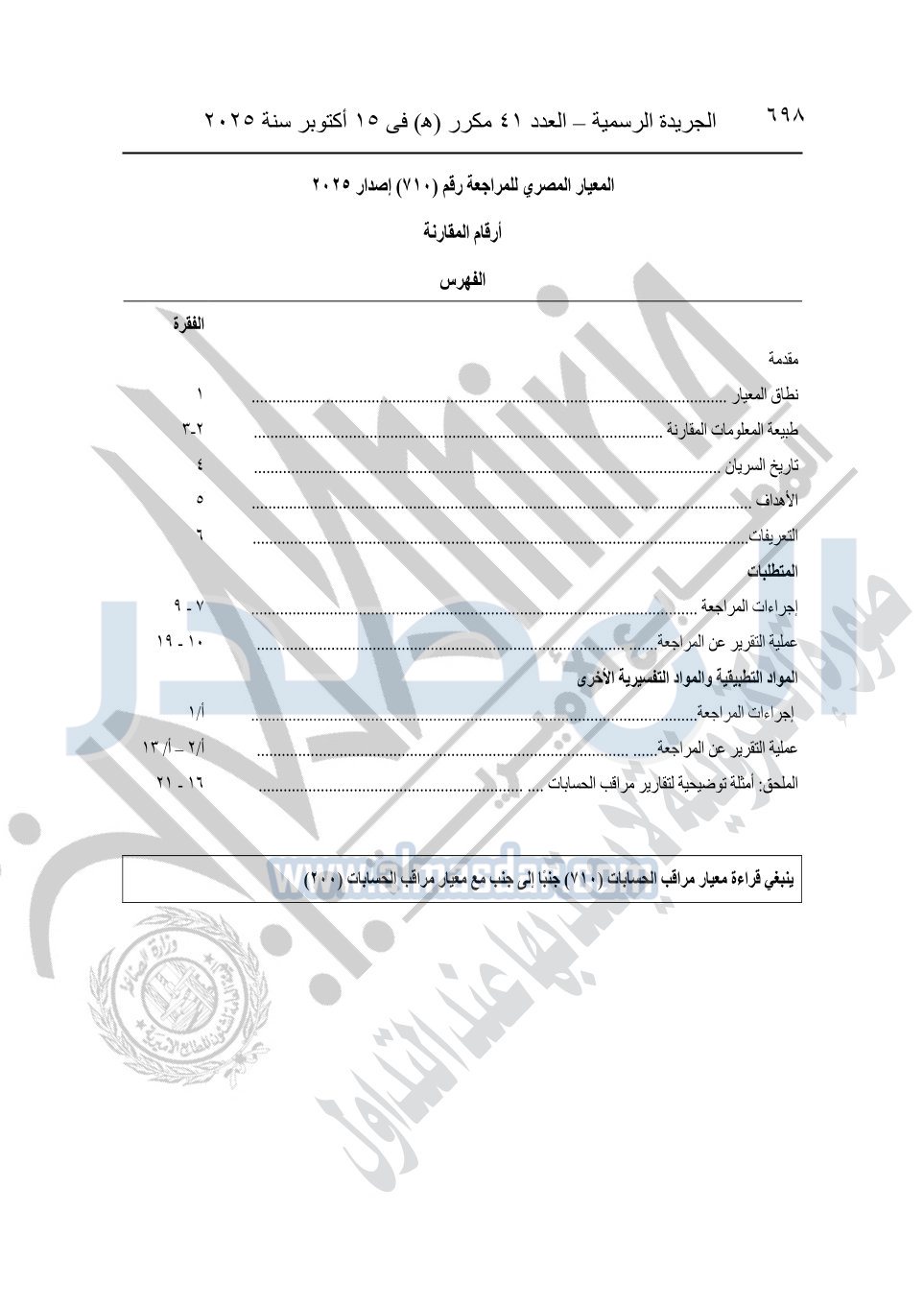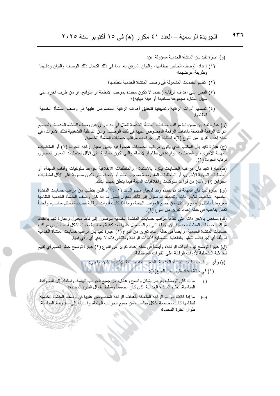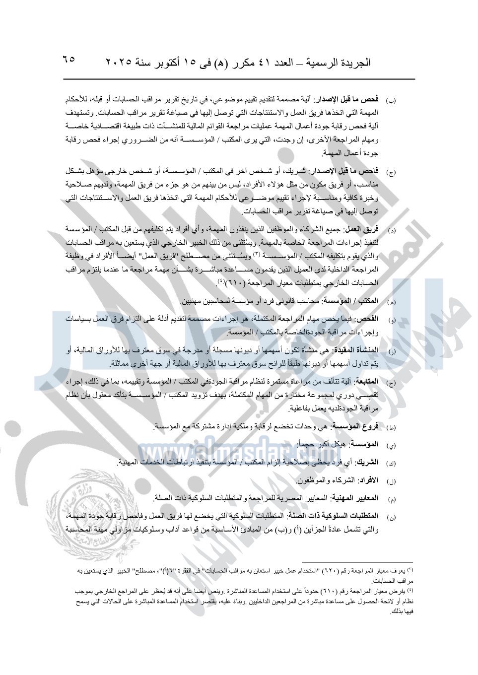 نشرت الجريدة الرسمية في العدد 41 مكرر "هـ" الصادر في 15 أكتوبر سنة 2025، قرار رئيس مجلس الوزراء رقم 3725 لسنة 2025، بشأن العمل بالمعايير المصرية للمراجعة والفحص المحدود ومهام التأكد الأخرى المرافقة لهذا القرار.