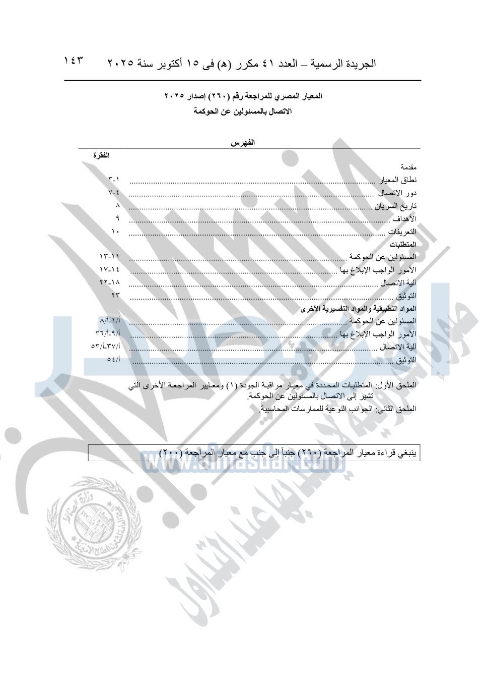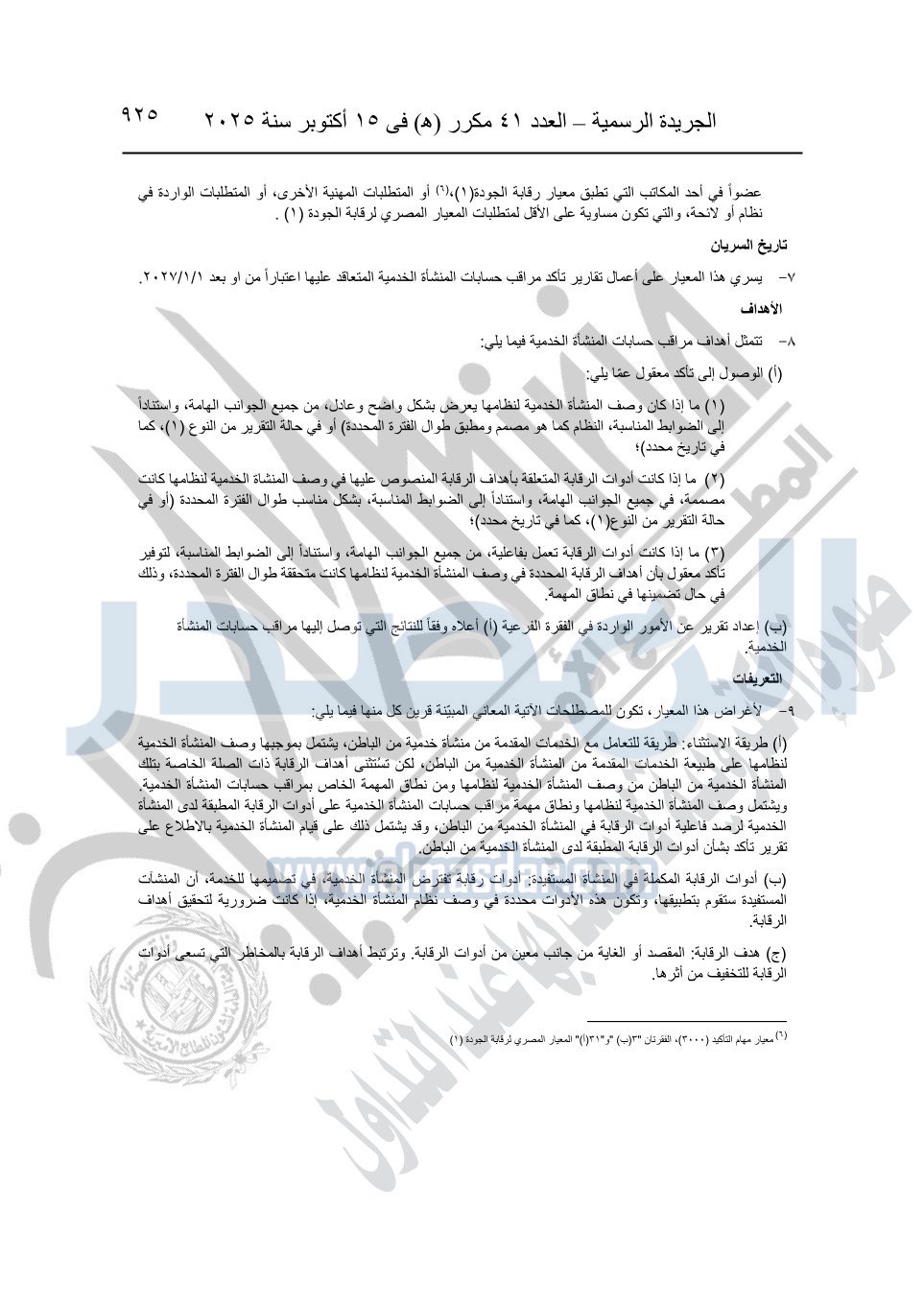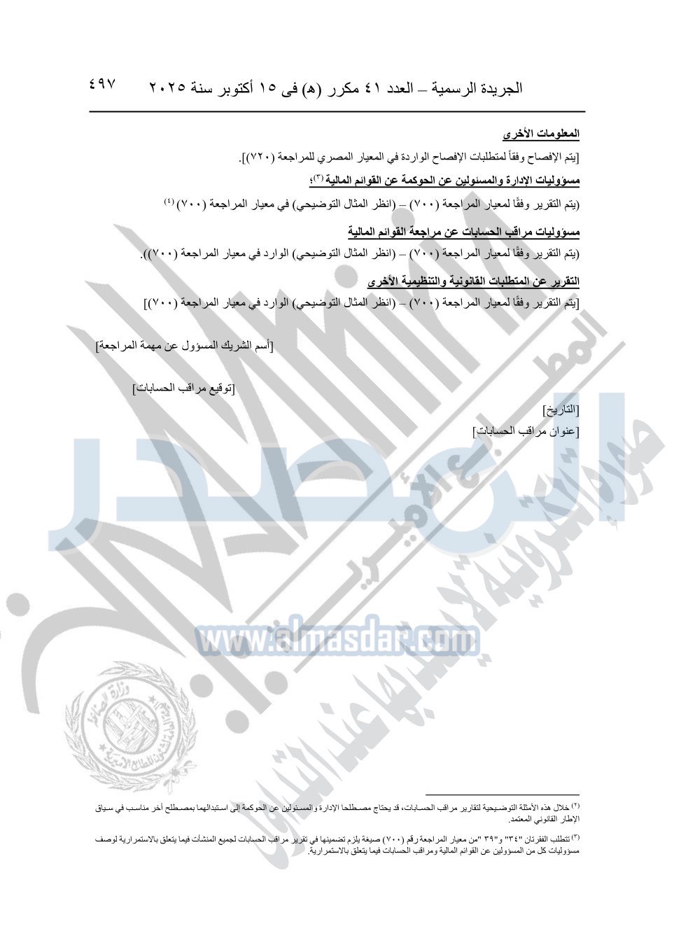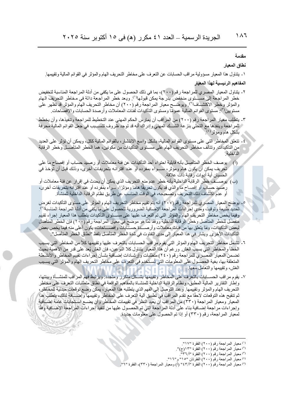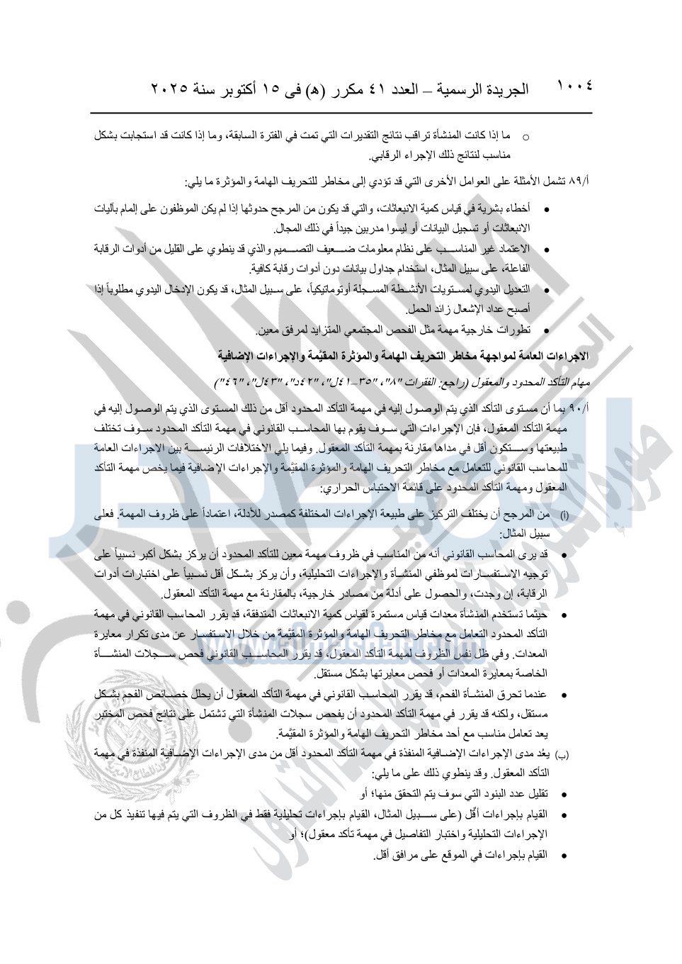 نشرت الجريدة الرسمية في العدد 41 مكرر "هـ" الصادر في 15 أكتوبر سنة 2025، قرار رئيس مجلس الوزراء رقم 3725 لسنة 2025، بشأن العمل بالمعايير المصرية للمراجعة والفحص المحدود ومهام التأكد الأخرى المرافقة لهذا القرار.