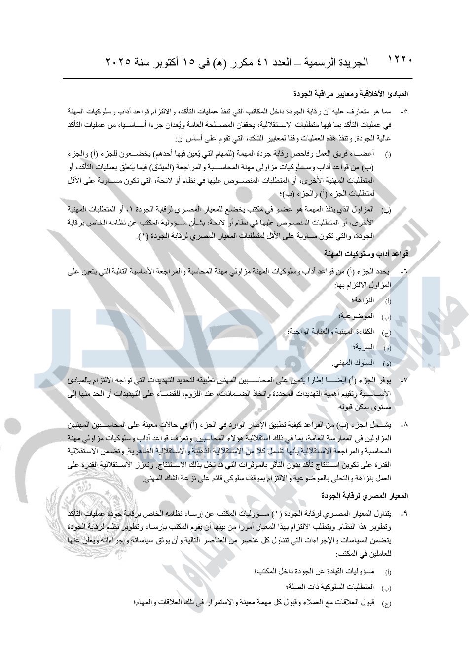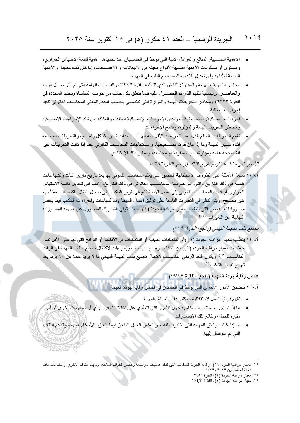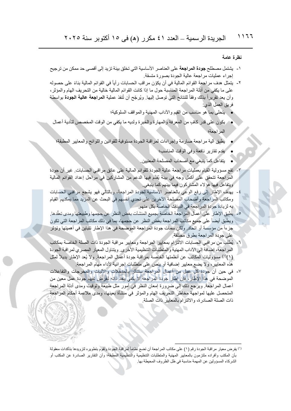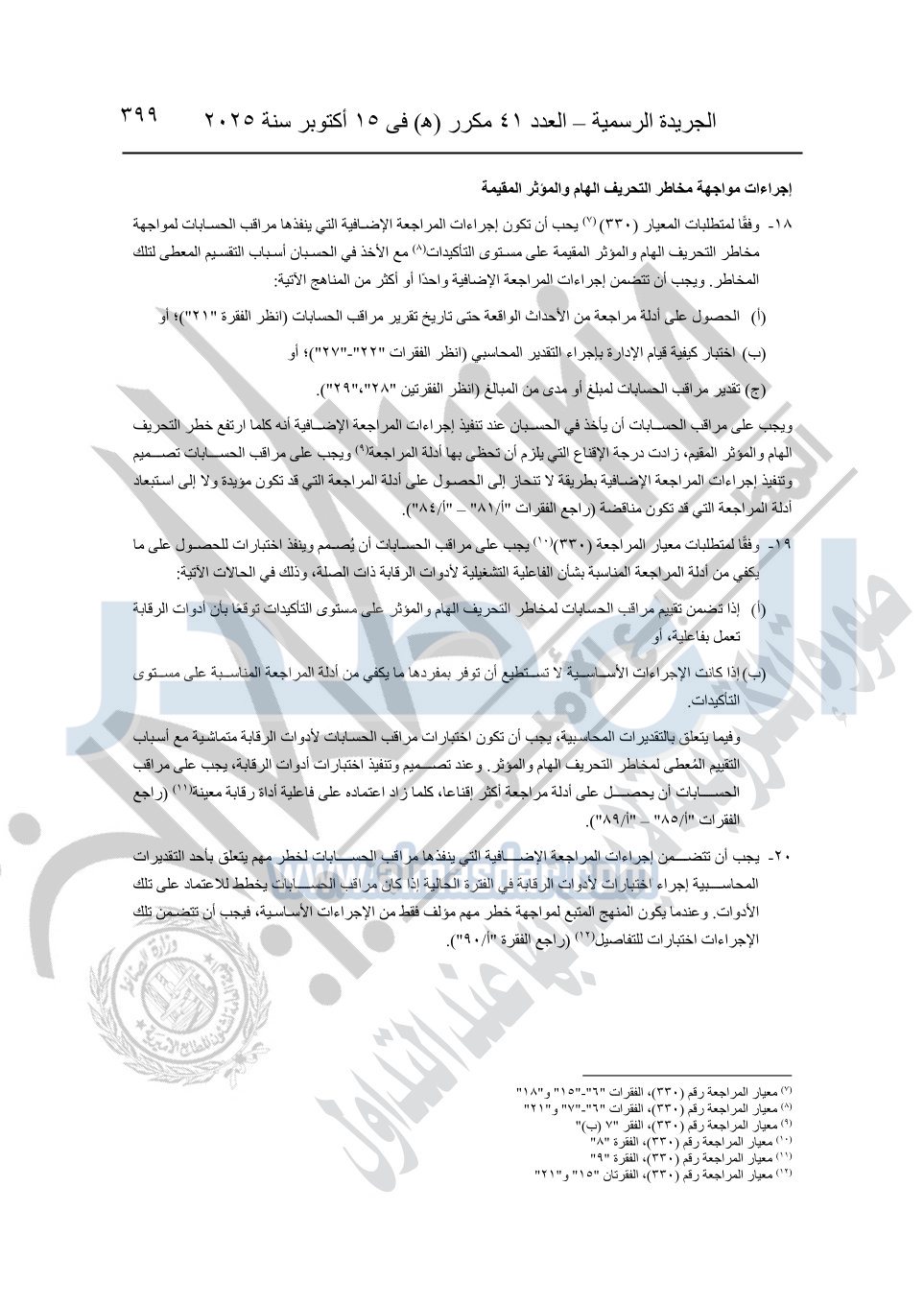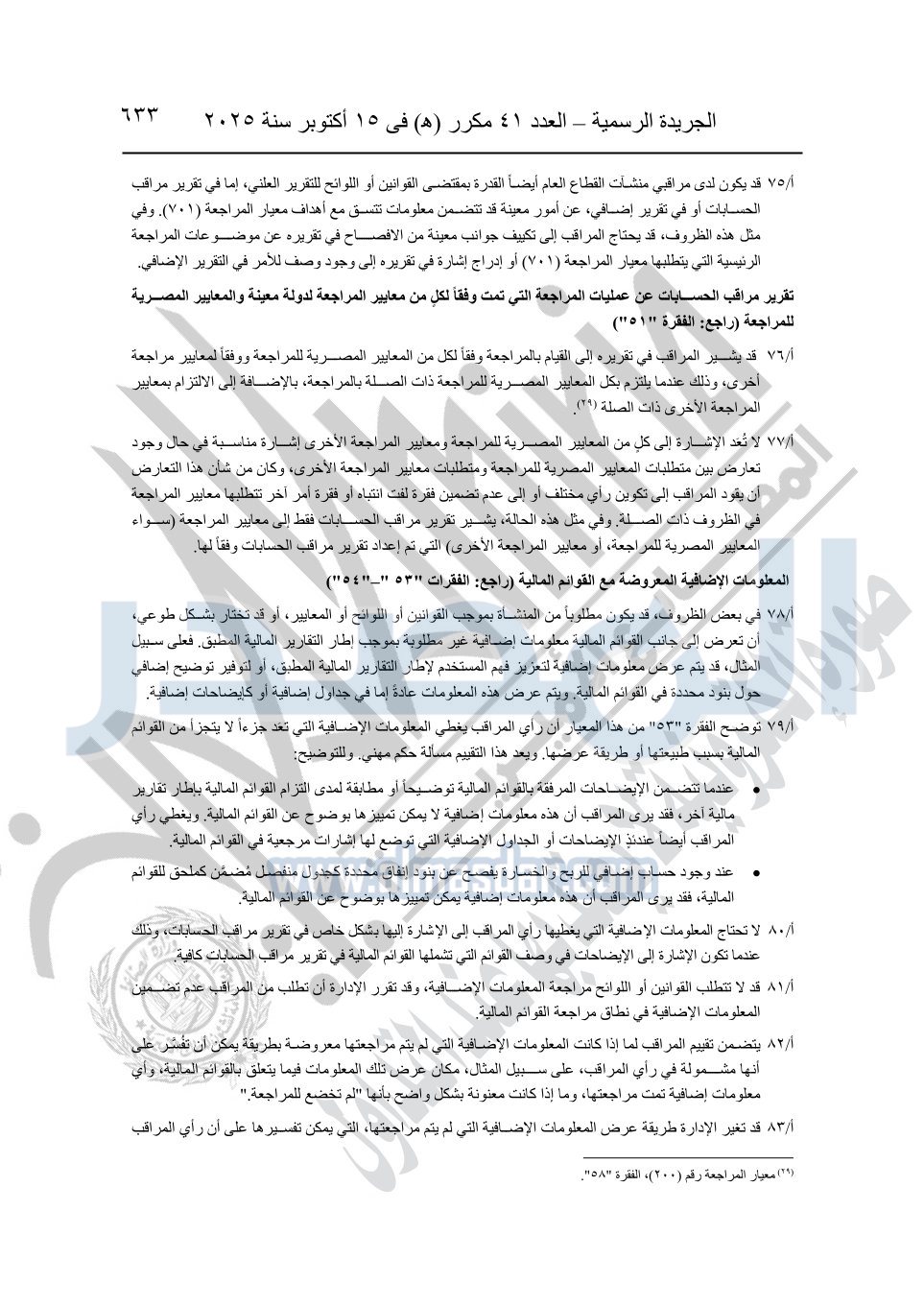 نشرت الجريدة الرسمية في العدد 41 مكرر "هـ" الصادر في 15 أكتوبر سنة 2025، قرار رئيس مجلس الوزراء رقم 3725 لسنة 2025، بشأن العمل بالمعايير المصرية للمراجعة والفحص المحدود ومهام التأكد الأخرى المرافقة لهذا القرار.
