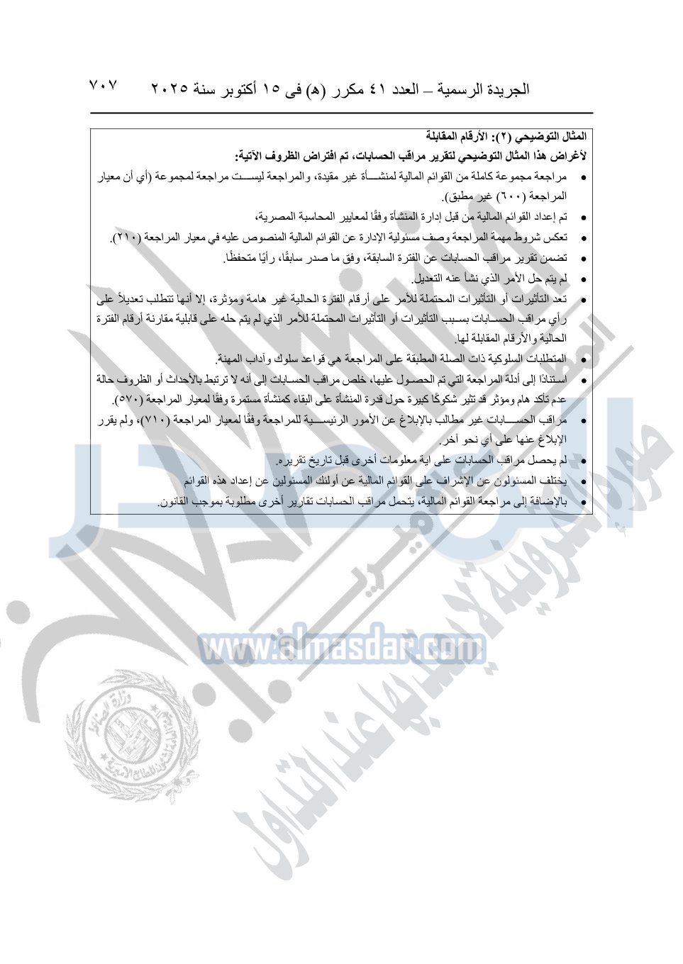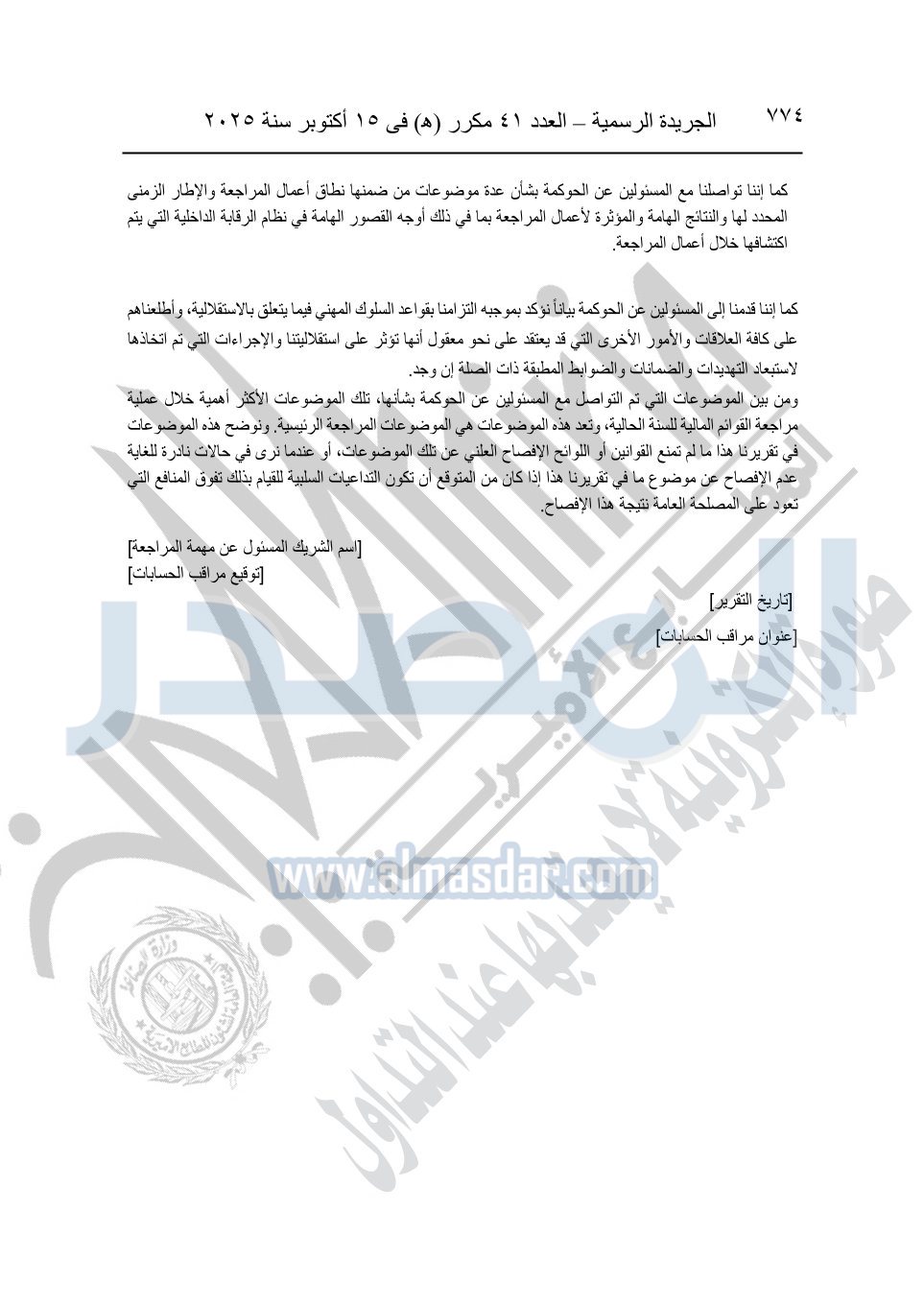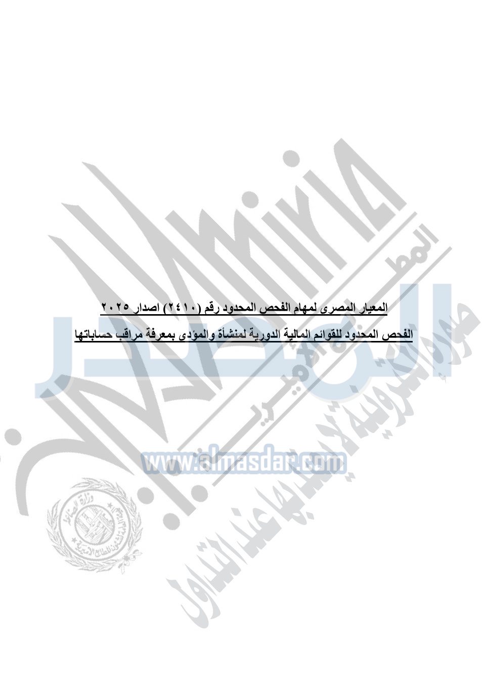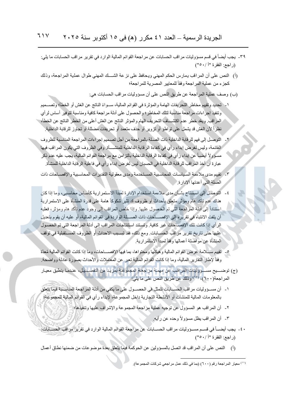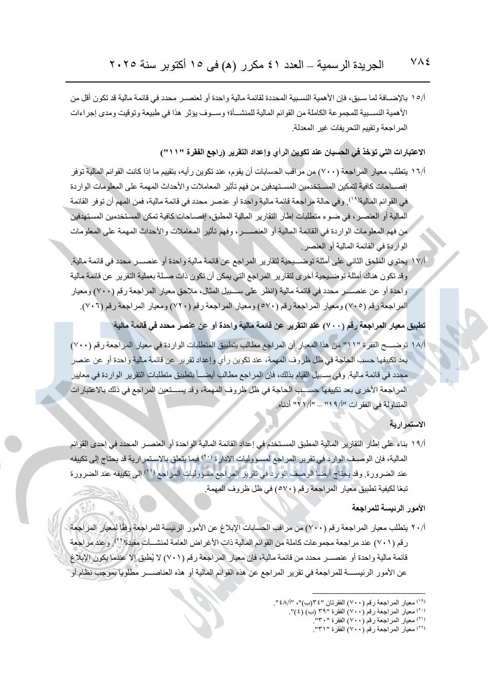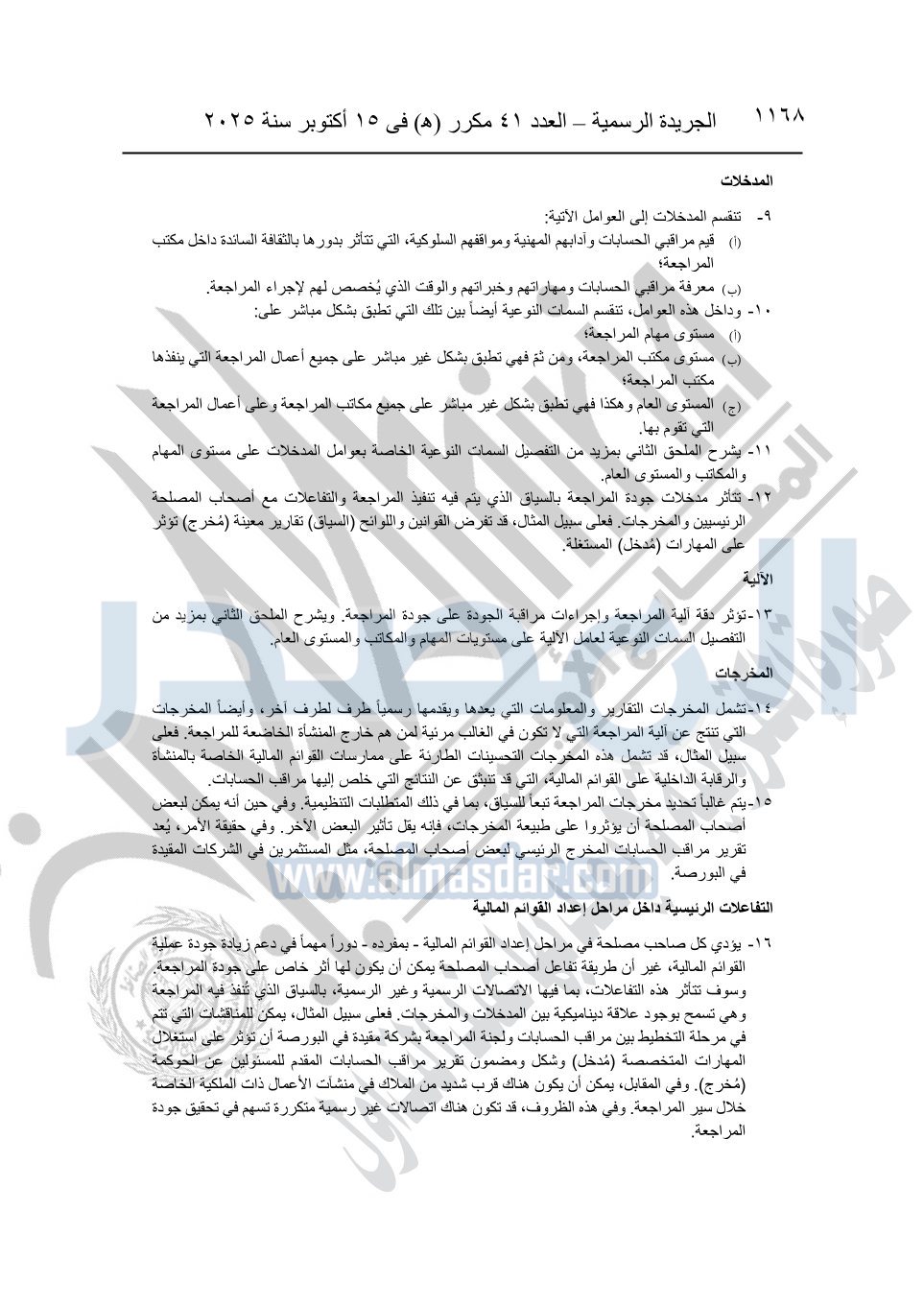نشرت الجريدة الرسمية في العدد 41 مكرر "هـ" الصادر في 15 أكتوبر سنة 2025، قرار رئيس مجلس الوزراء رقم 3725 لسنة 2025، بشأن العمل بالمعايير المصرية للمراجعة والفحص المحدود ومهام التأكد الأخرى المرافقة لهذا القرار.