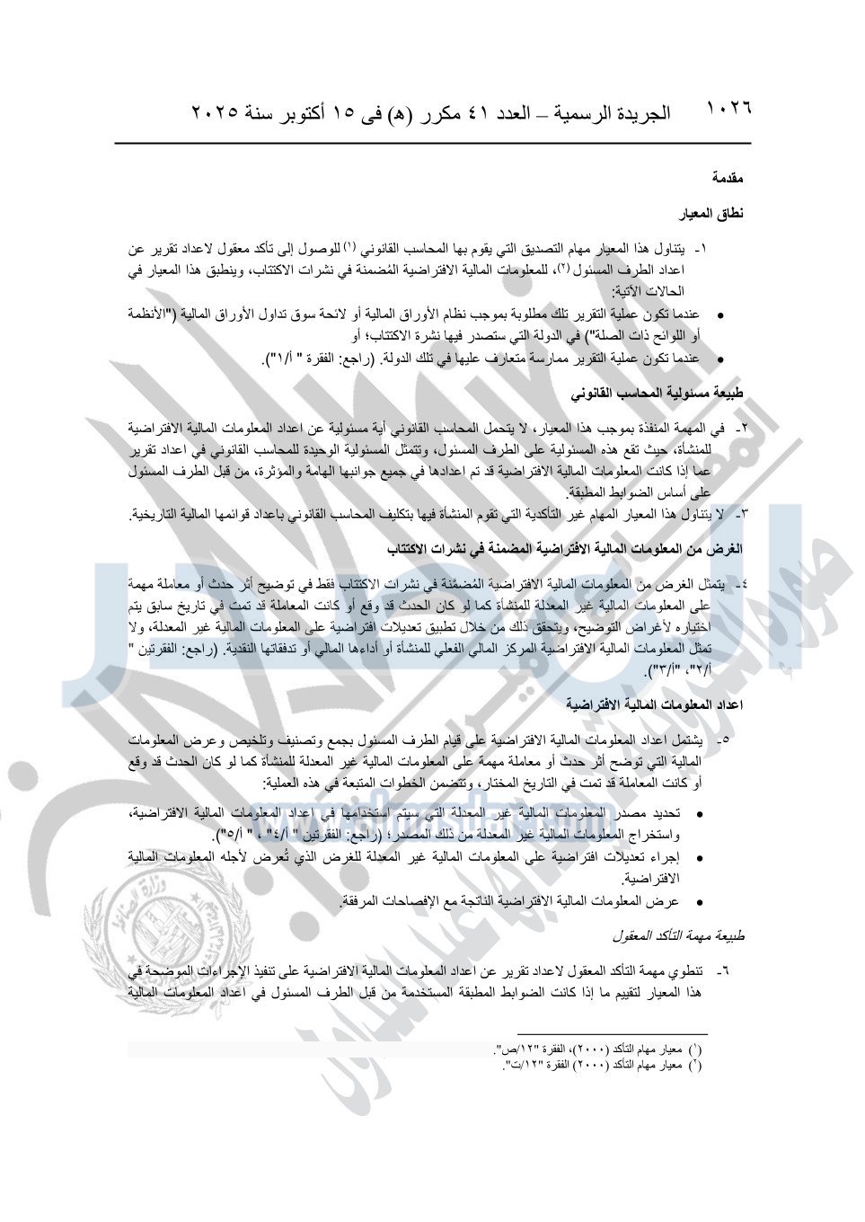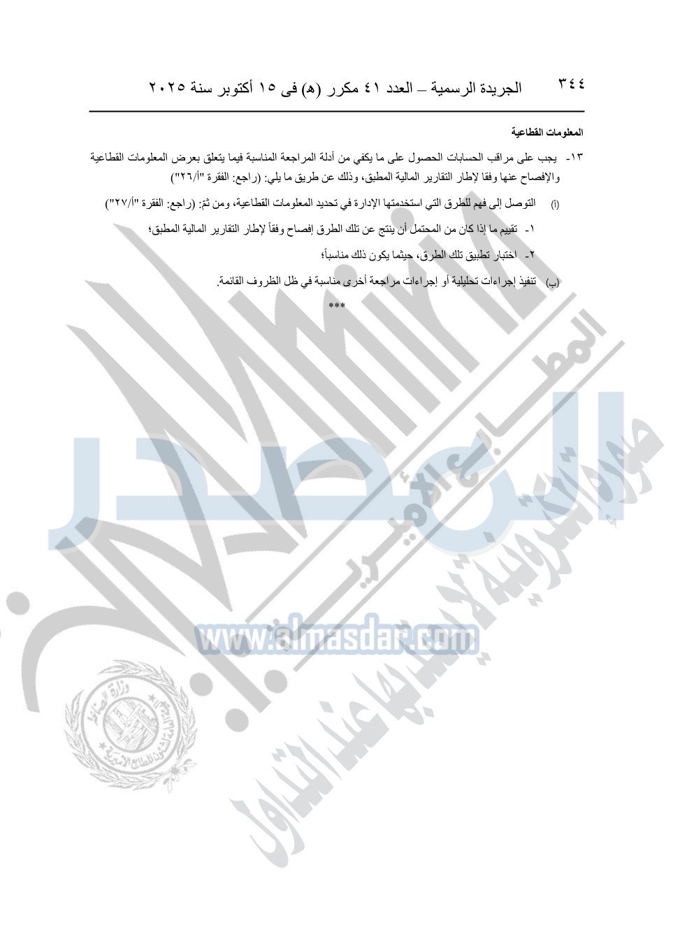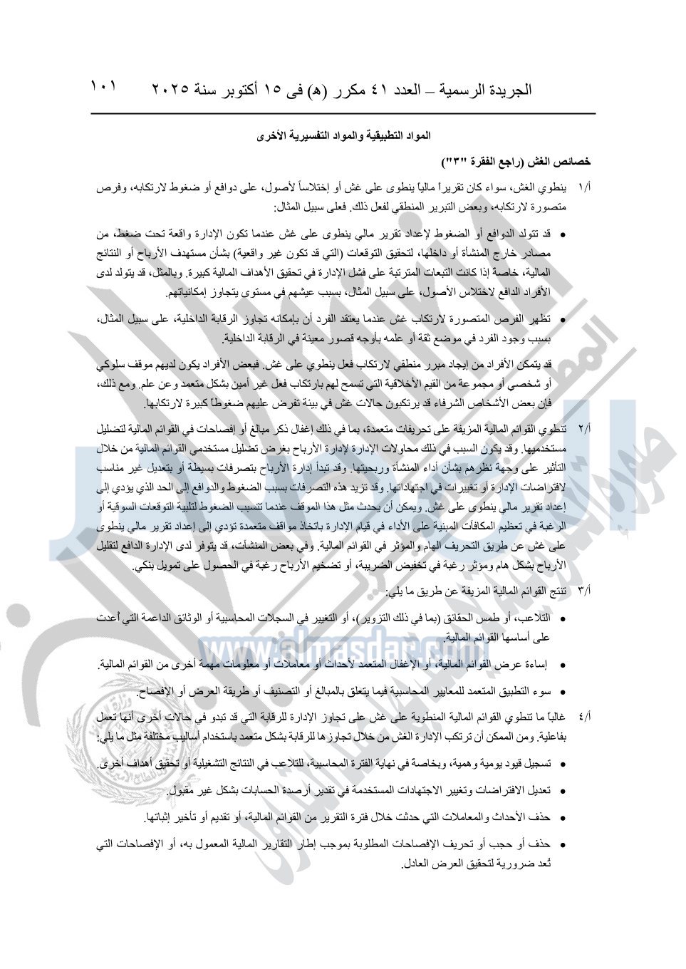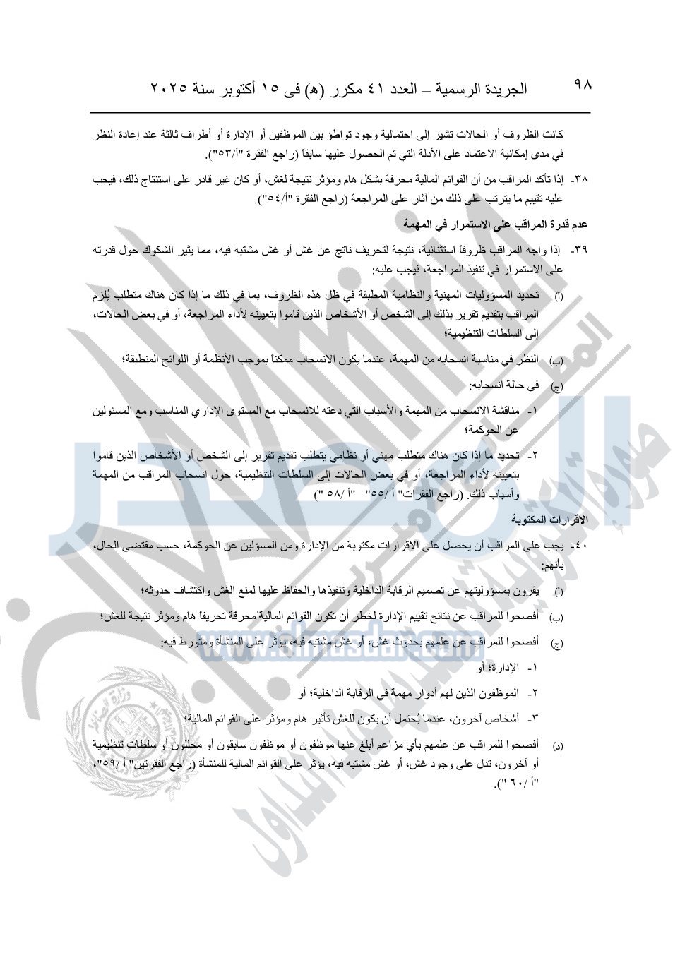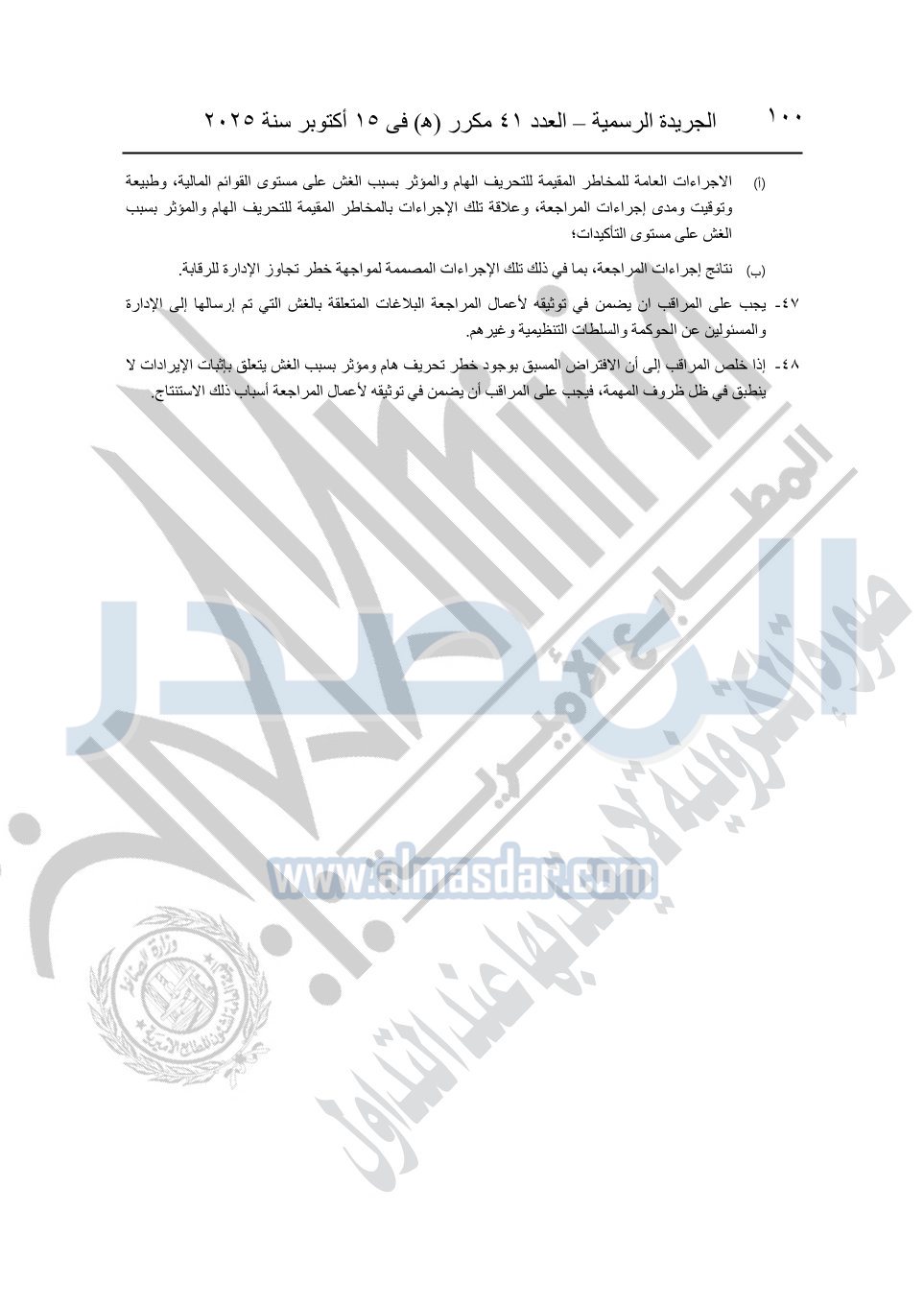 نشرت الجريدة الرسمية في العدد 41 مكرر "هـ" الصادر في 15 أكتوبر سنة 2025، قرار رئيس مجلس الوزراء رقم 3725 لسنة 2025، بشأن العمل بالمعايير المصرية للمراجعة والفحص المحدود ومهام التأكد الأخرى المرافقة لهذا القرار.