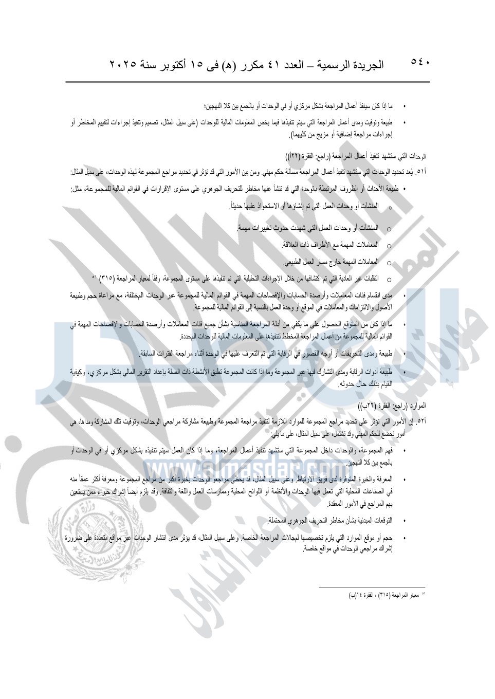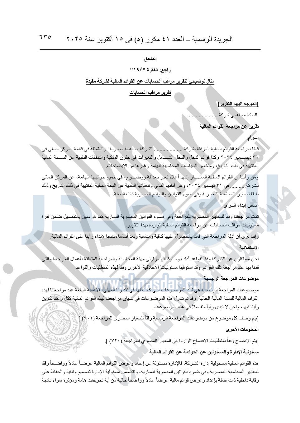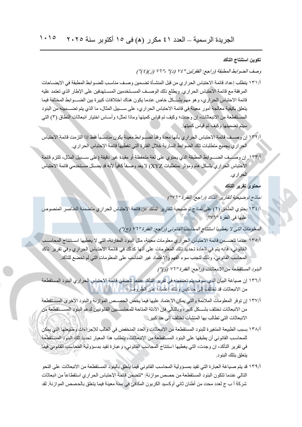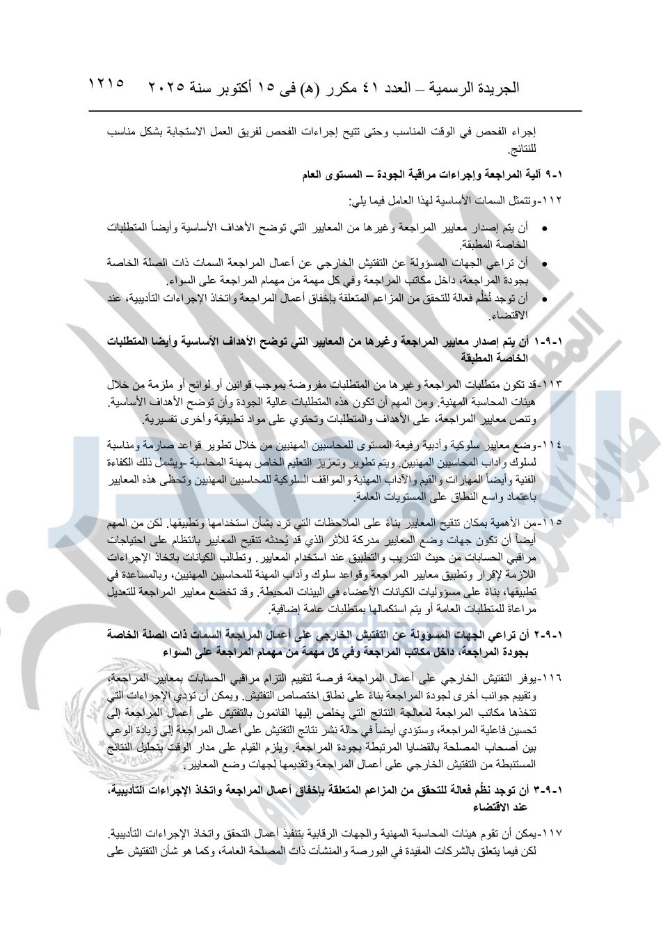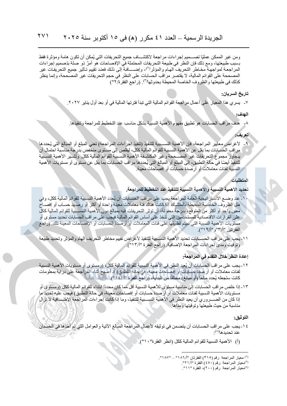نشرت الجريدة الرسمية في العدد 41 مكرر "هـ" الصادر في 15 أكتوبر سنة 2025، قرار رئيس مجلس الوزراء رقم 3725 لسنة 2025، بشأن العمل بالمعايير المصرية للمراجعة والفحص المحدود ومهام التأكد الأخرى المرافقة لهذا القرار.