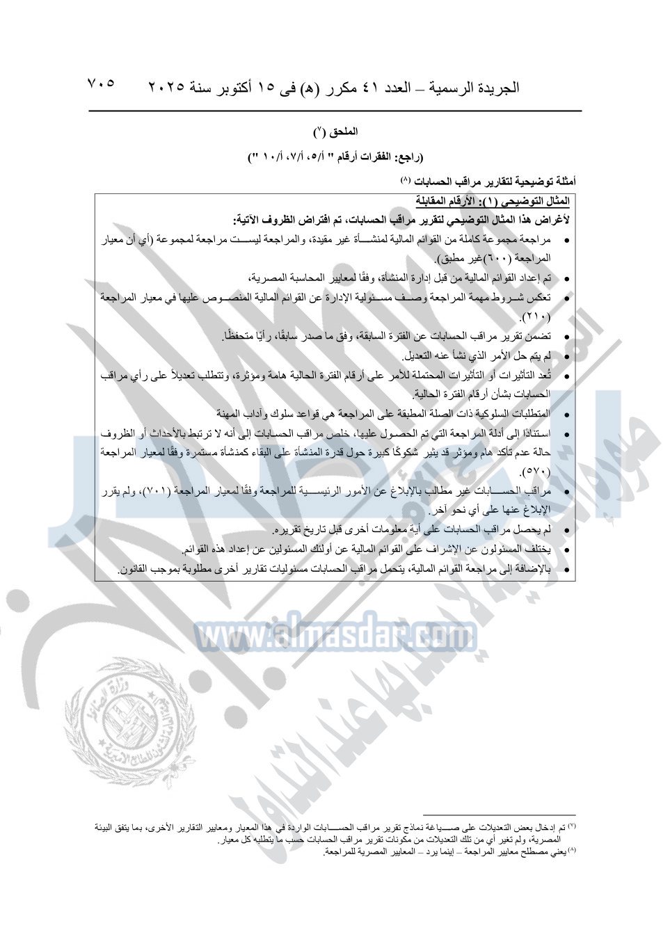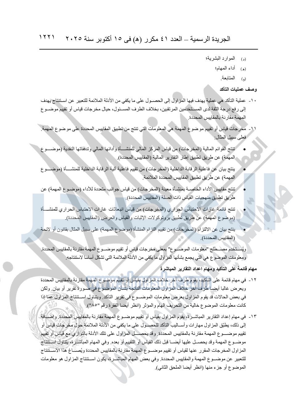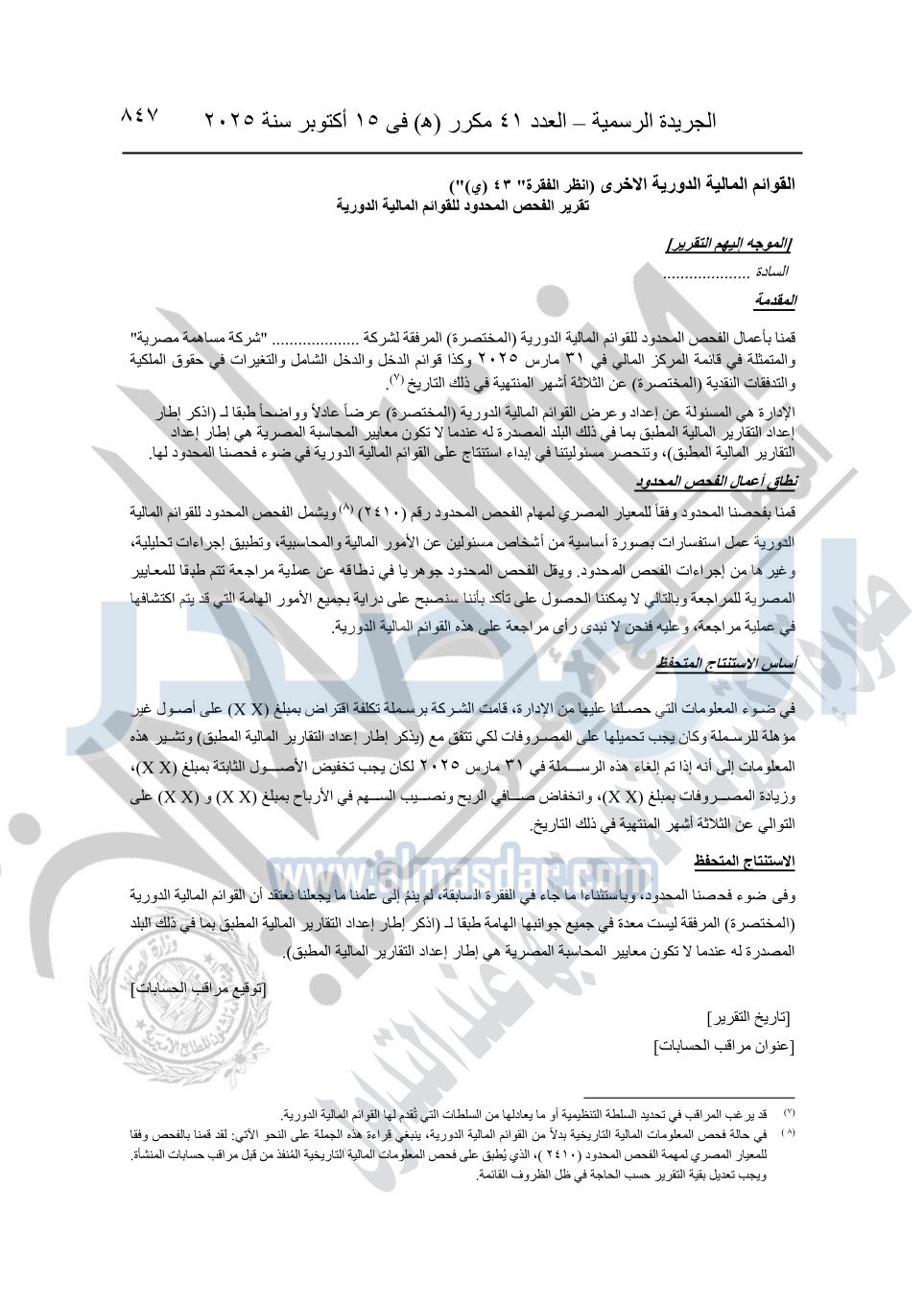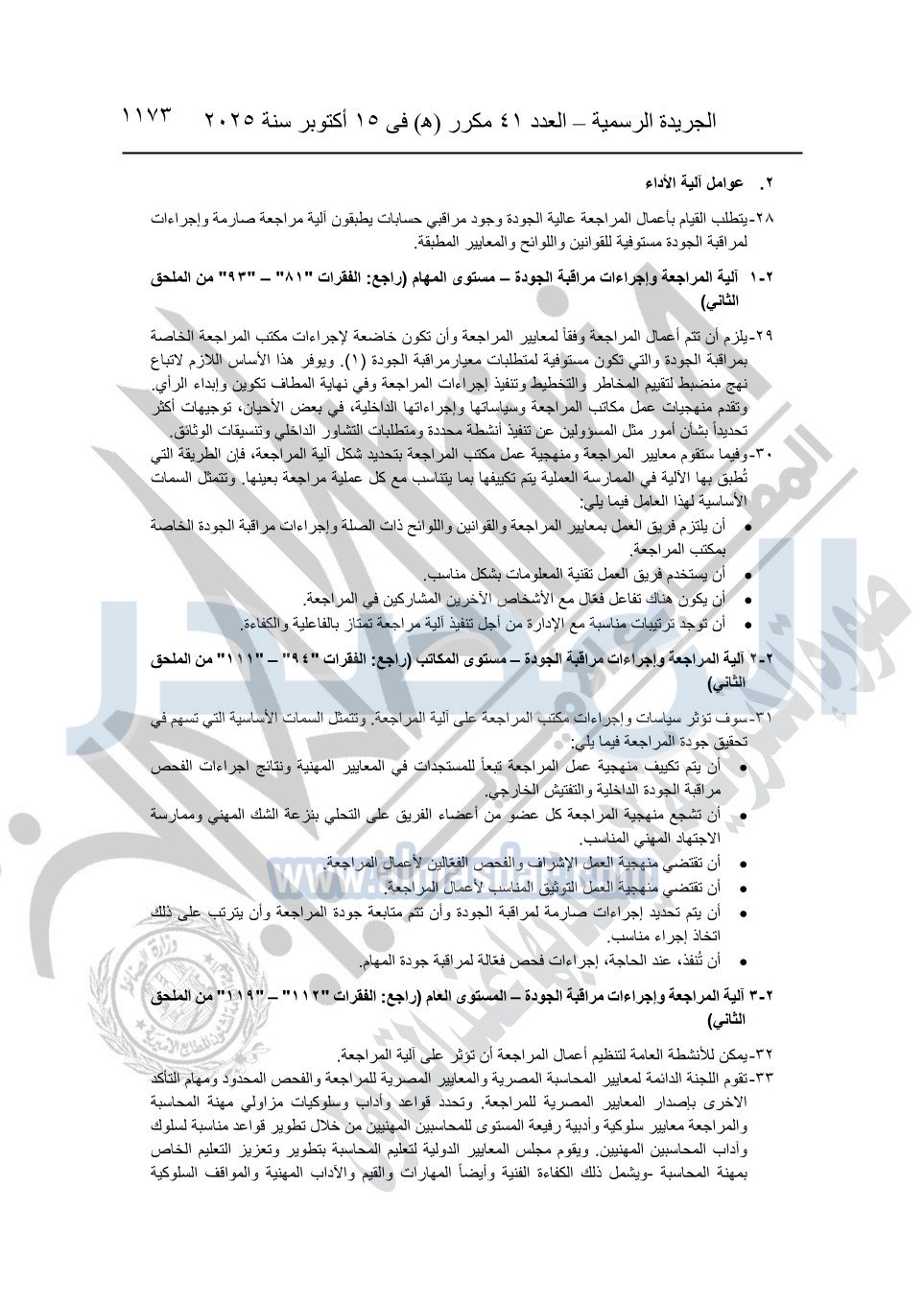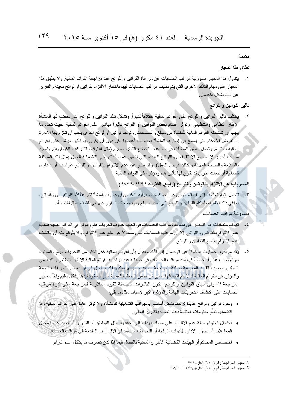 نشرت الجريدة الرسمية في العدد 41 مكرر "هـ" الصادر في 15 أكتوبر سنة 2025، قرار رئيس مجلس الوزراء رقم 3725 لسنة 2025، بشأن العمل بالمعايير المصرية للمراجعة والفحص المحدود ومهام التأكد الأخرى المرافقة لهذا القرار.