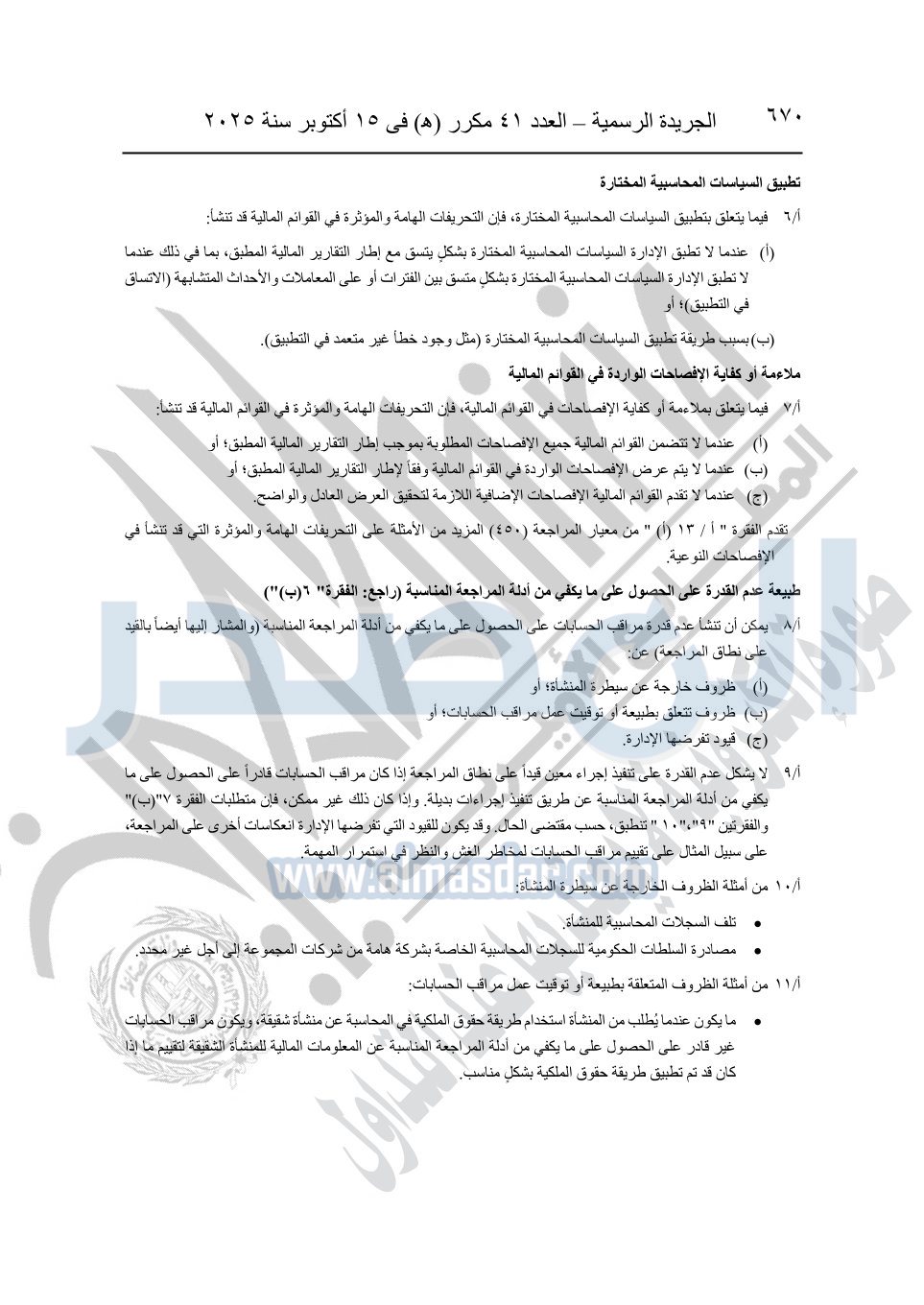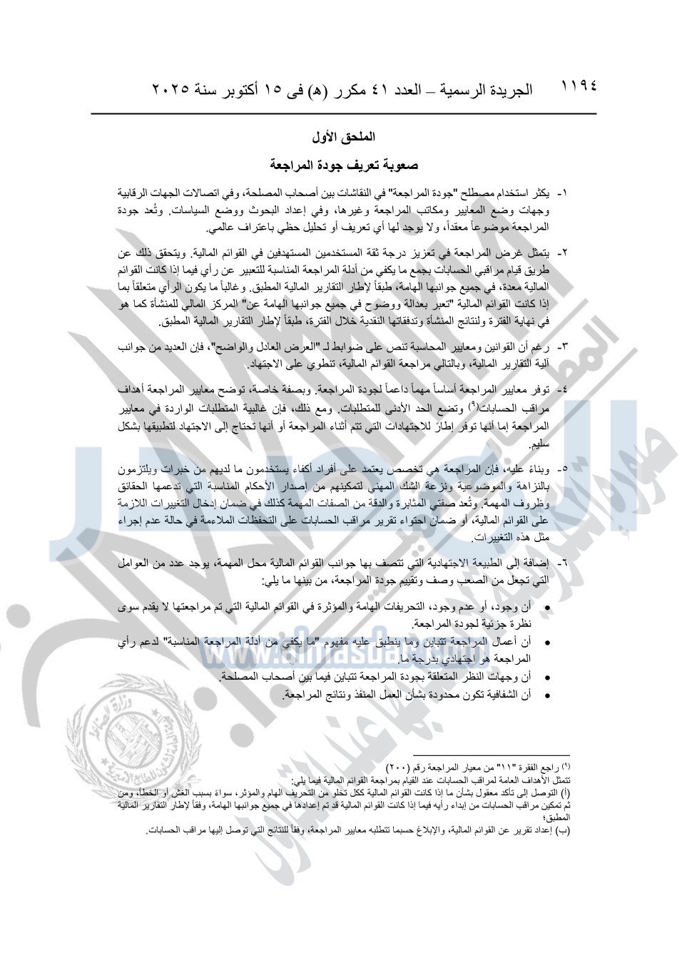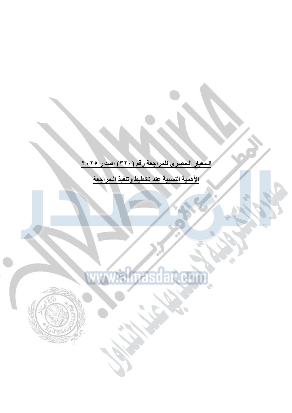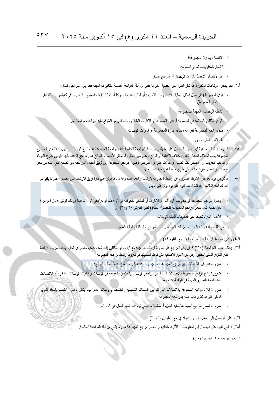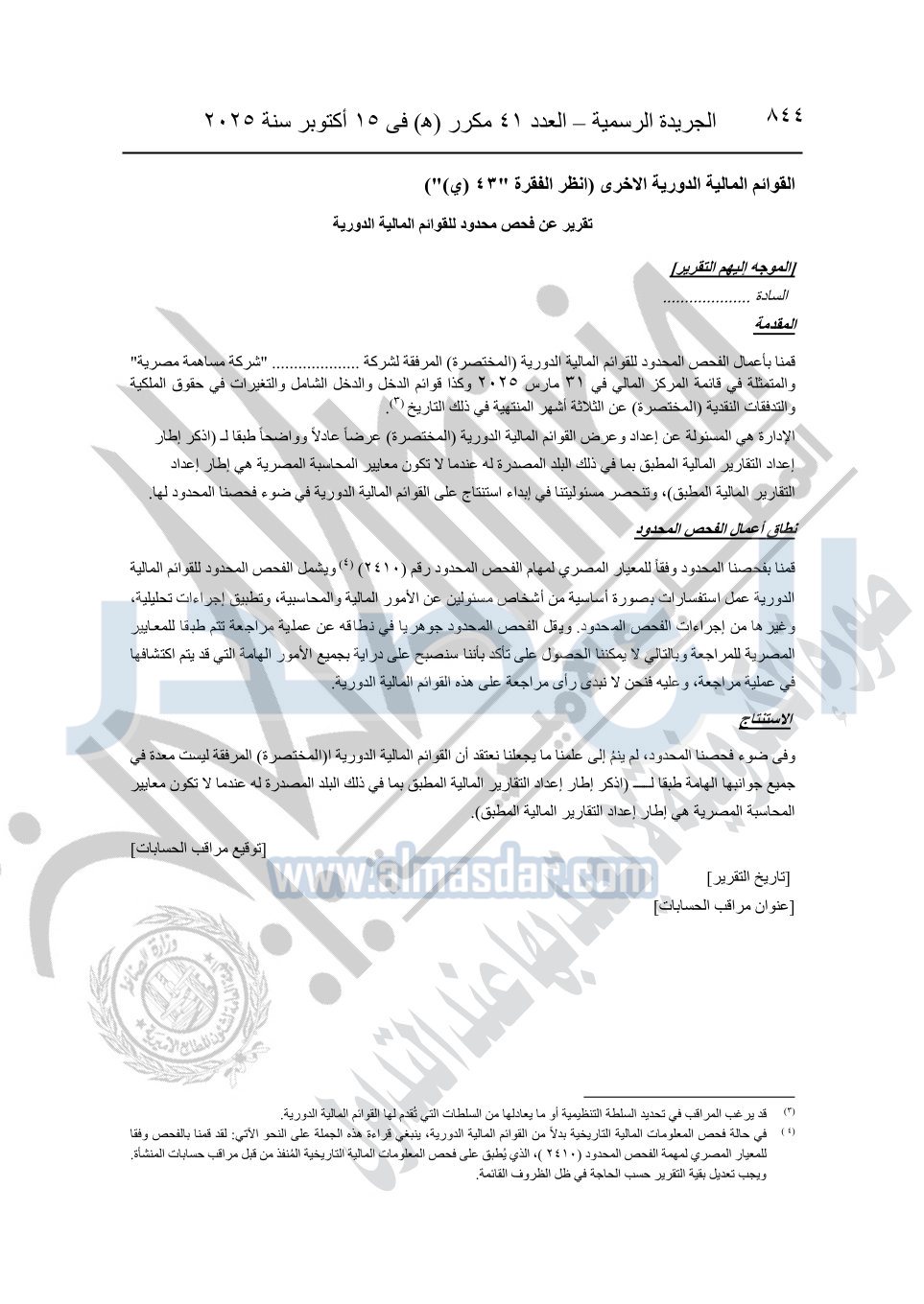 نشرت الجريدة الرسمية في العدد 41 مكرر "هـ" الصادر في 15 أكتوبر سنة 2025، قرار رئيس مجلس الوزراء رقم 3725 لسنة 2025، بشأن العمل بالمعايير المصرية للمراجعة والفحص المحدود ومهام التأكد الأخرى المرافقة لهذا القرار.