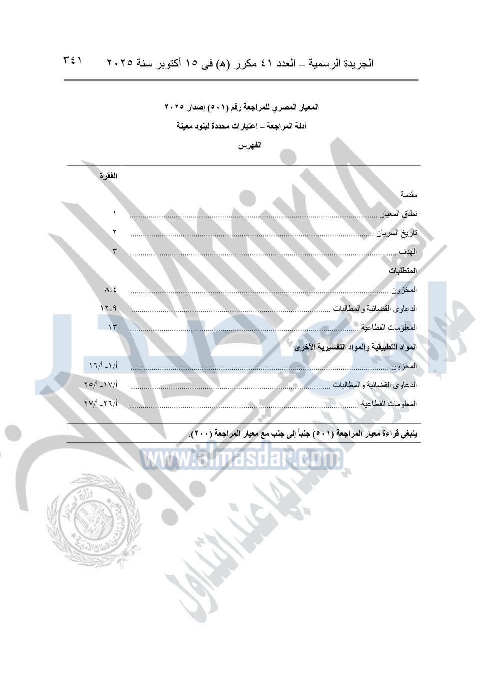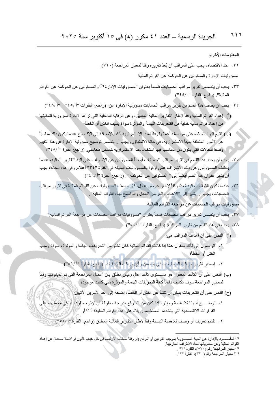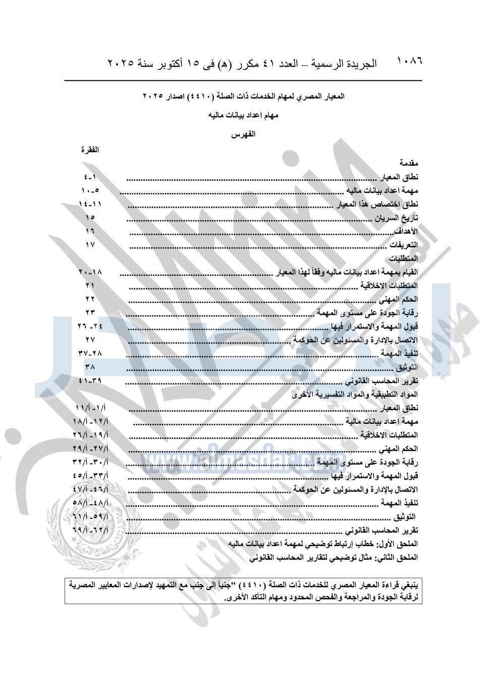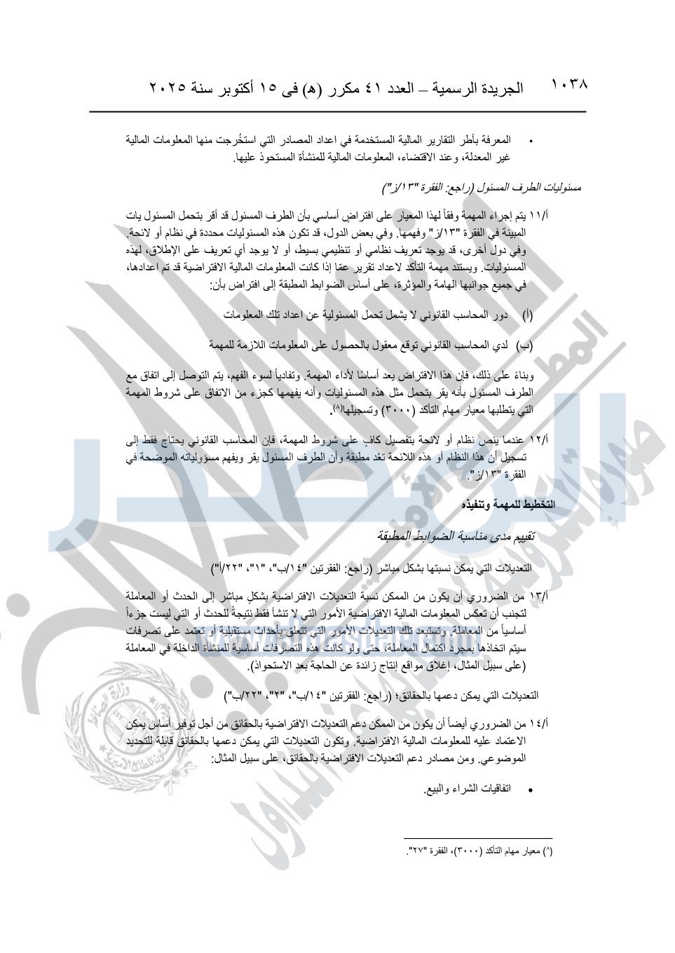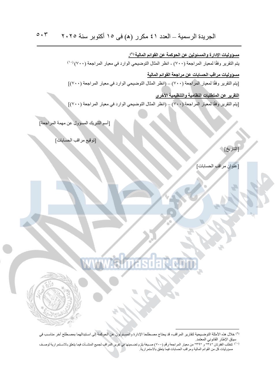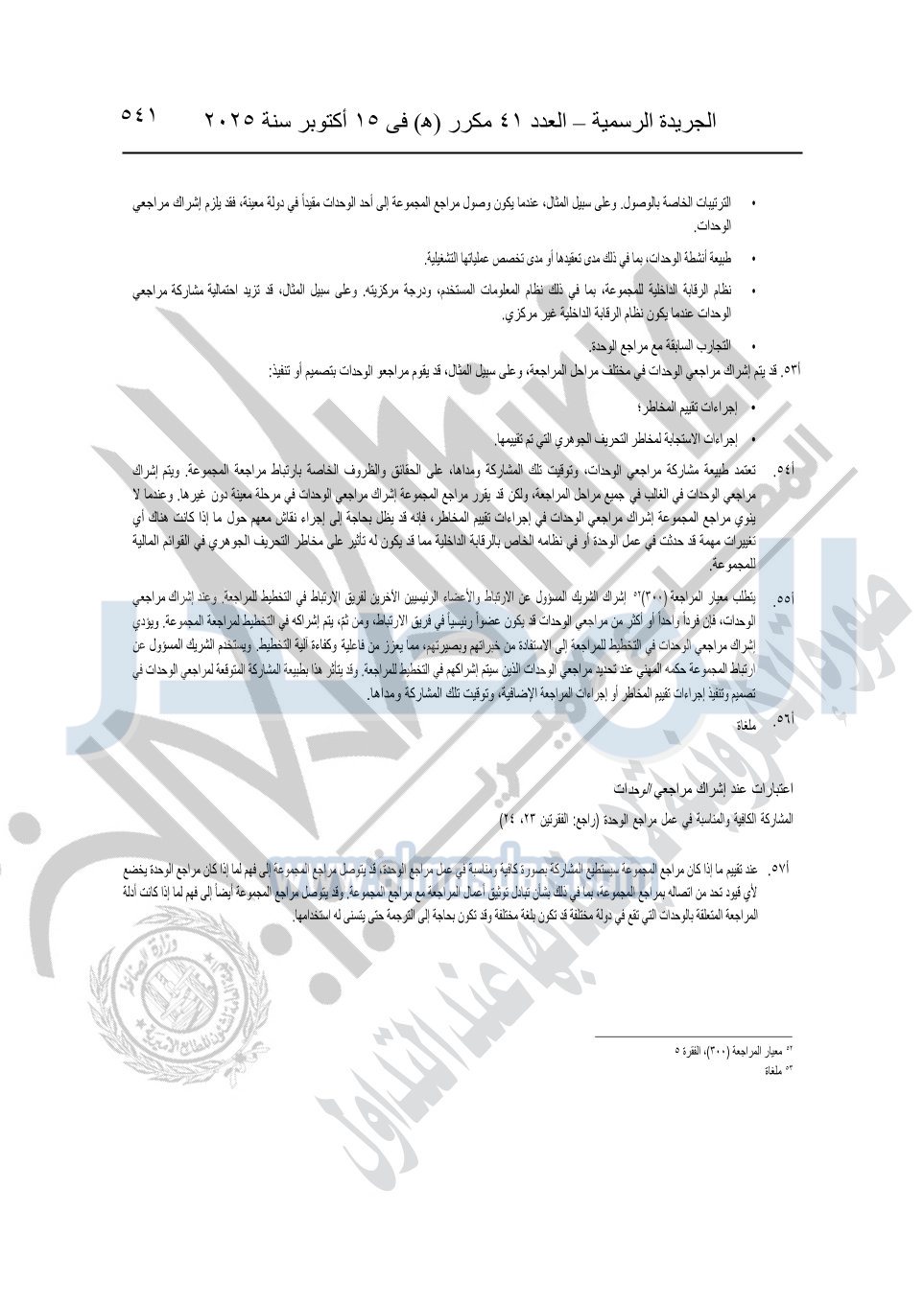 نشرت الجريدة الرسمية في العدد 41 مكرر "هـ" الصادر في 15 أكتوبر سنة 2025، قرار رئيس مجلس الوزراء رقم 3725 لسنة 2025، بشأن العمل بالمعايير المصرية للمراجعة والفحص المحدود ومهام التأكد الأخرى المرافقة لهذا القرار.