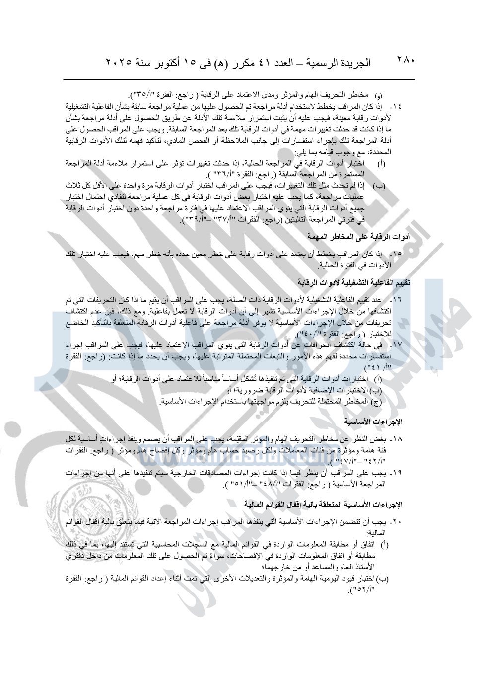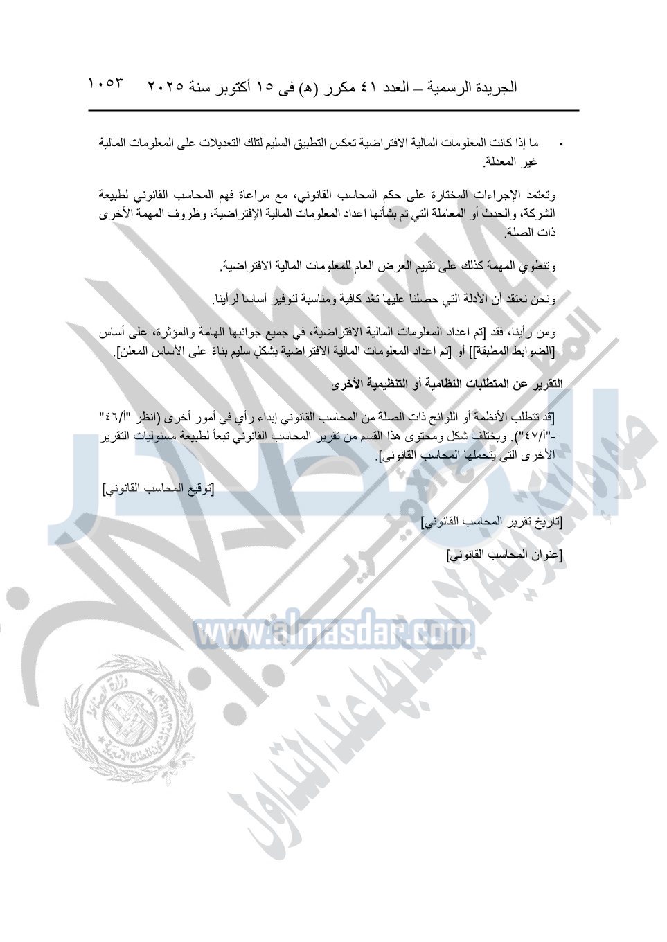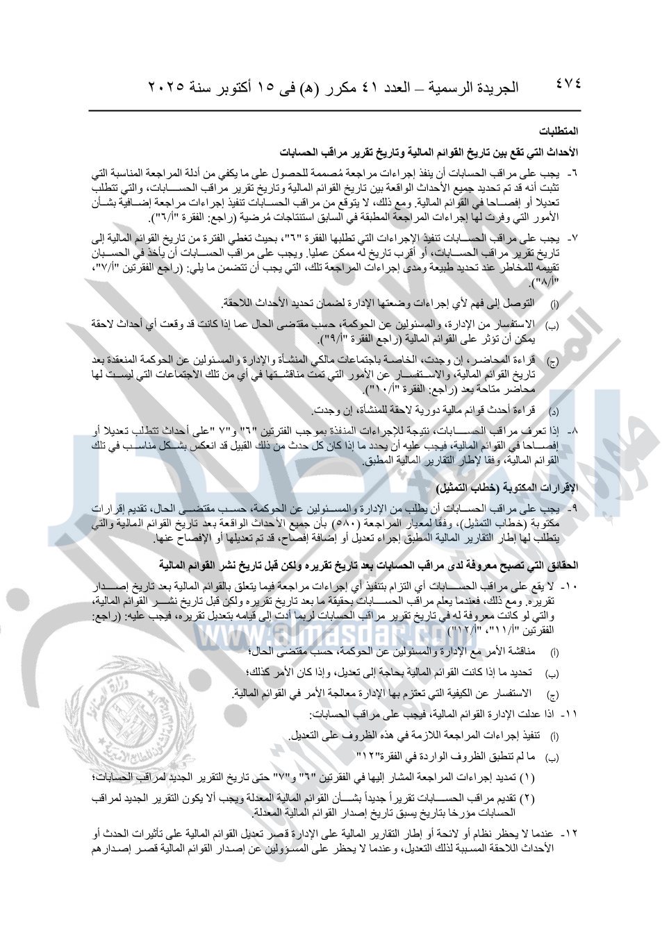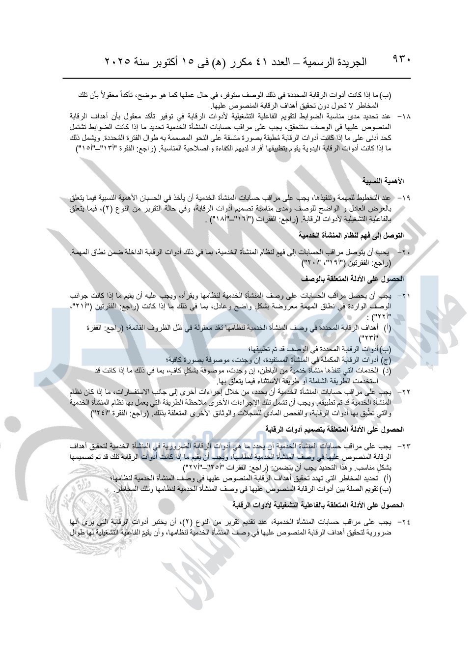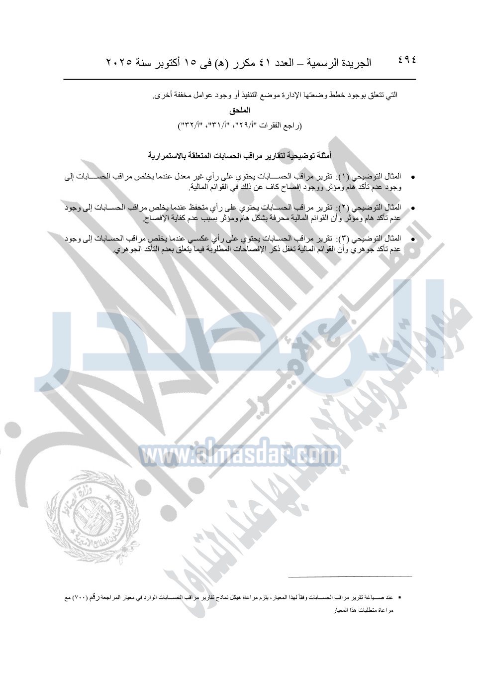 نشرت الجريدة الرسمية في العدد 41 مكرر "هـ" الصادر في 15 أكتوبر سنة 2025، قرار رئيس مجلس الوزراء رقم 3725 لسنة 2025، بشأن العمل بالمعايير المصرية للمراجعة والفحص المحدود ومهام التأكد الأخرى المرافقة لهذا القرار.
