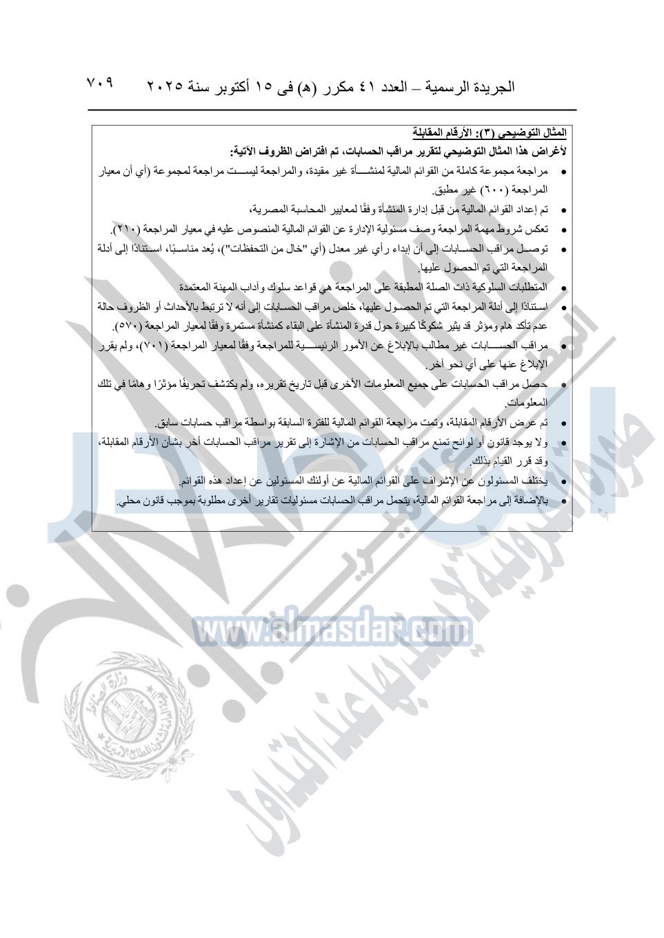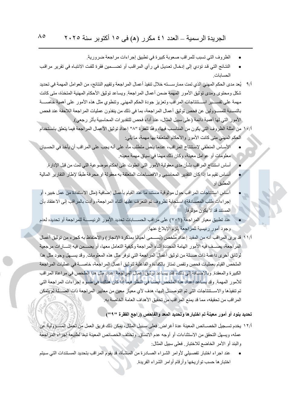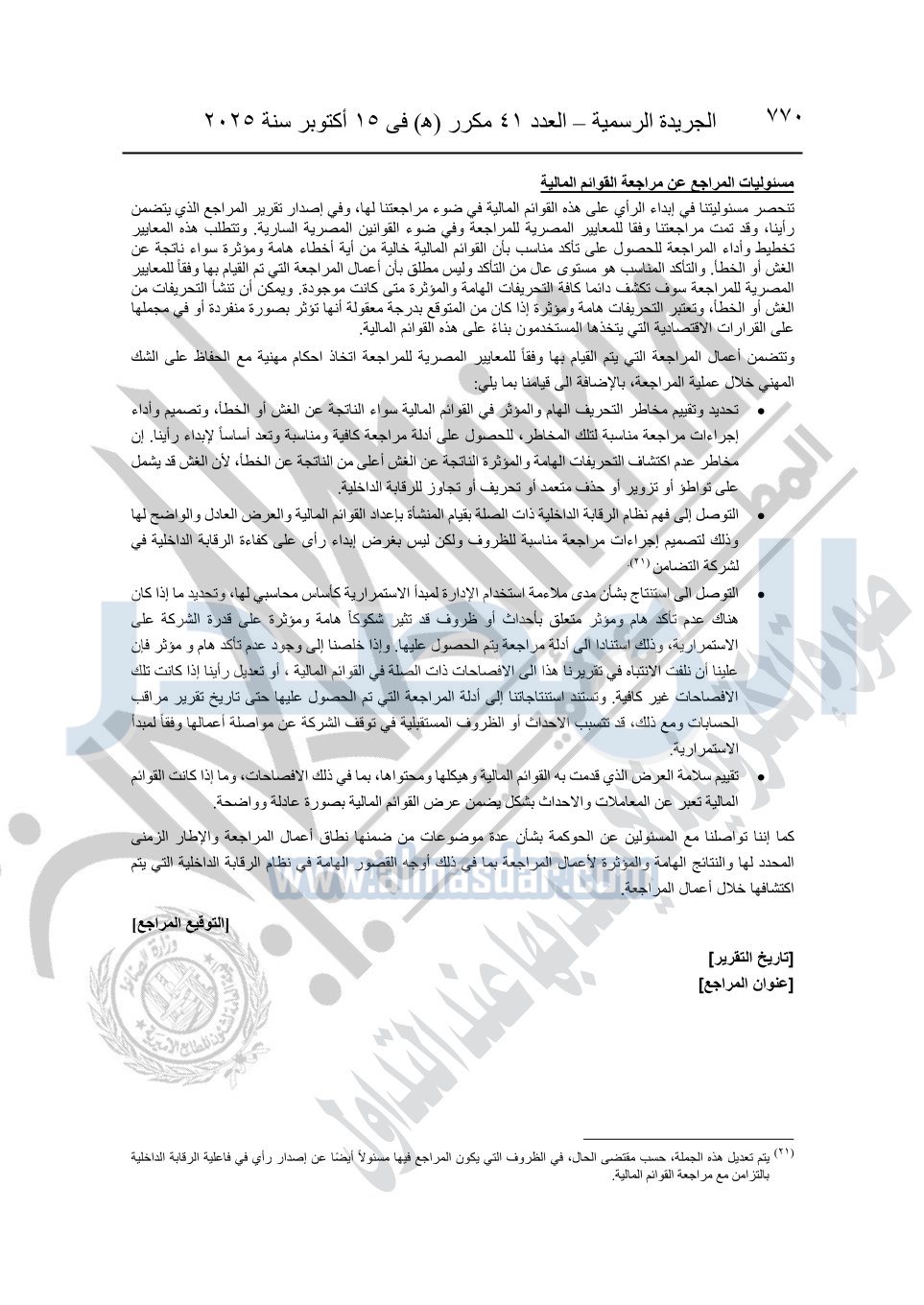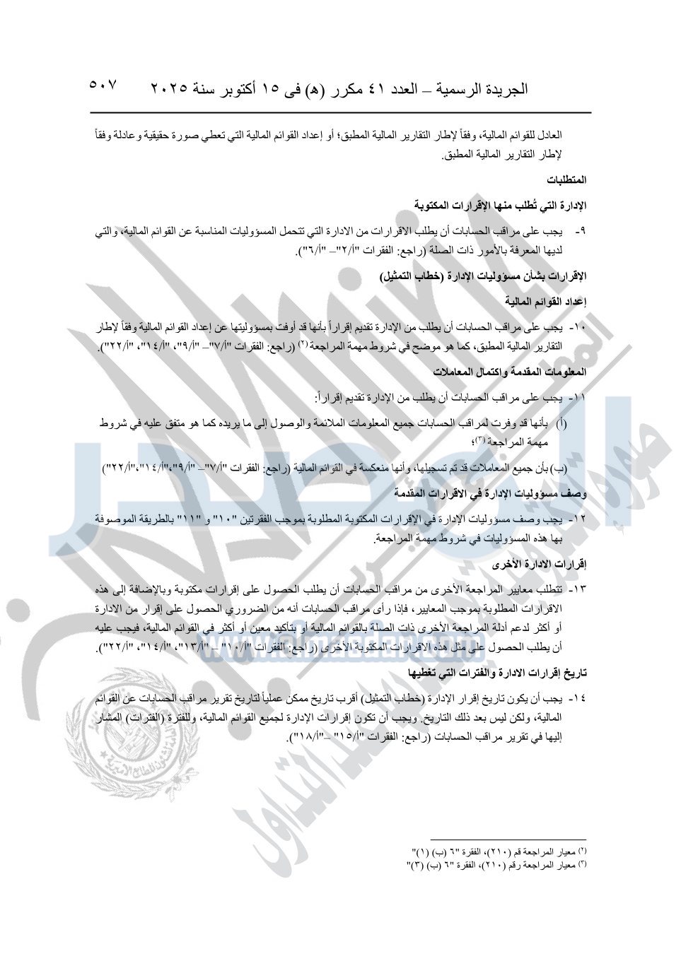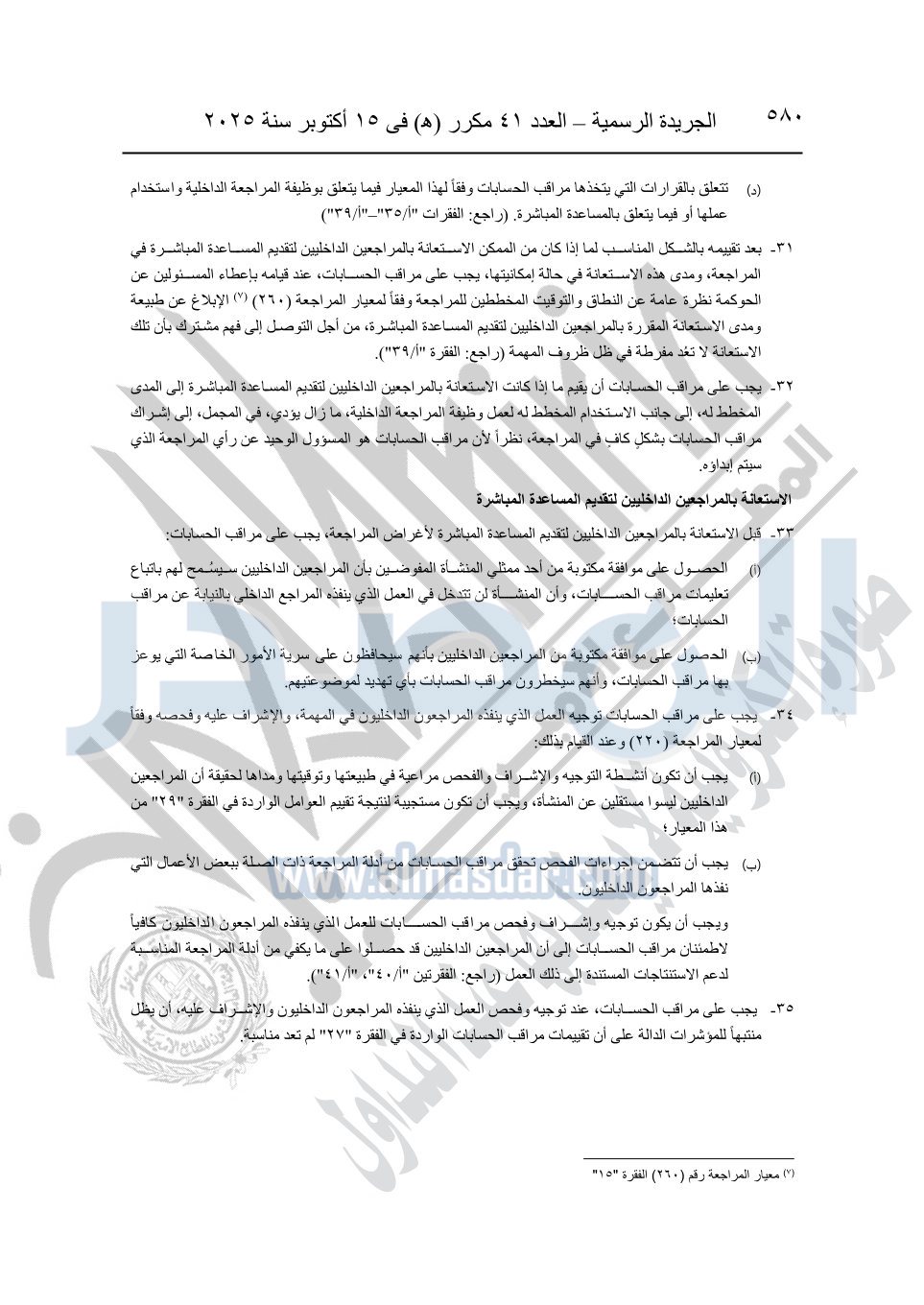 نشرت الجريدة الرسمية في العدد 41 مكرر "هـ" الصادر في 15 أكتوبر سنة 2025، قرار رئيس مجلس الوزراء رقم 3725 لسنة 2025، بشأن العمل بالمعايير المصرية للمراجعة والفحص المحدود ومهام التأكد الأخرى المرافقة لهذا القرار.