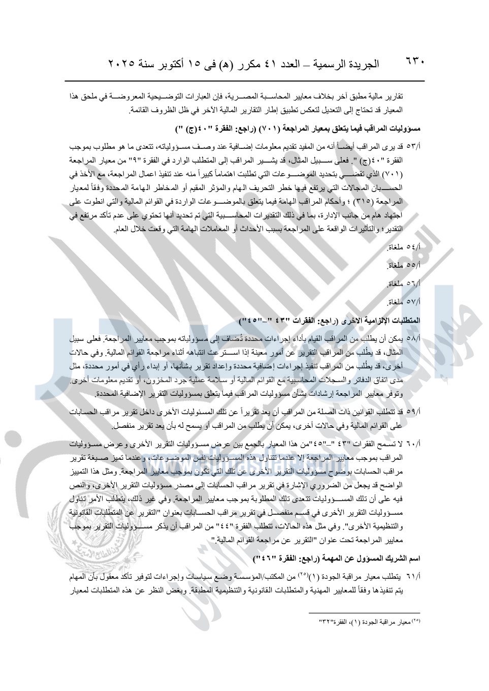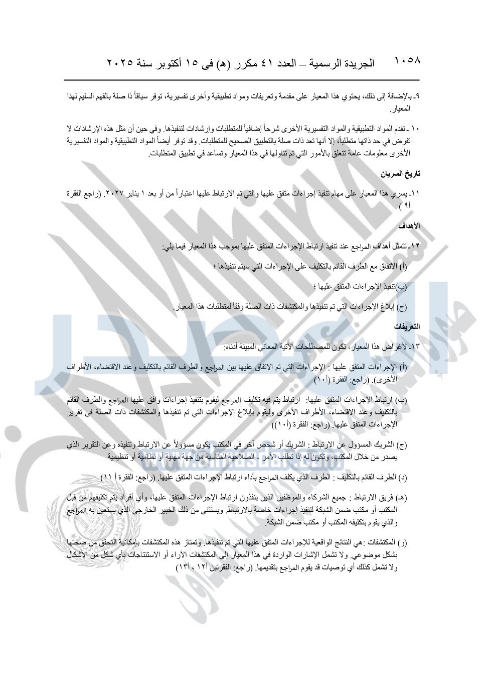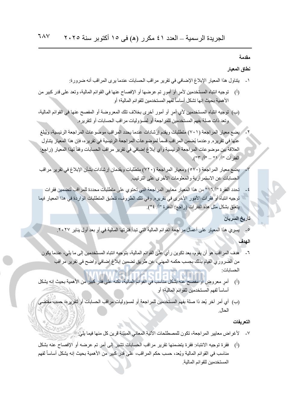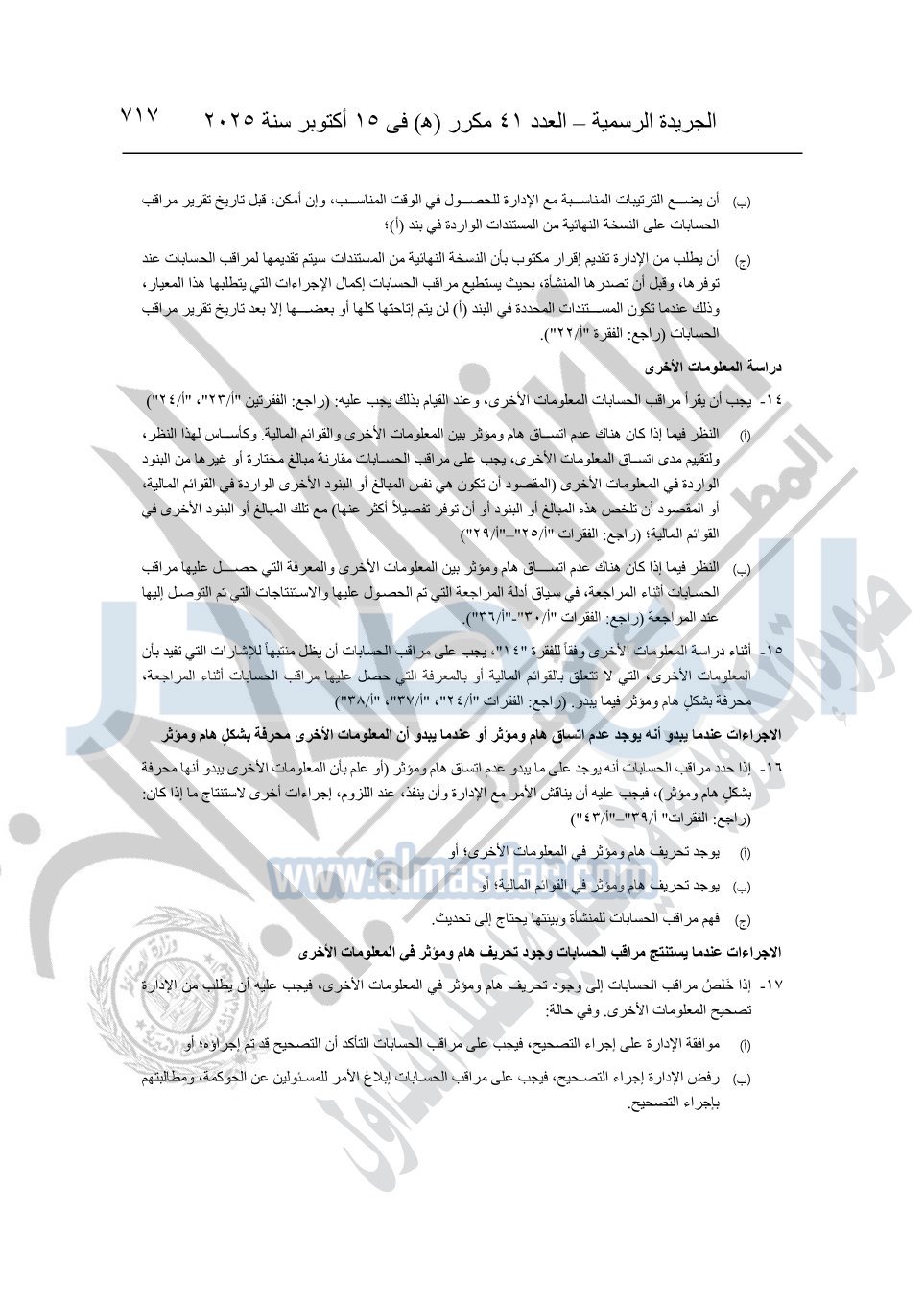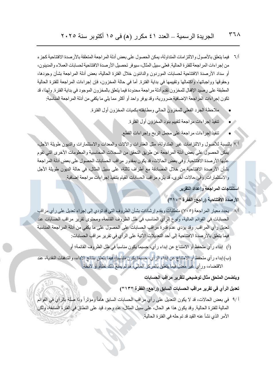نشرت الجريدة الرسمية في العدد 41 مكرر "هـ" الصادر في 15 أكتوبر سنة 2025، قرار رئيس مجلس الوزراء رقم 3725 لسنة 2025، بشأن العمل بالمعايير المصرية للمراجعة والفحص المحدود ومهام التأكد الأخرى المرافقة لهذا القرار.